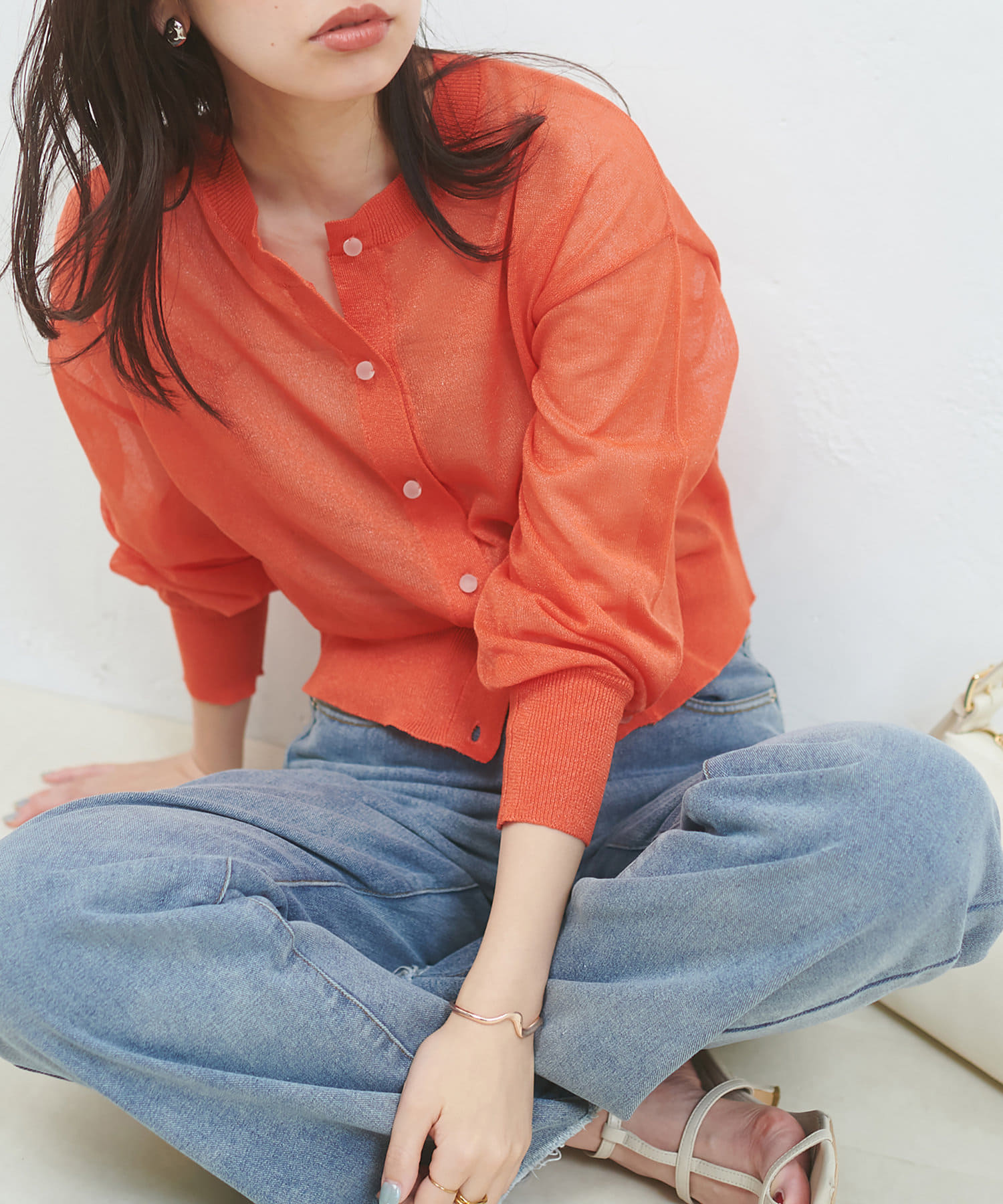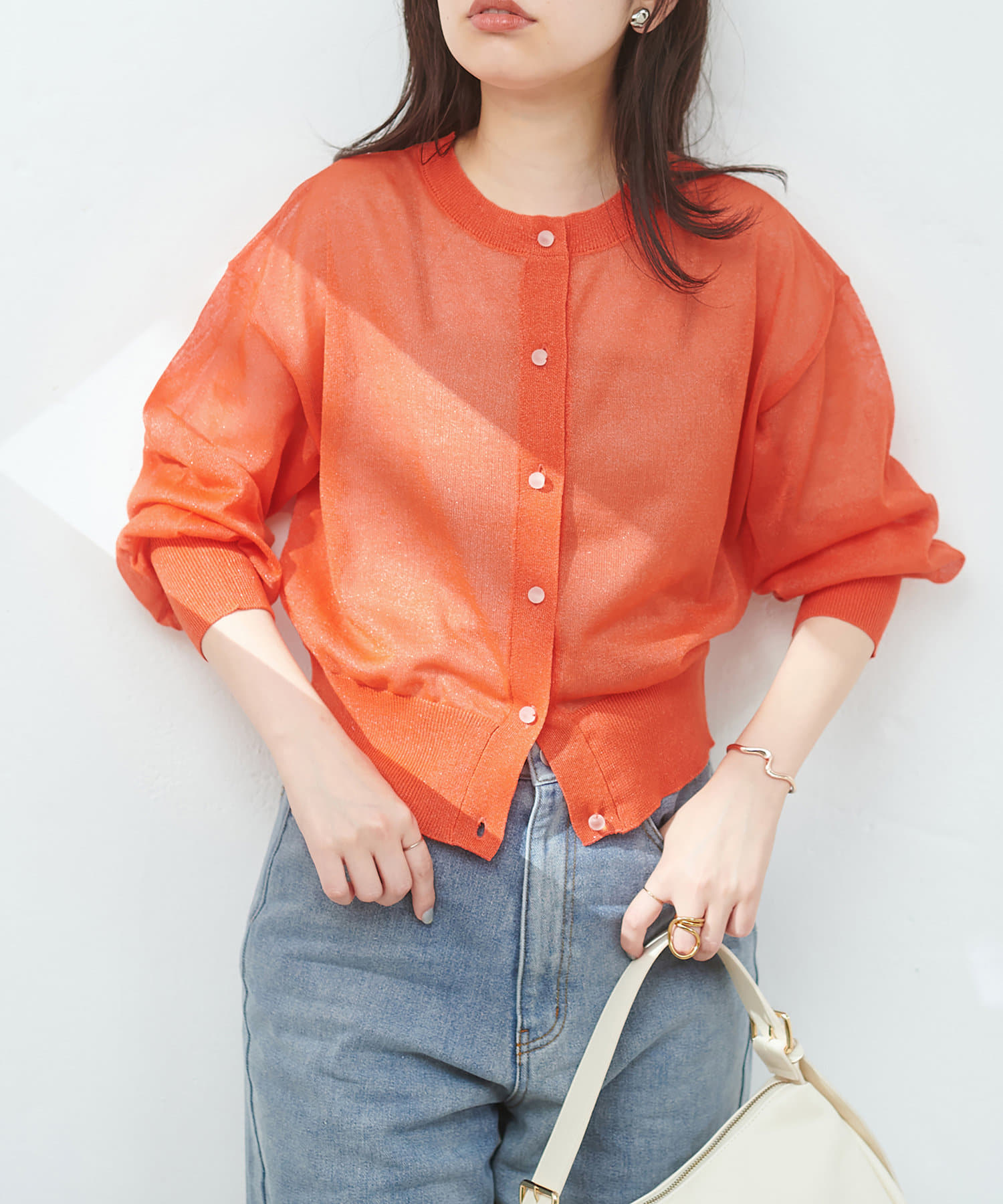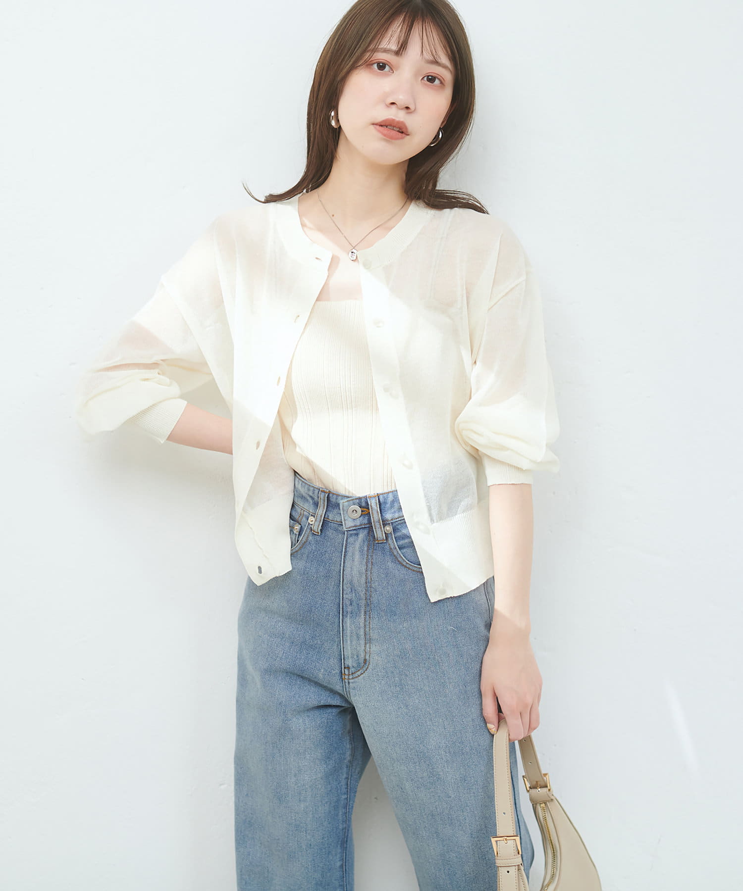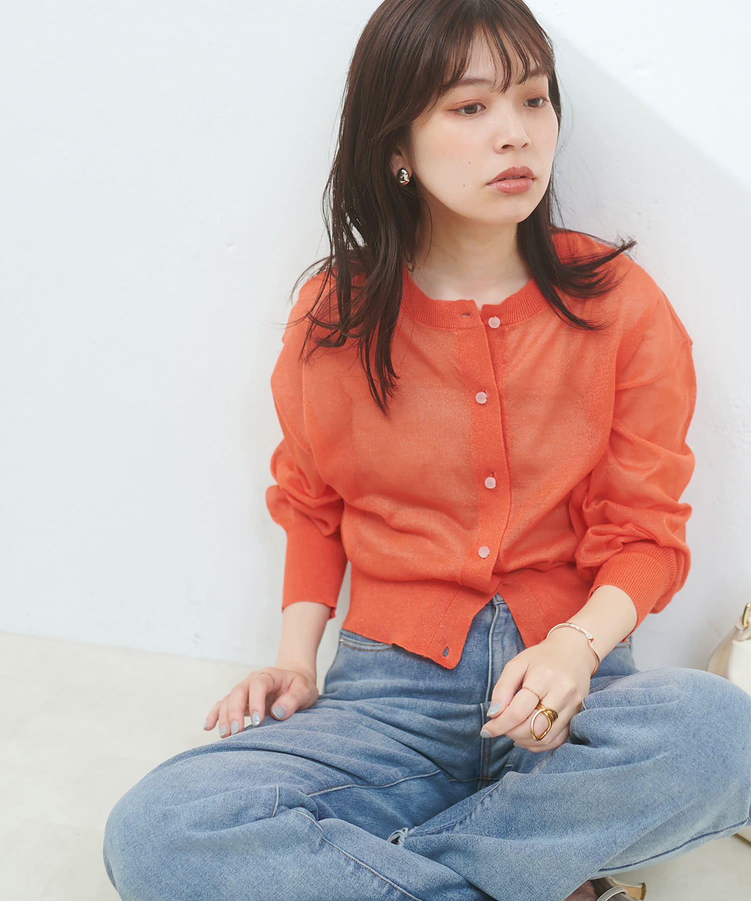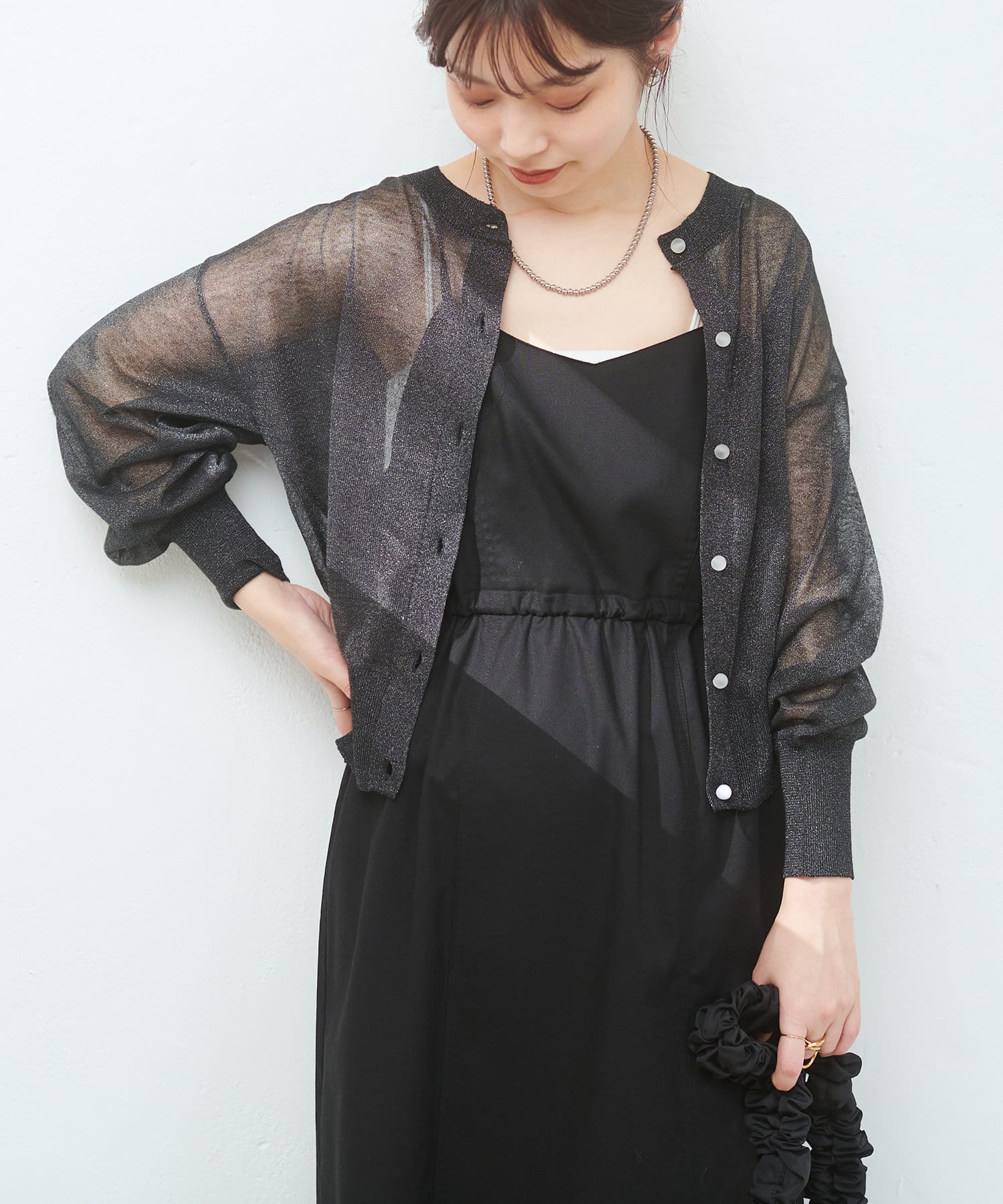 涼し気なシアー感とスモークガラス釦がポイントのカーディガン