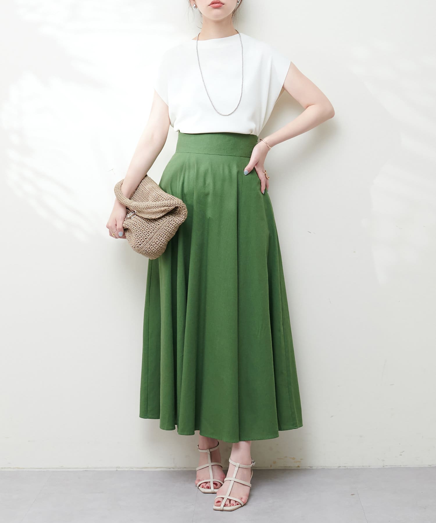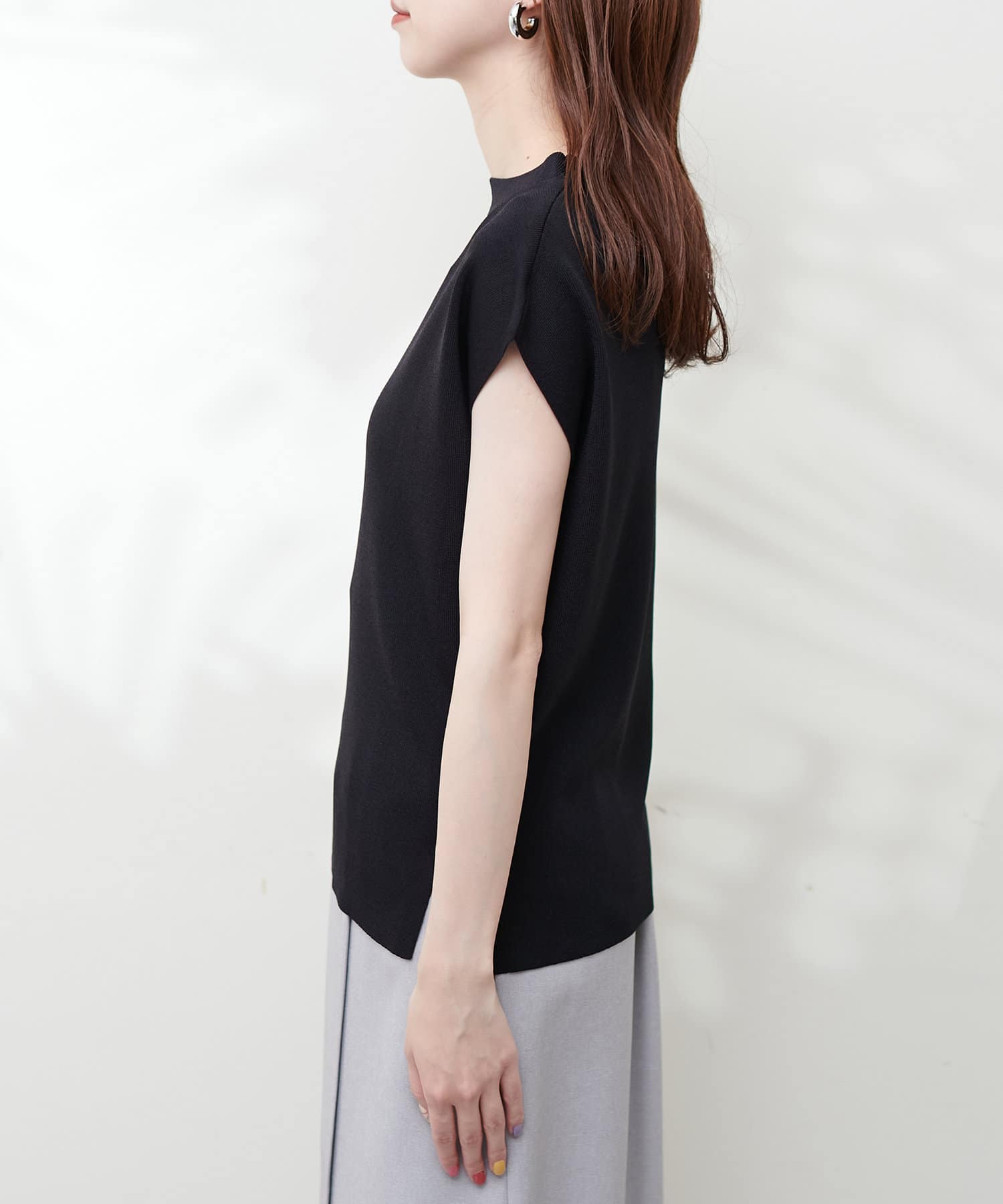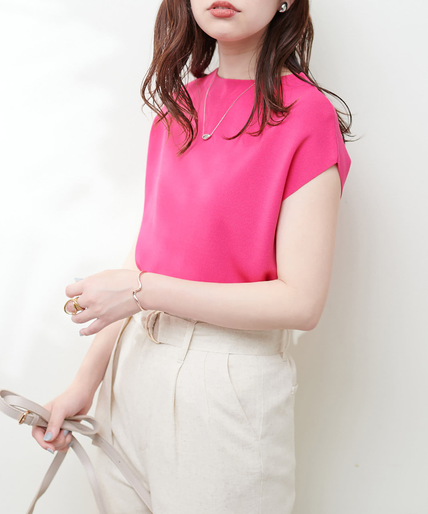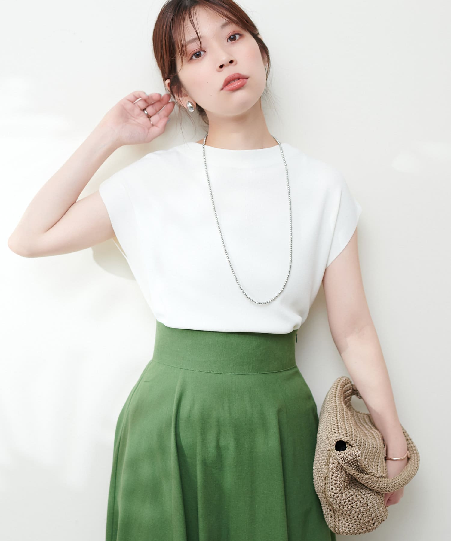 肩先をやや覆うノースリーブは露出控えめで、1枚でも着やすいデザイン。