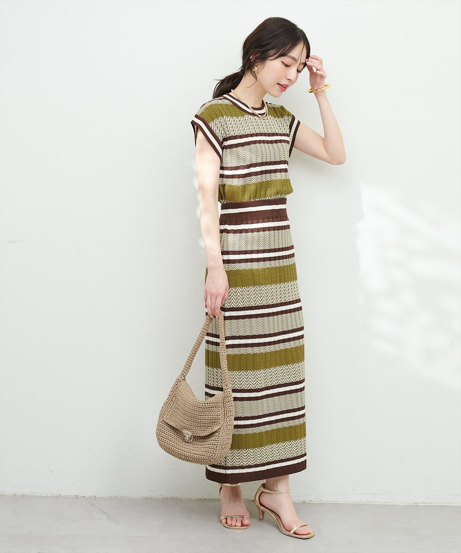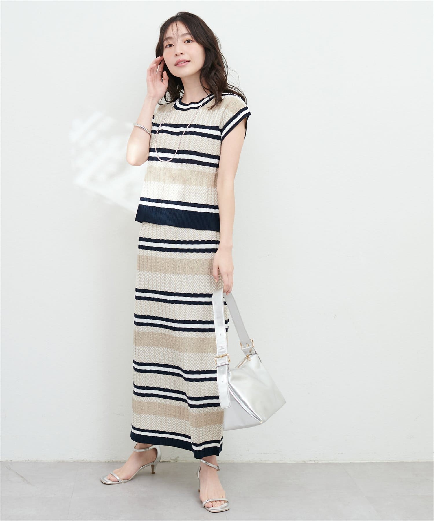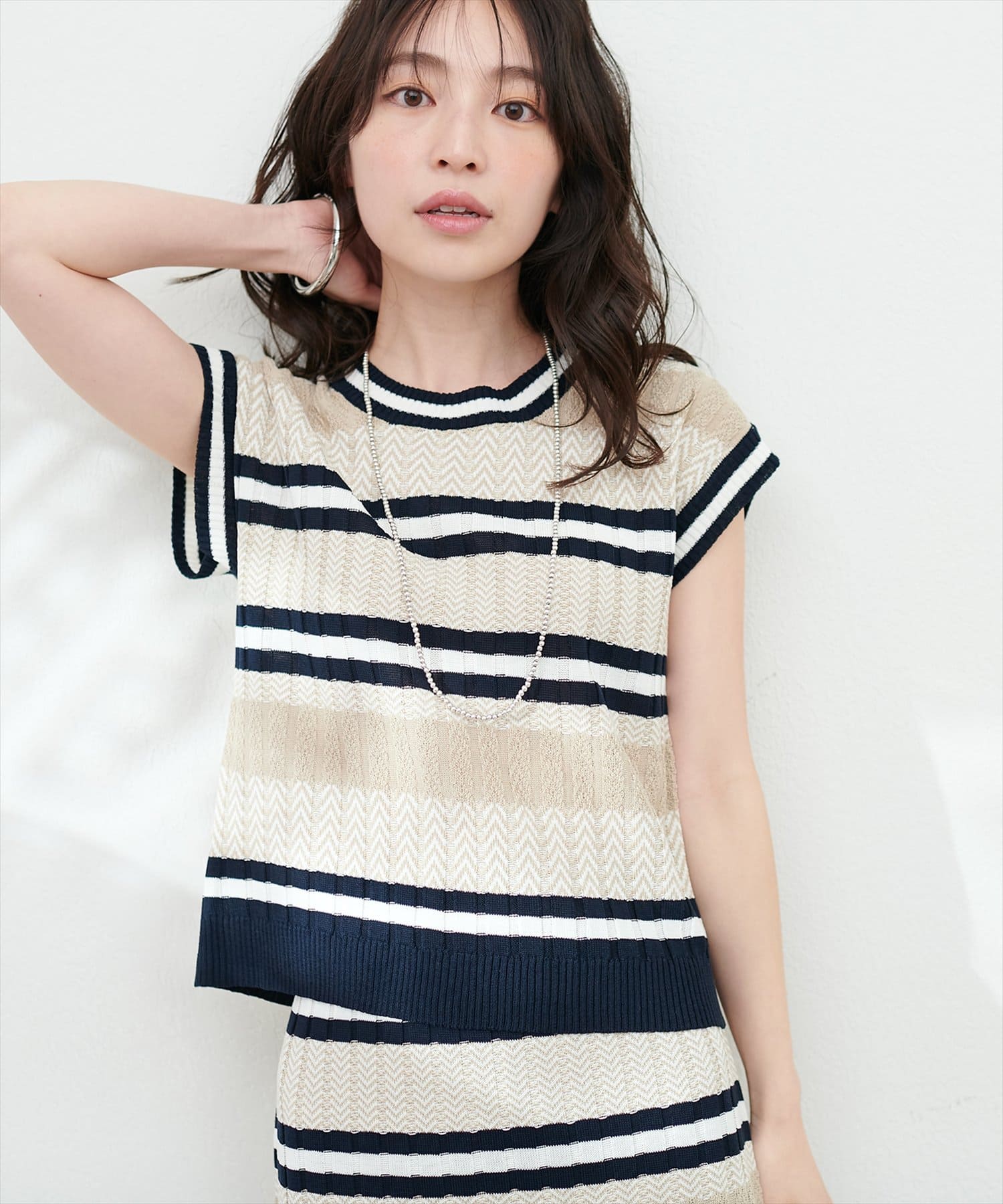 シリーズのマルチボーダーリブニットスカートと合わせてセットアップでお召し頂くと、きちんと感がありドレッシーな雰囲気に。