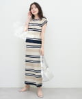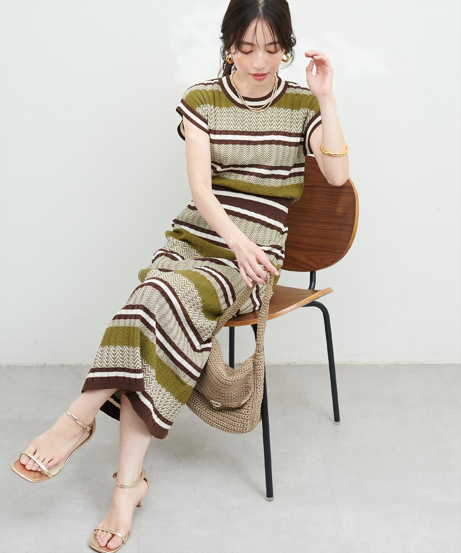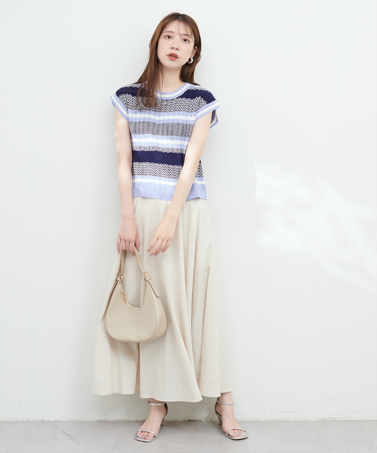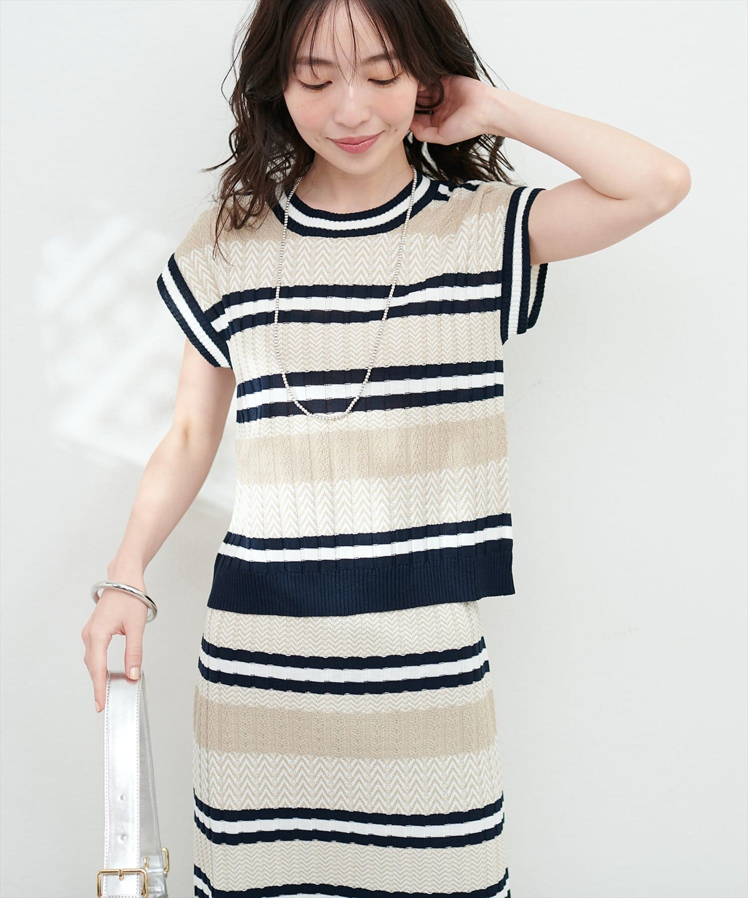シリーズのマルチボーダーリブニットスカートと合わせてセットアップでお召し頂くと、きちんと感がありドレッシーな雰囲気に。