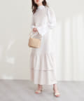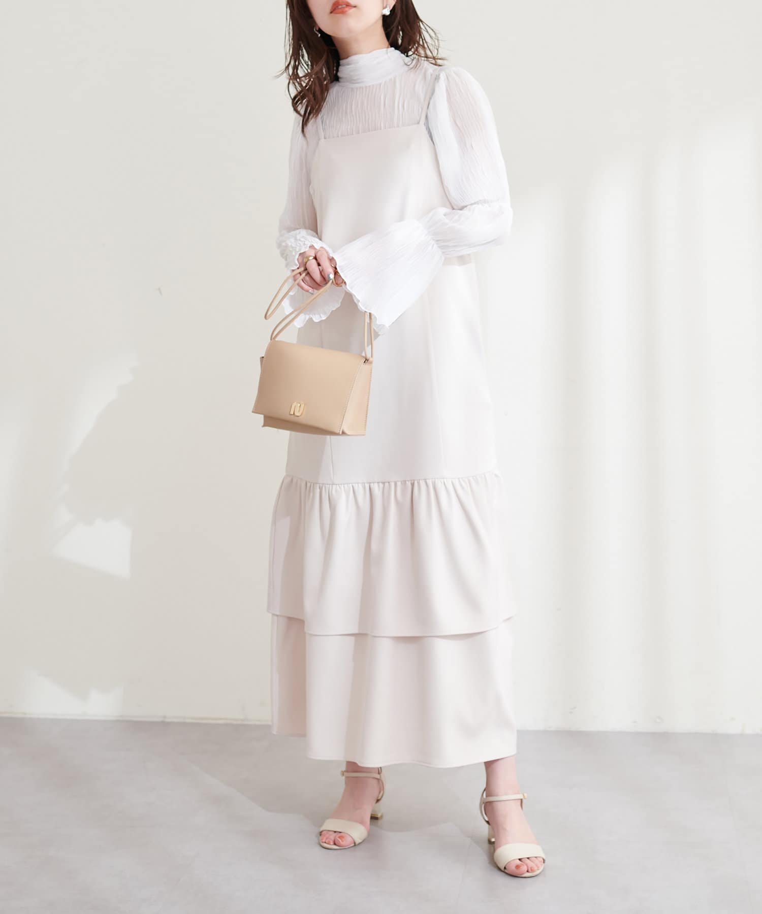 袖のティアードは腕のラインを拾わず、袖口のキャンディスリーブで手元も女性らしく見えます。