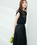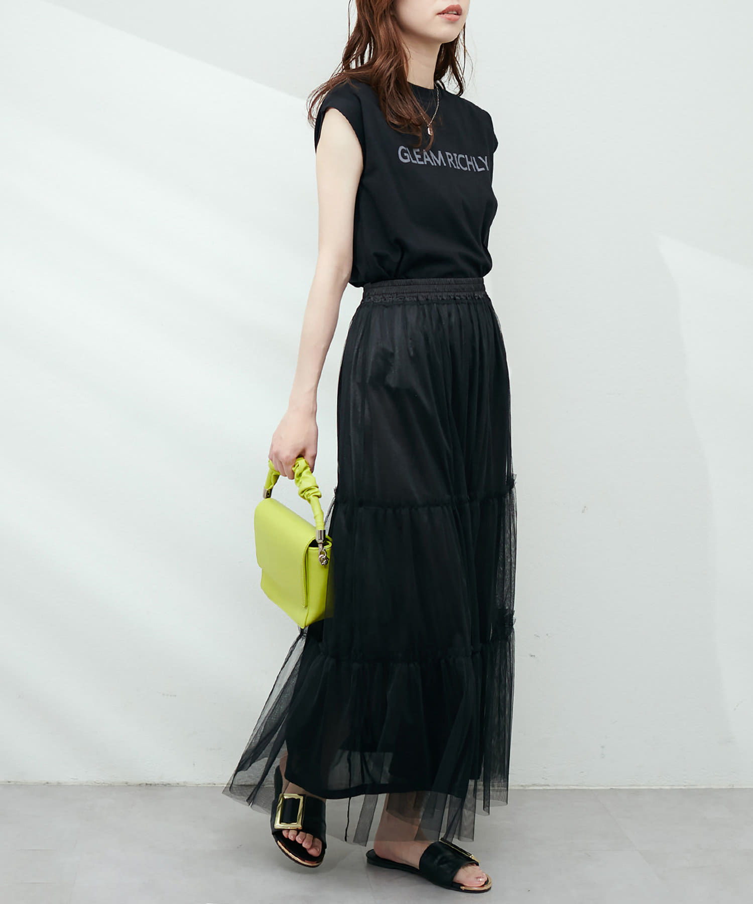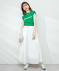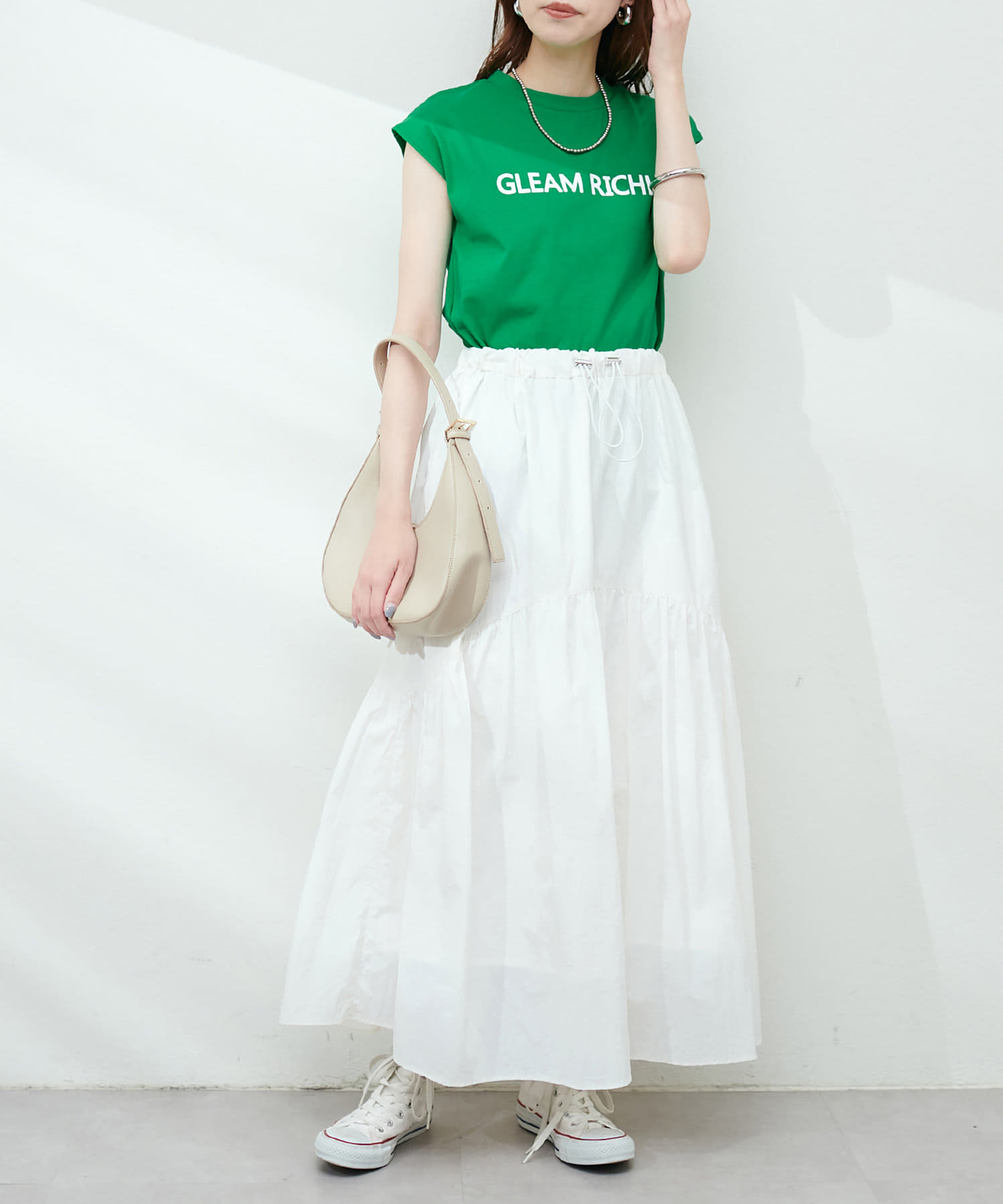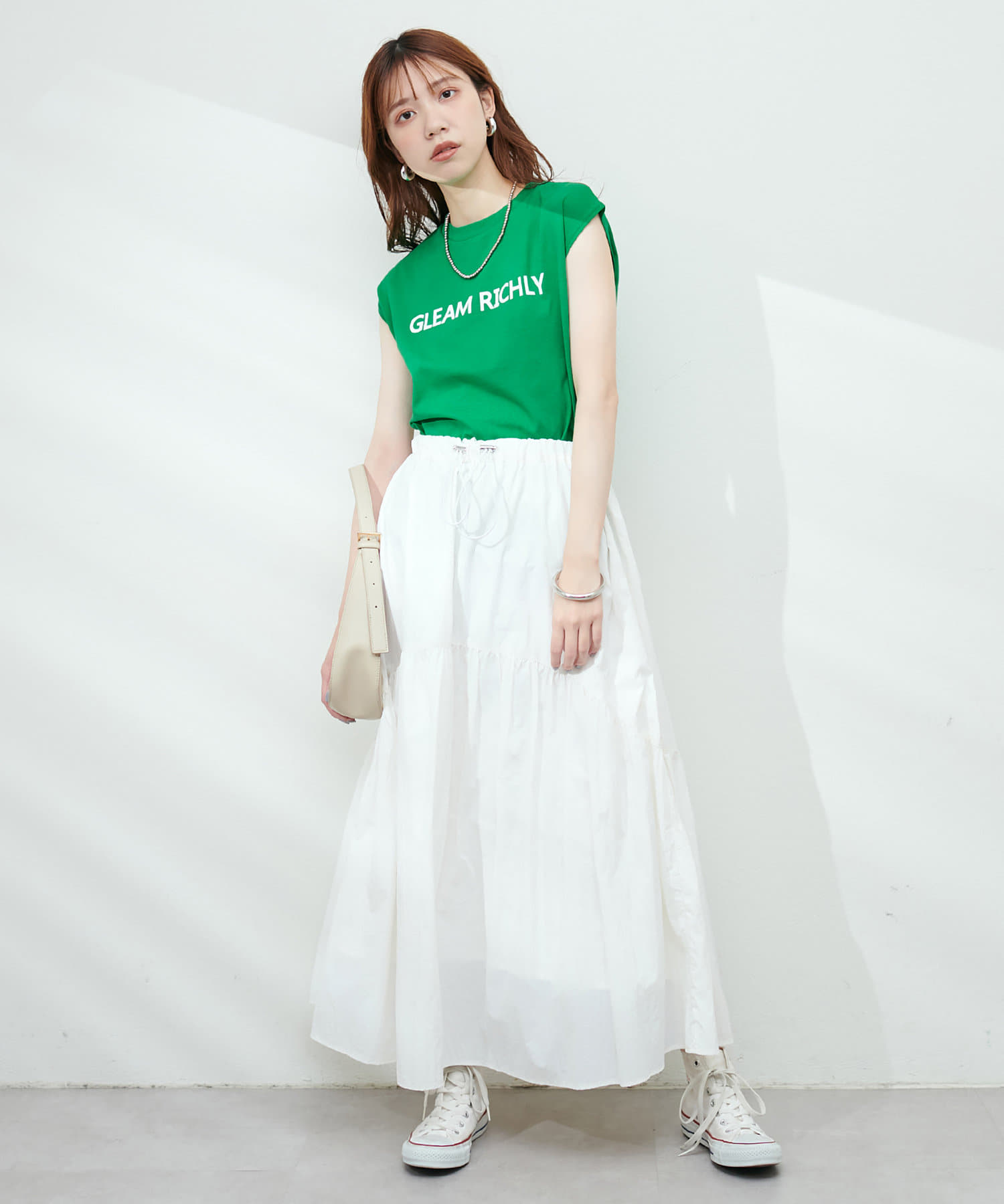 ボリュームのあるスカートと合わせると、大人カジュアルなトレンドコーデが完成します。