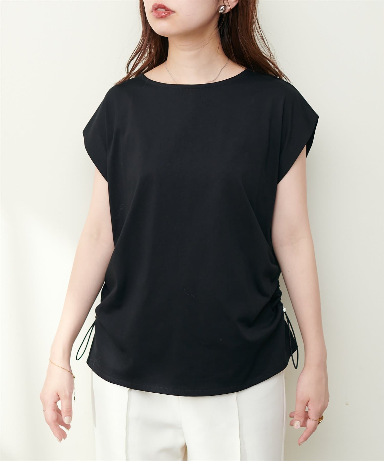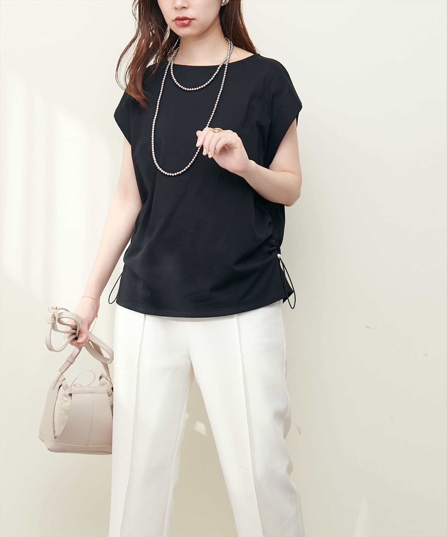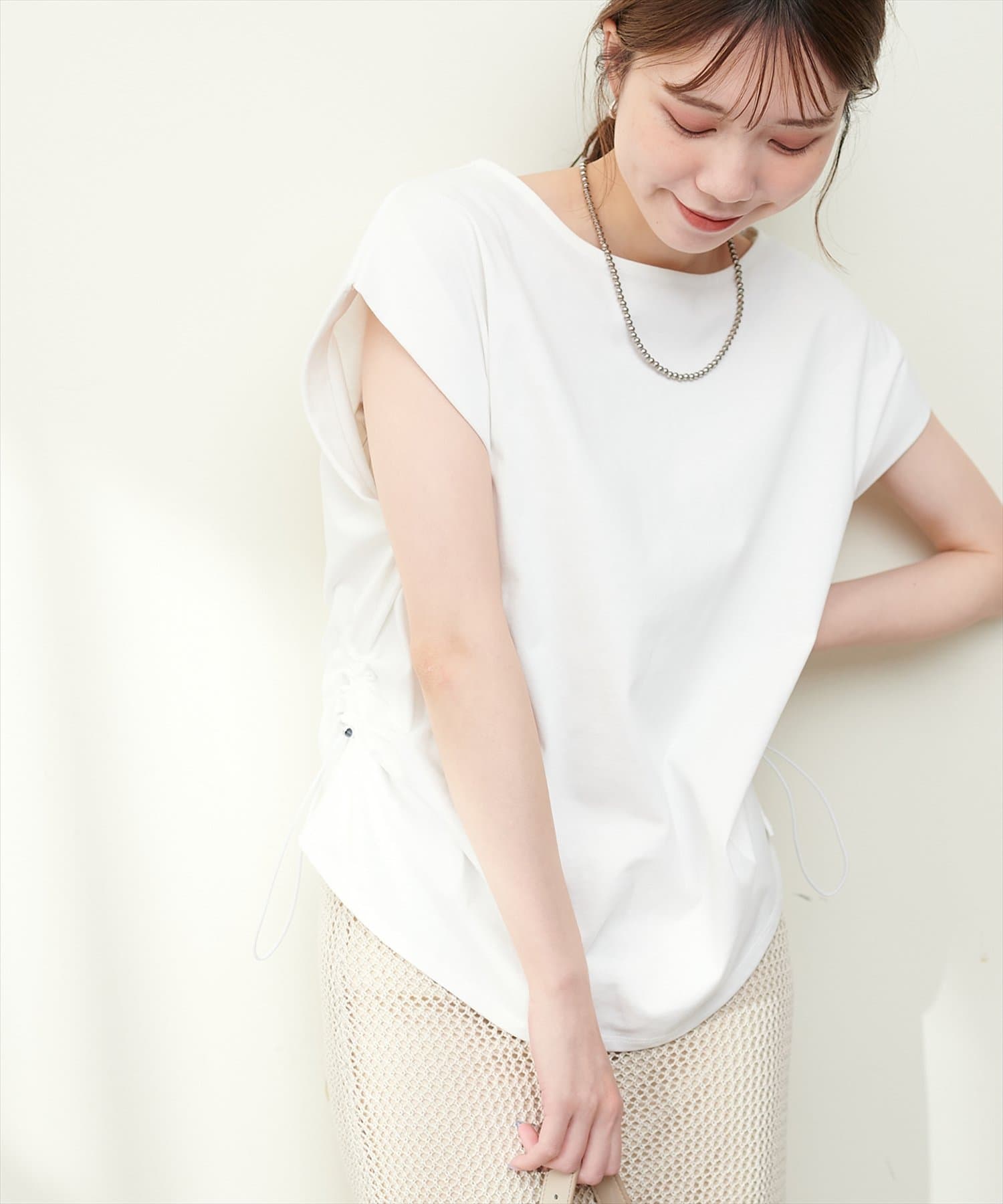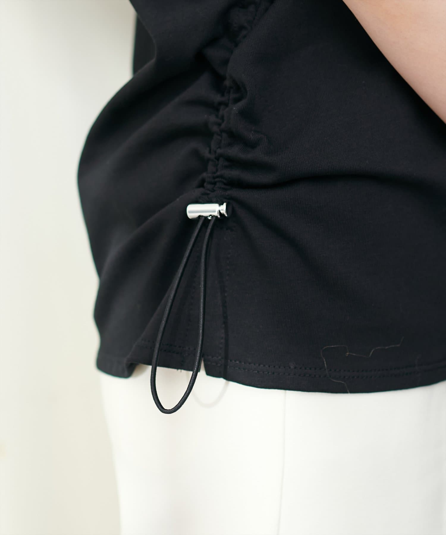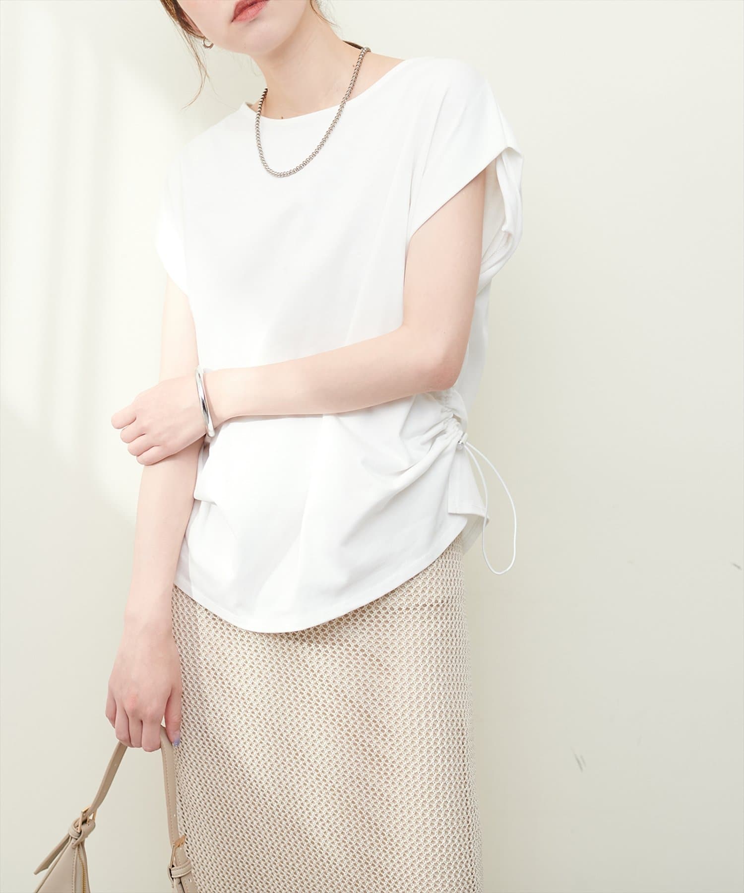 両サイドのドロスト部分を絞ったり緩めたりと、雰囲気を変えて楽しめるドロストデザインのカットトップス。