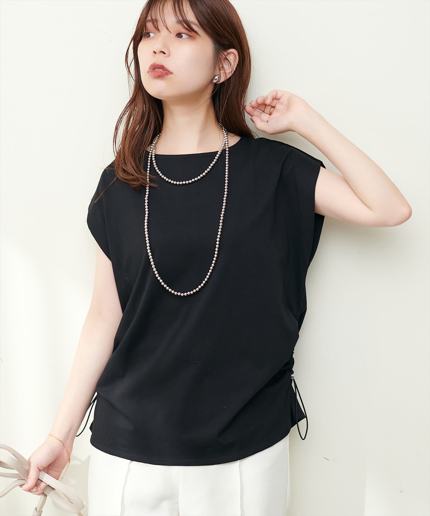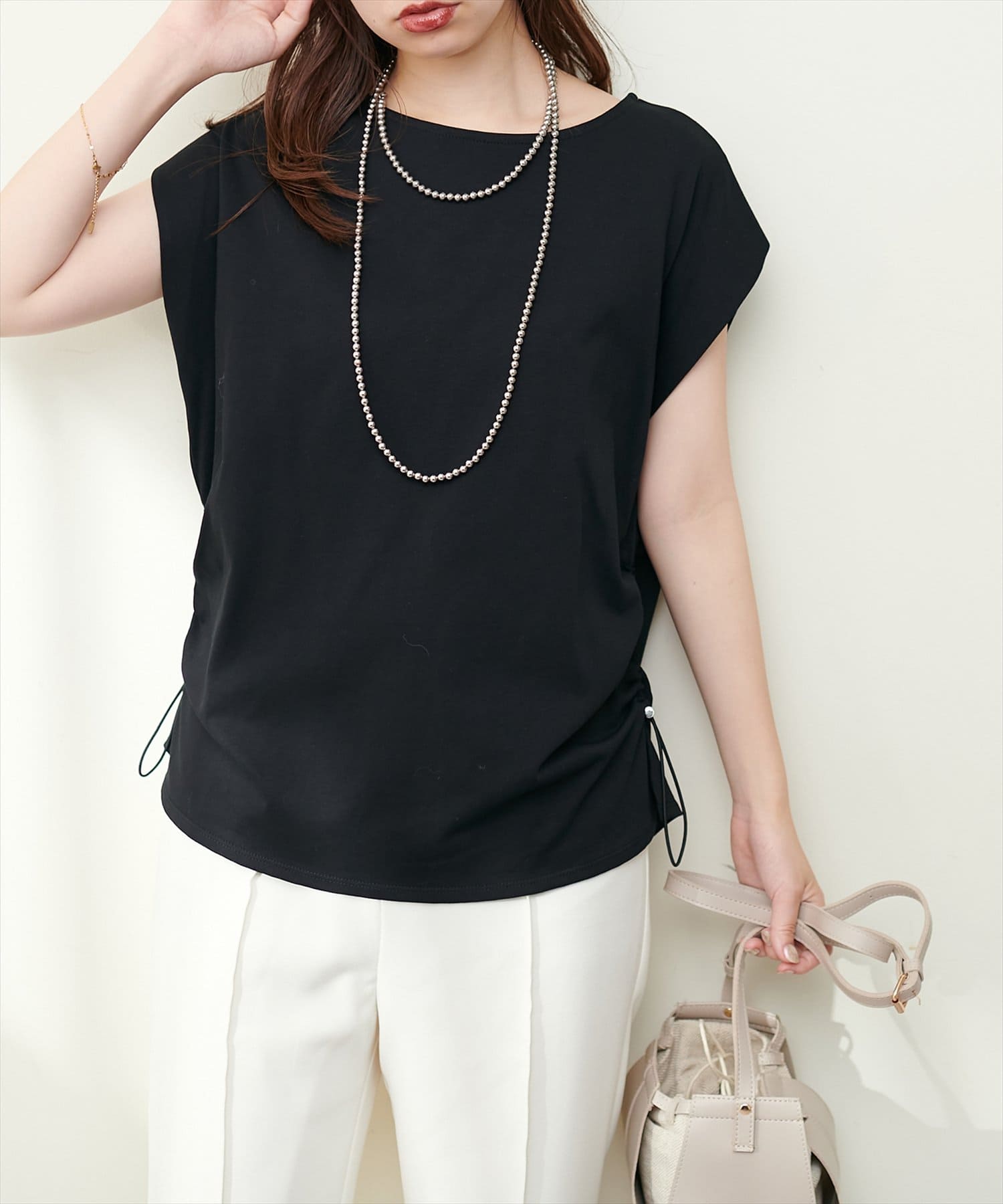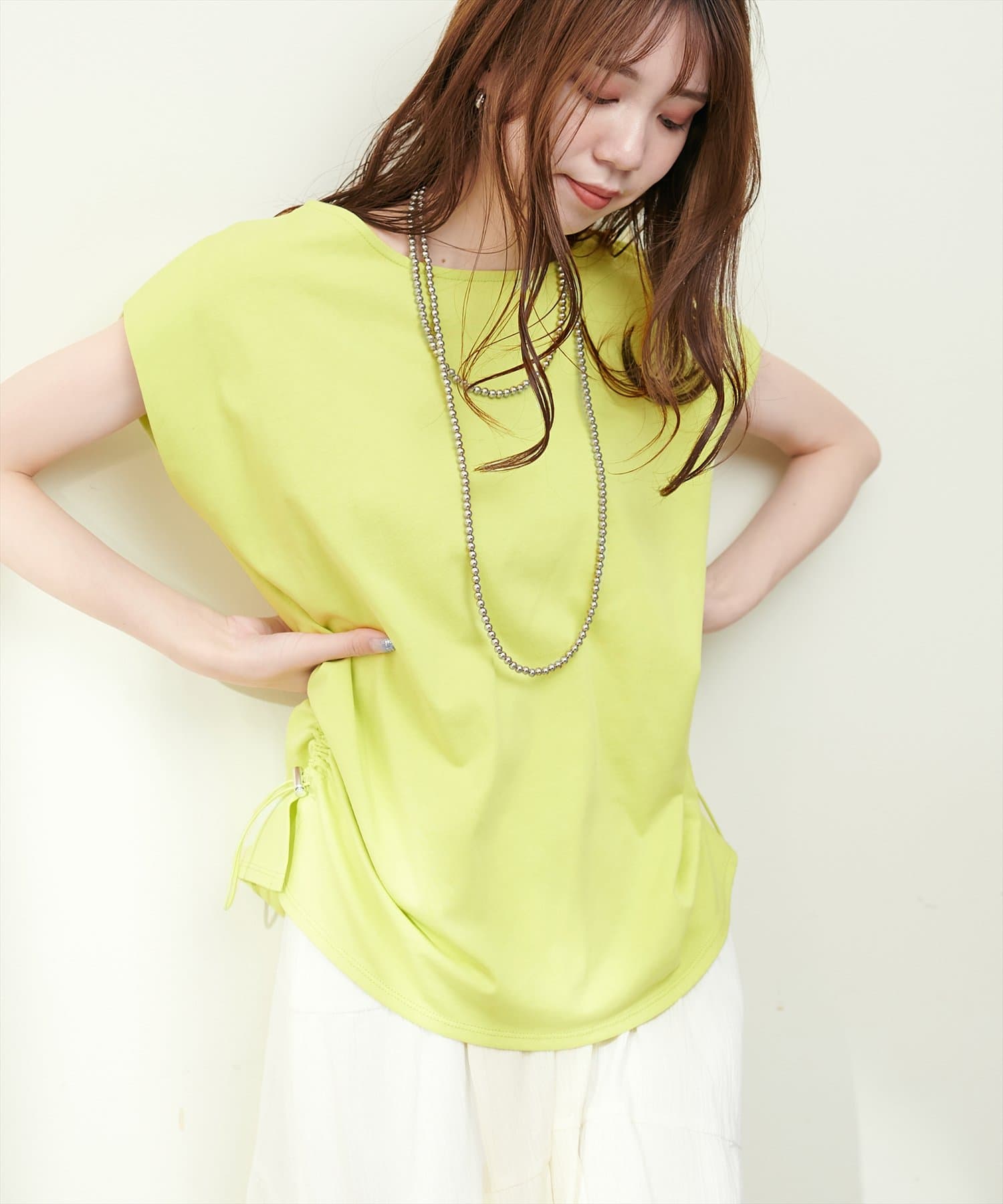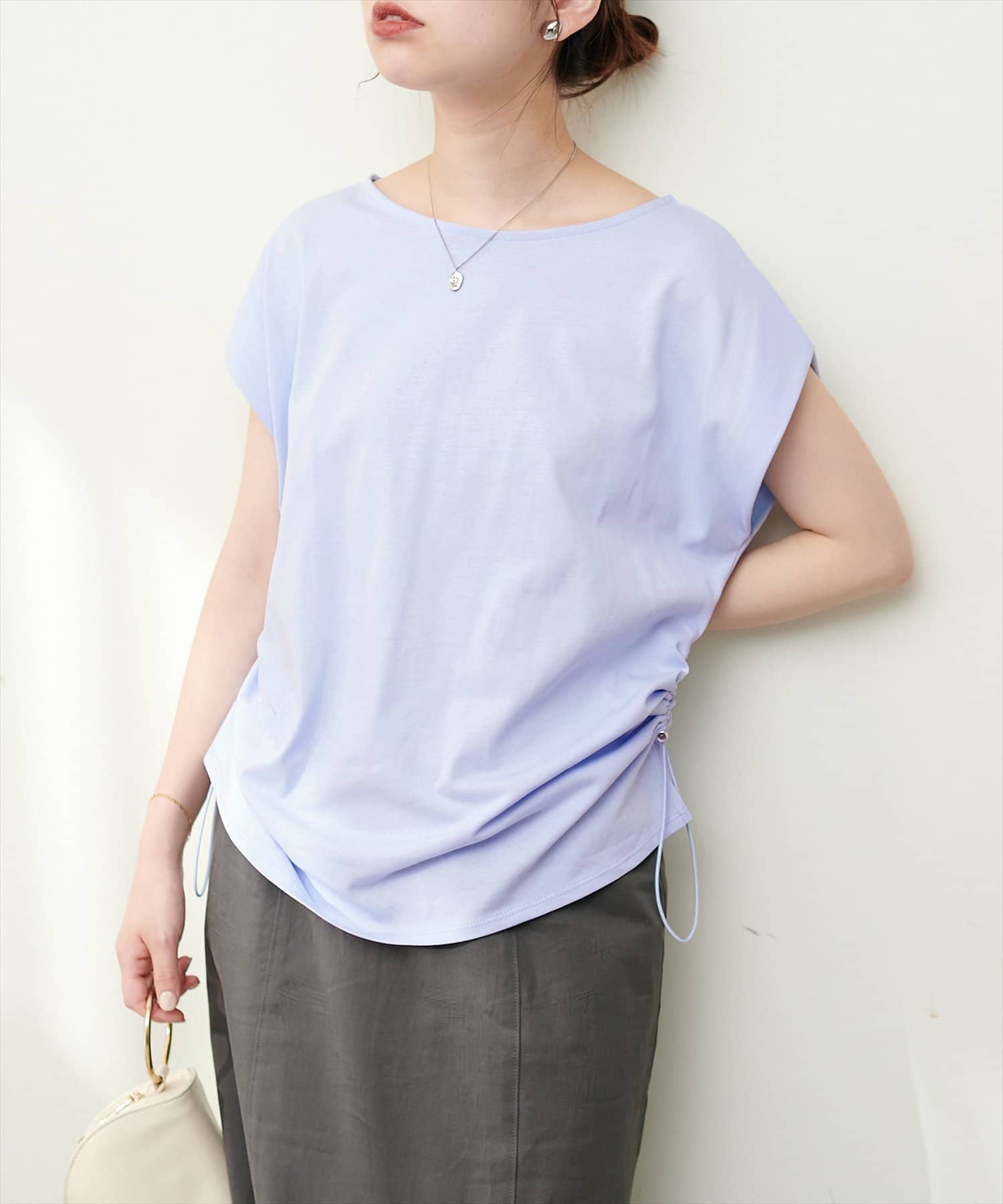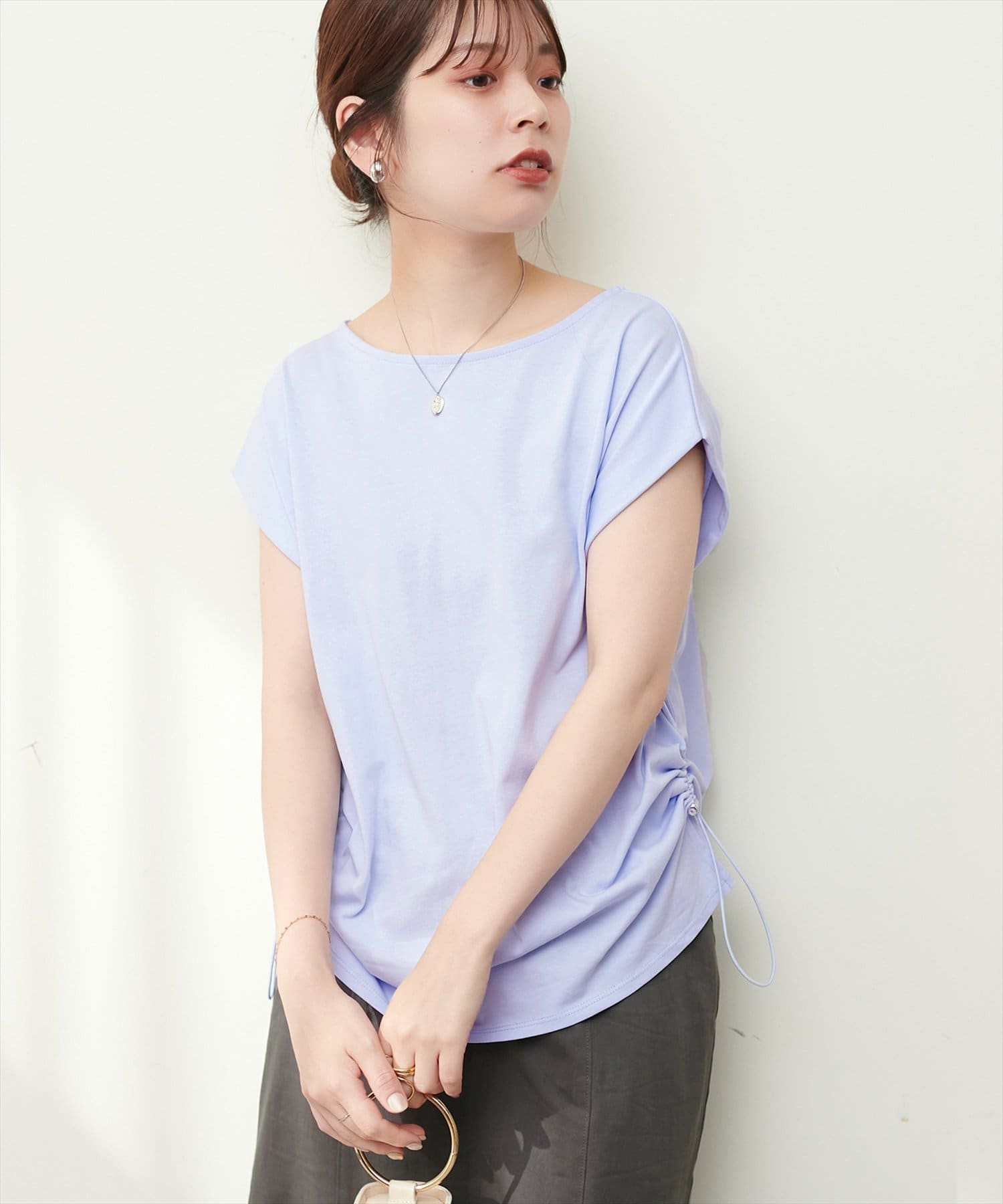 両サイドのドロスト部分を絞ったり緩めたりと、雰囲気を変えて楽しめるドロストデザインのカットトップス。