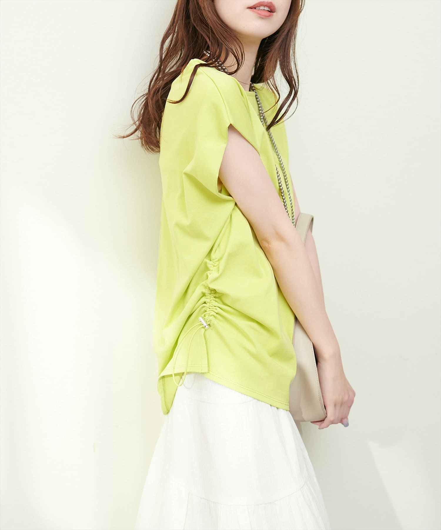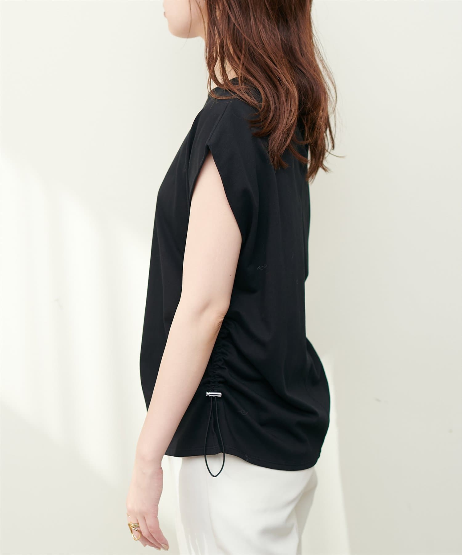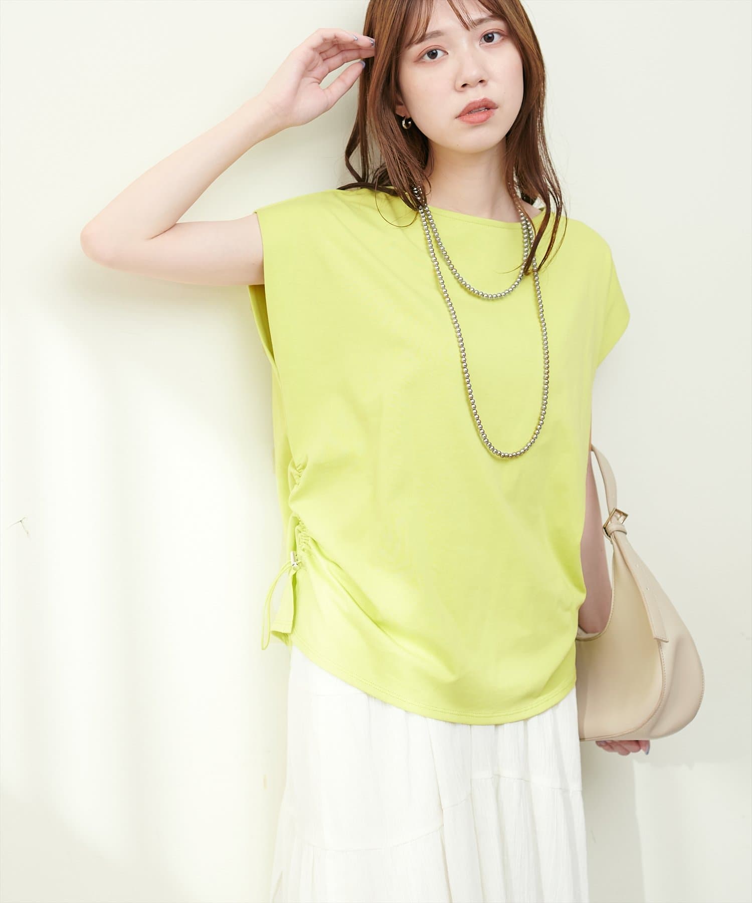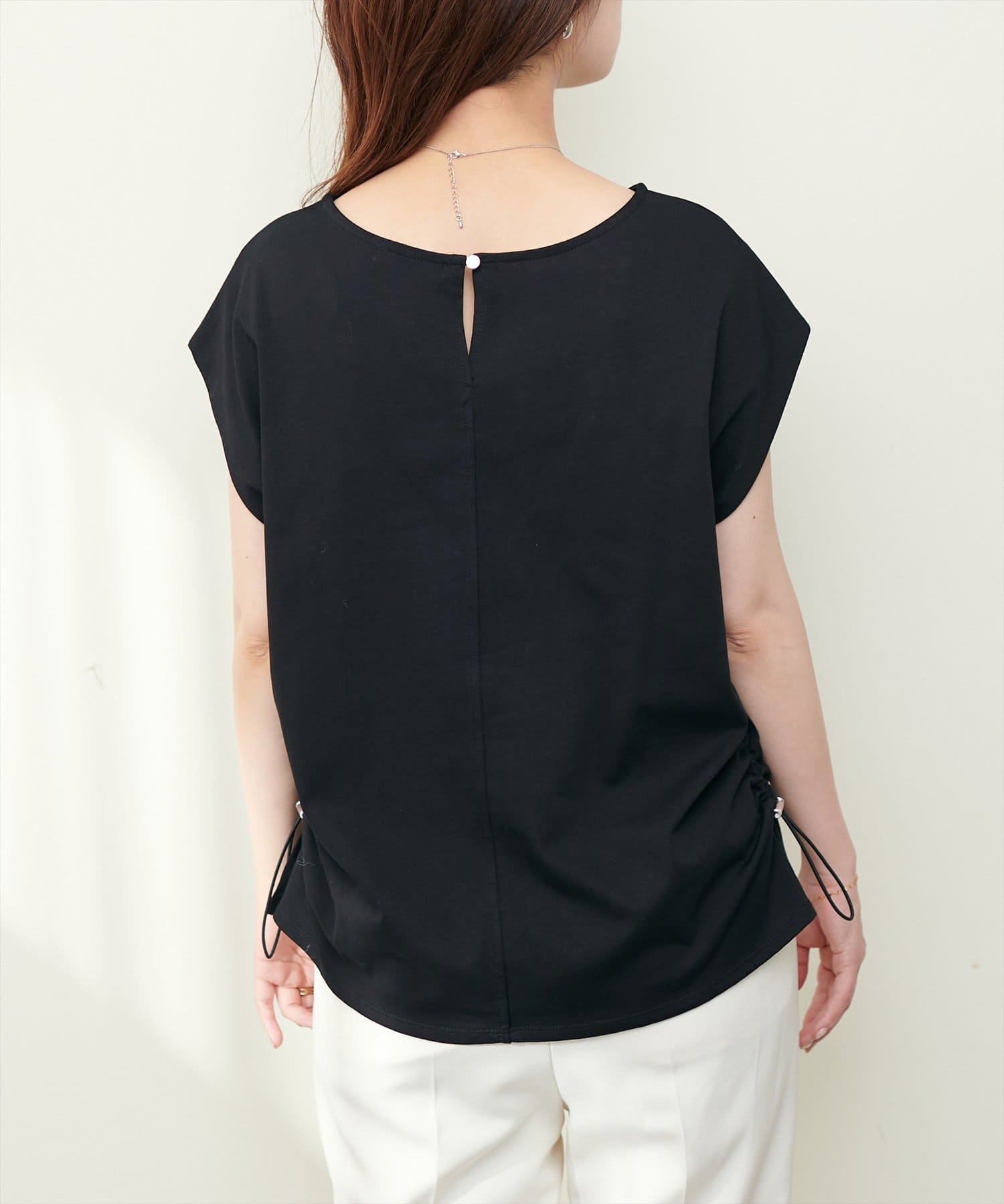 両サイドのドロスト部分を絞ったり緩めたりと、雰囲気を変えて楽しめるドロストデザインのカットトップス。