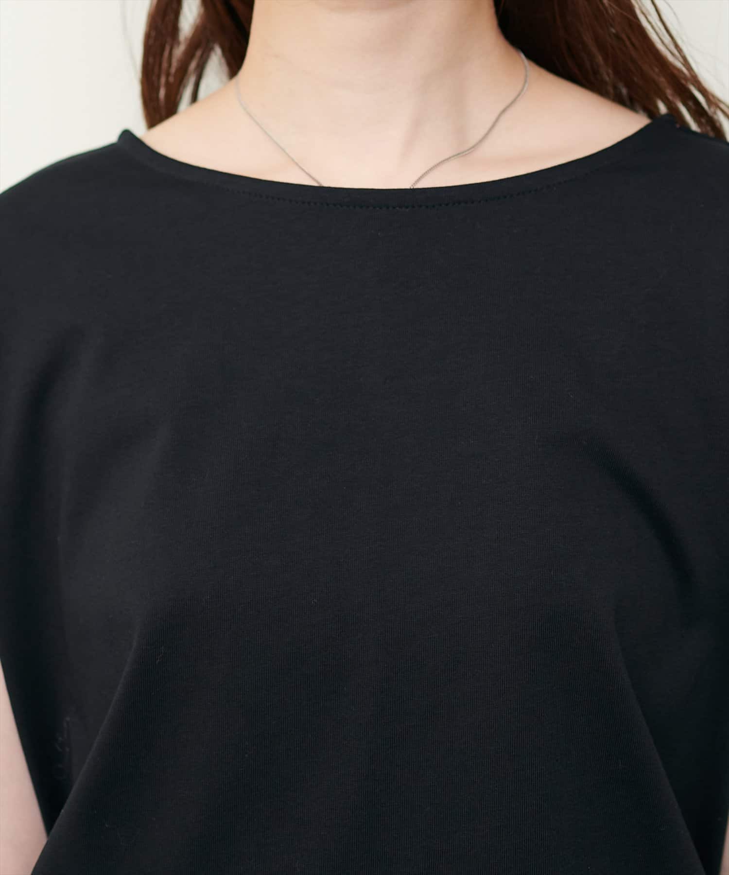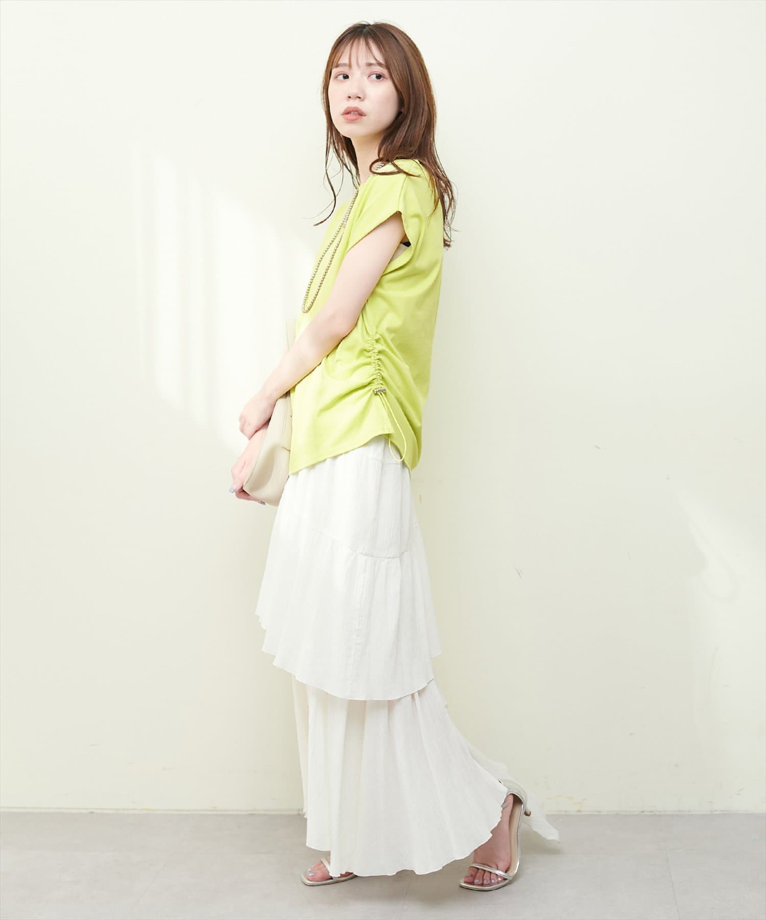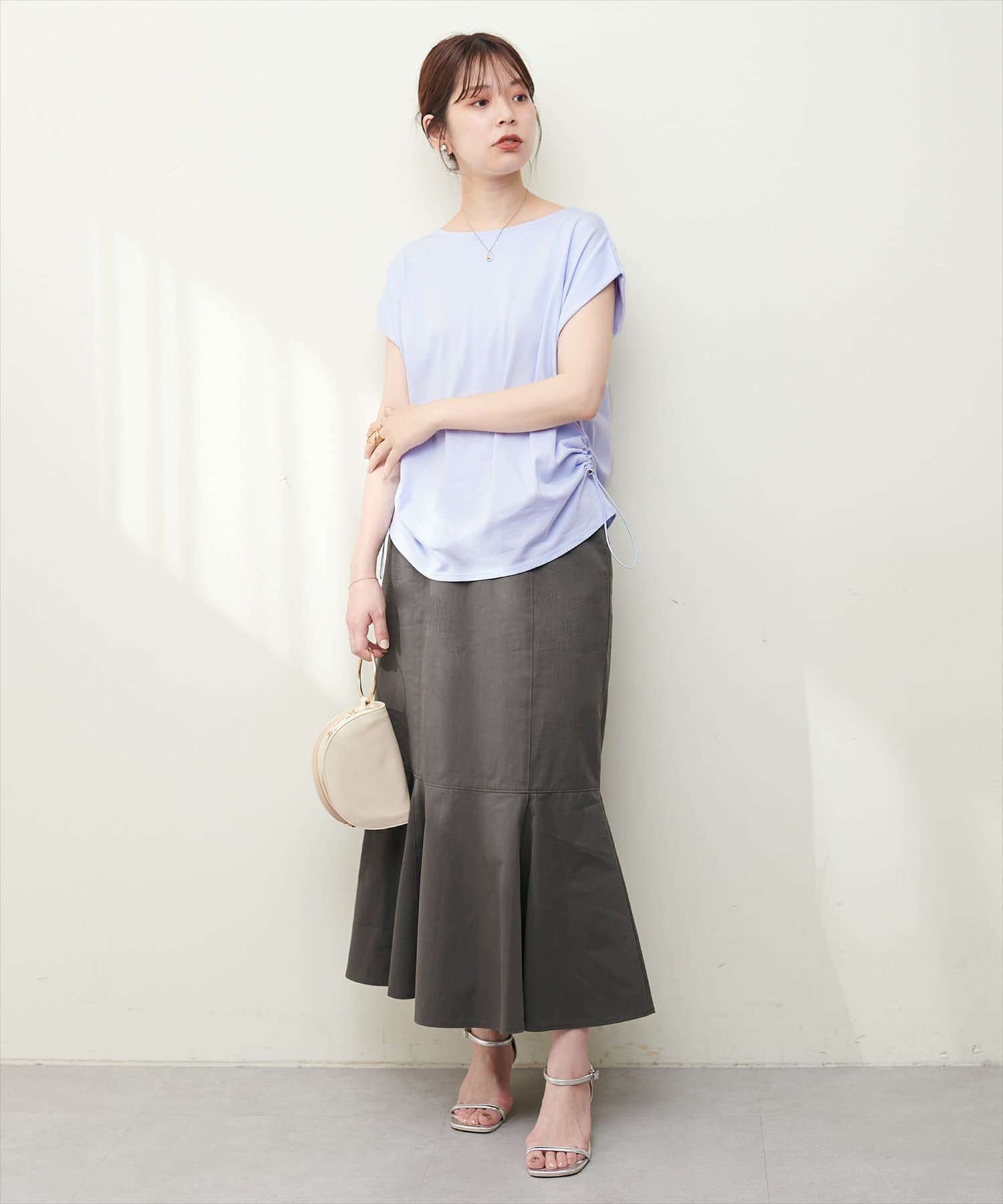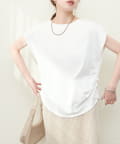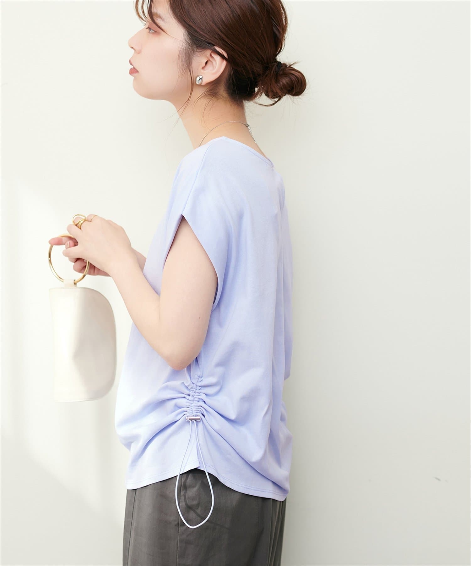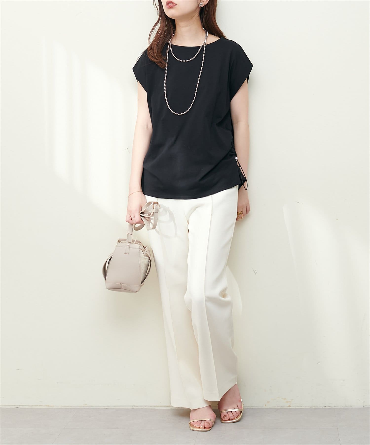 両サイドのドロスト部分を絞ったり緩めたりと、雰囲気を変えて楽しめるドロストデザインのカットトップス。