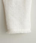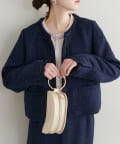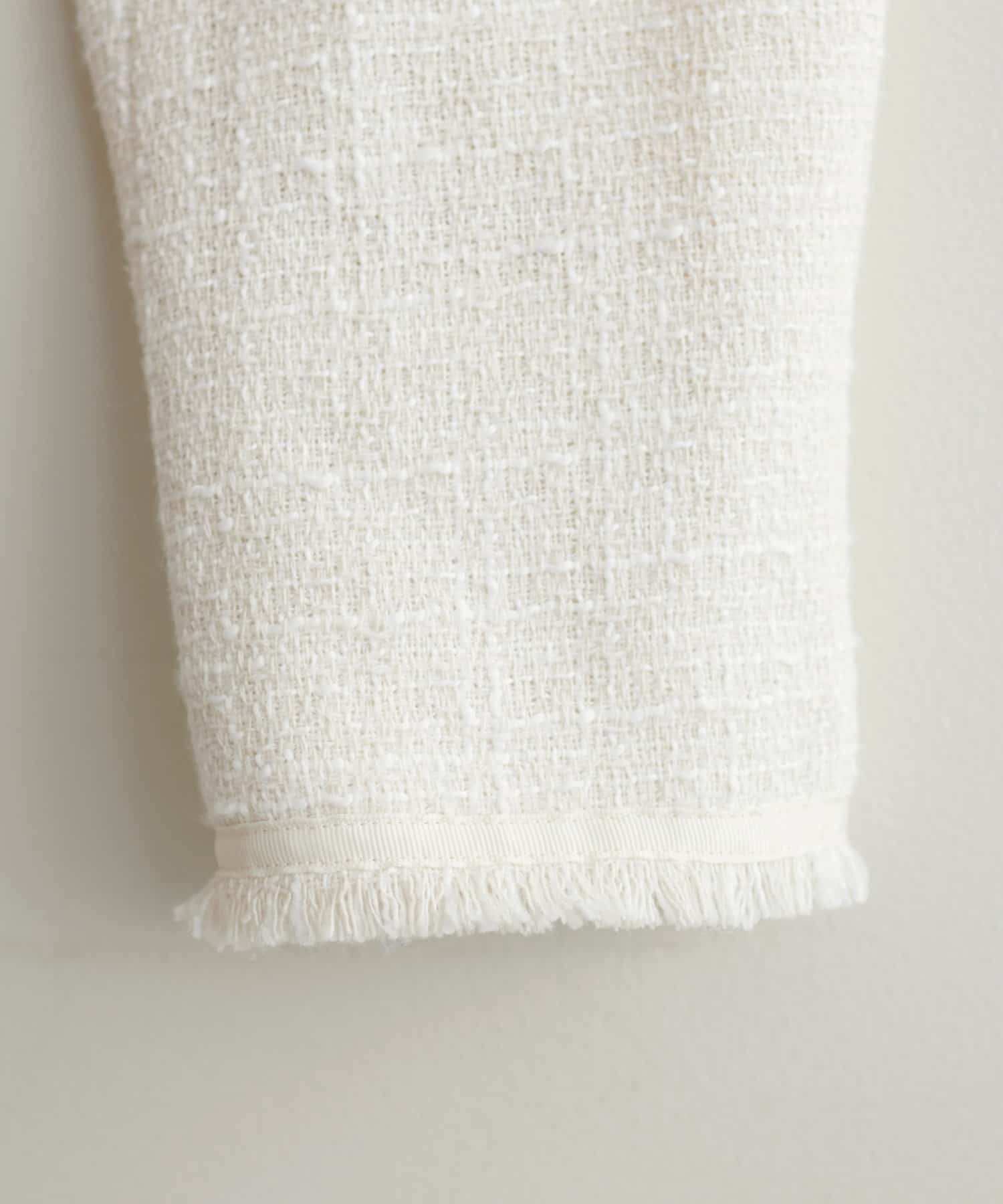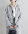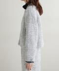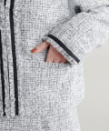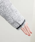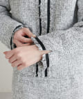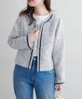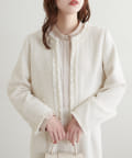 襟ぐりから前立て、袖口をフリンジで縁取り、フリンジとツイードの高見えジャケット。