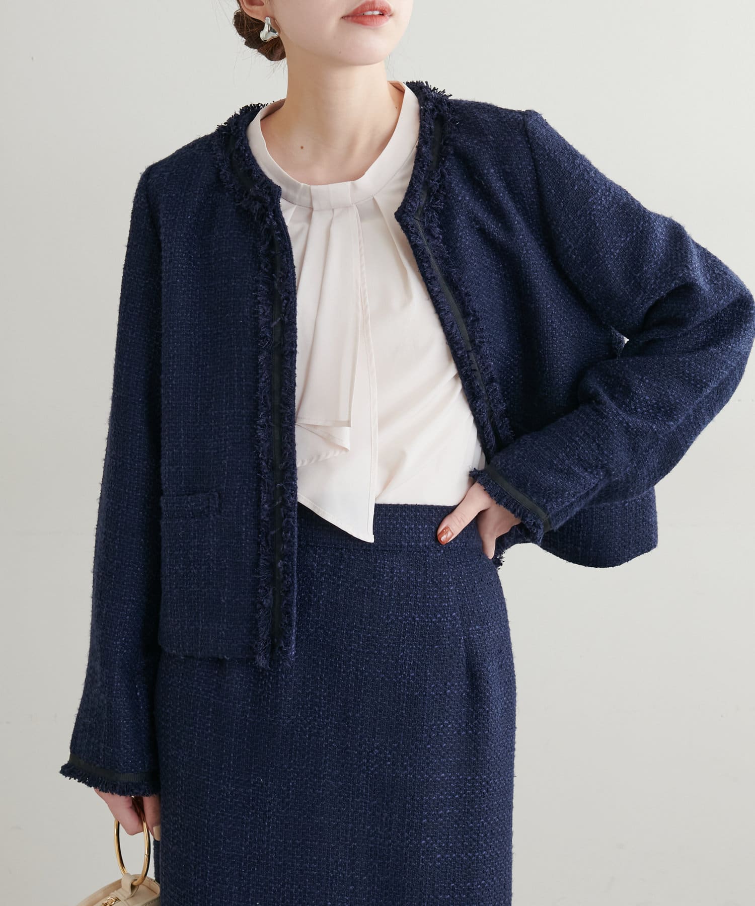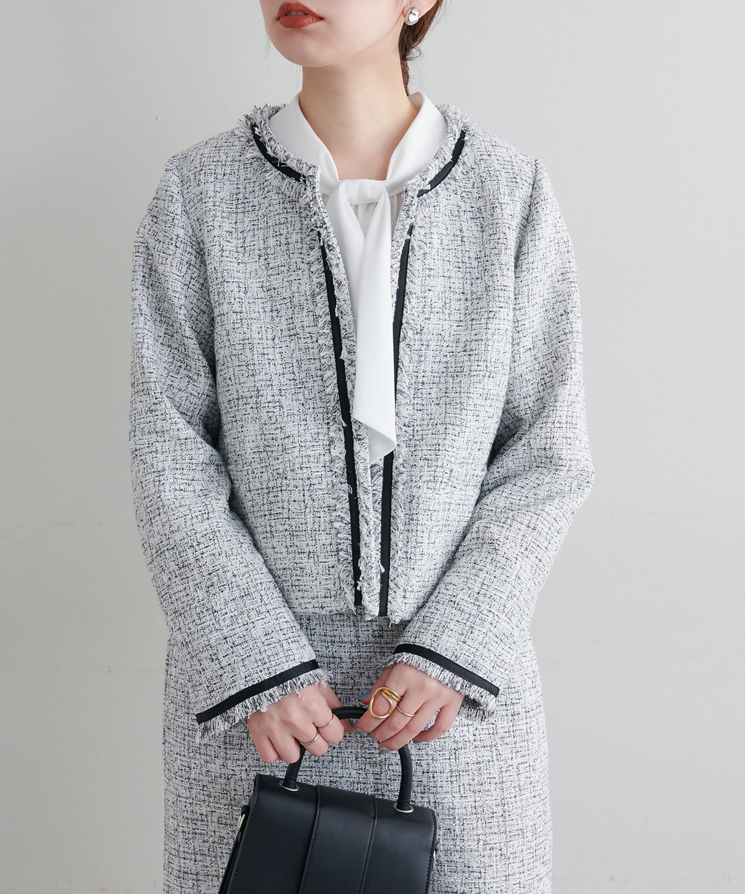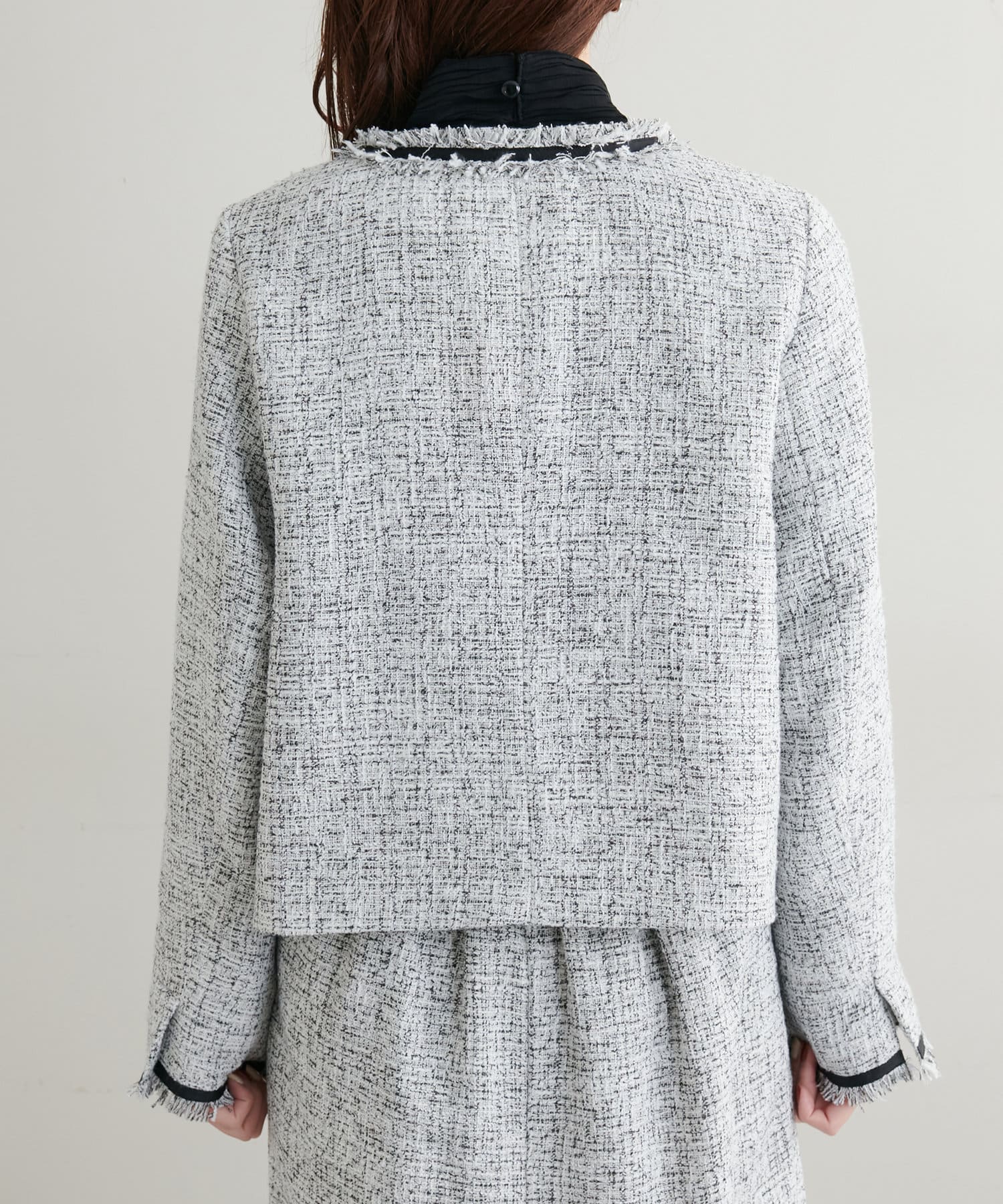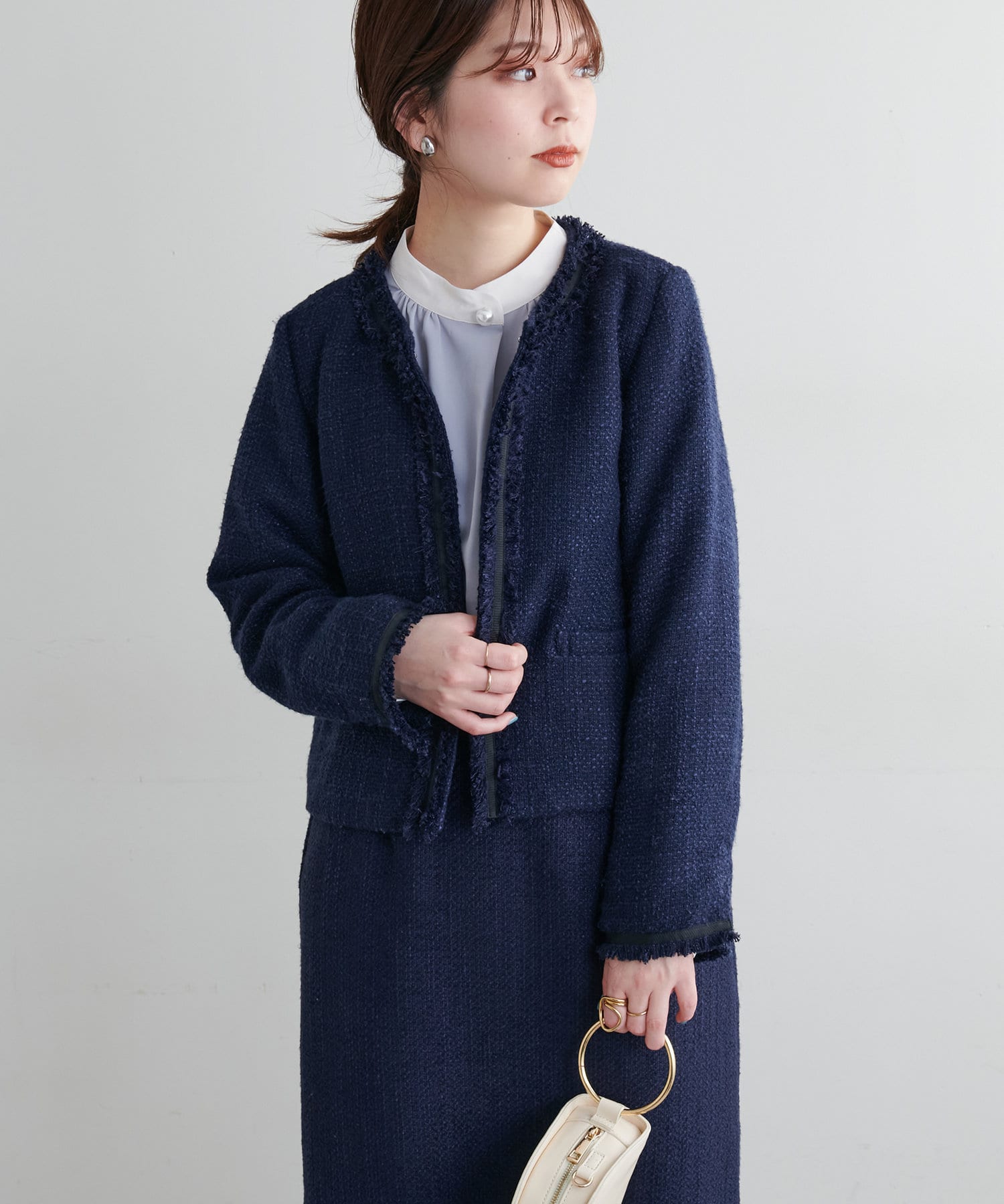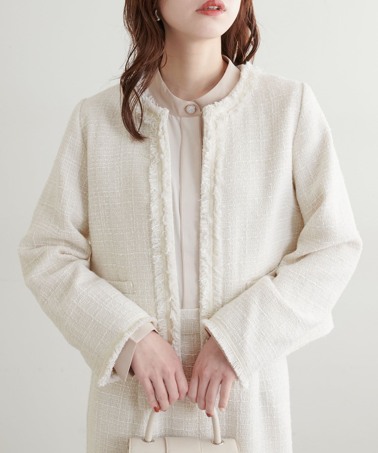 ハレの日/セットアップ着用可/ノーカラーフリンジツイードジャケット