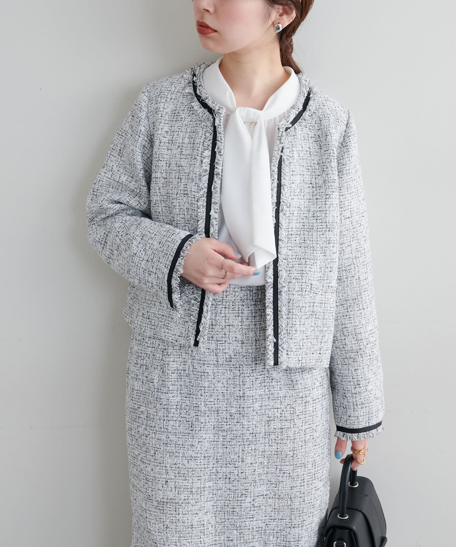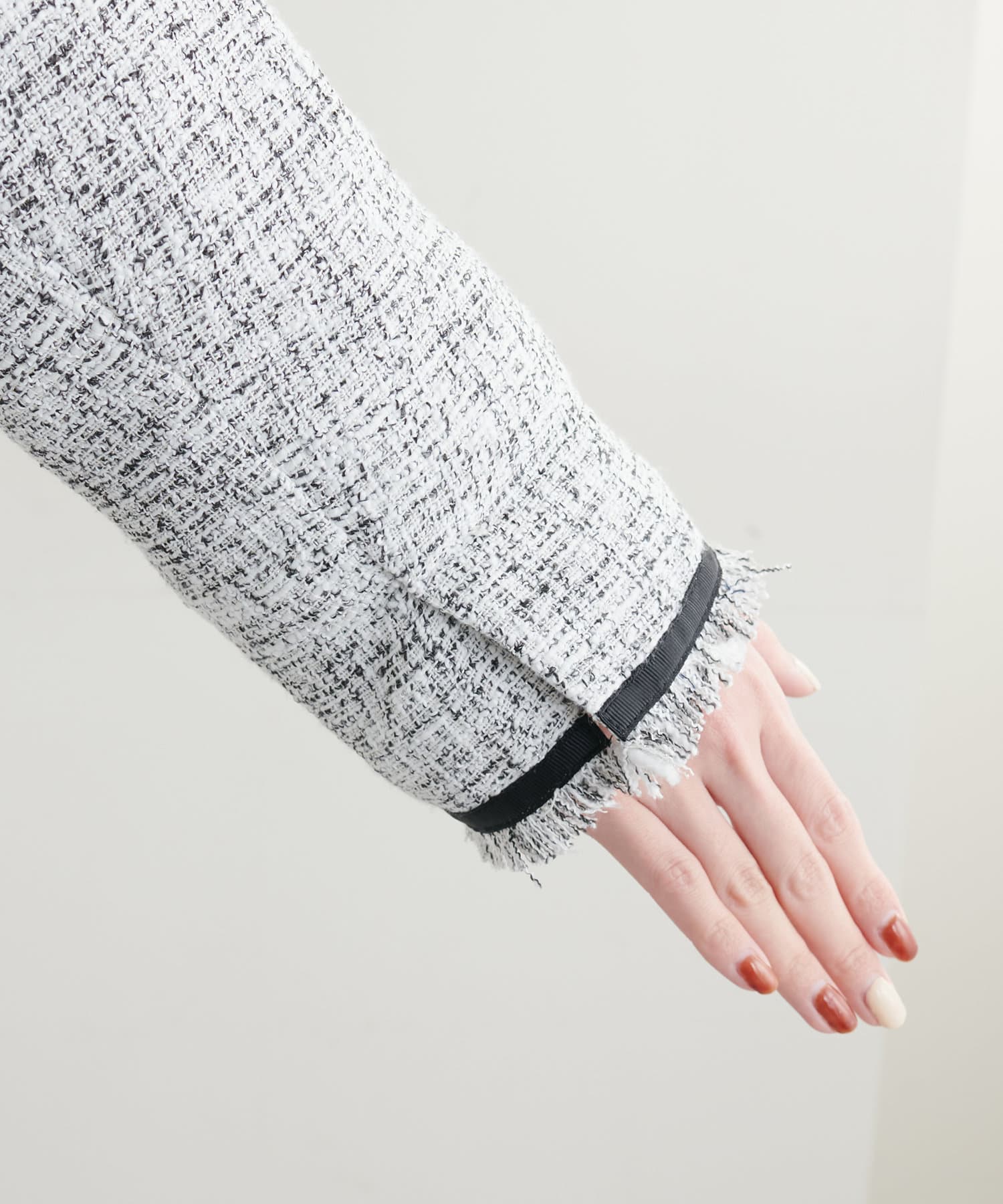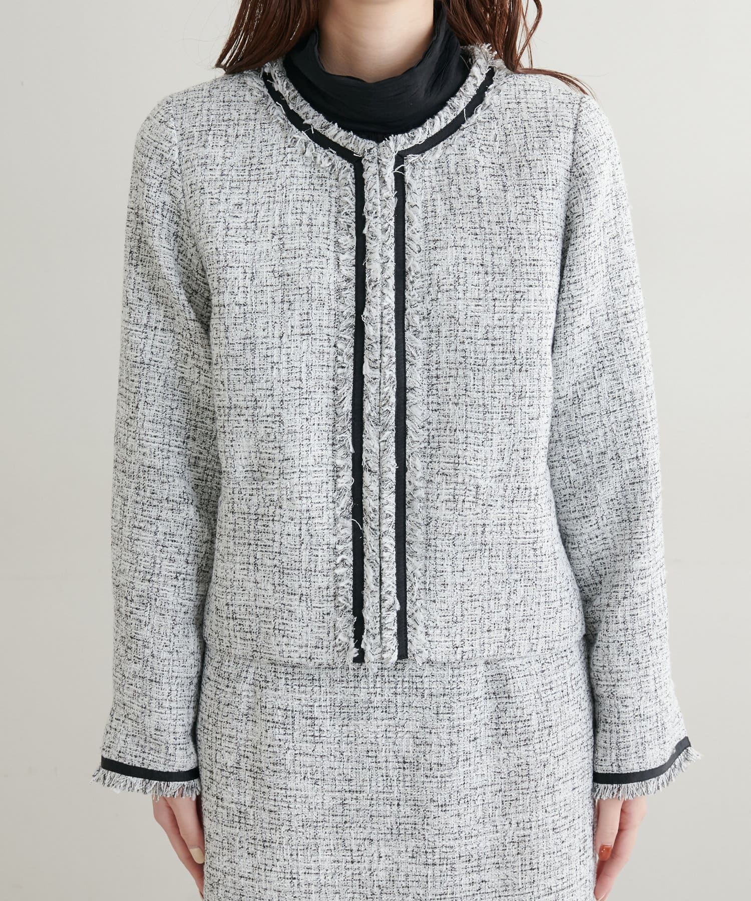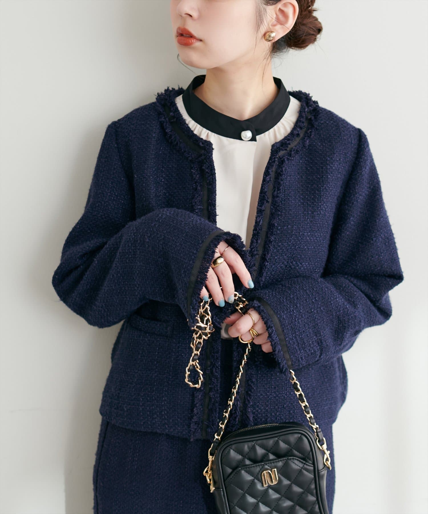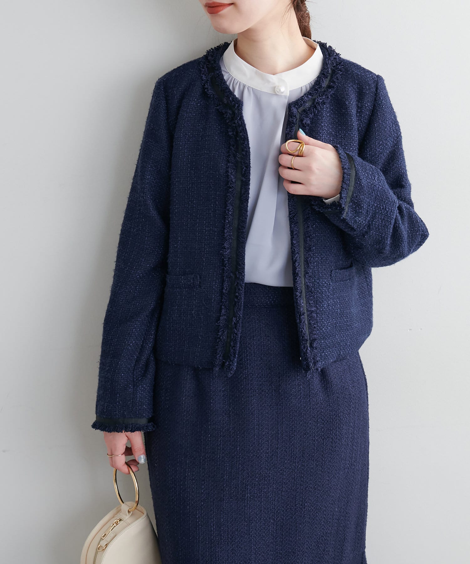 ハレの日/セットアップ着用可/ノーカラーフリンジツイードジャケット