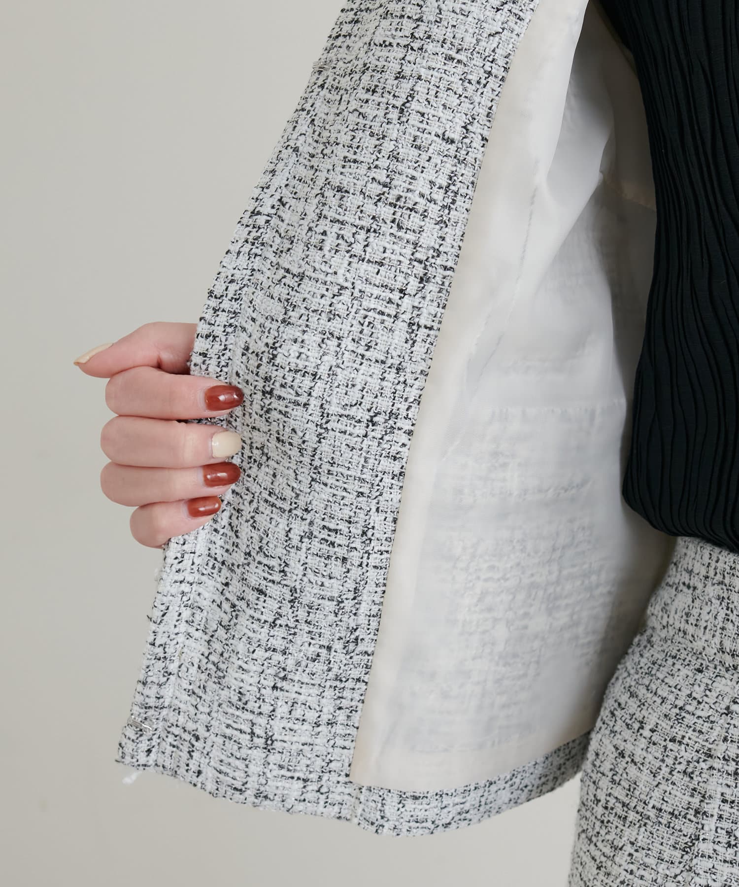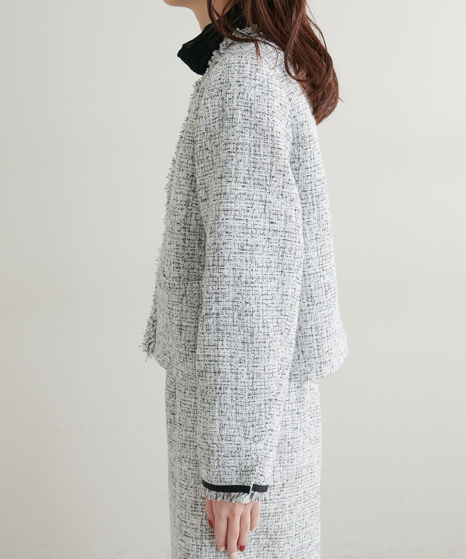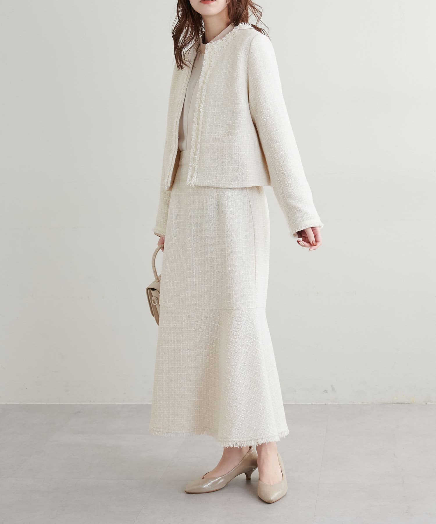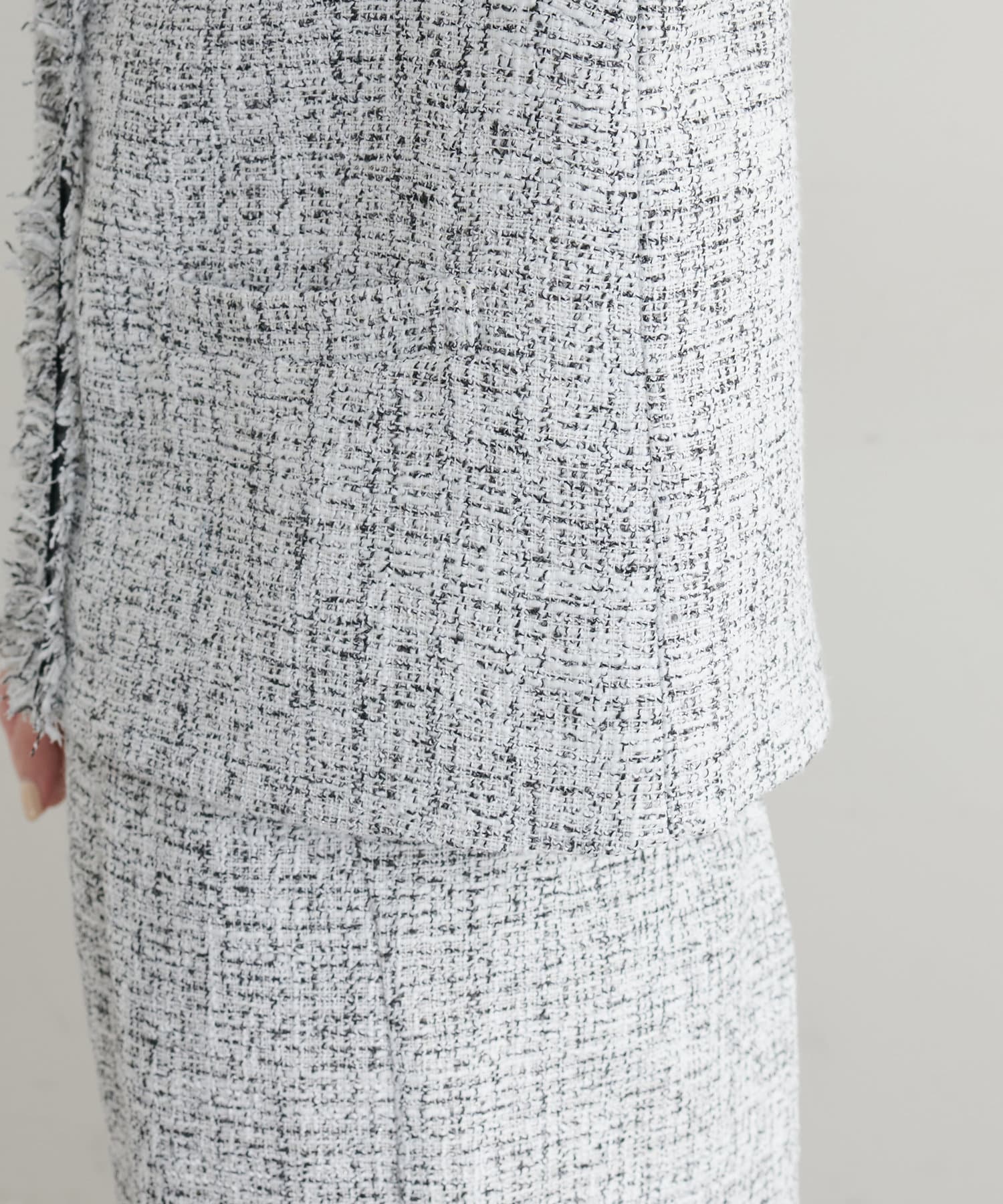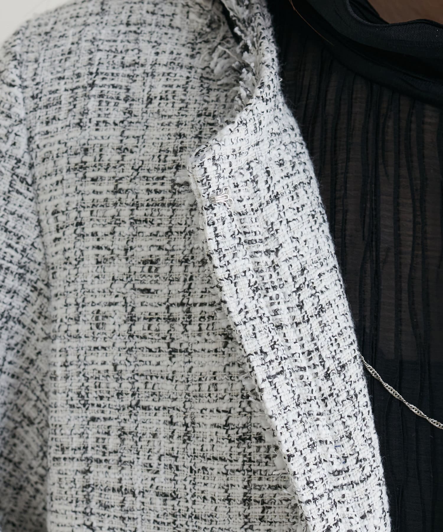 ハレの日/セットアップ着用可/ノーカラーフリンジツイードジャケット