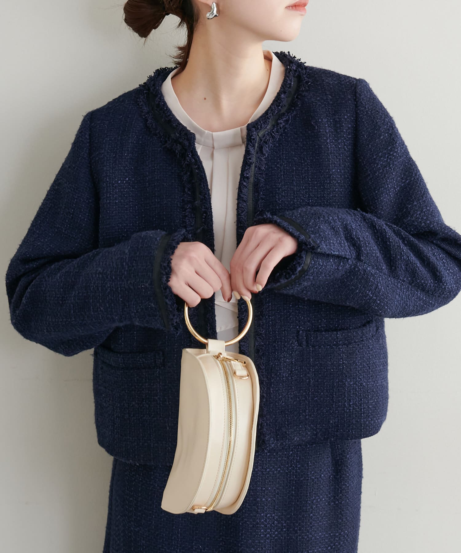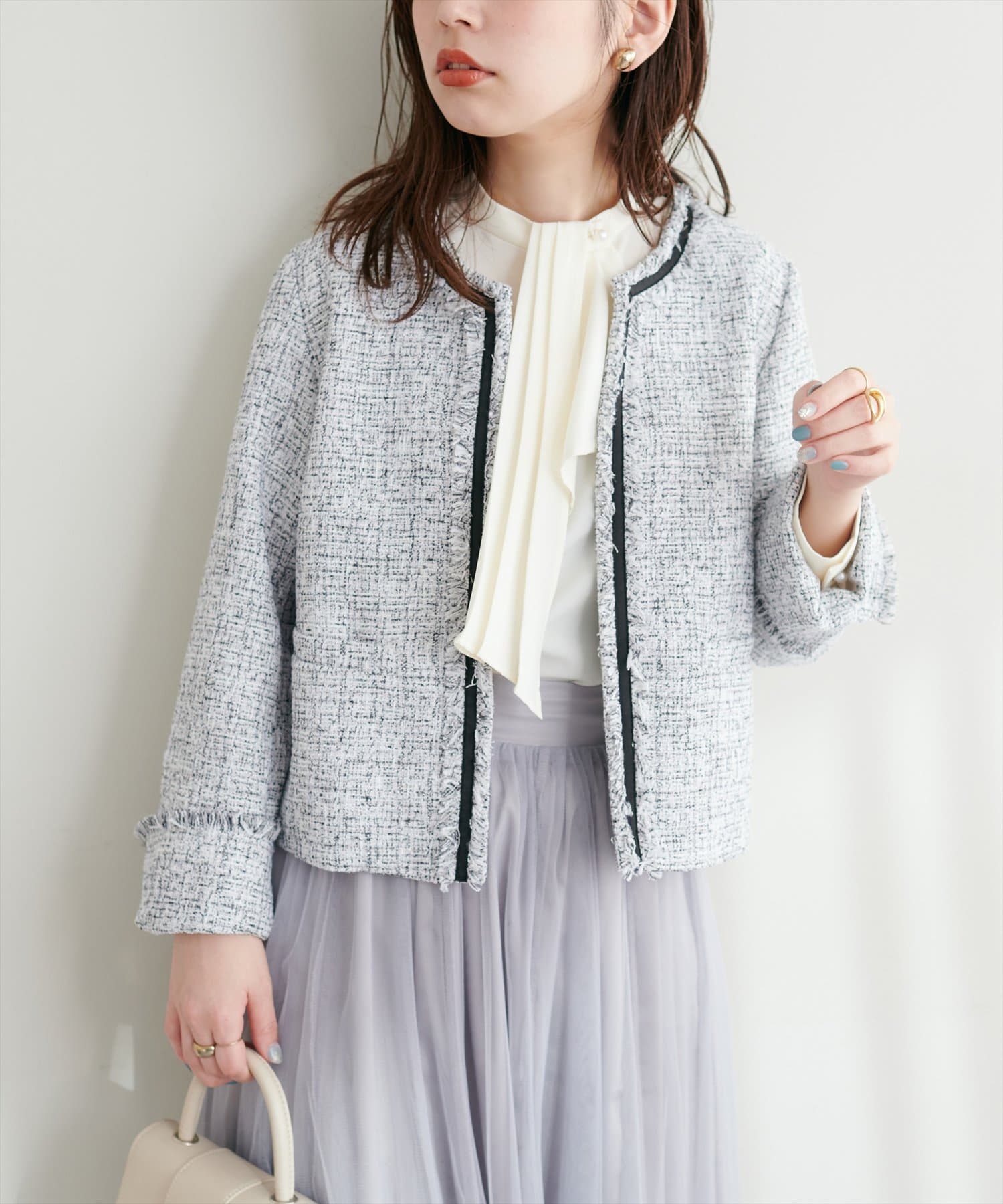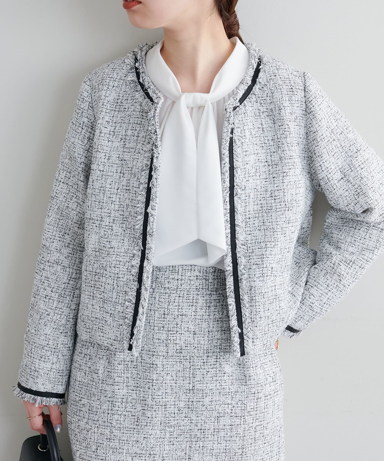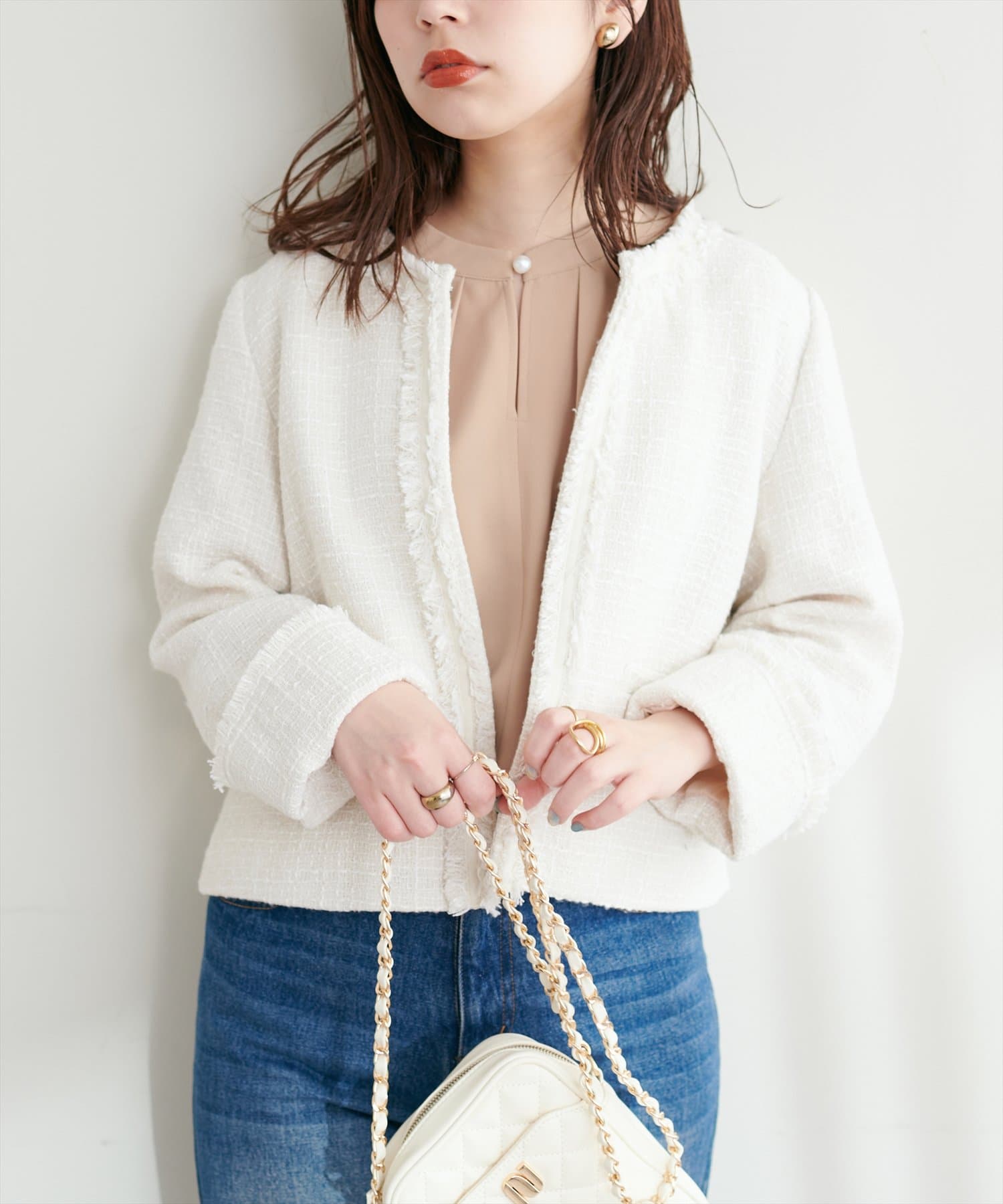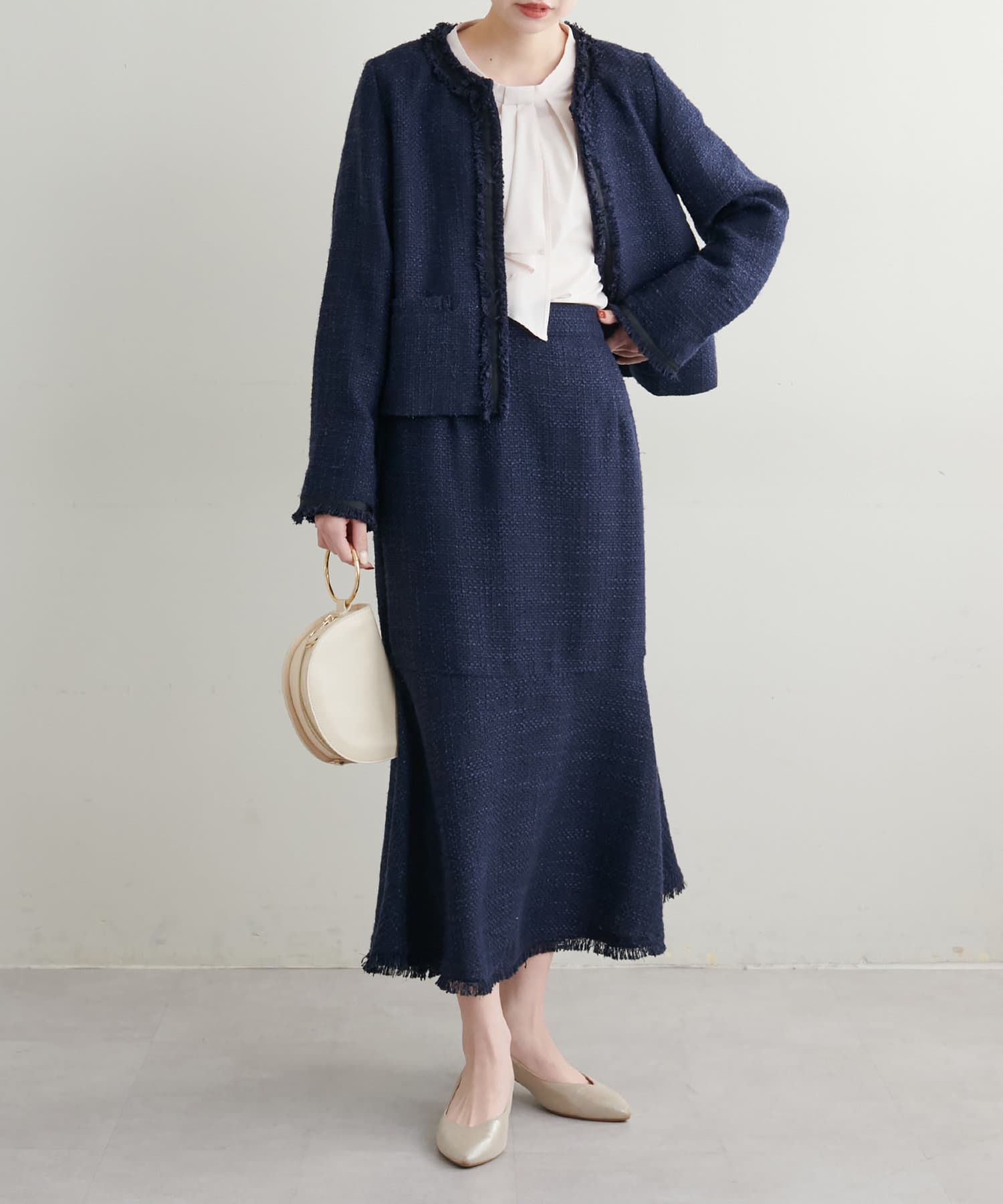 ハレの日/セットアップ着用可/ノーカラーフリンジツイードジャケット