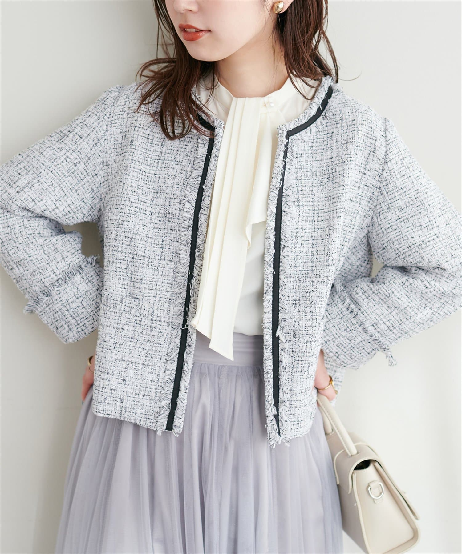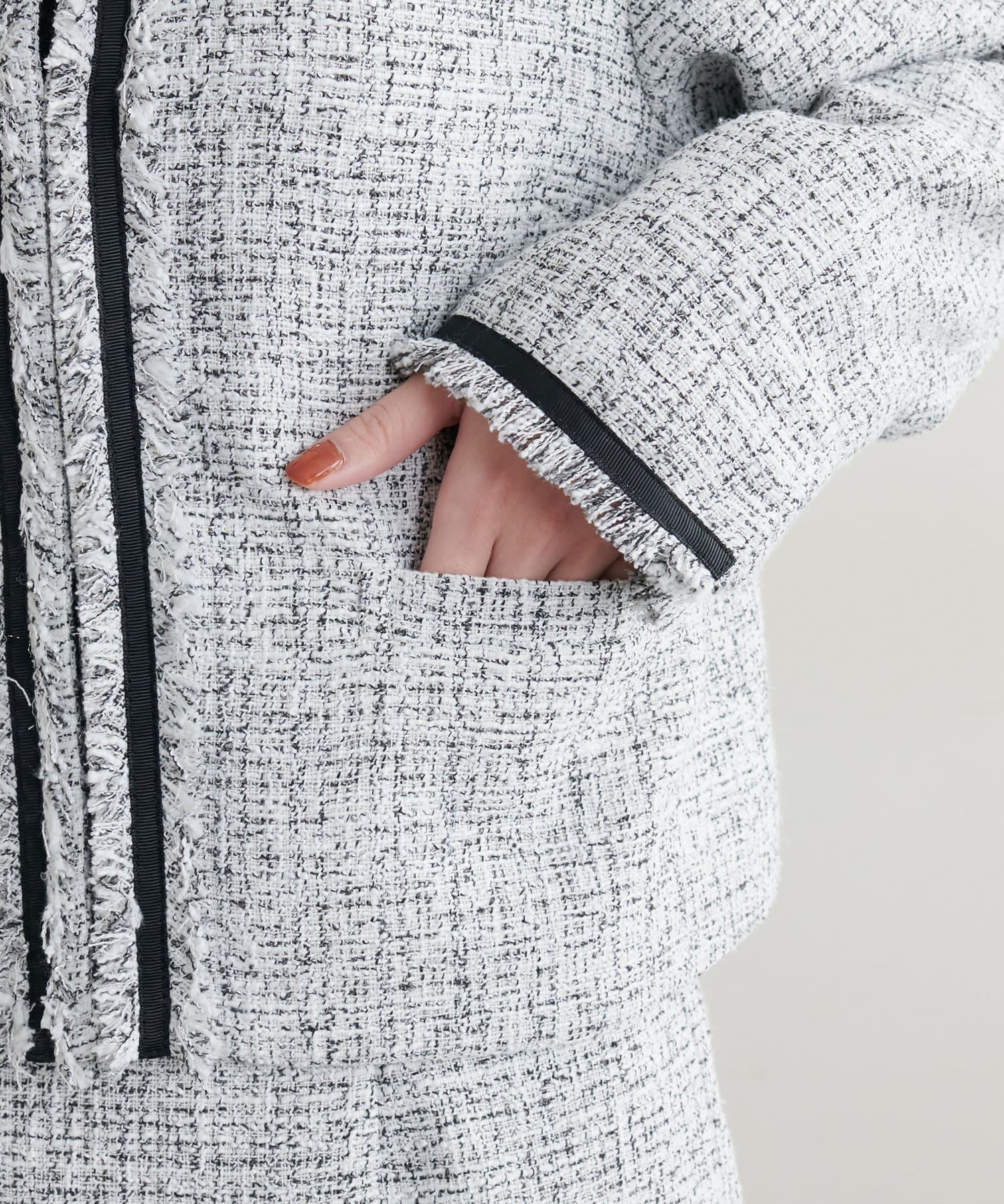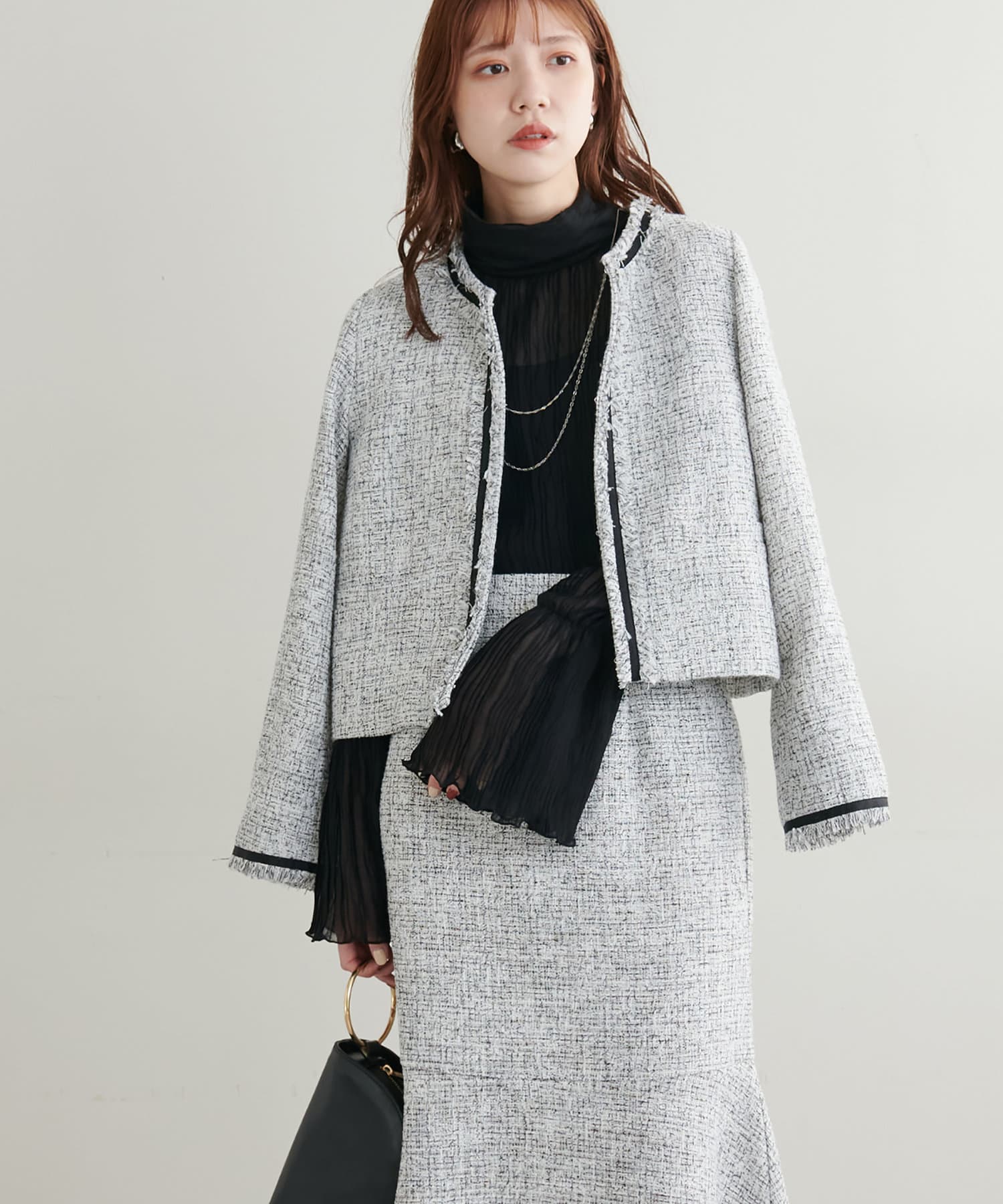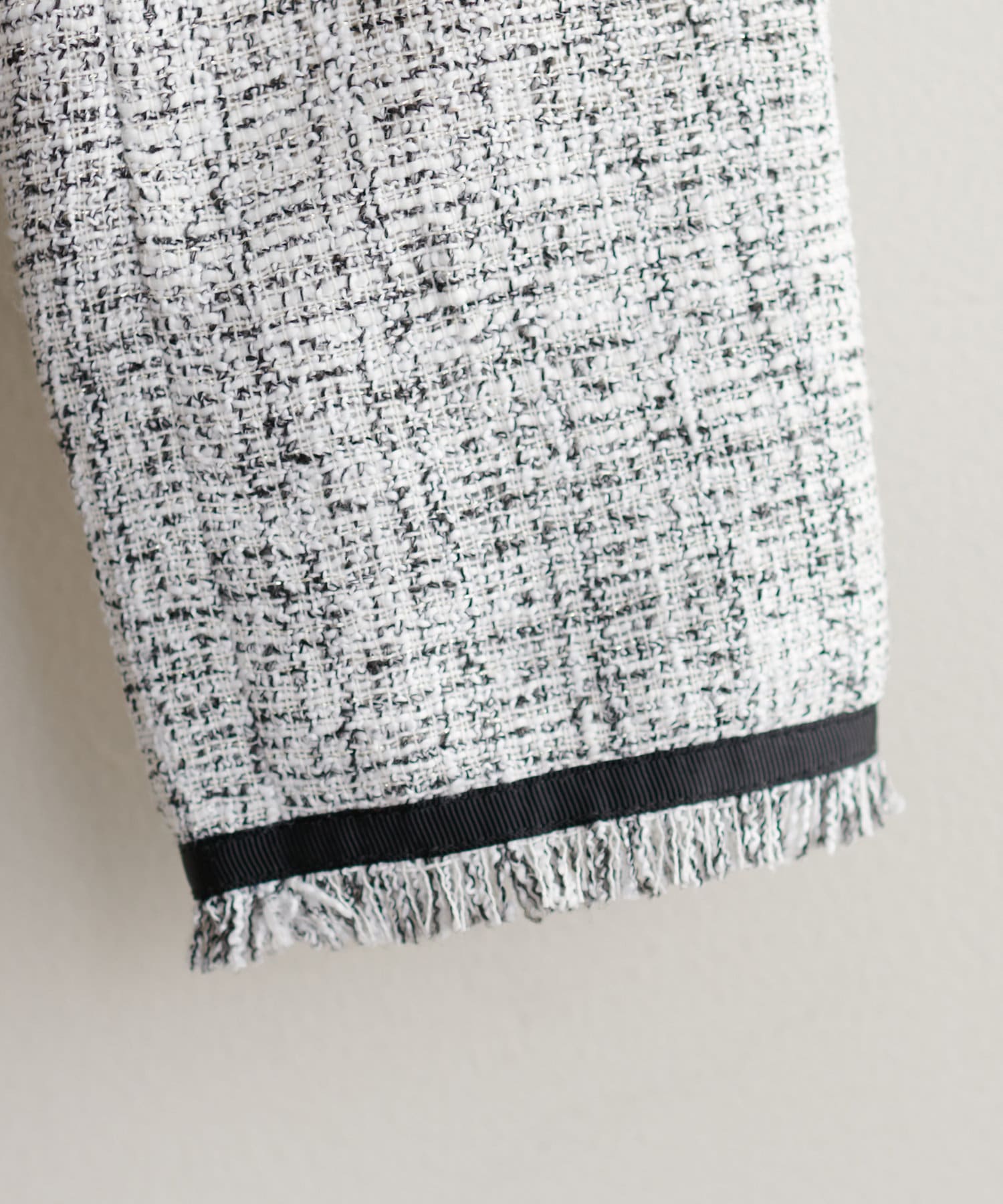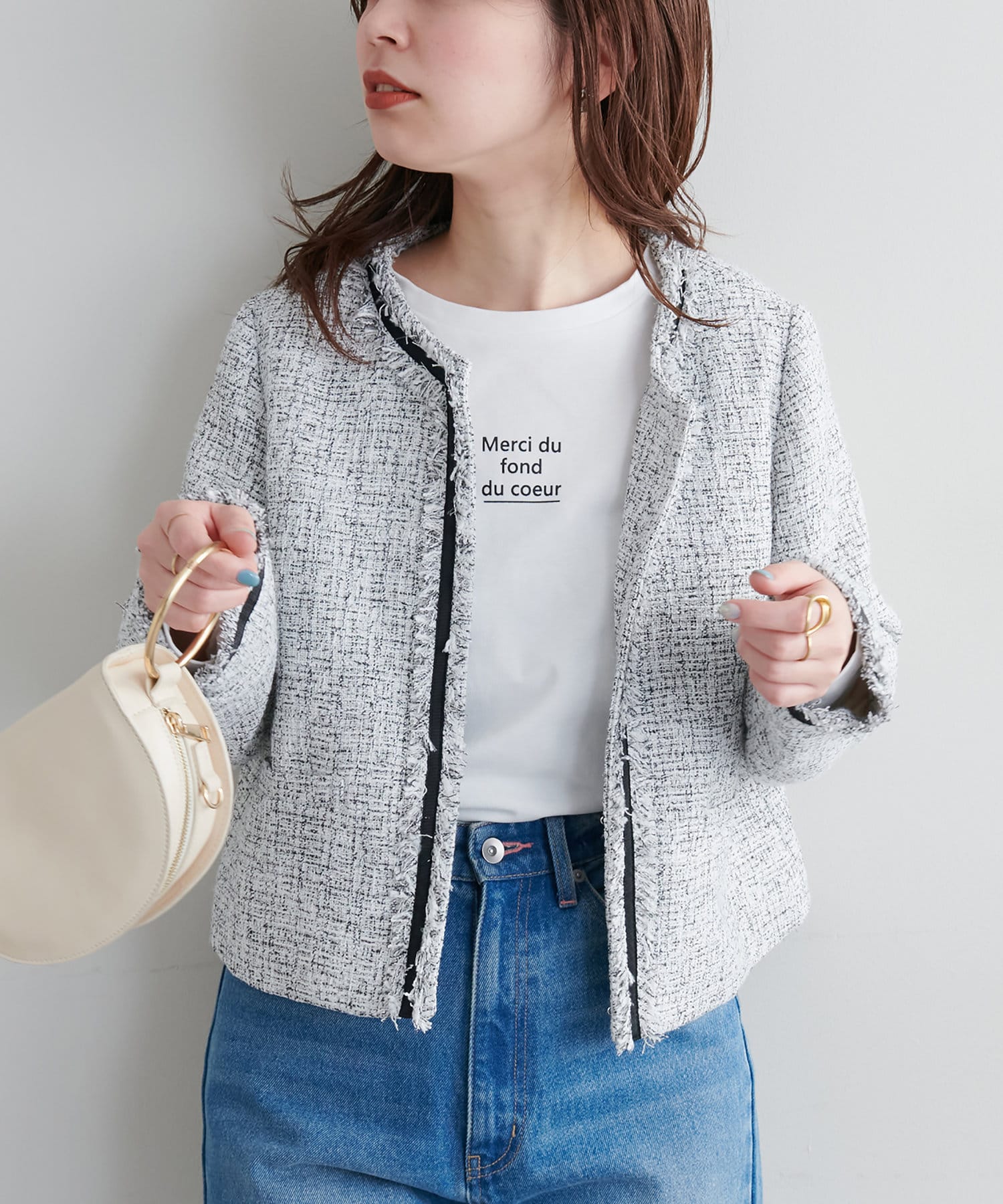 ハレの日/セットアップ着用可/ノーカラーフリンジツイードジャケット