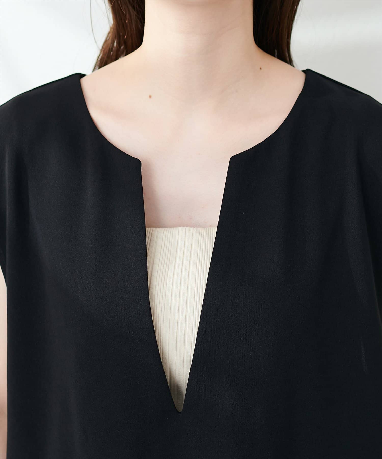 首元を華奢に見せるやや深めのキーネックデザインに仕上げました。