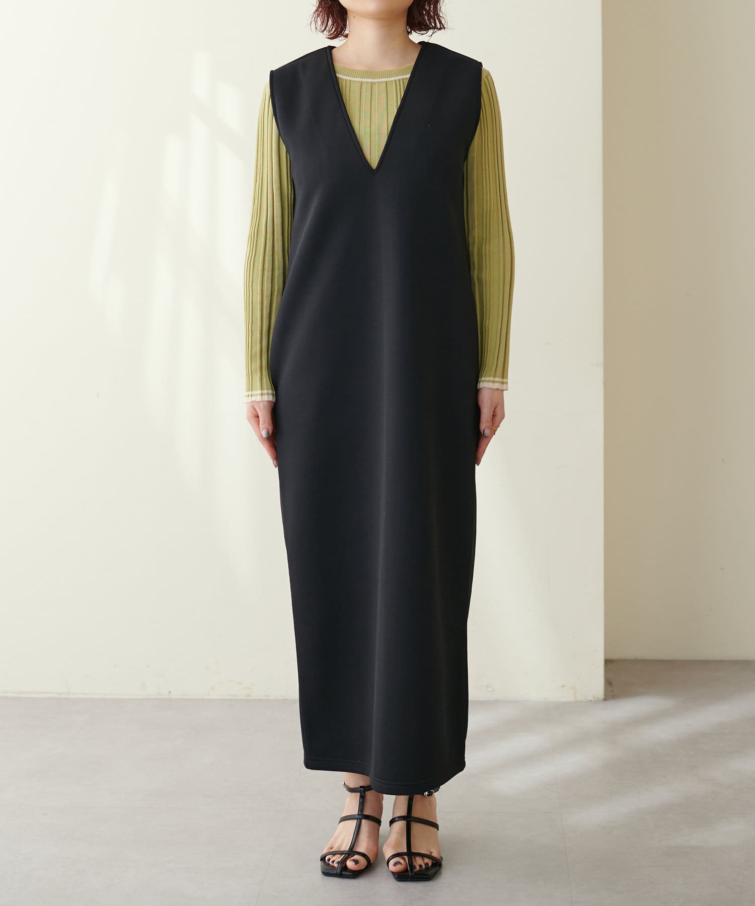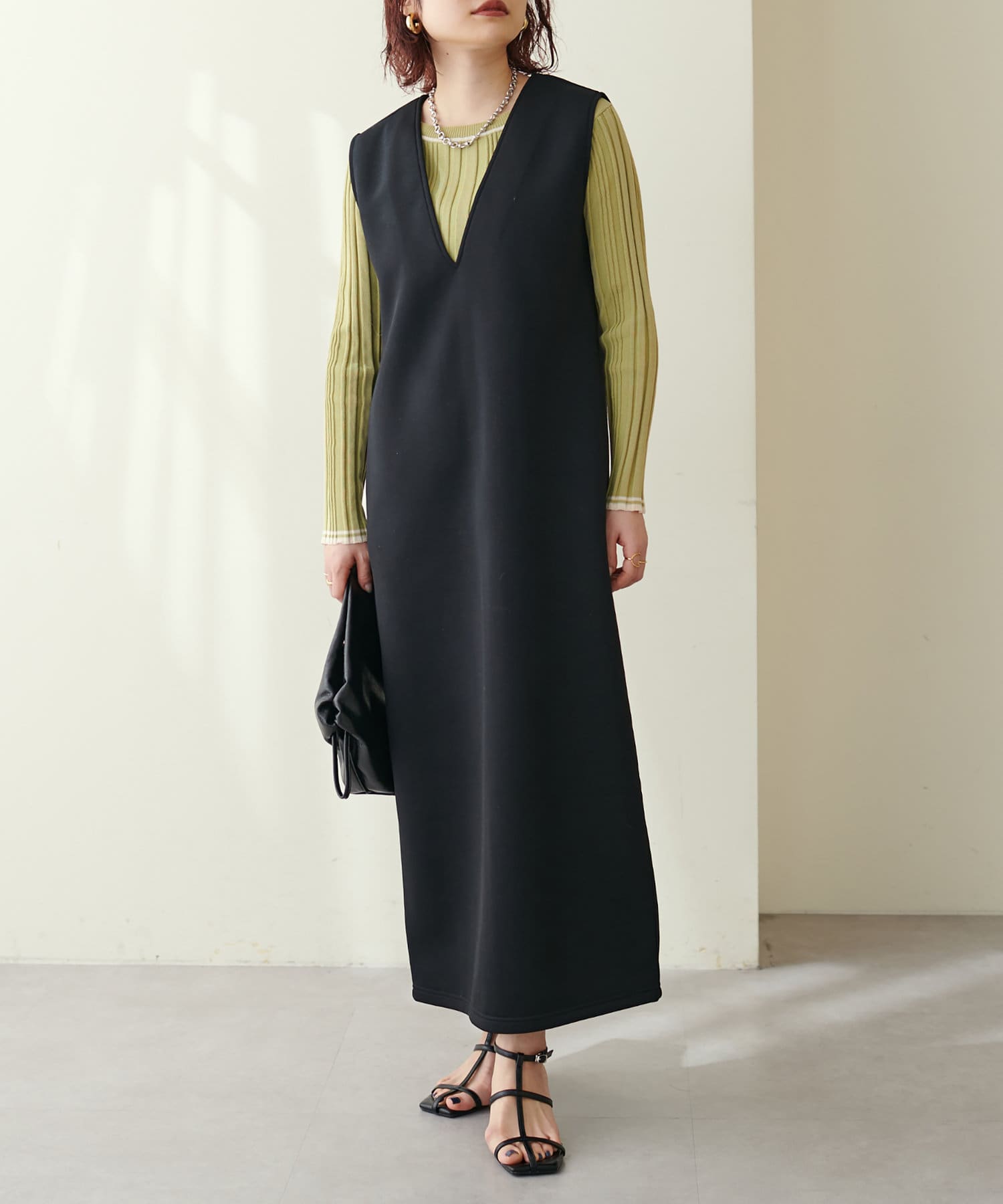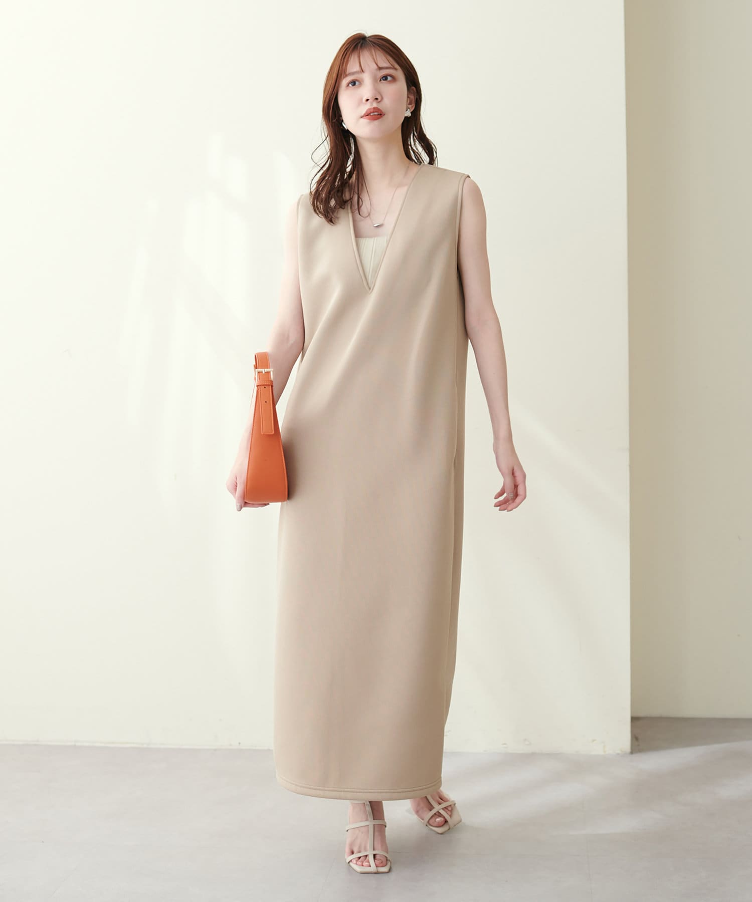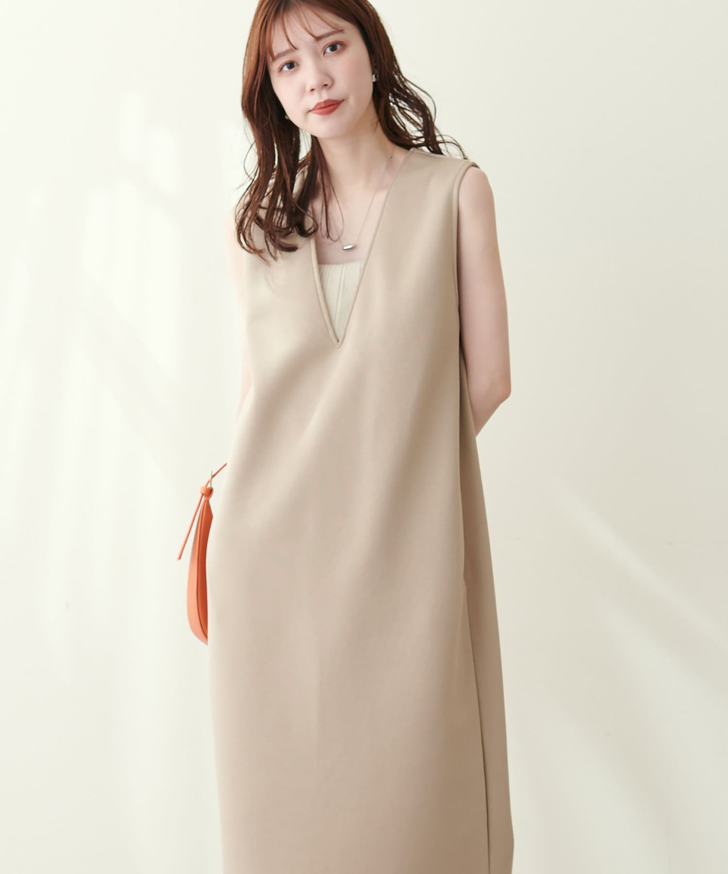 Vネックのデザインがお顔周りをシャープに見せるワンピース。