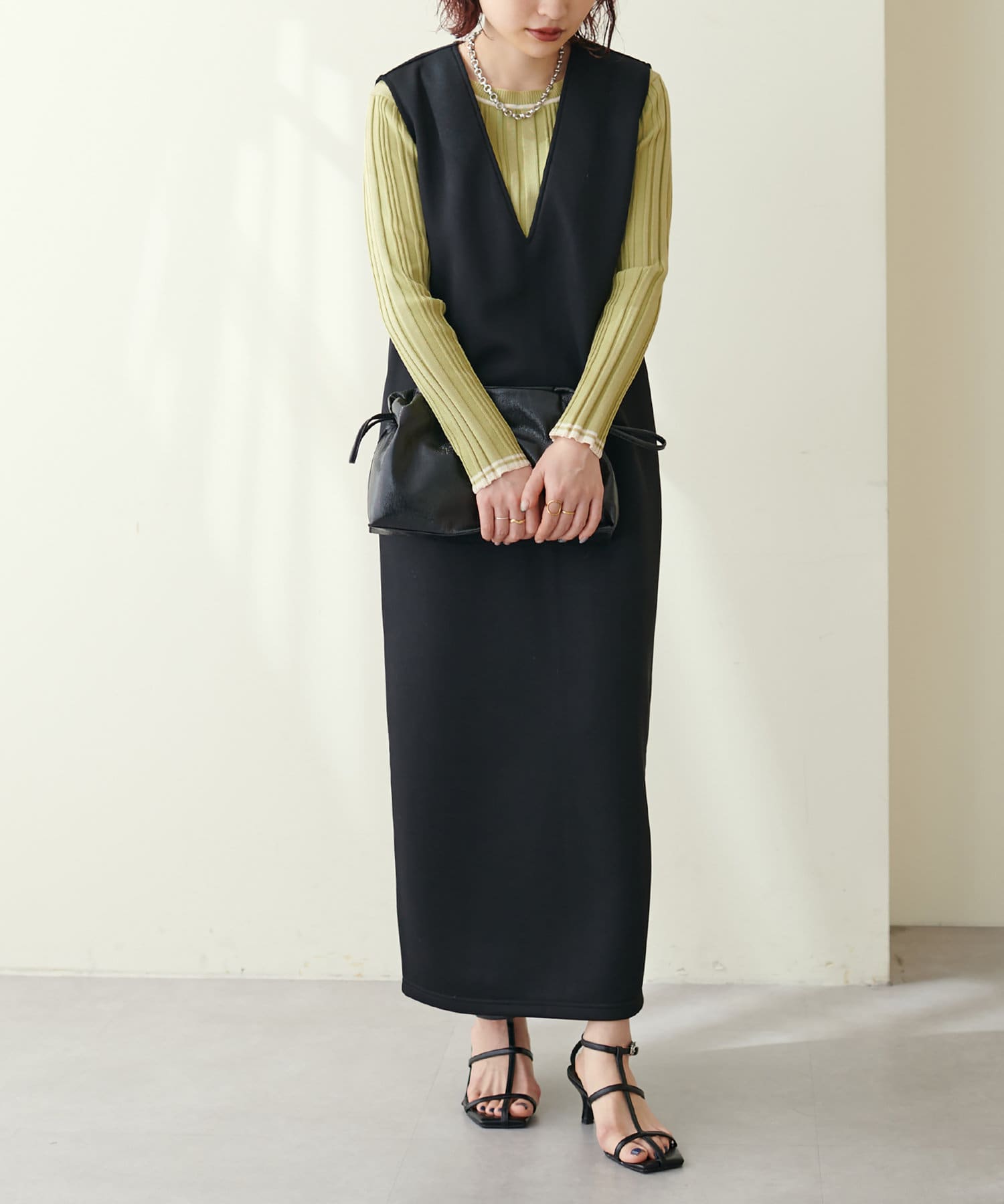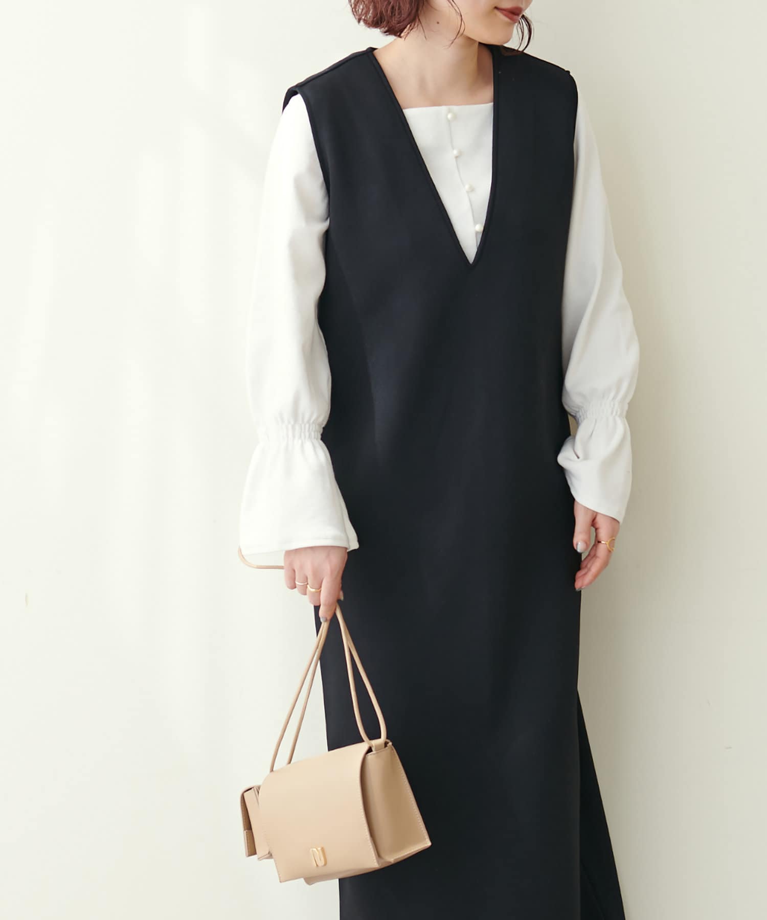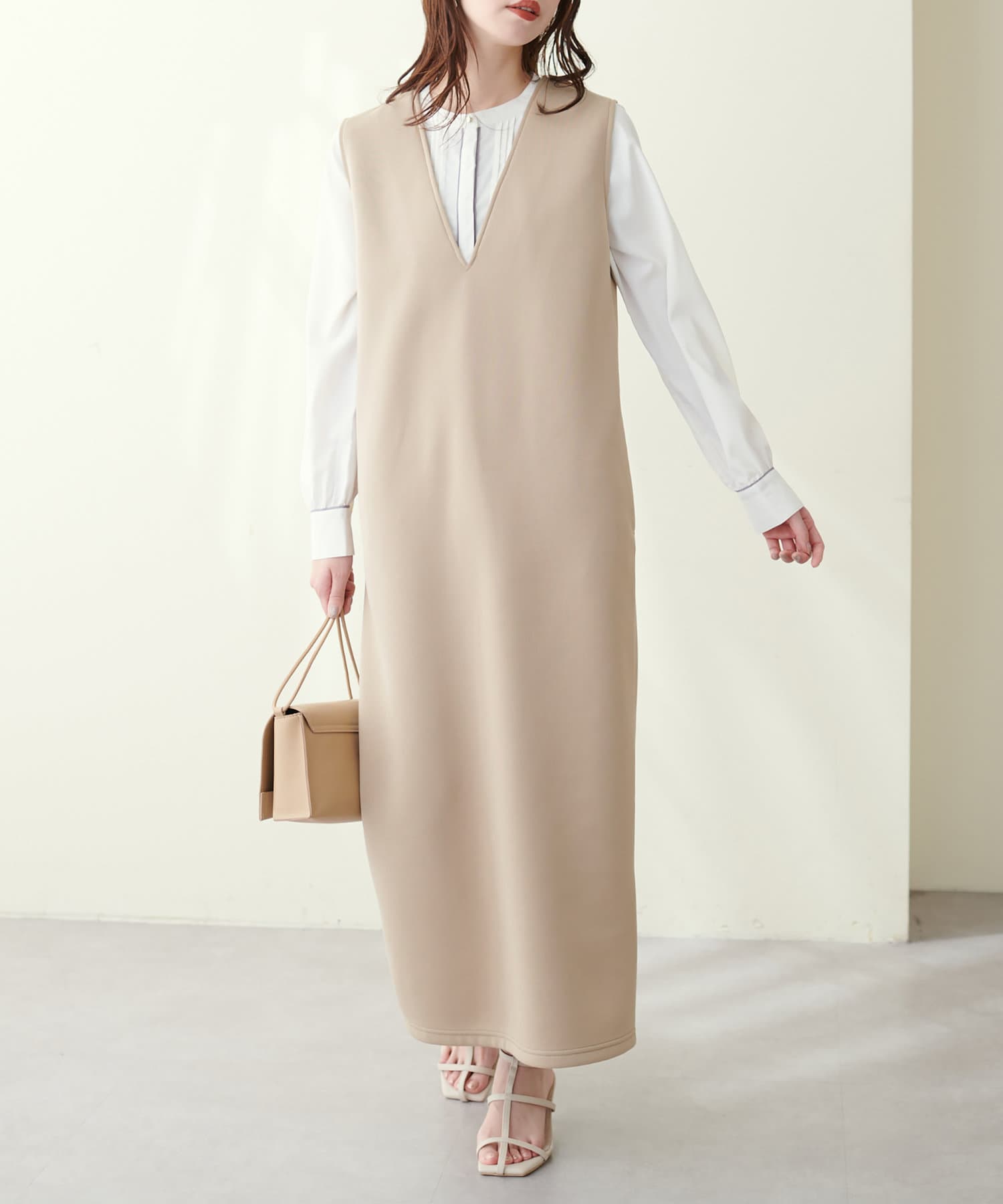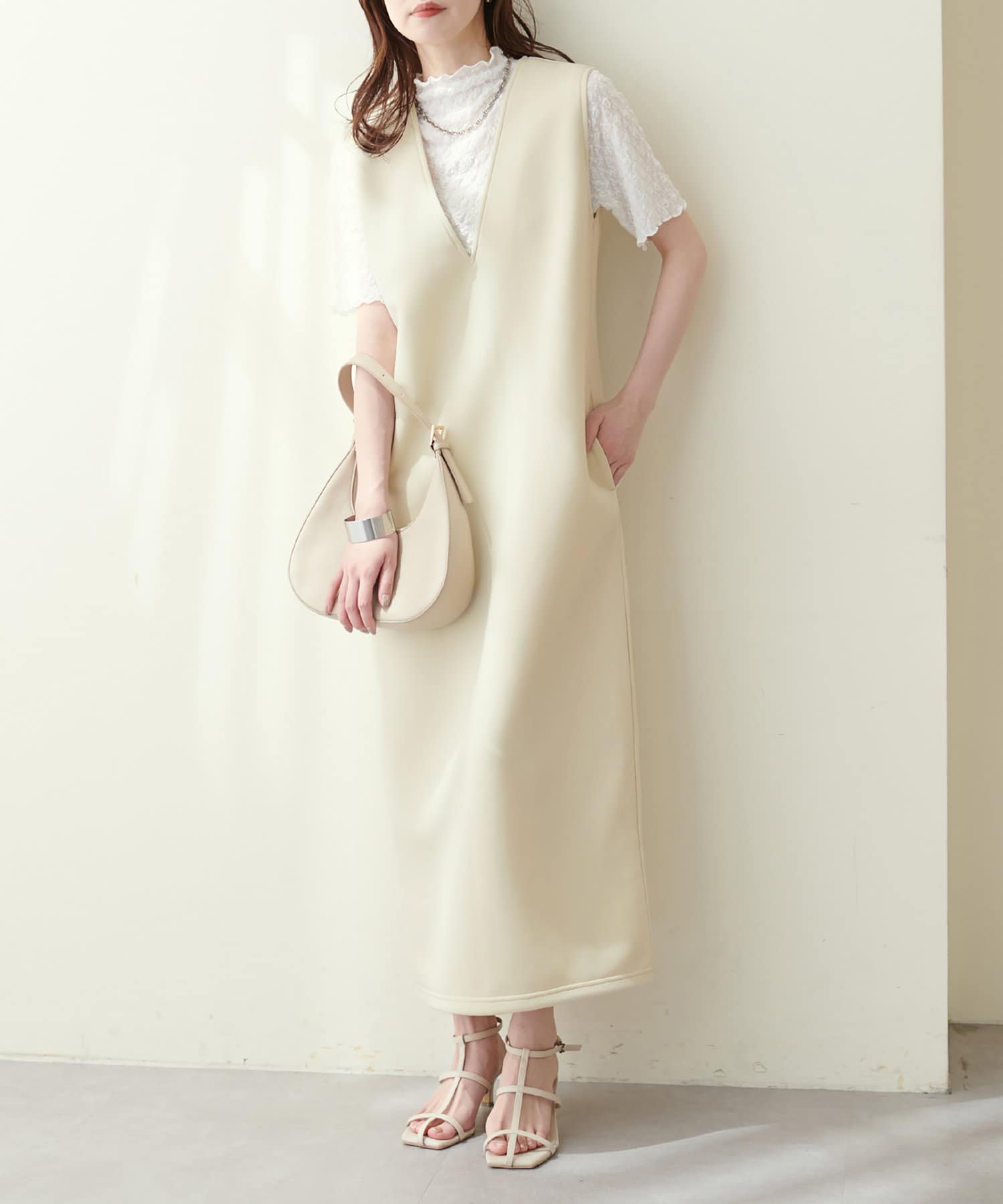Vネックのデザインがお顔周りをシャープに見せるワンピース。