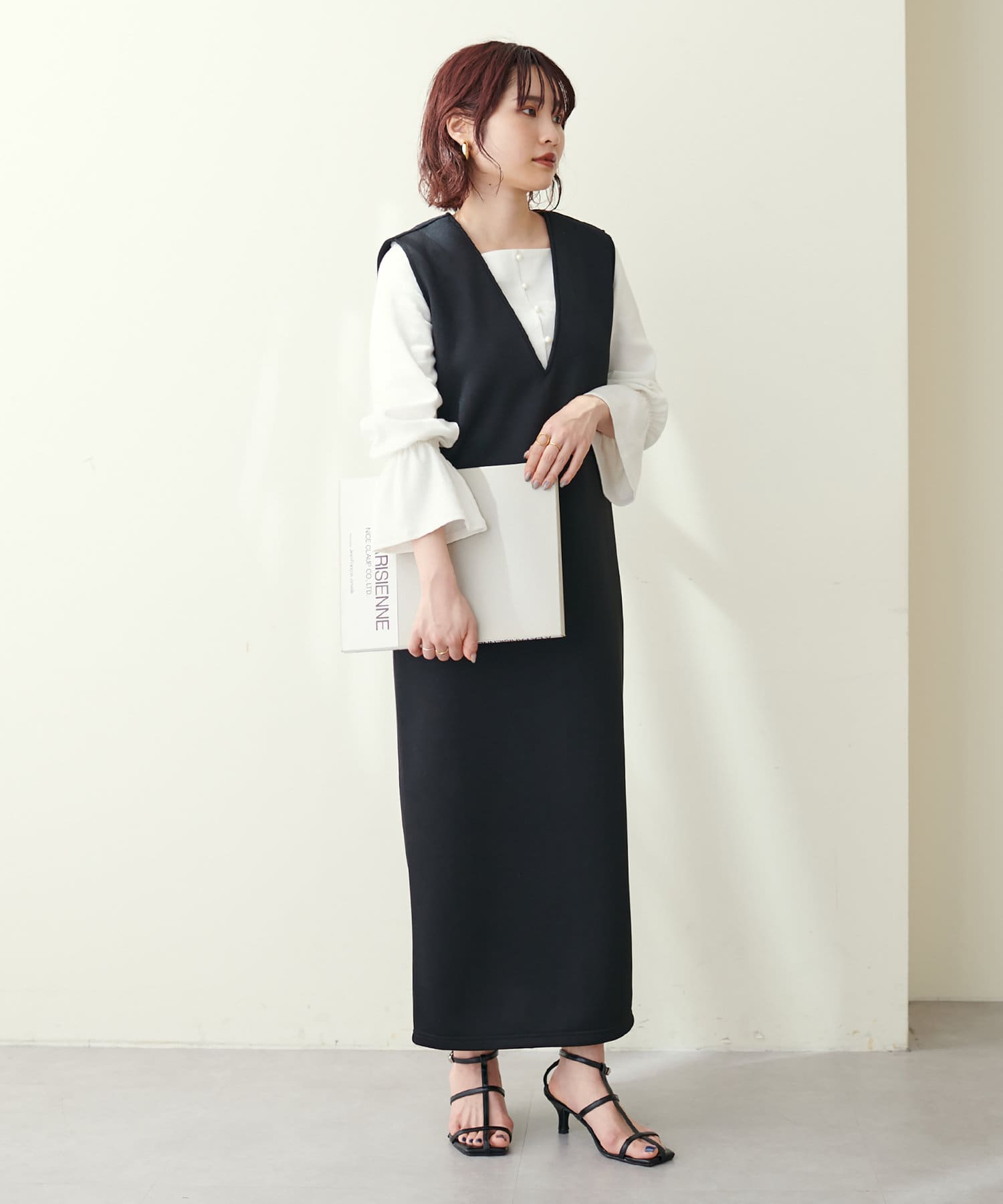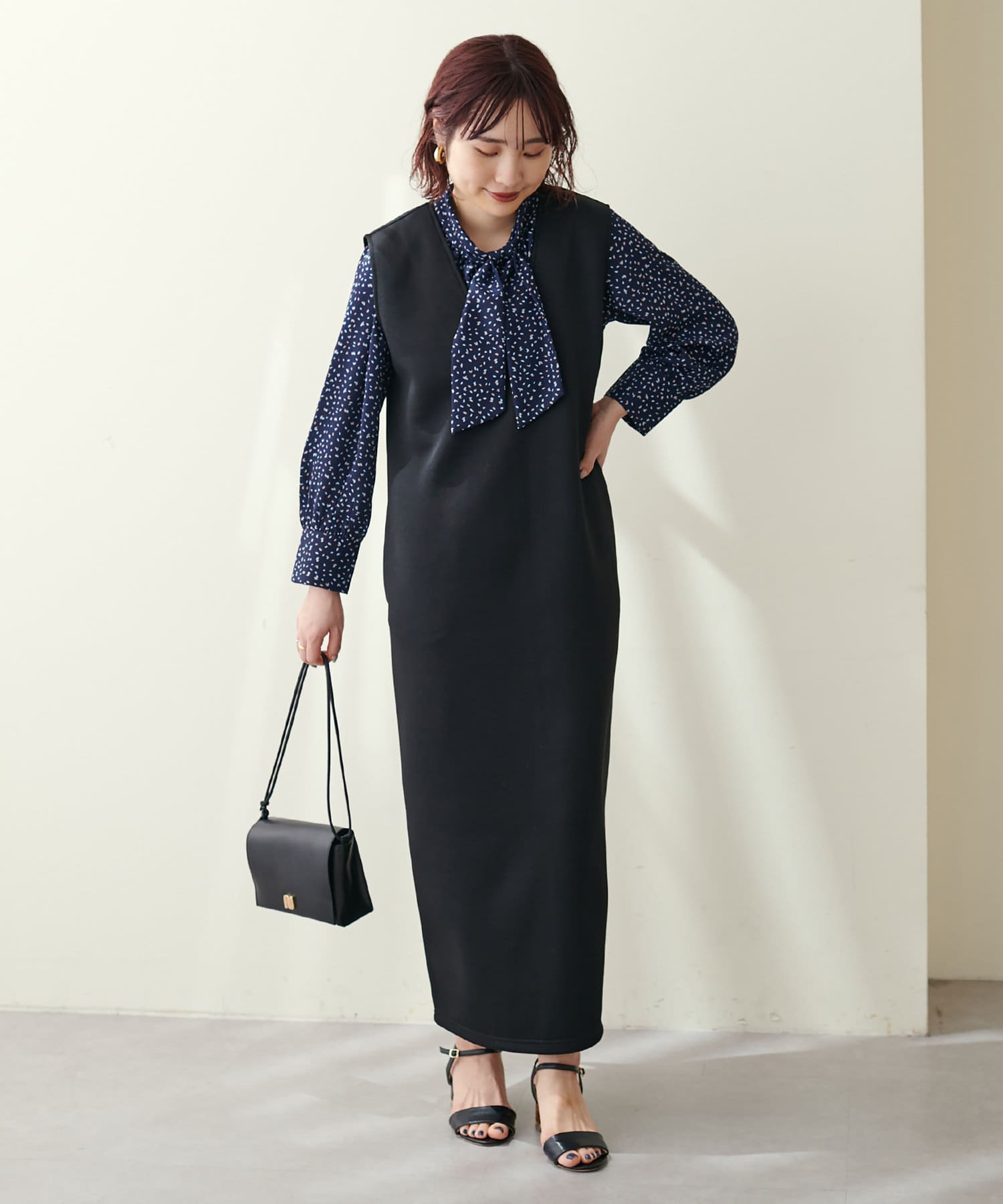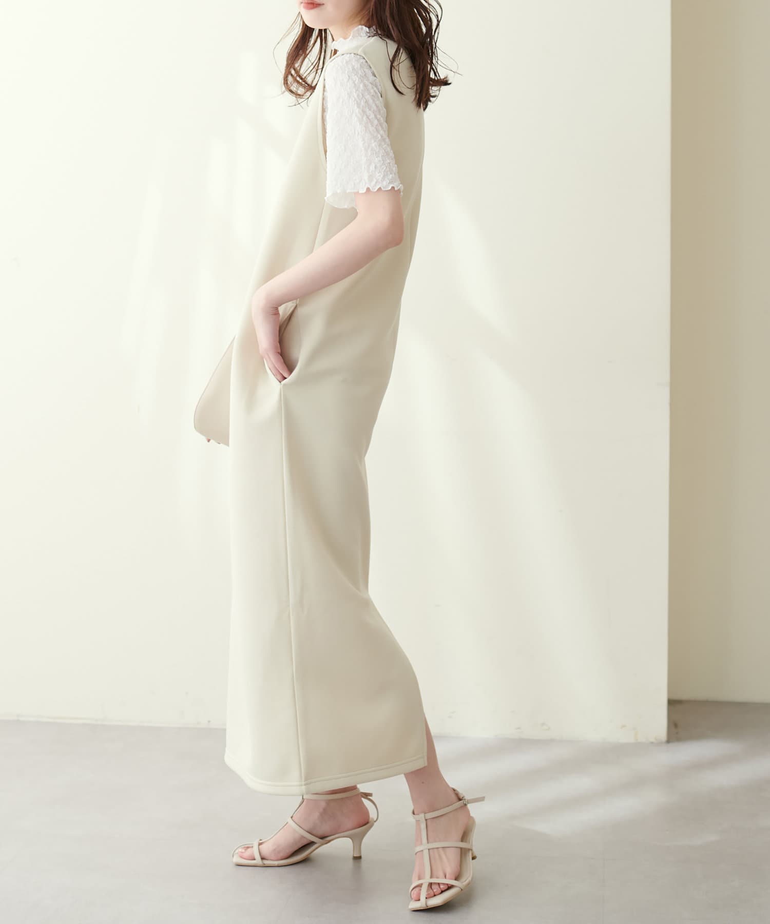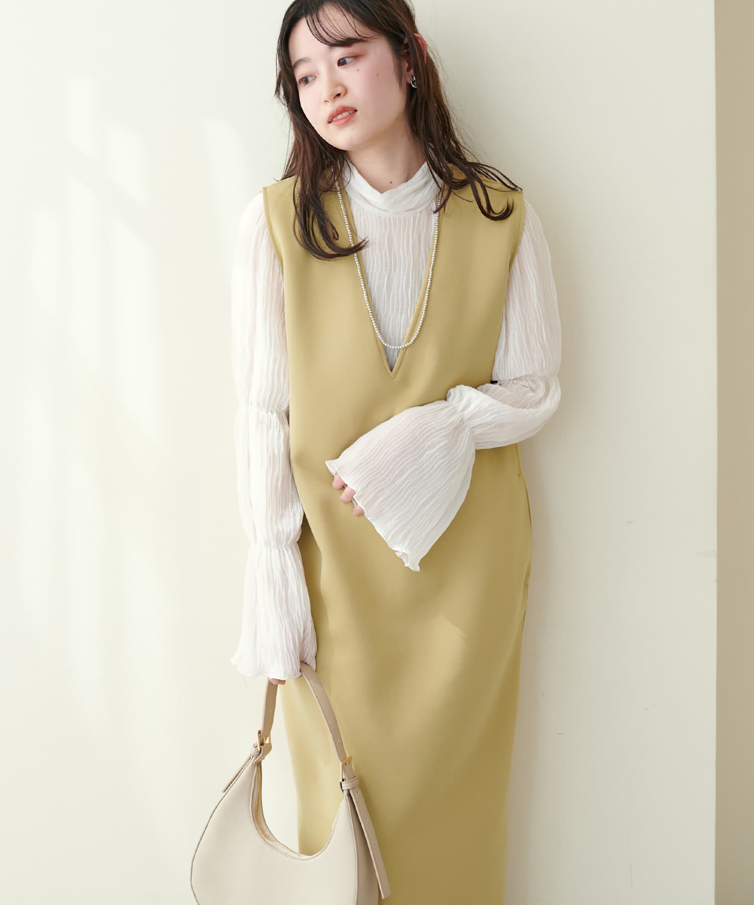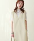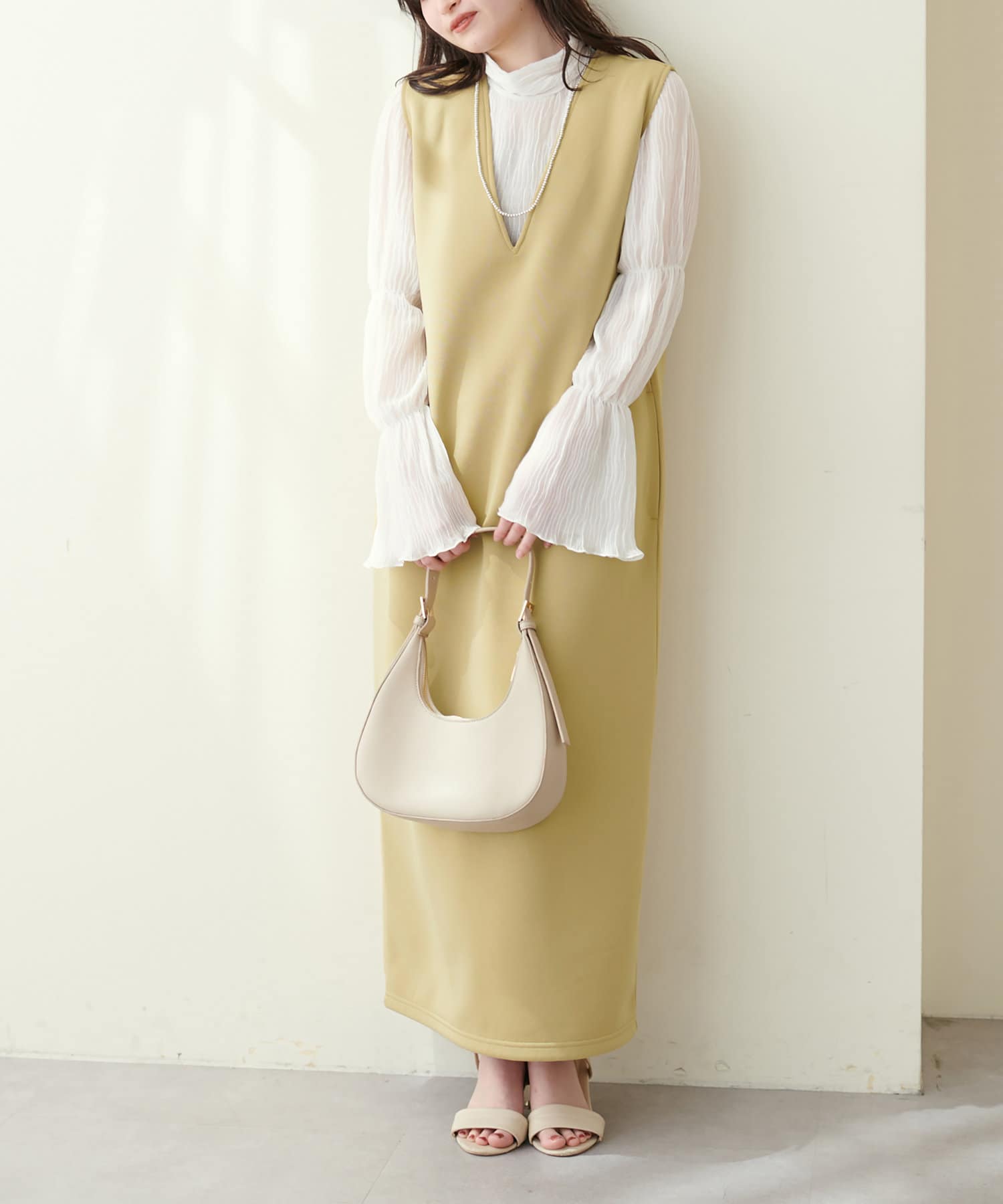 Vネックのデザインがお顔周りをシャープに見せるワンピース。
