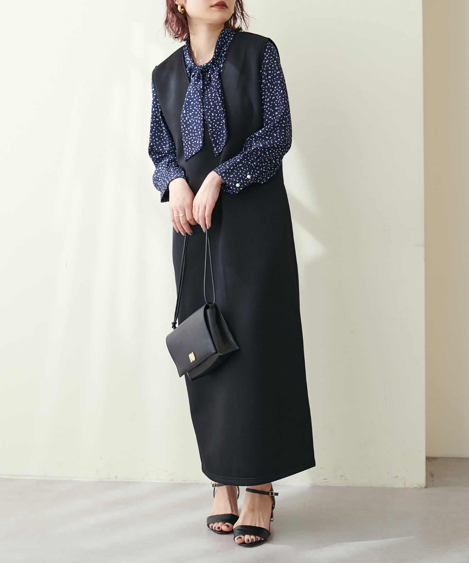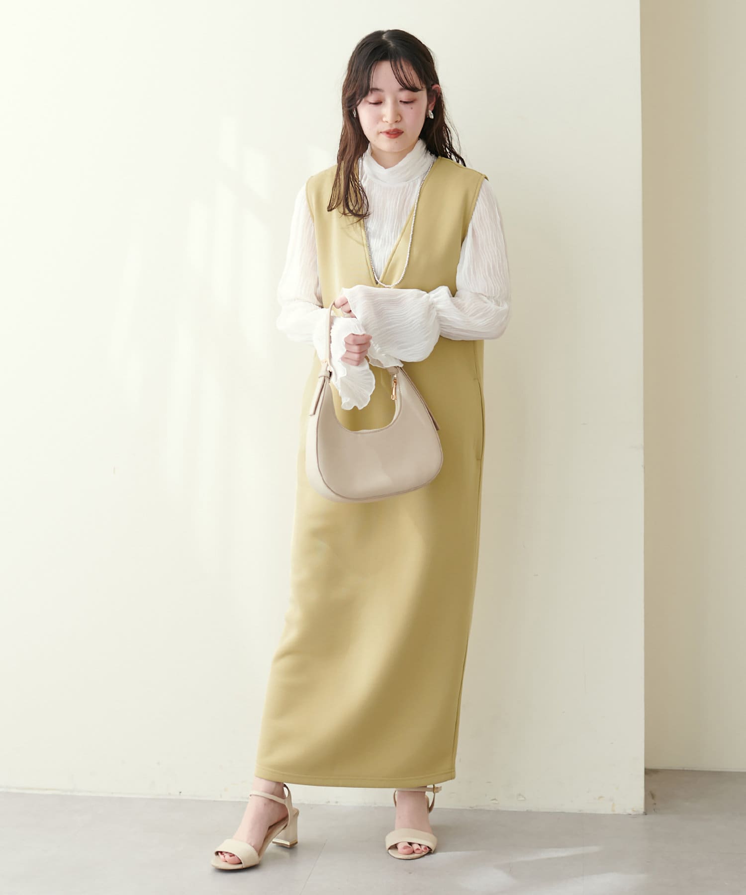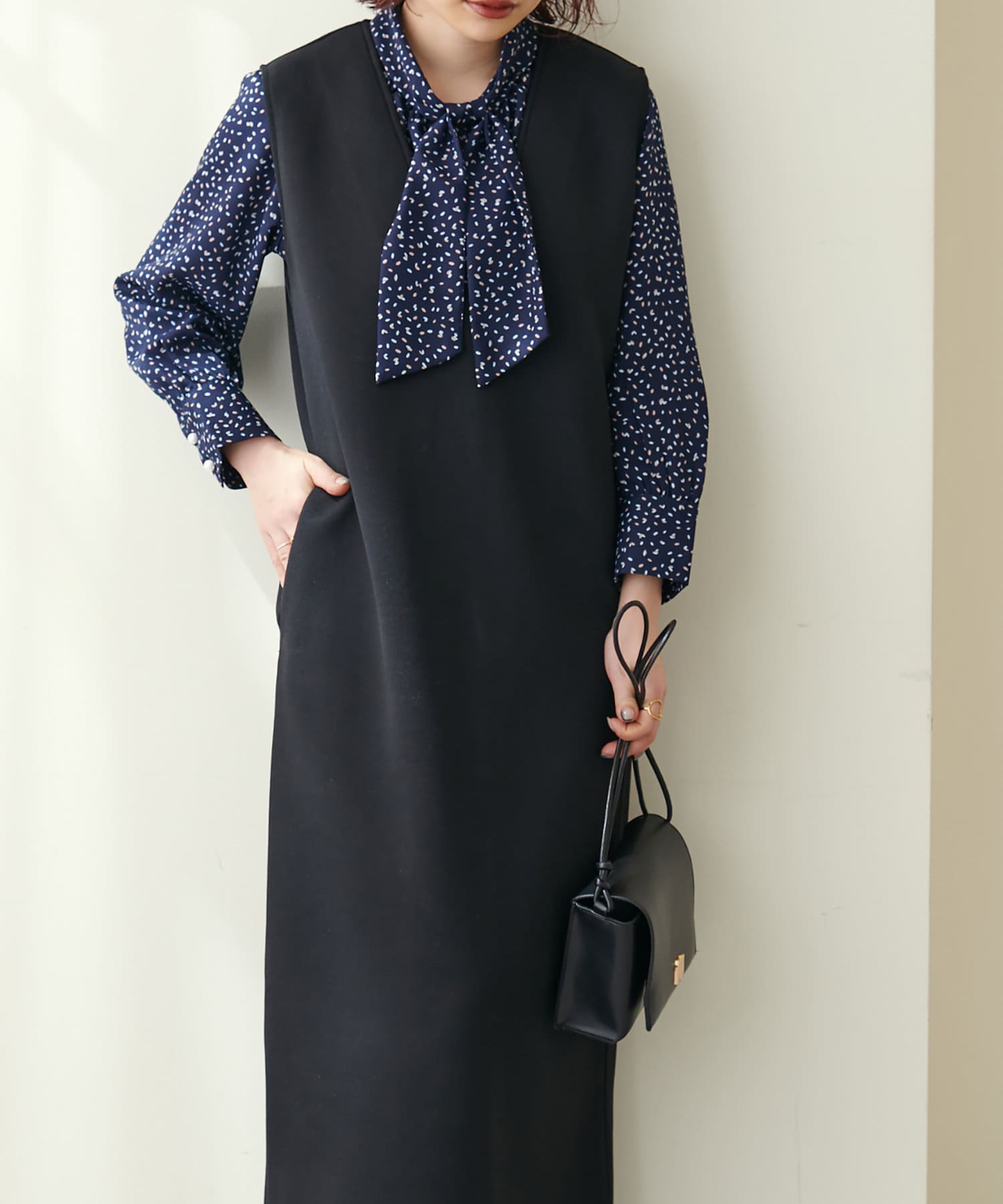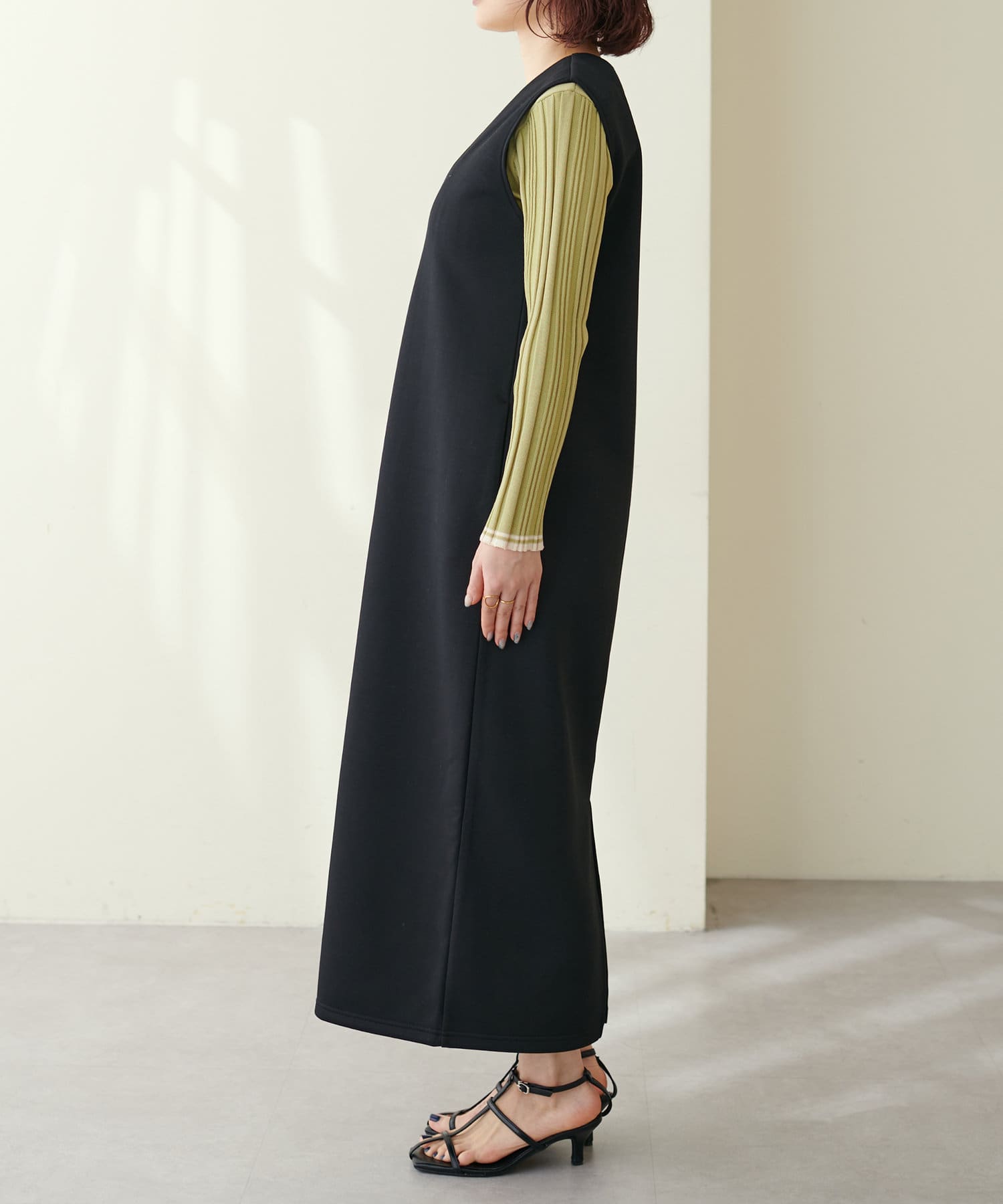 Vネックのデザインがお顔周りをシャープに見せるワンピース。