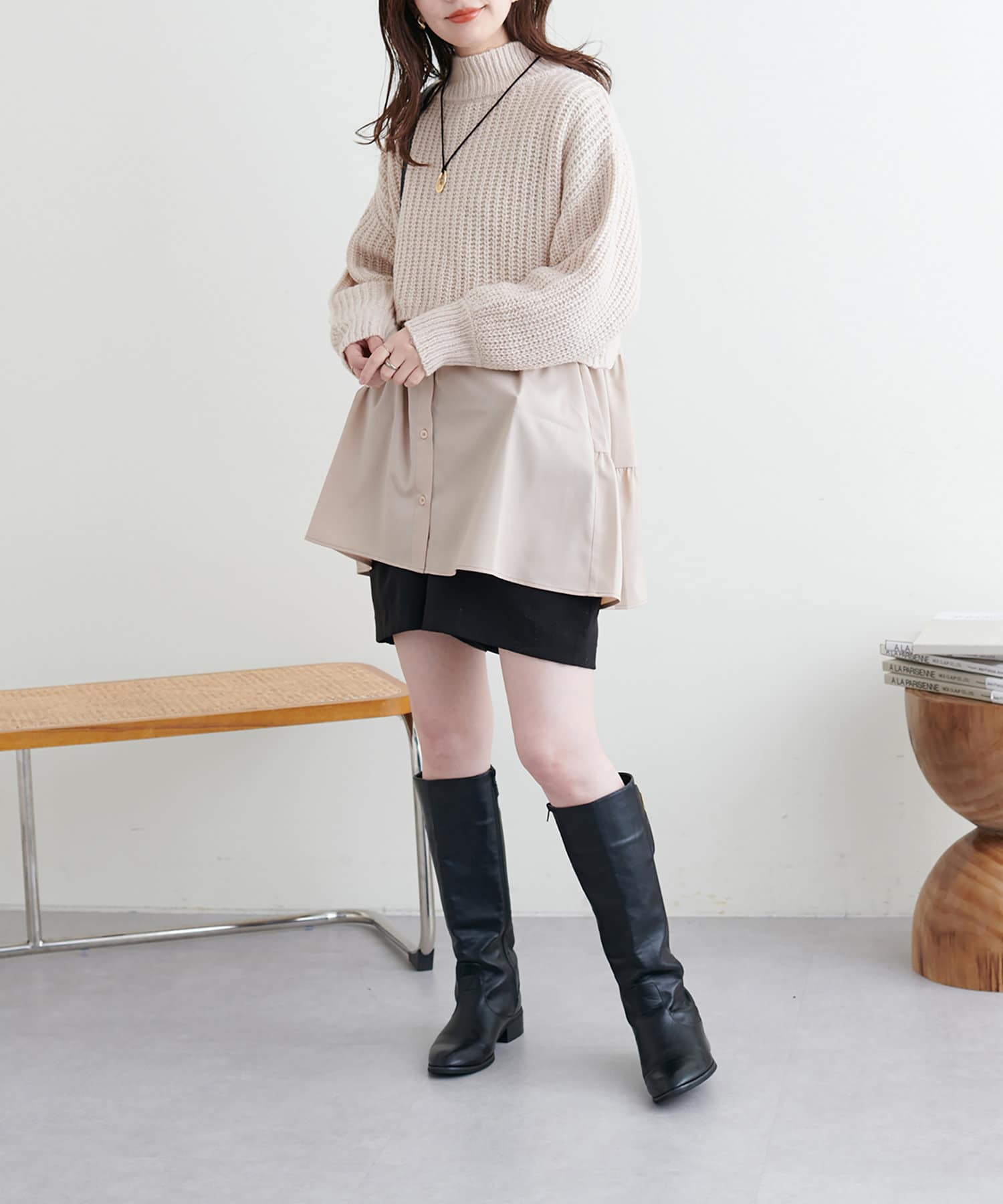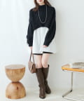 ショトーパンツ×ロングブーツに合わせるのが王道フェミニン。