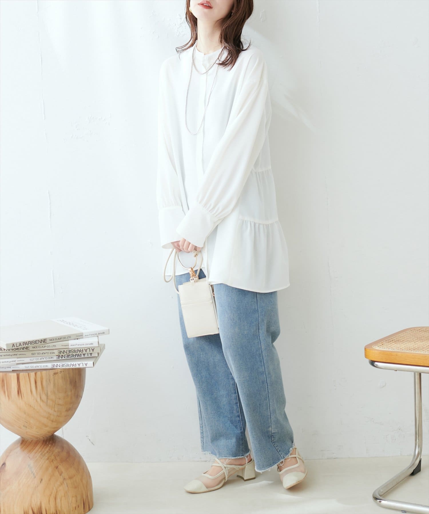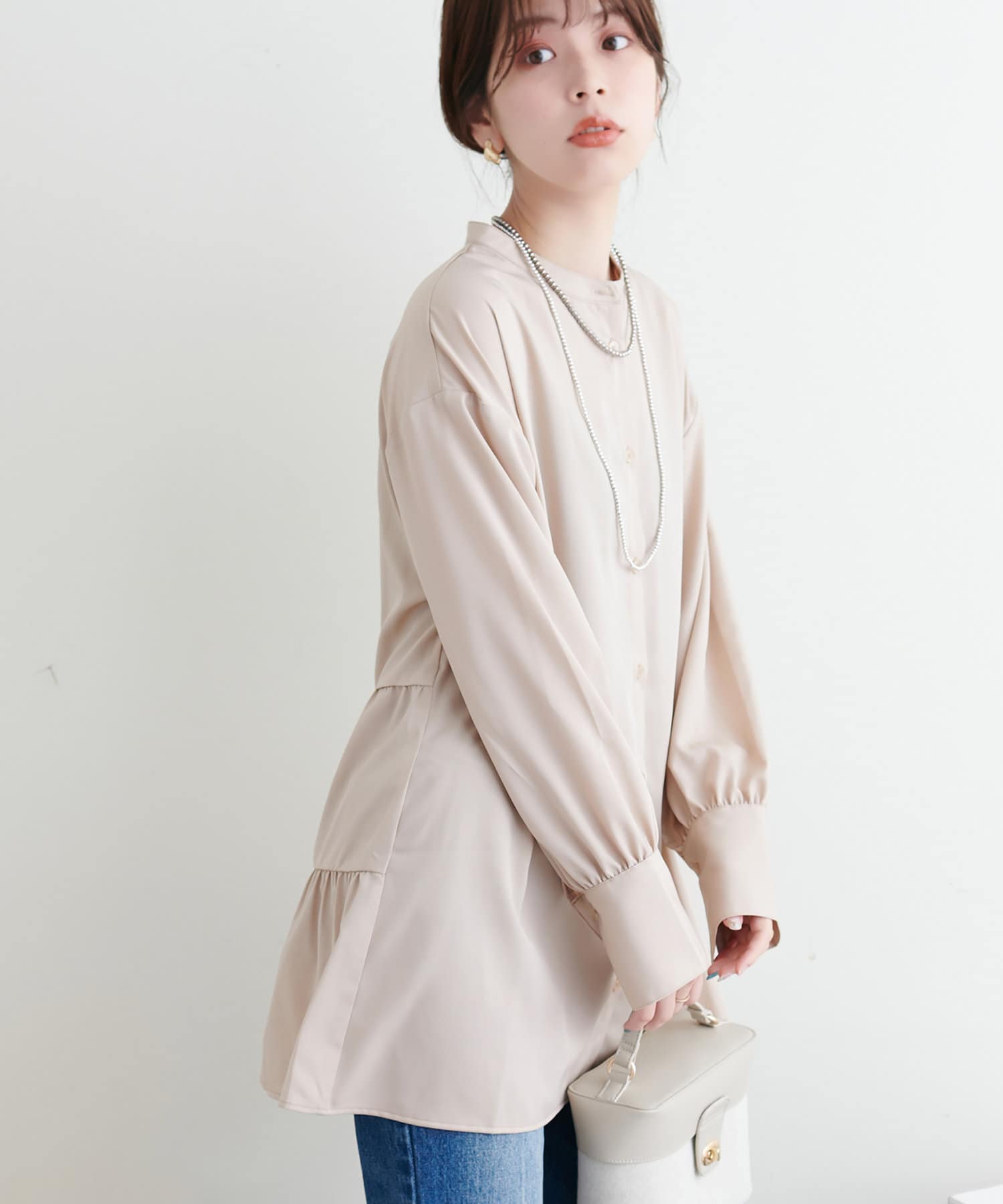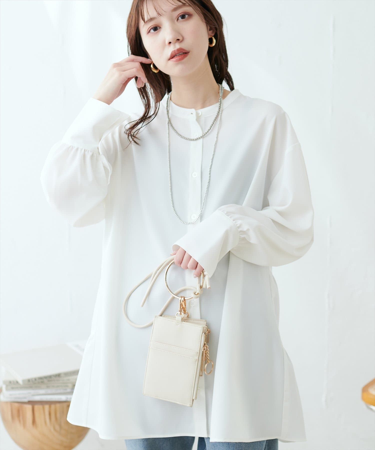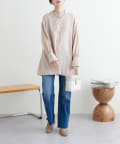 シャツチュニックは軽やかでとろみのある生地感で、重くなりすぎない印象に。