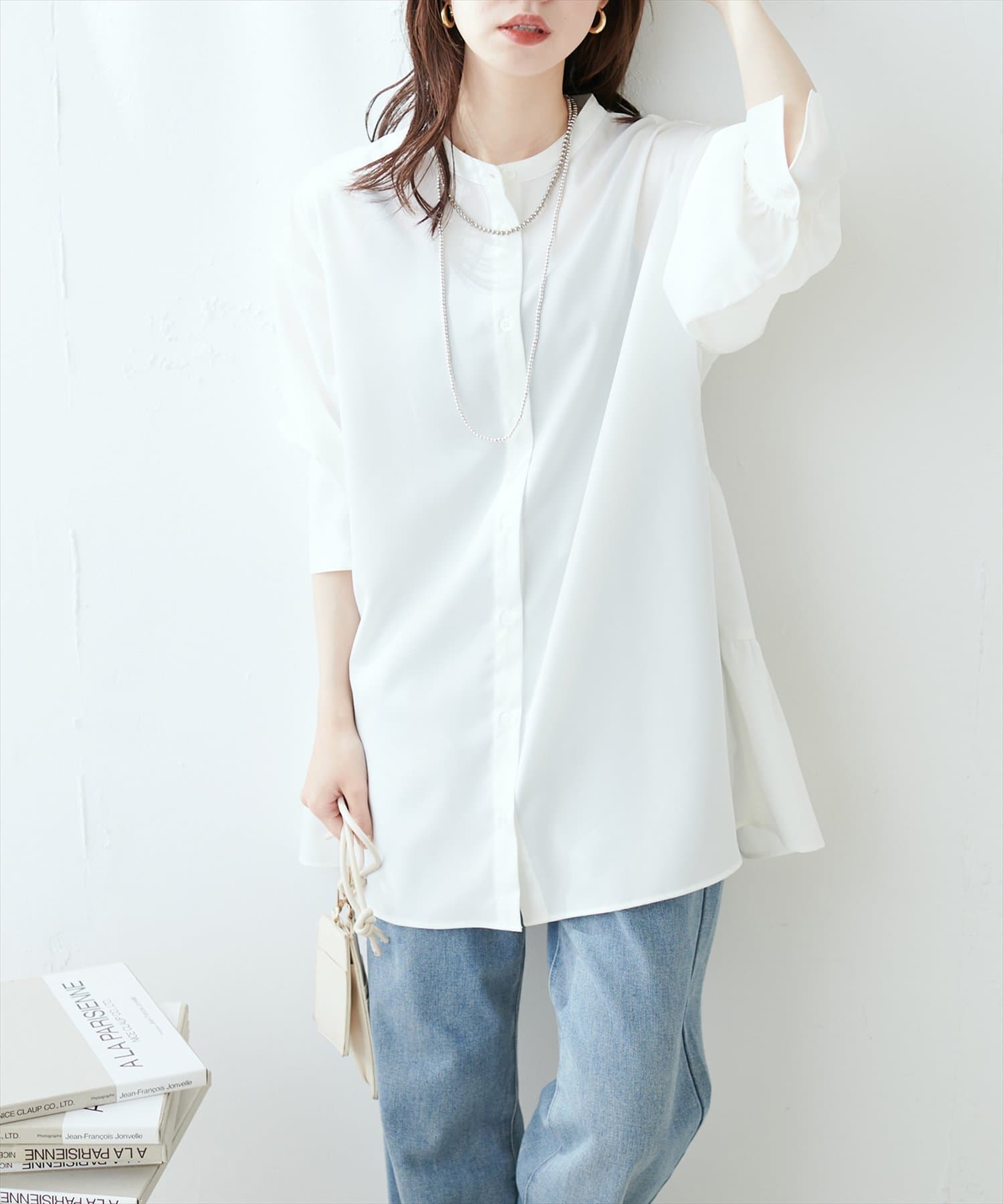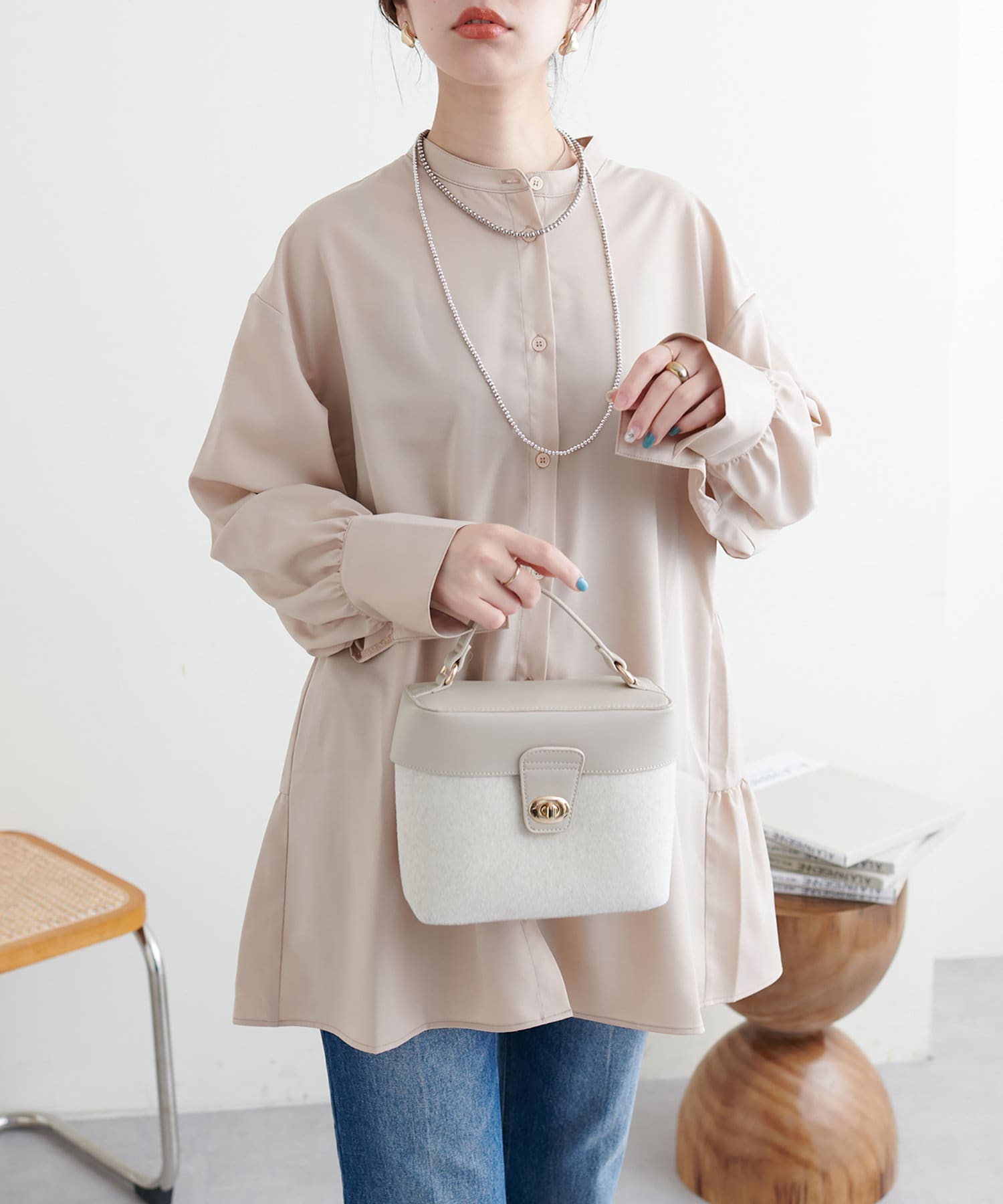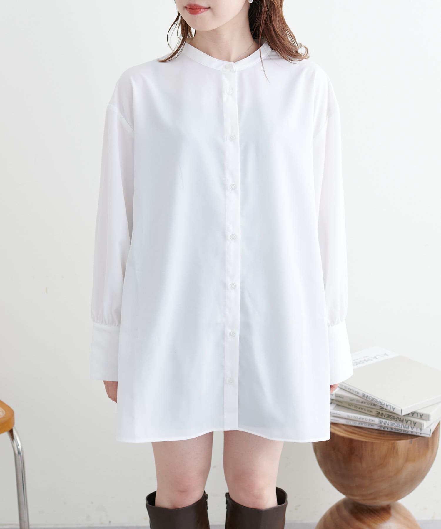 シャツチュニックは軽やかでとろみのある生地感で、重くなりすぎない印象に。