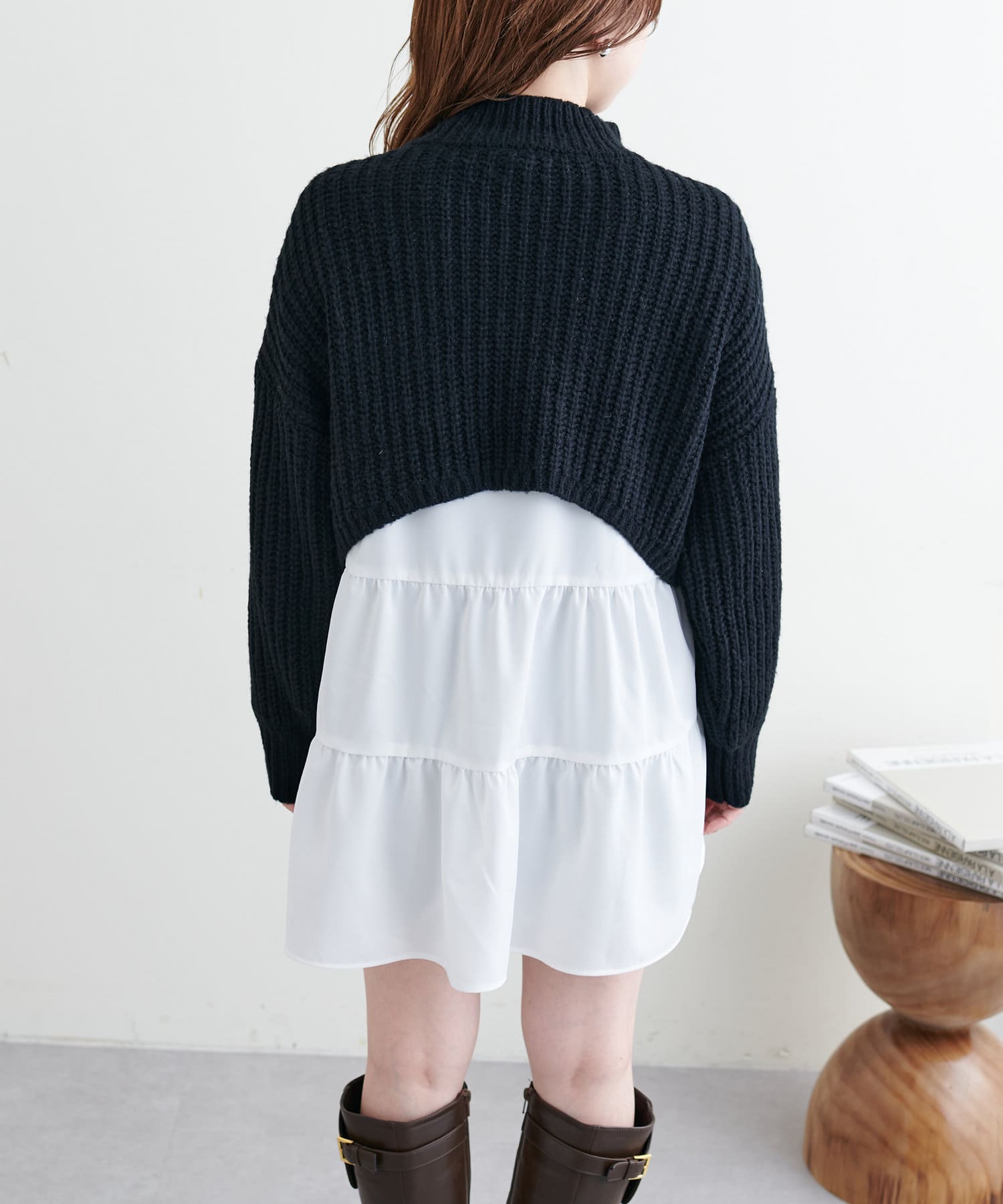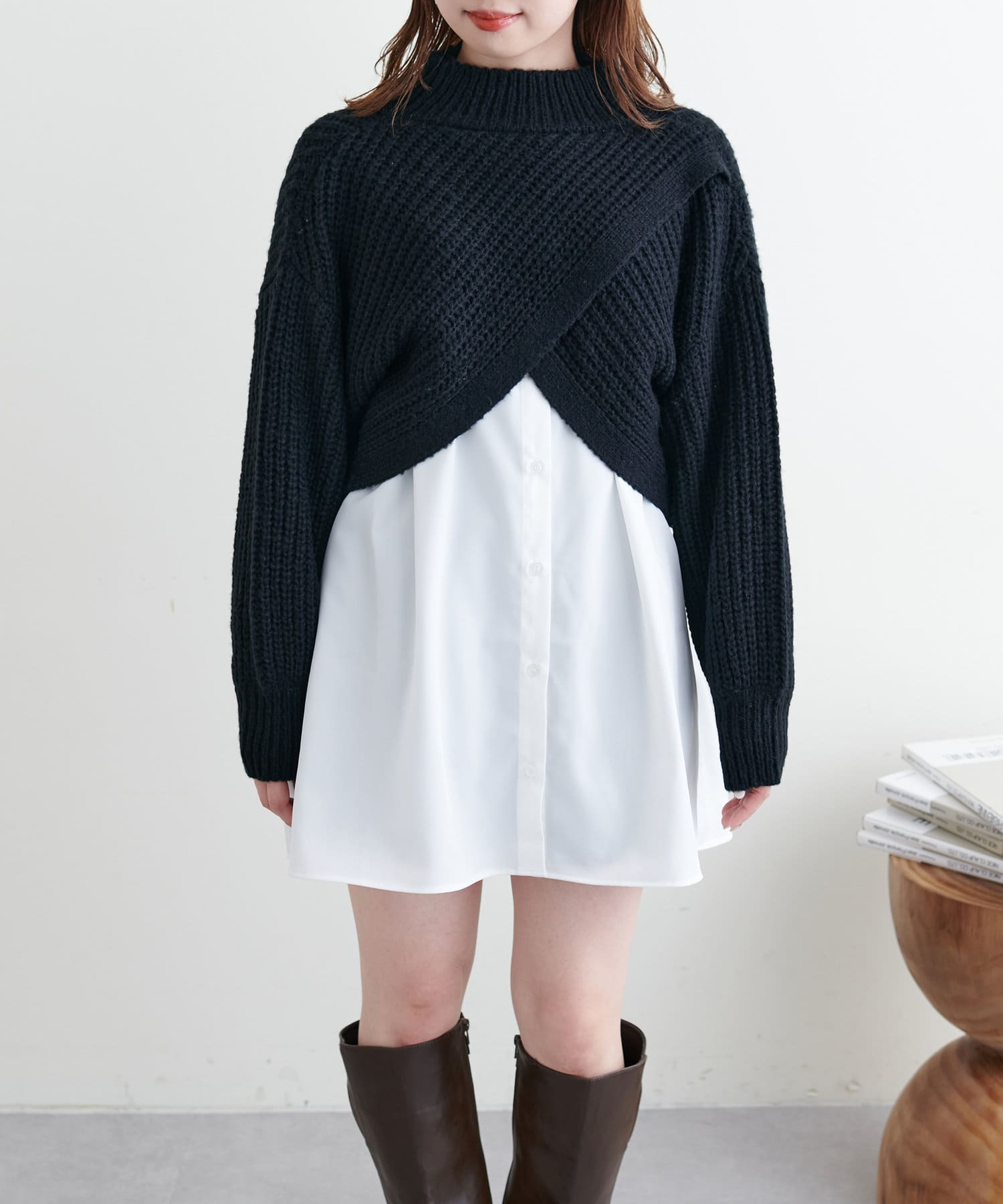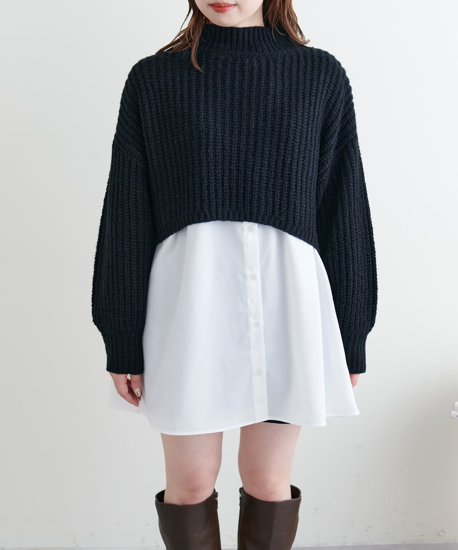 ショート畦ニット×シャツチュニックセット
