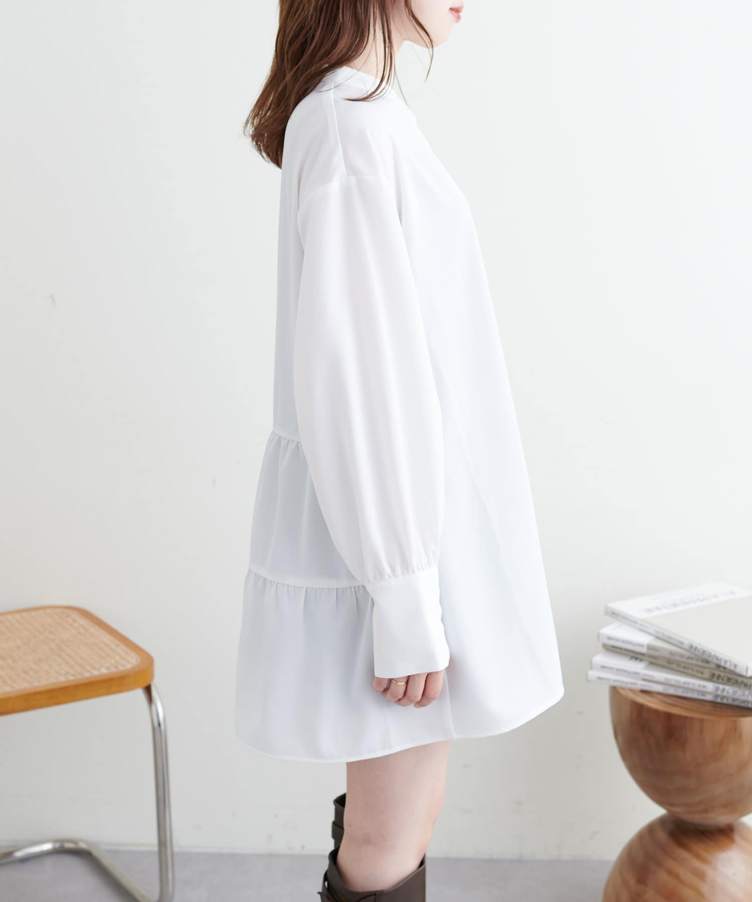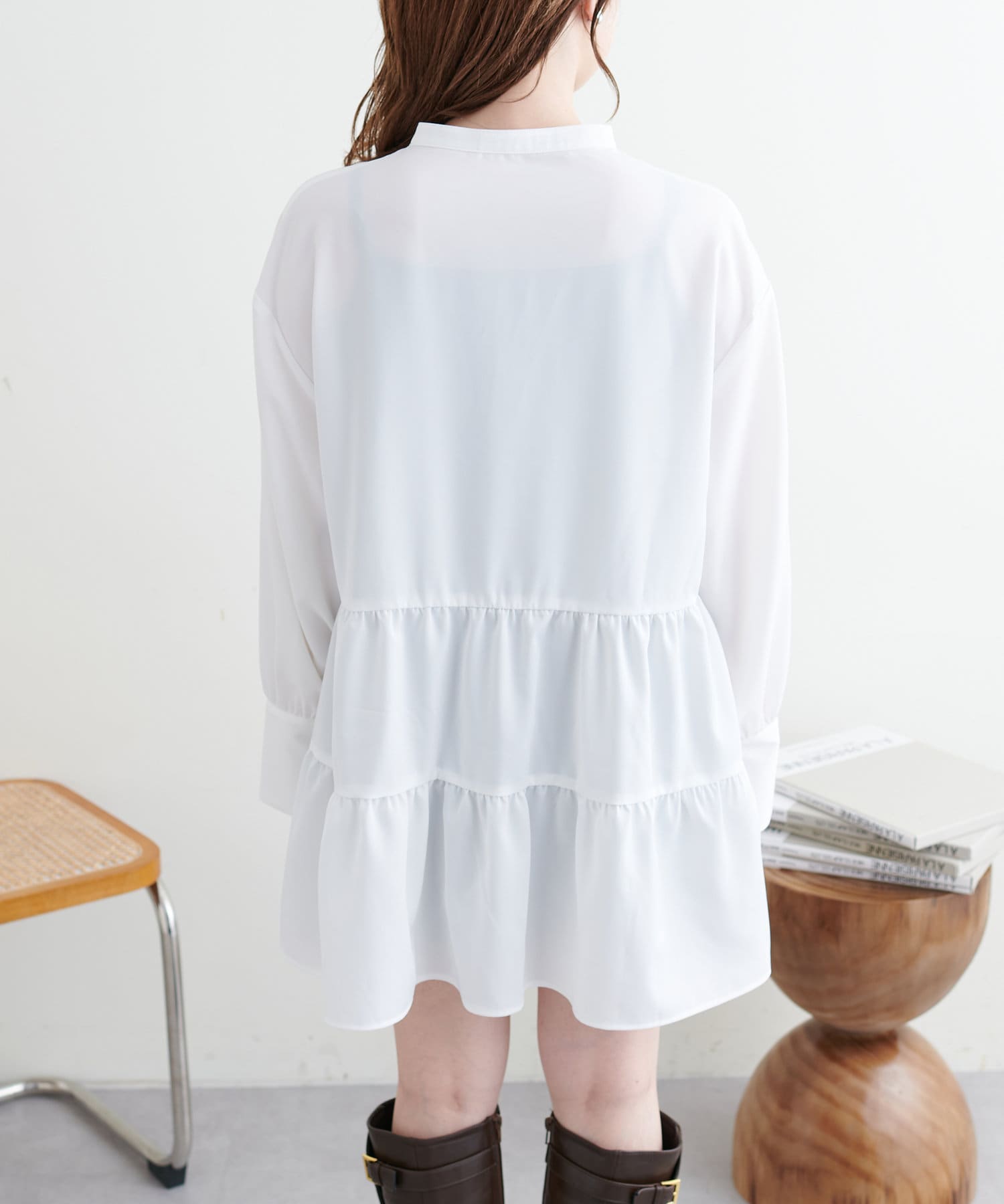シャツチュニックの後ろはティアードになっているため、ふんわり感をより演出します。