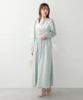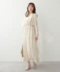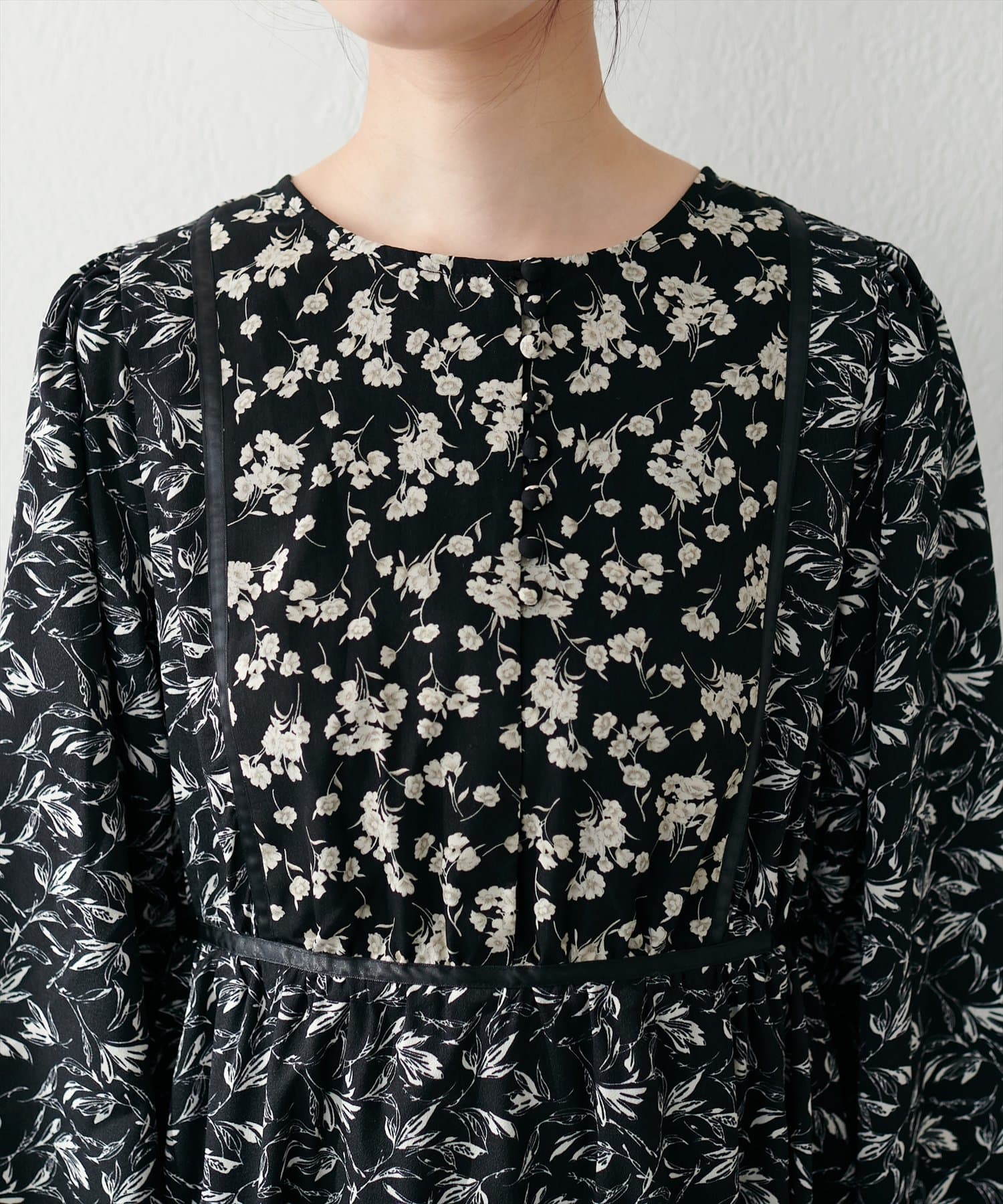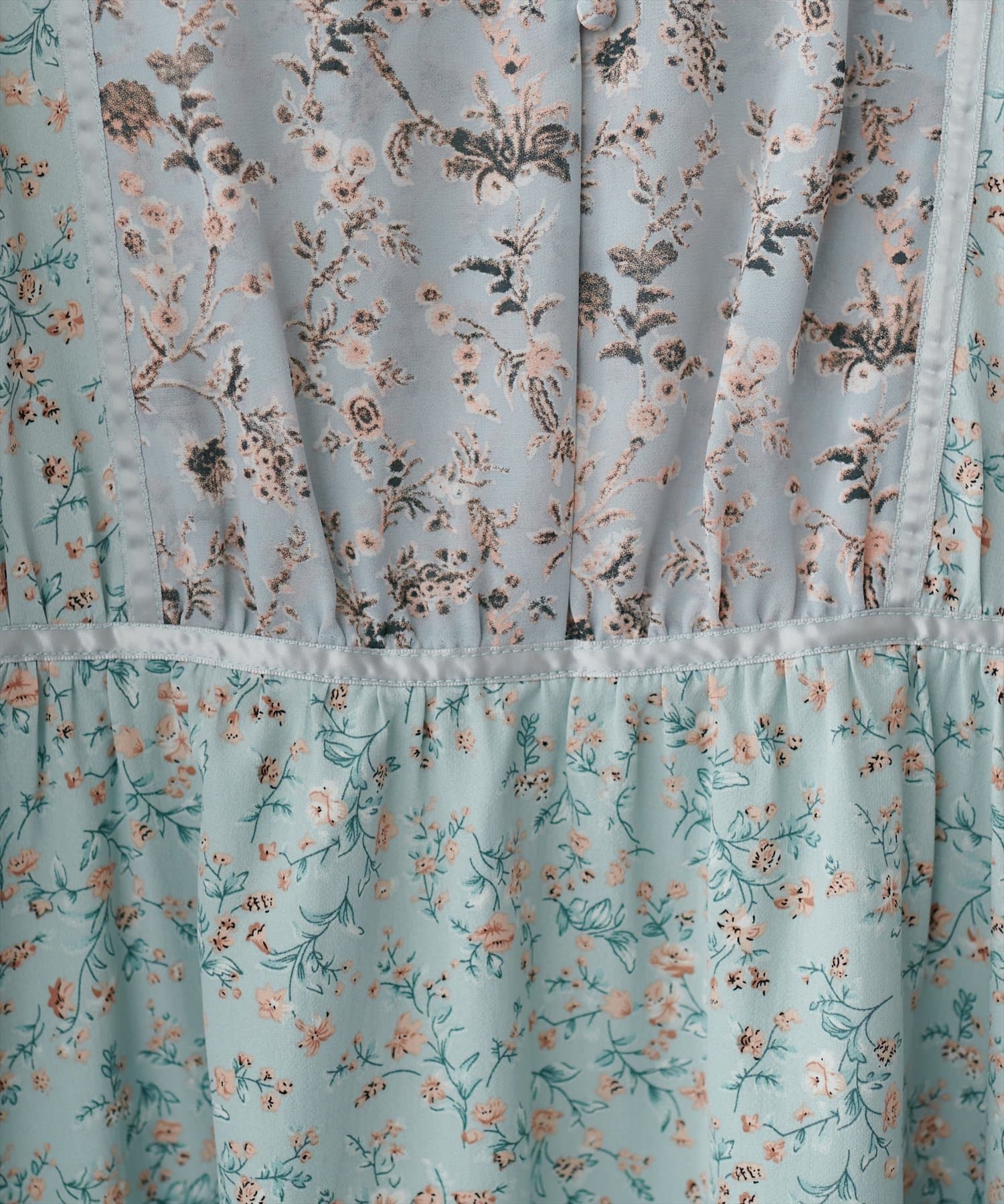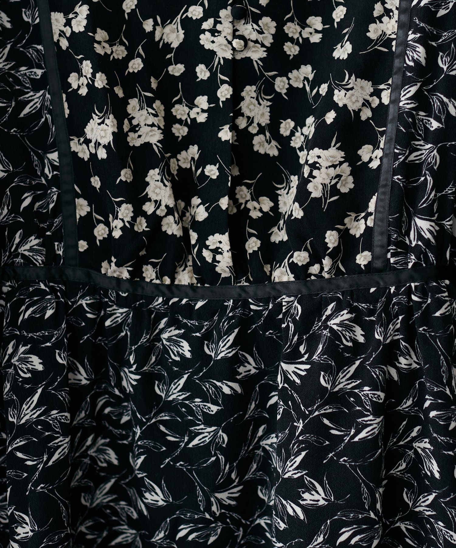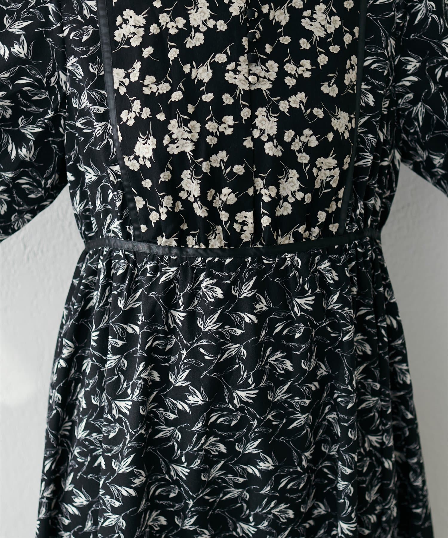異なるフラワーパターン柄にサテンの配色テープデザインが目を引く主役級ワンピース。