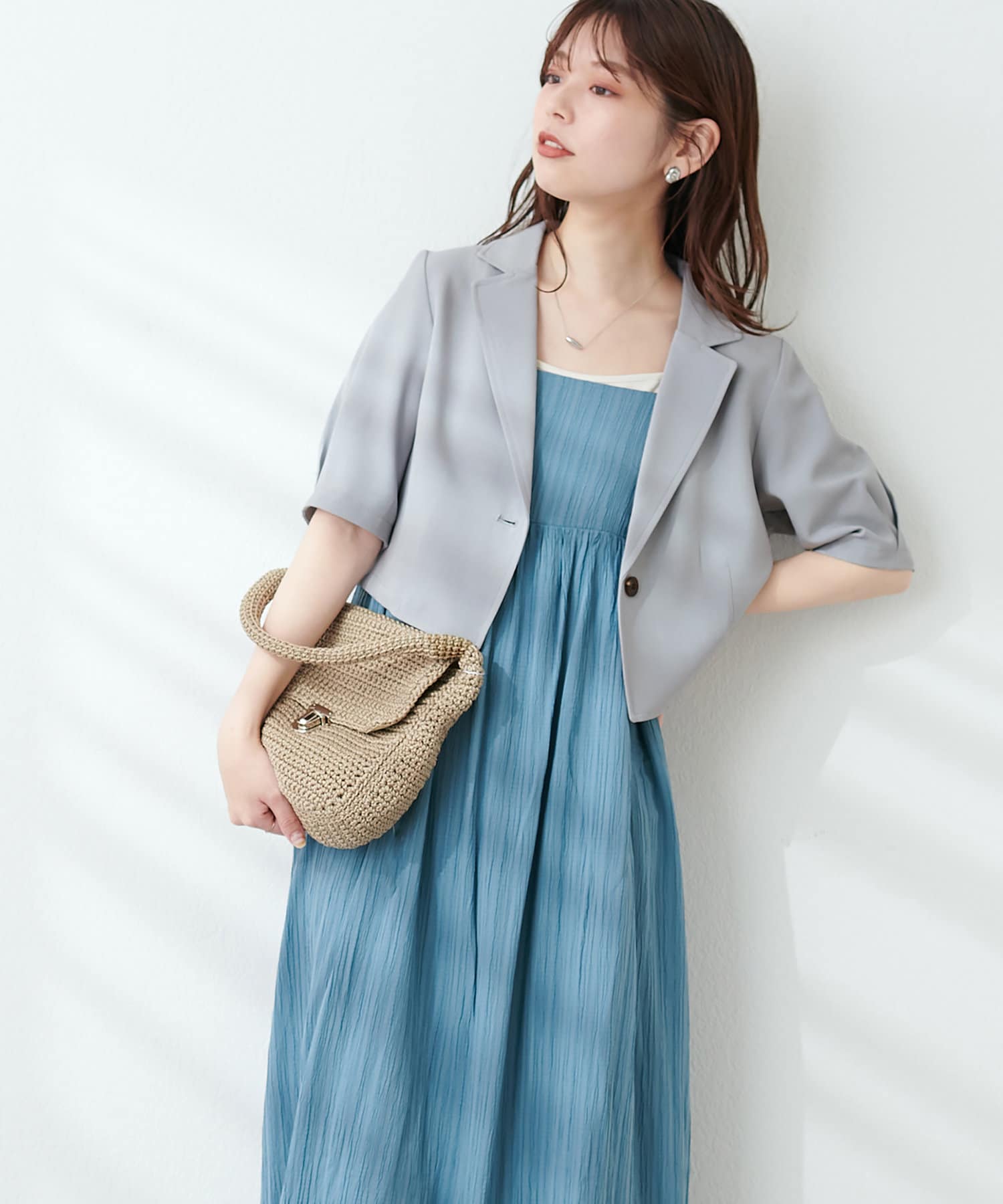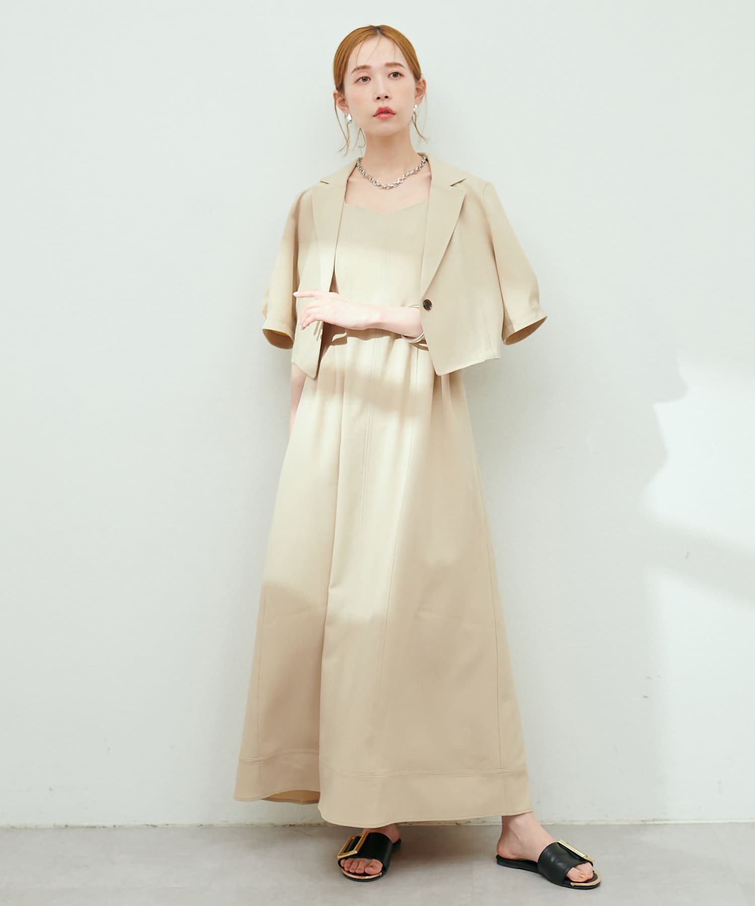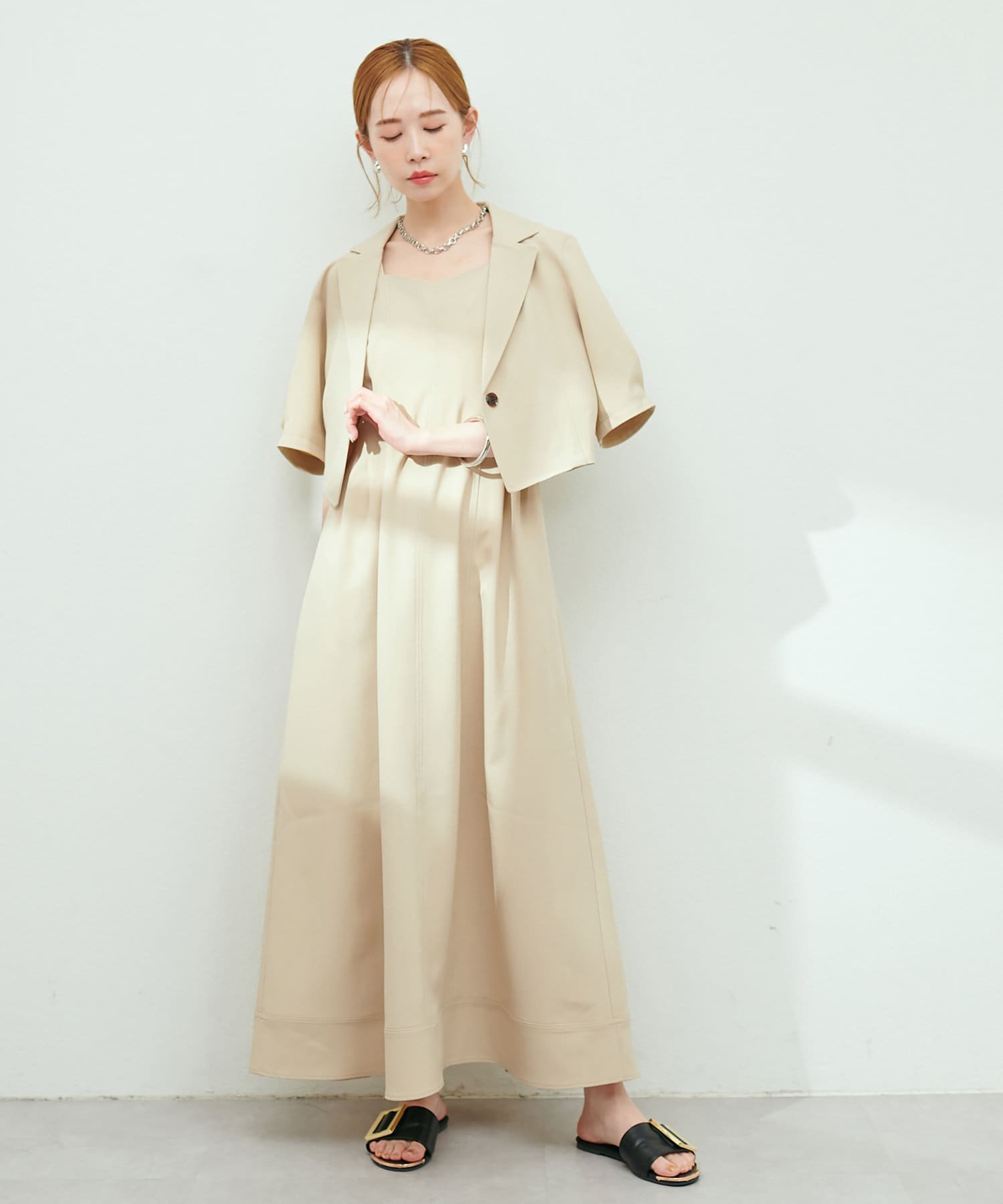 ワンピースはSETのジャケット以外に、旬のシアーカーデやシャツを羽織ったり、中にロゴTやシアーインナーを入れても◎