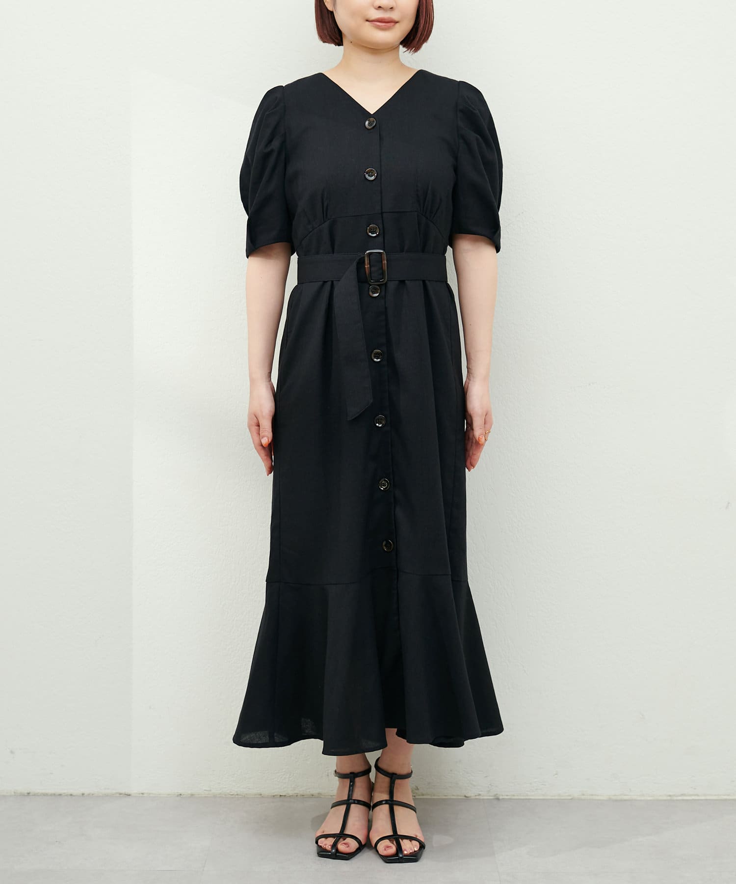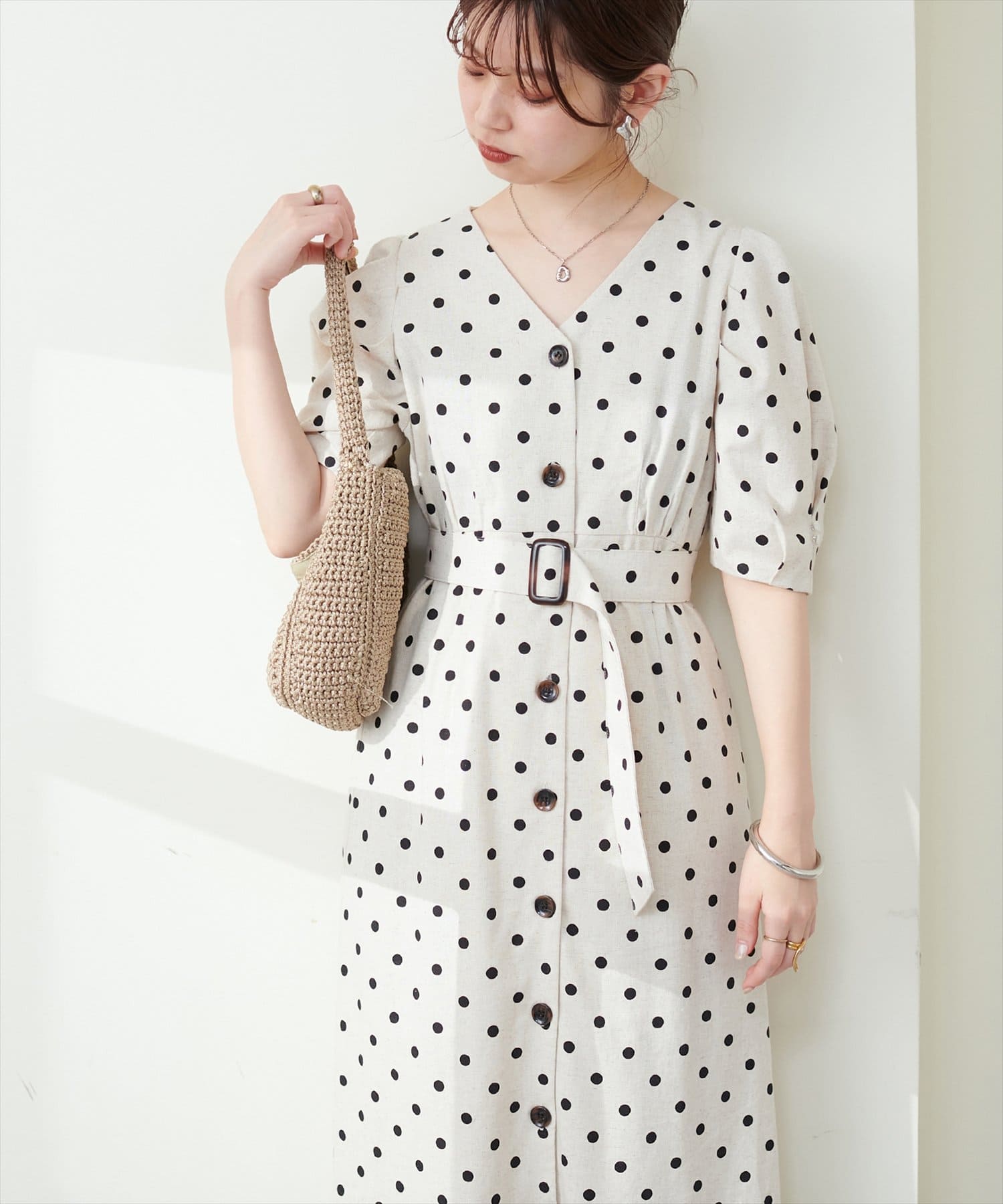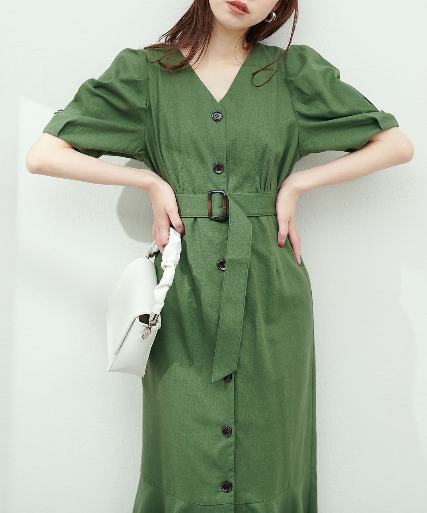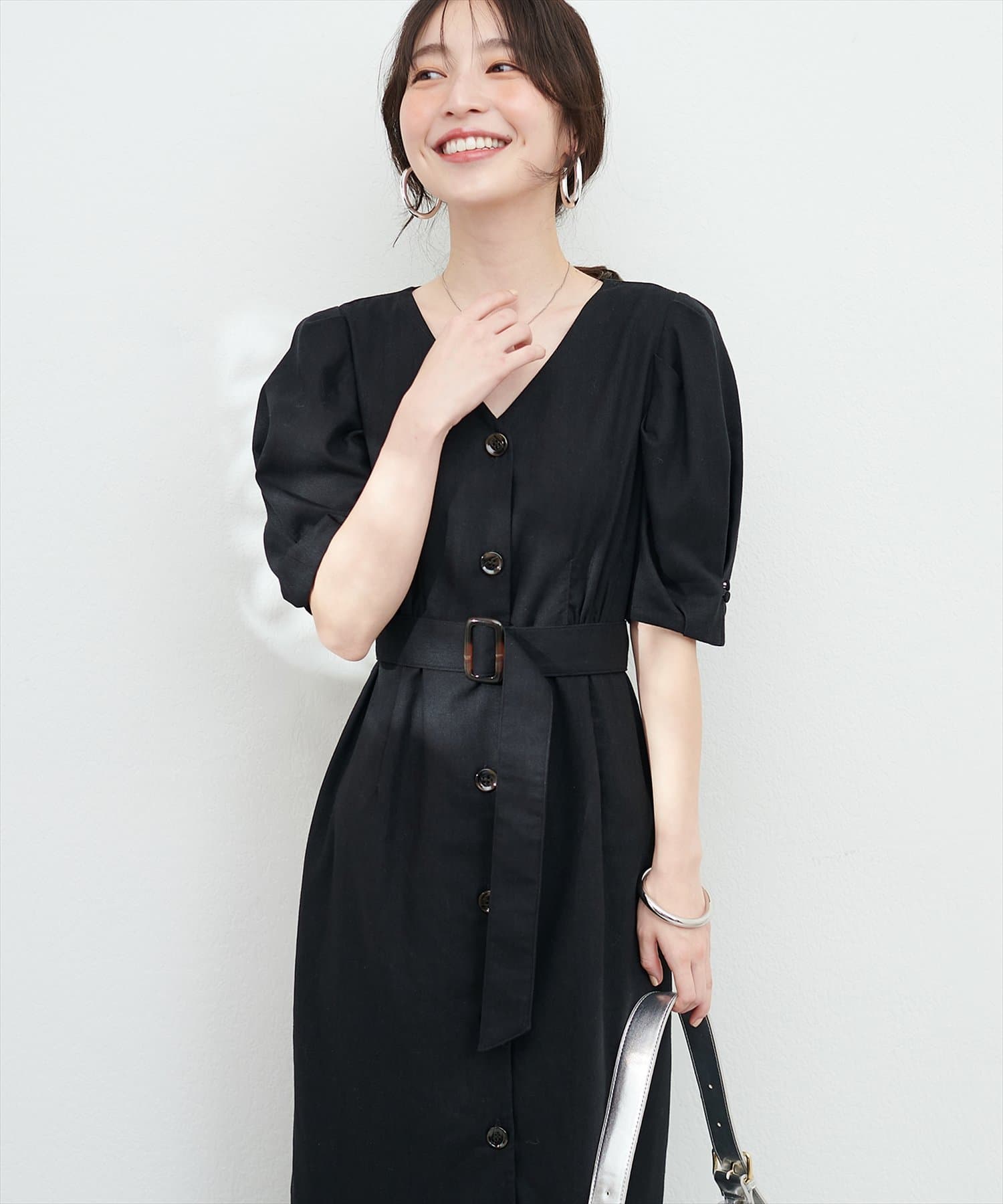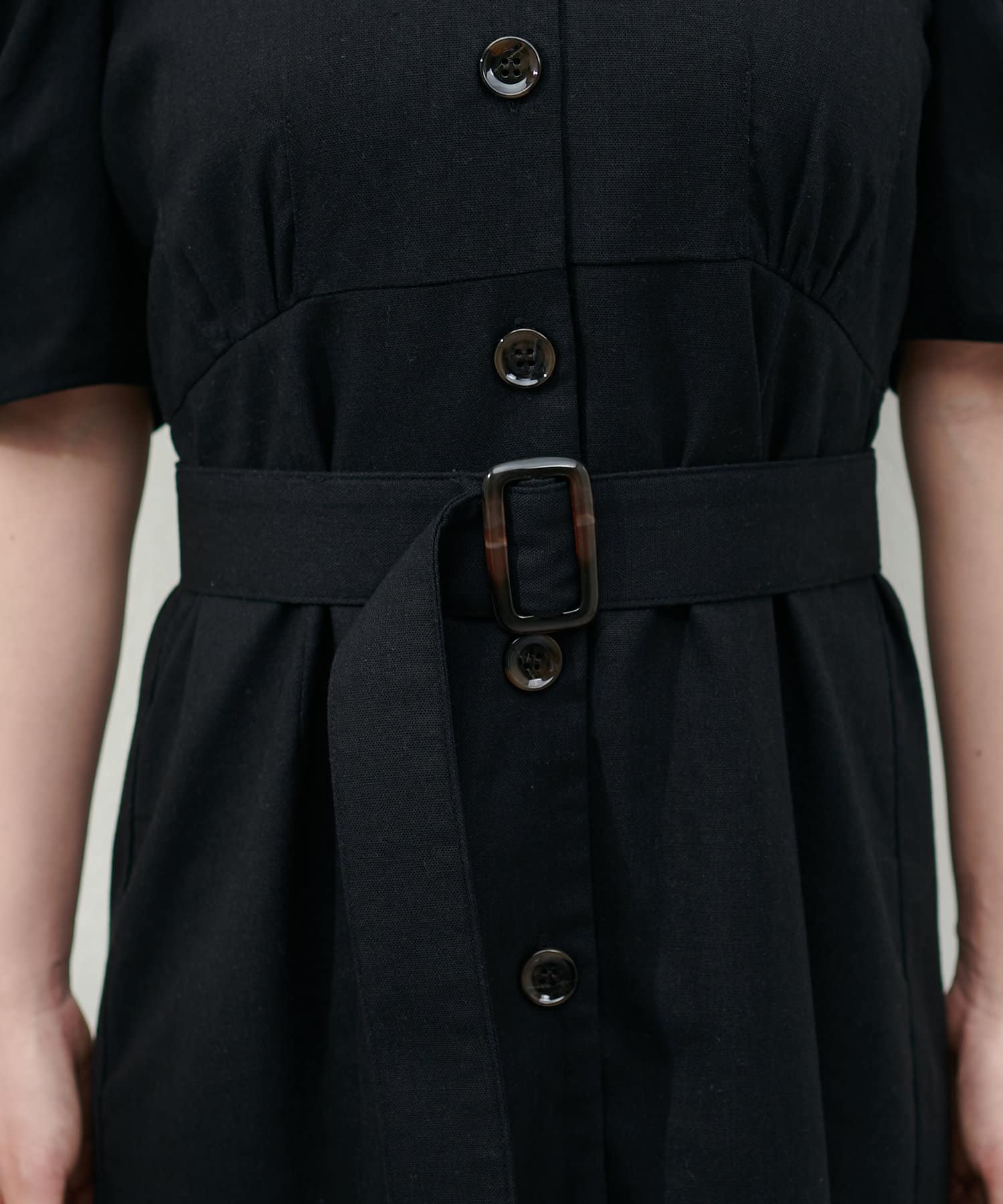 【M/Lサイズ展開】ベルト付き綿麻べっ甲釦ワンピース