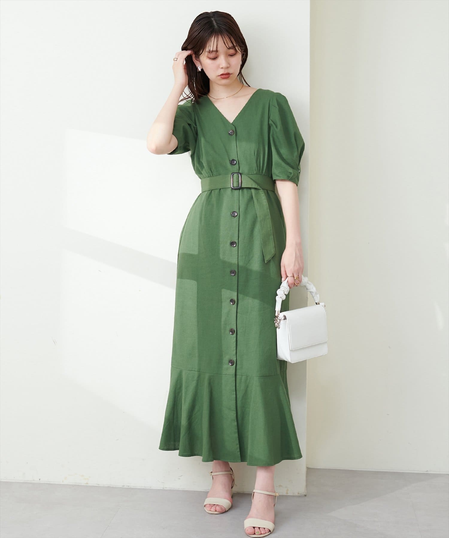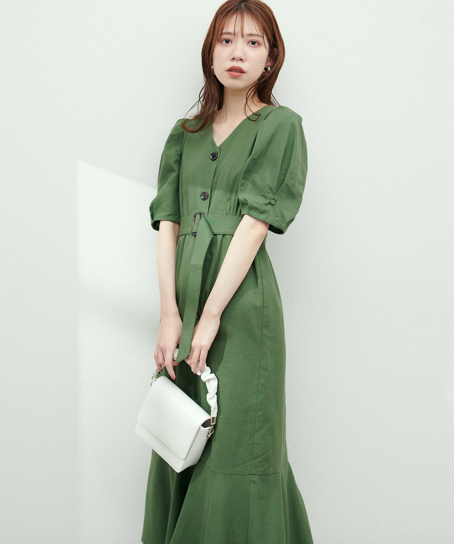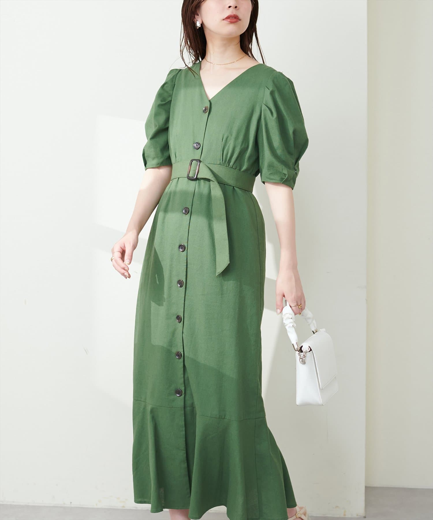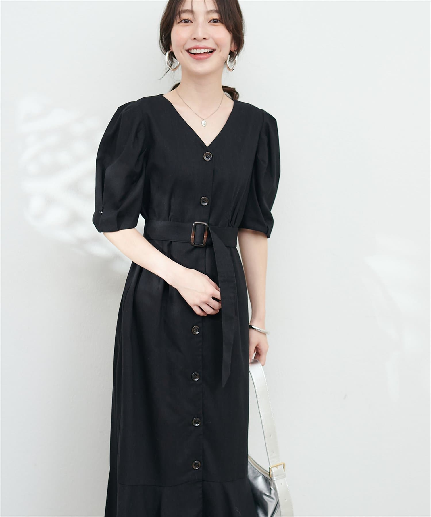 【M/Lサイズ展開】ベルト付き綿麻べっ甲釦ワンピース