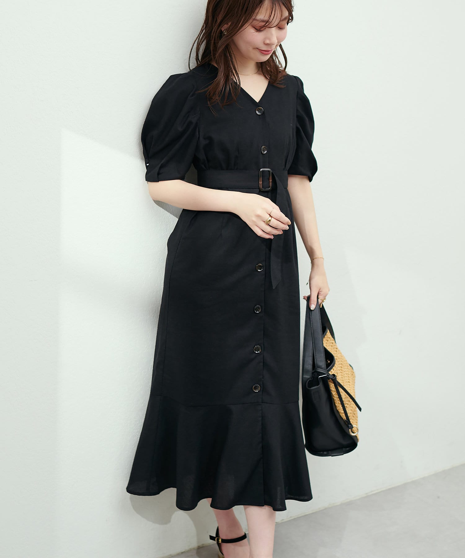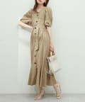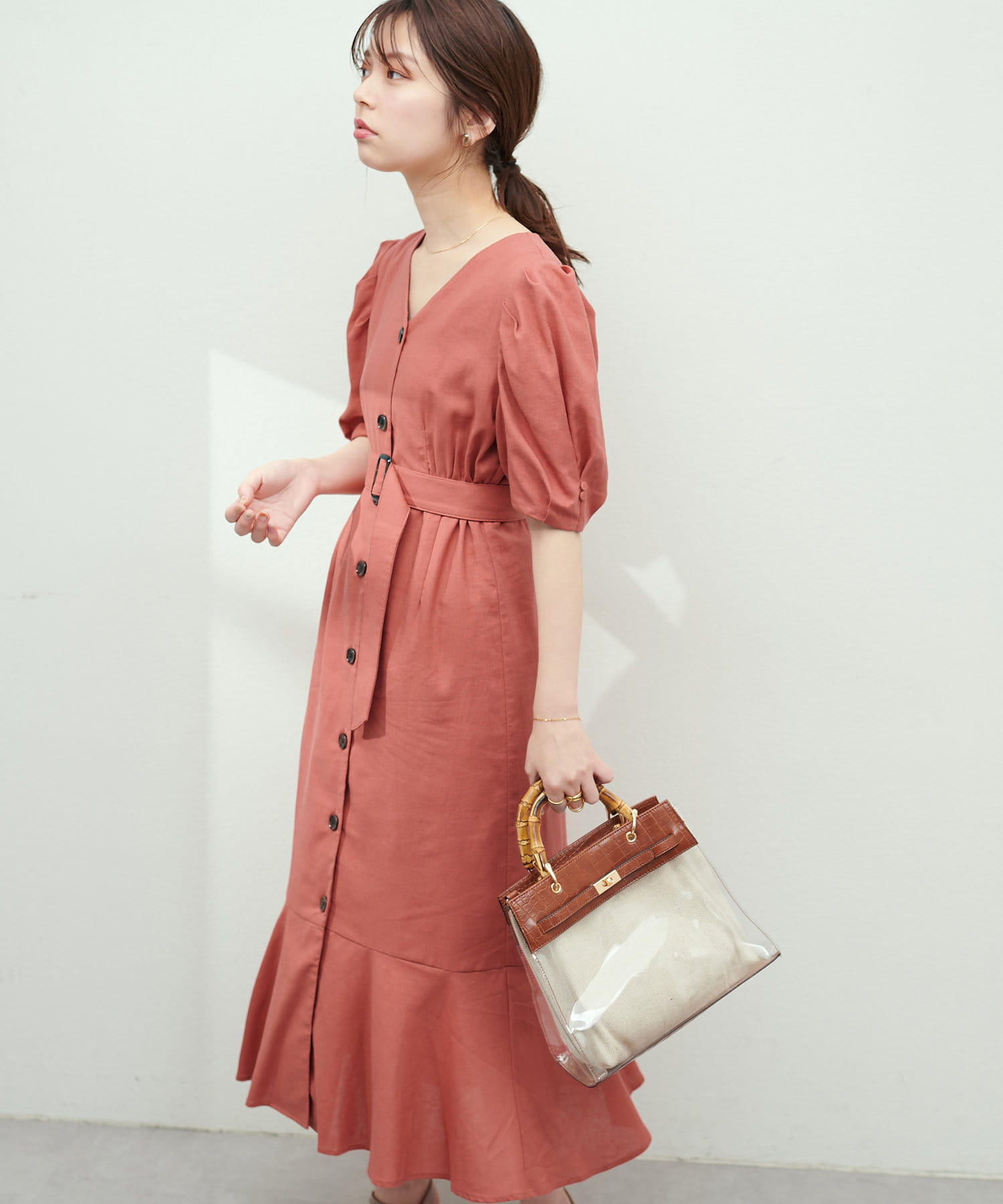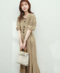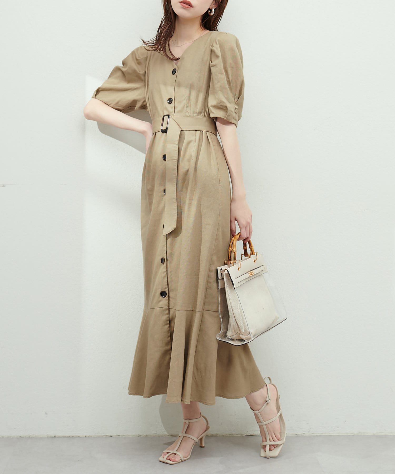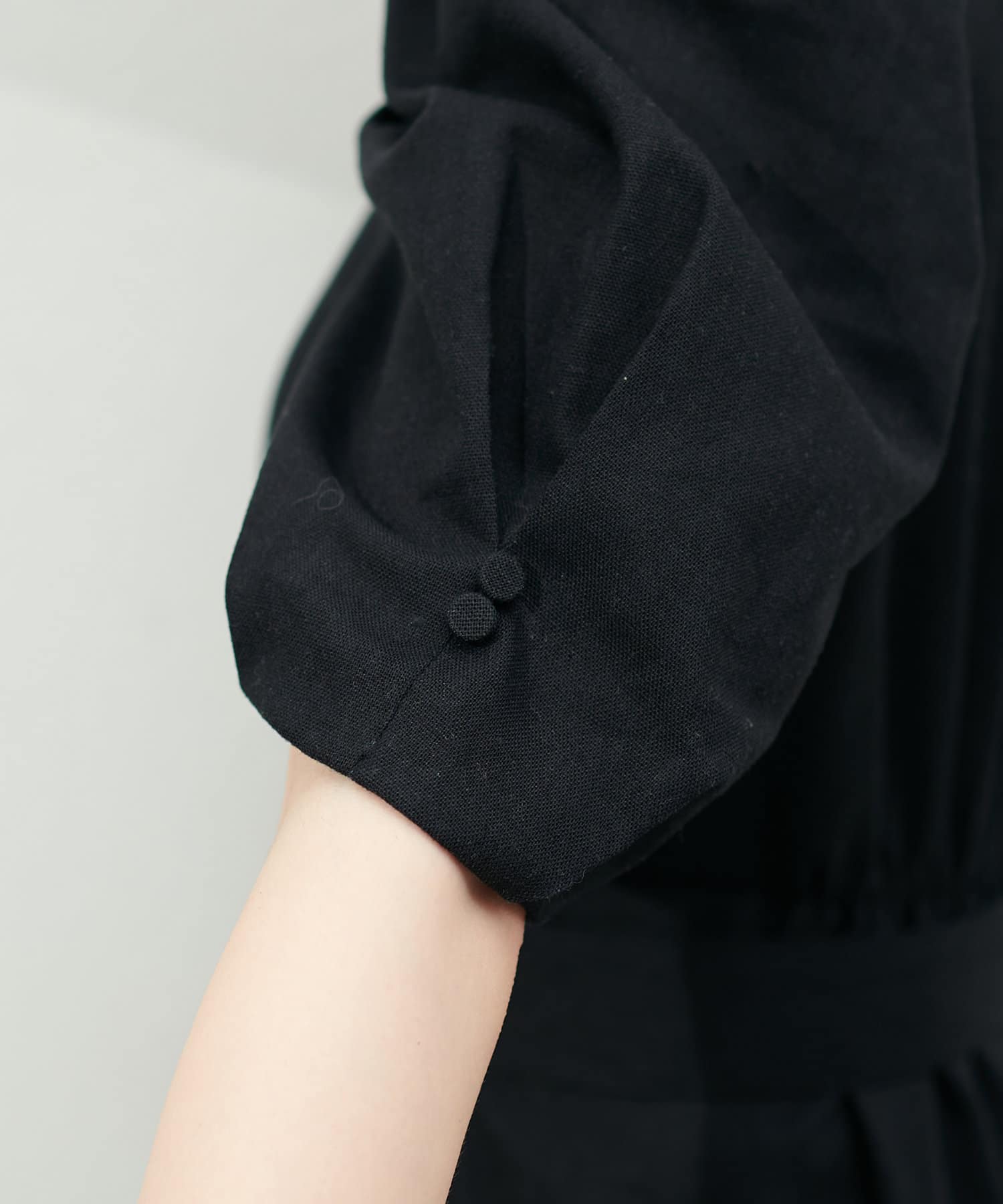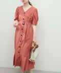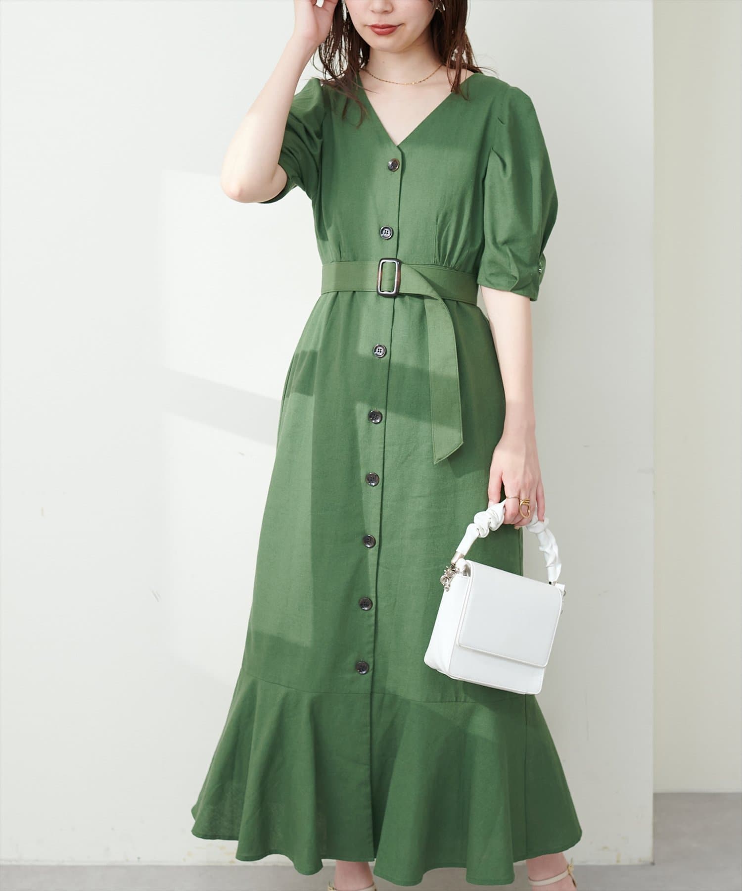 【M/Lサイズ展開】ベルト付き綿麻べっ甲釦ワンピース