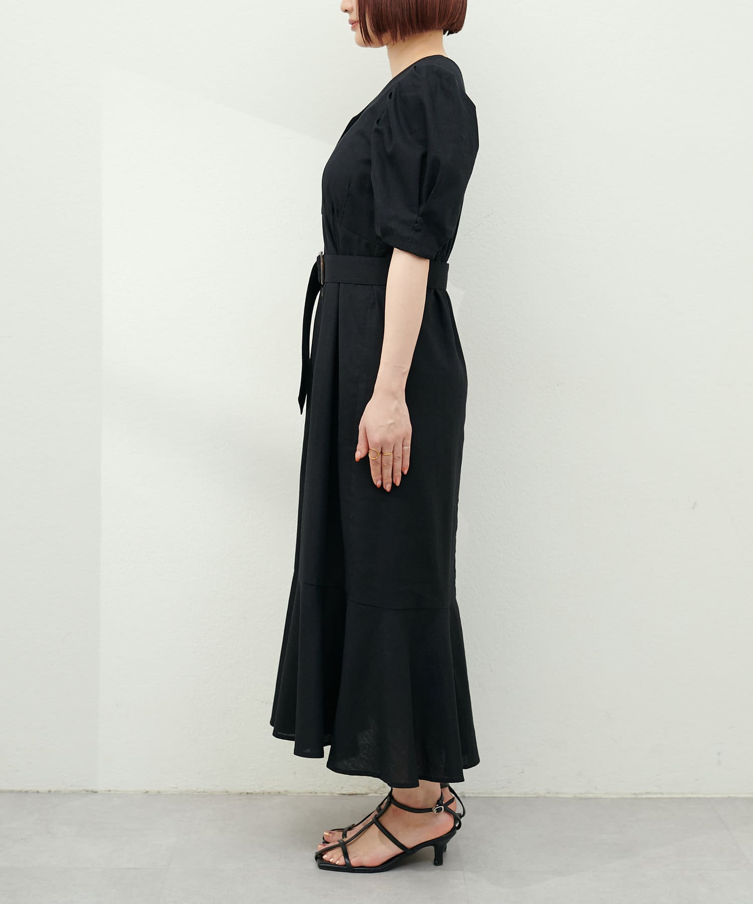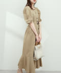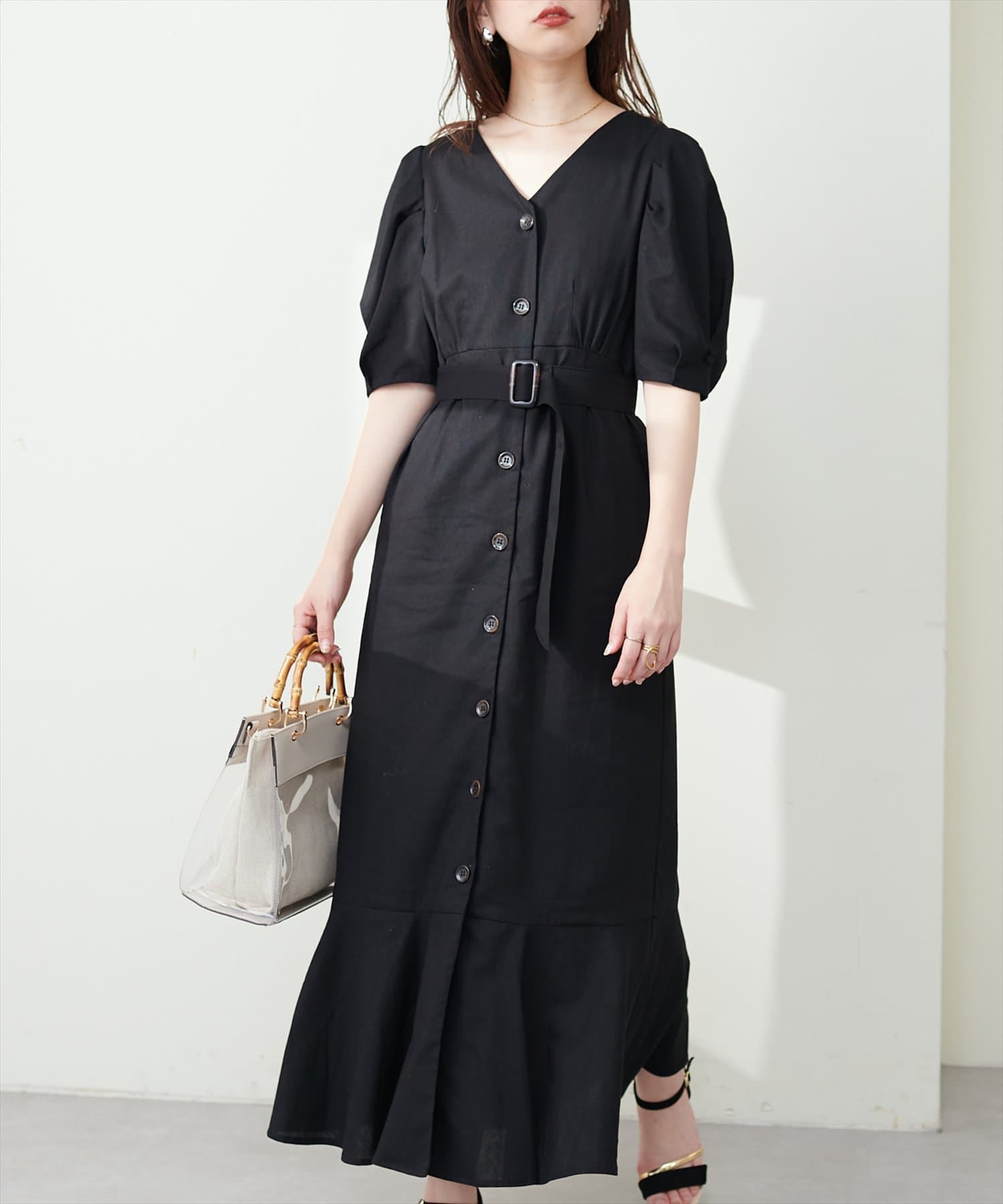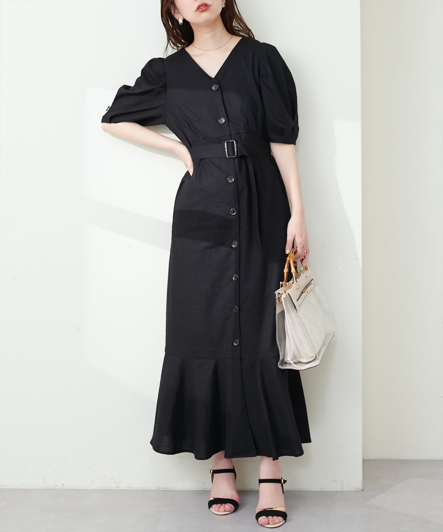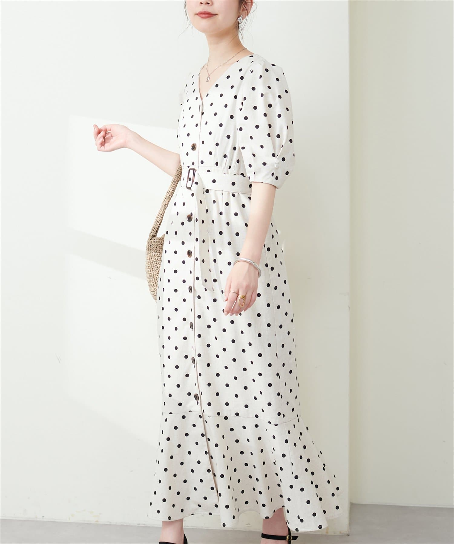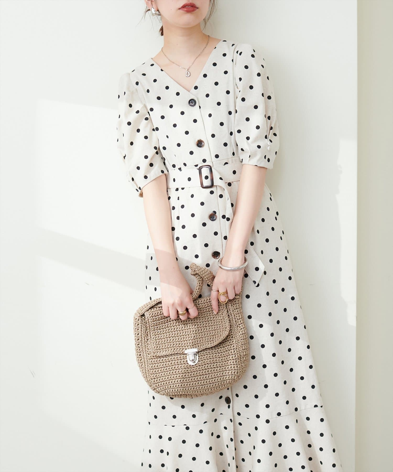 【M/Lサイズ展開】ベルト付き綿麻べっ甲釦ワンピース