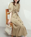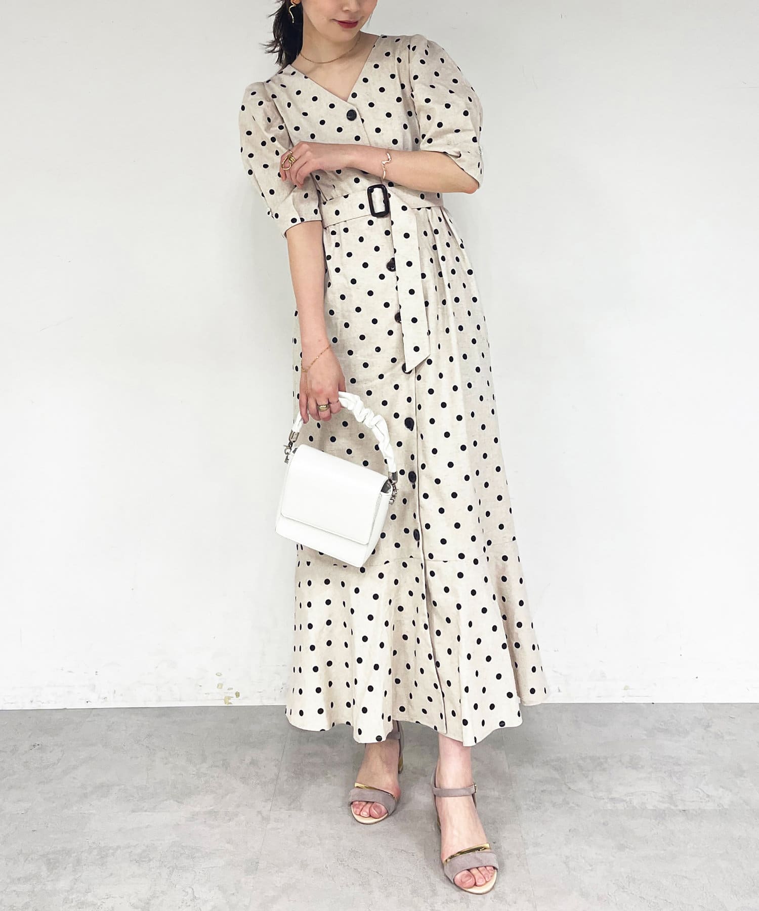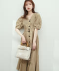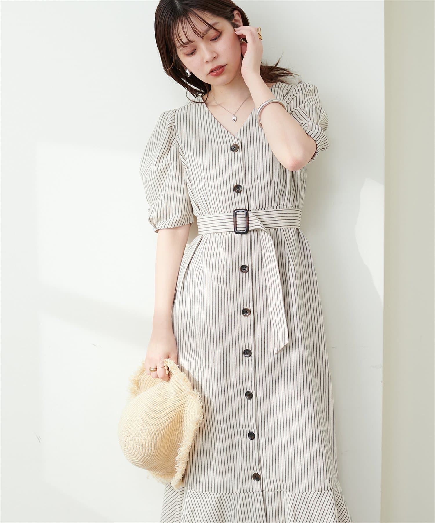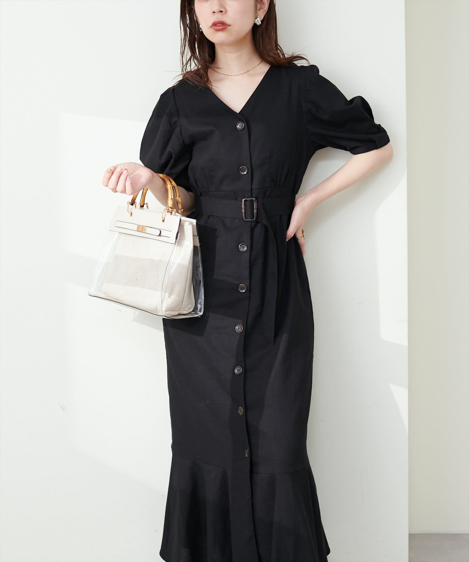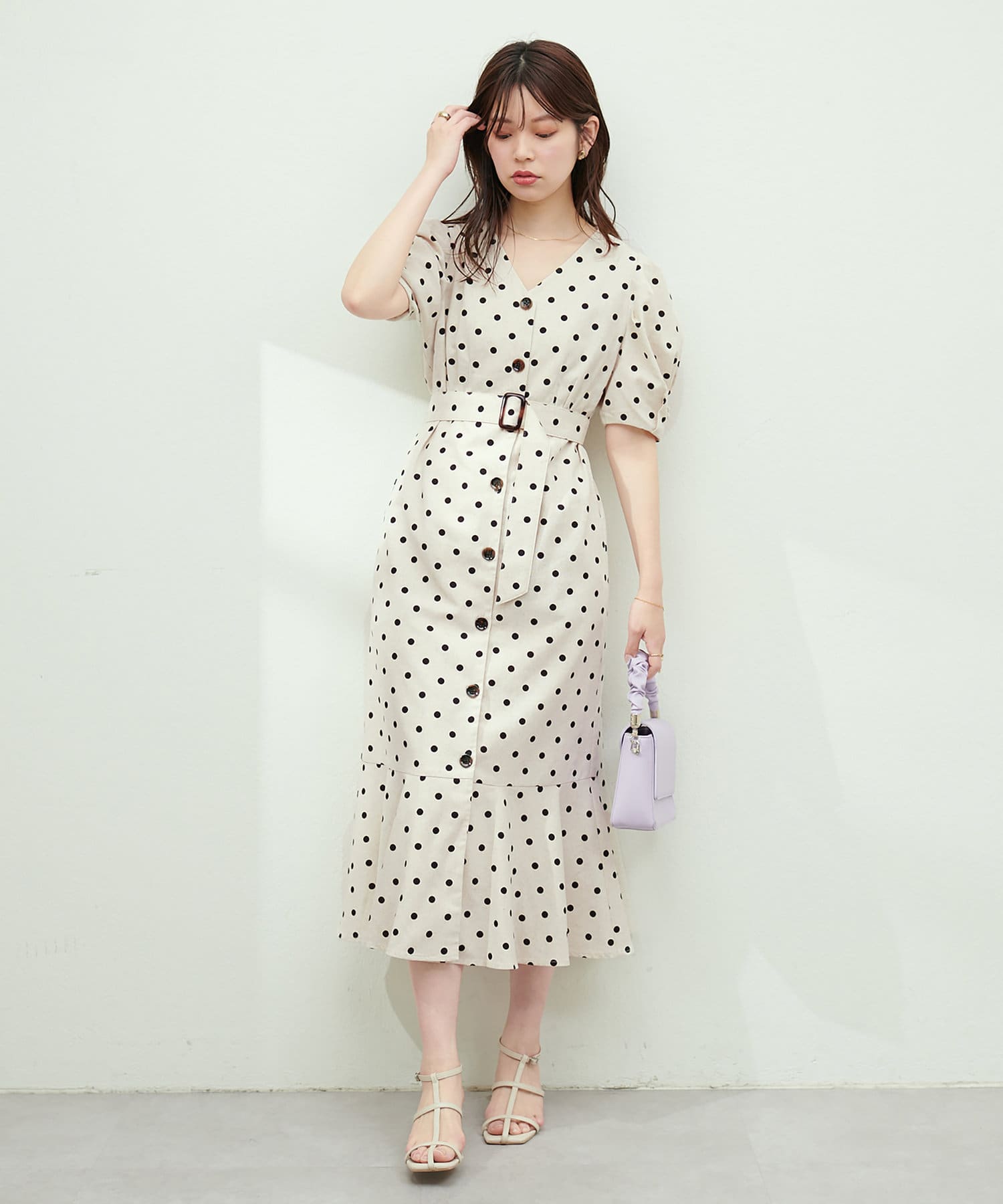 【M/Lサイズ展開】ベルト付き綿麻べっ甲釦ワンピース