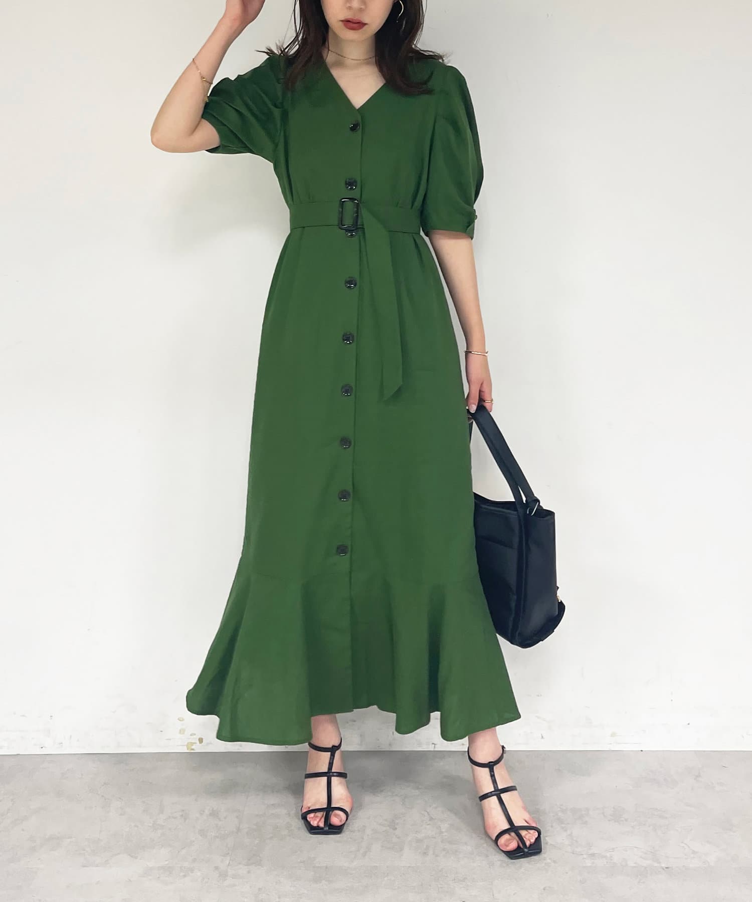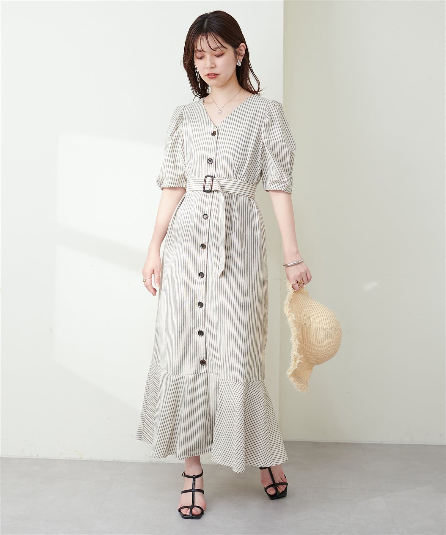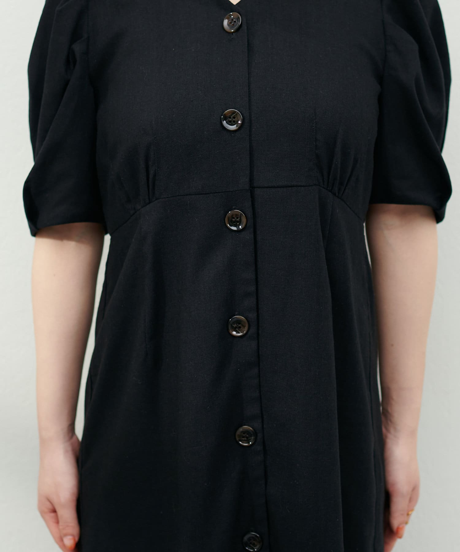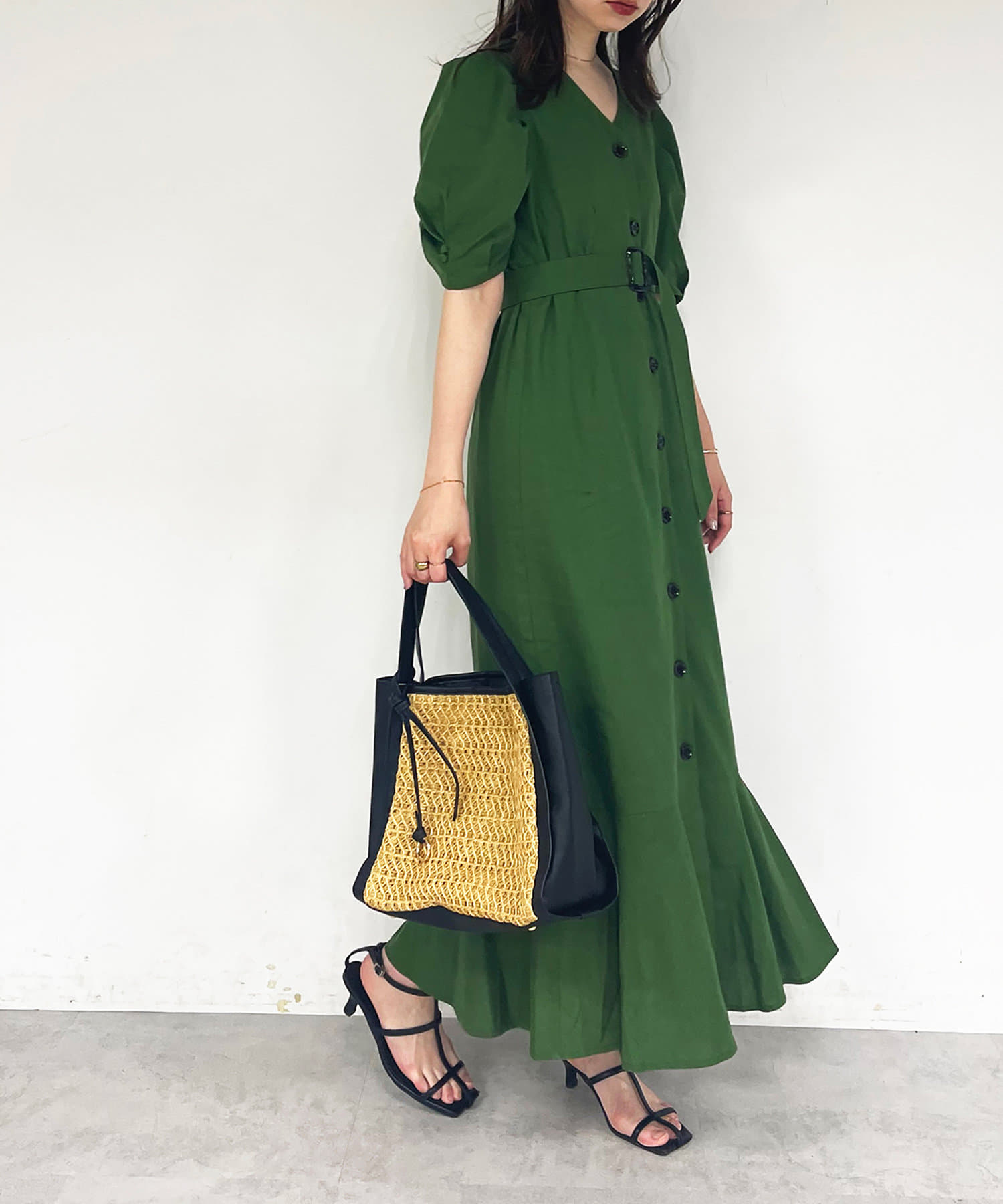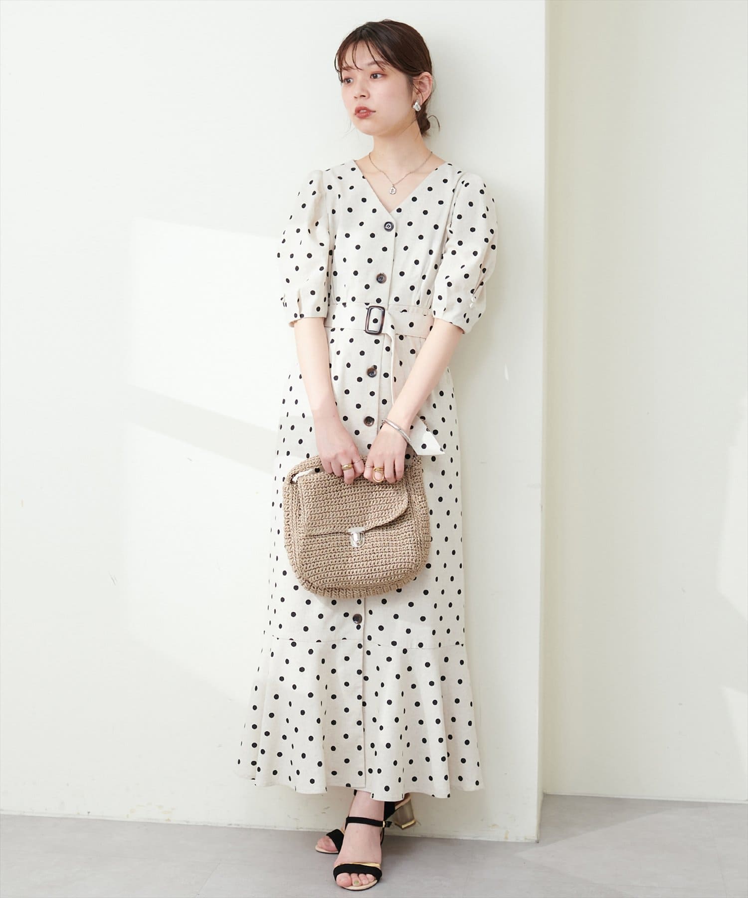 【M/Lサイズ展開】ベルト付き綿麻べっ甲釦ワンピース