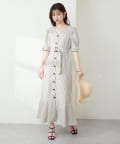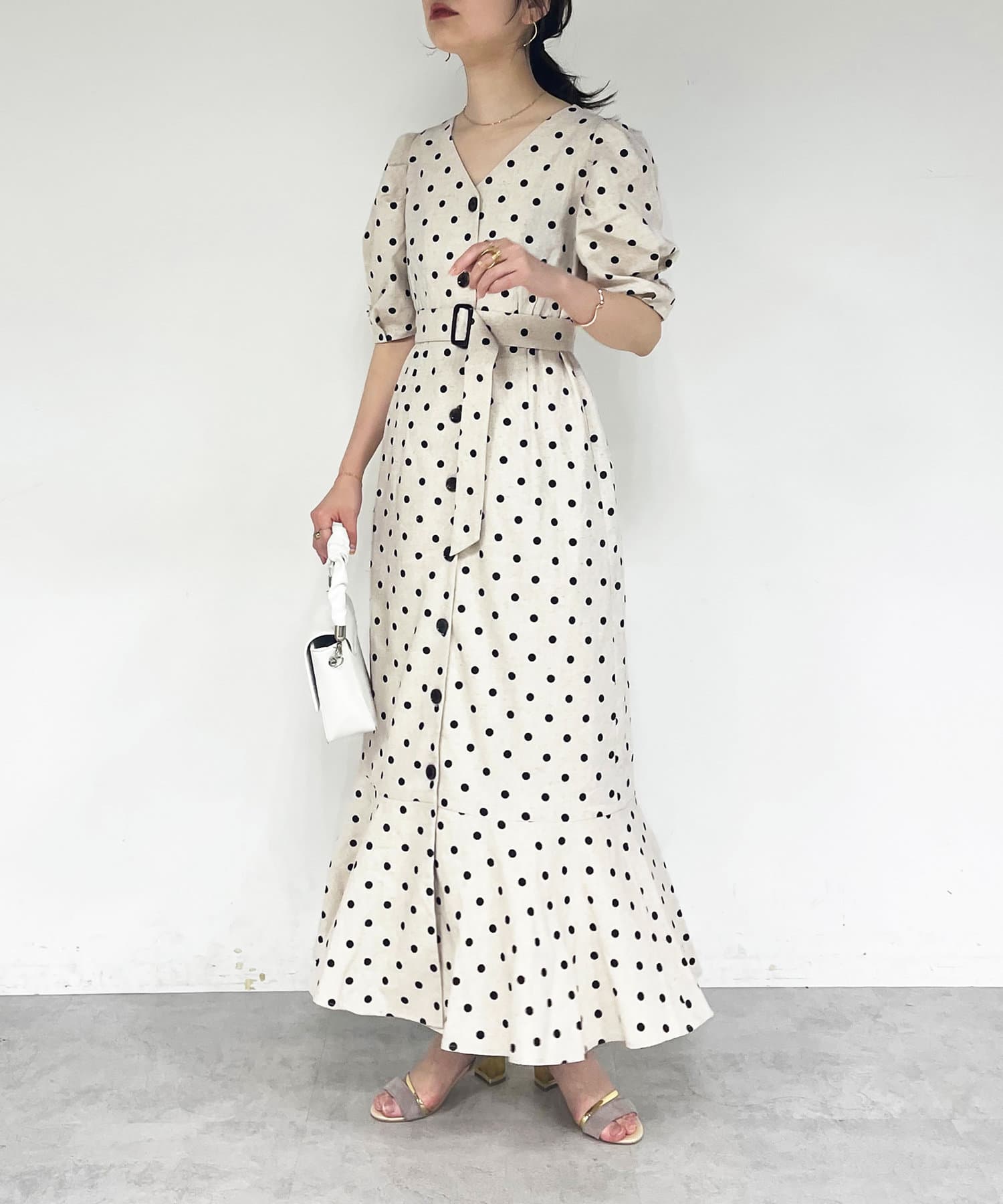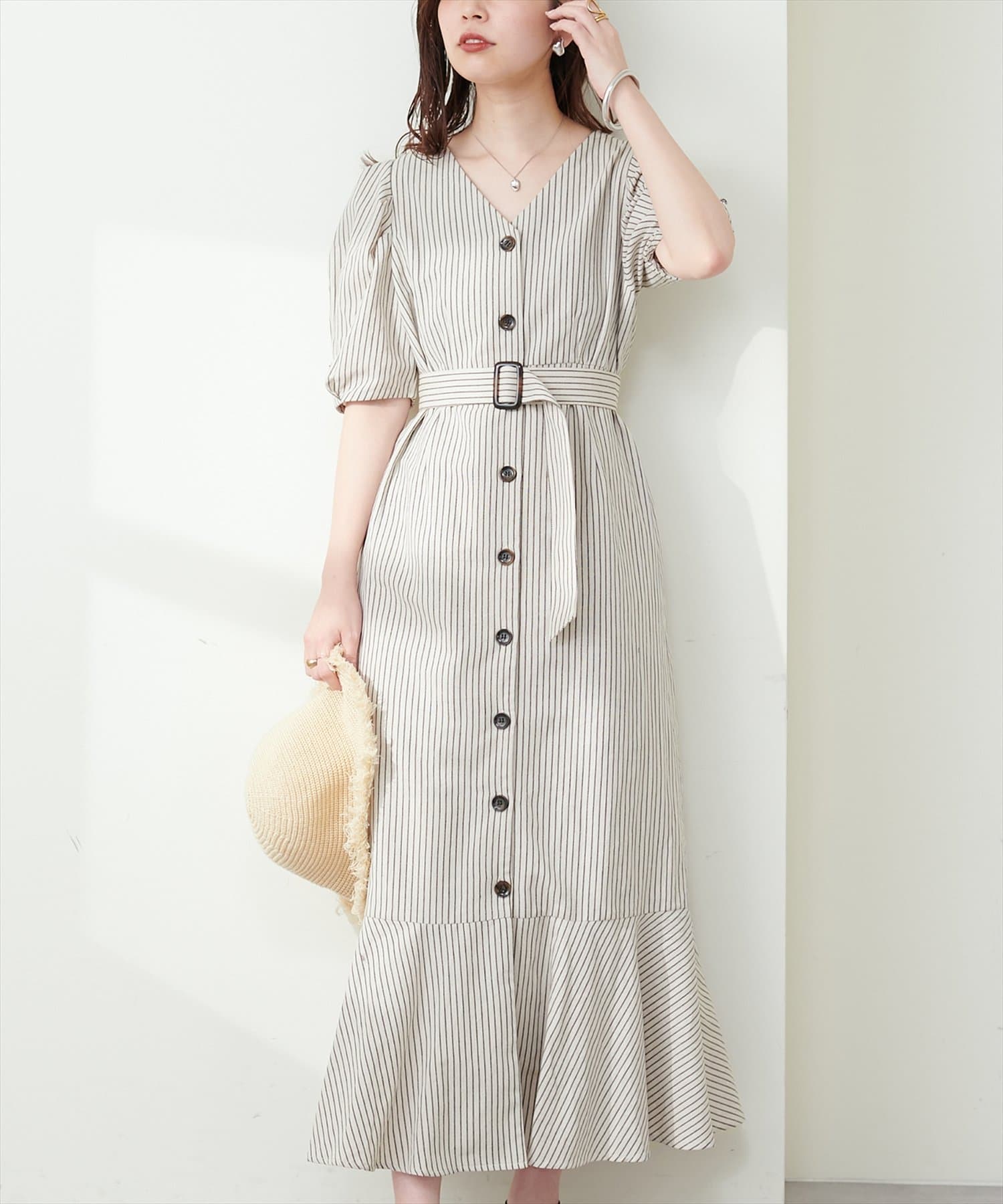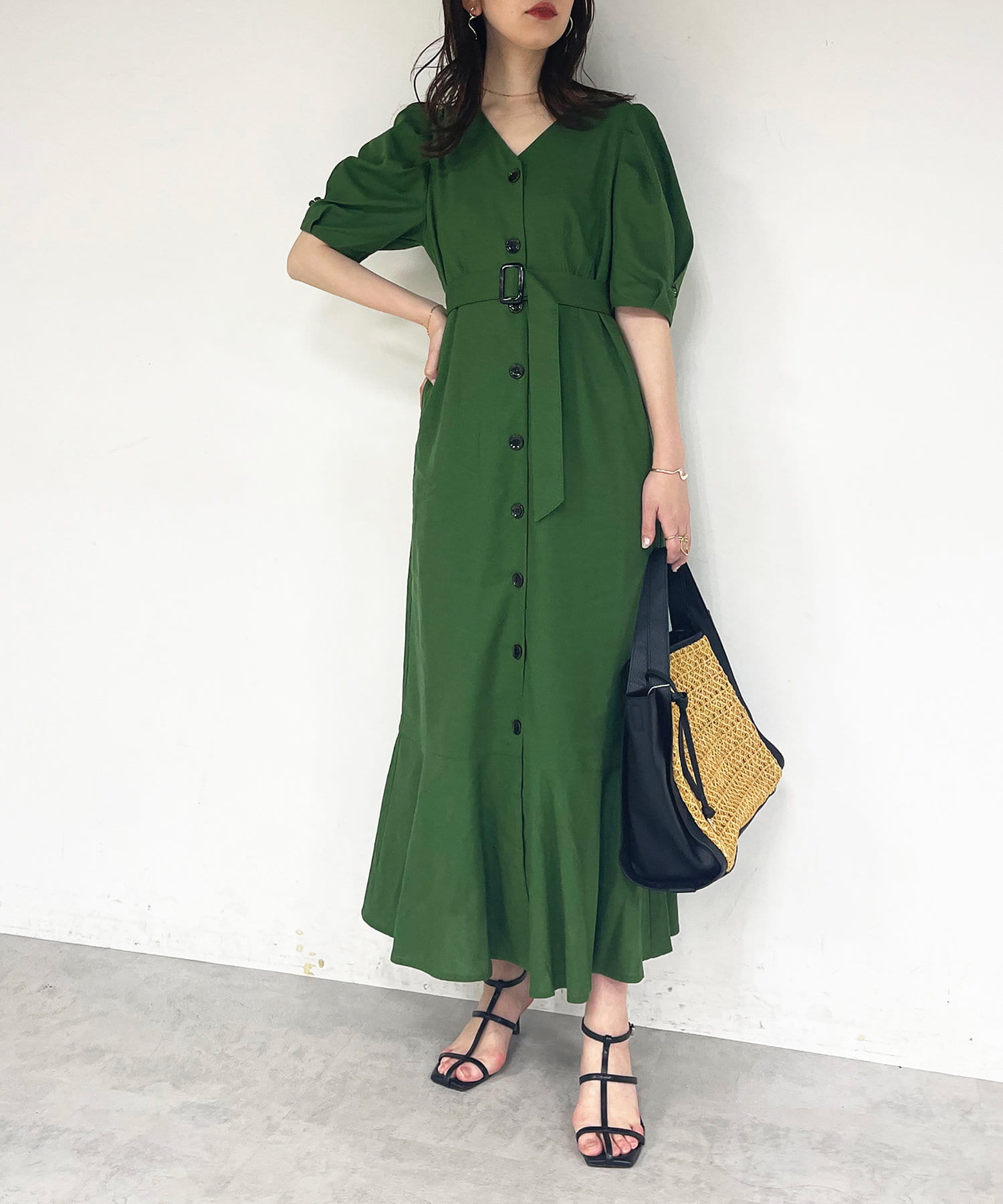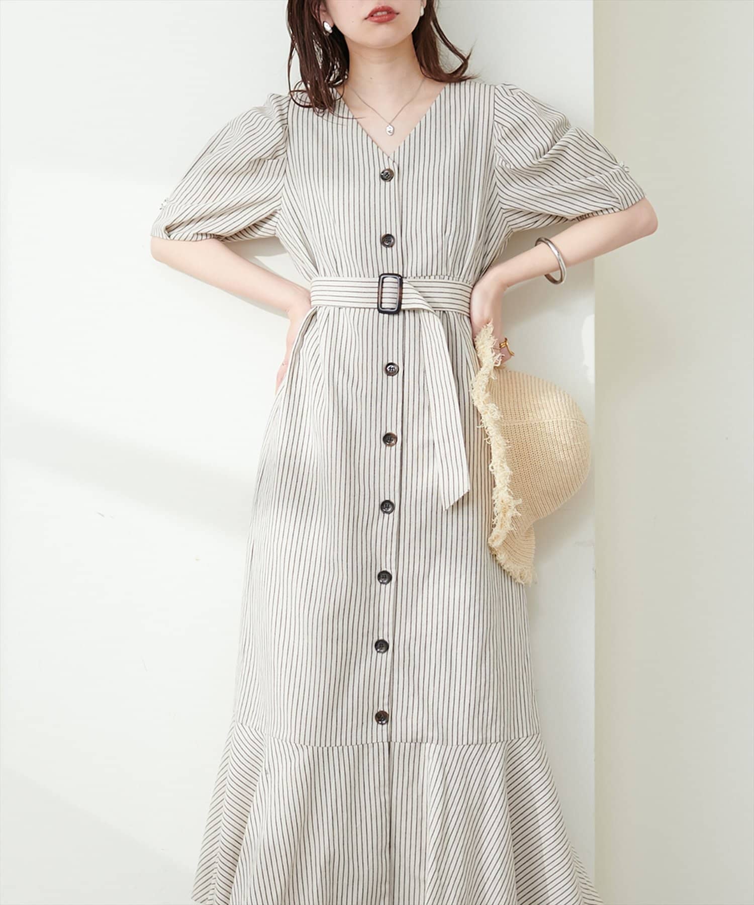 【M/Lサイズ展開】ベルト付き綿麻べっ甲釦ワンピース