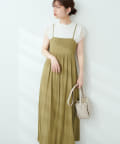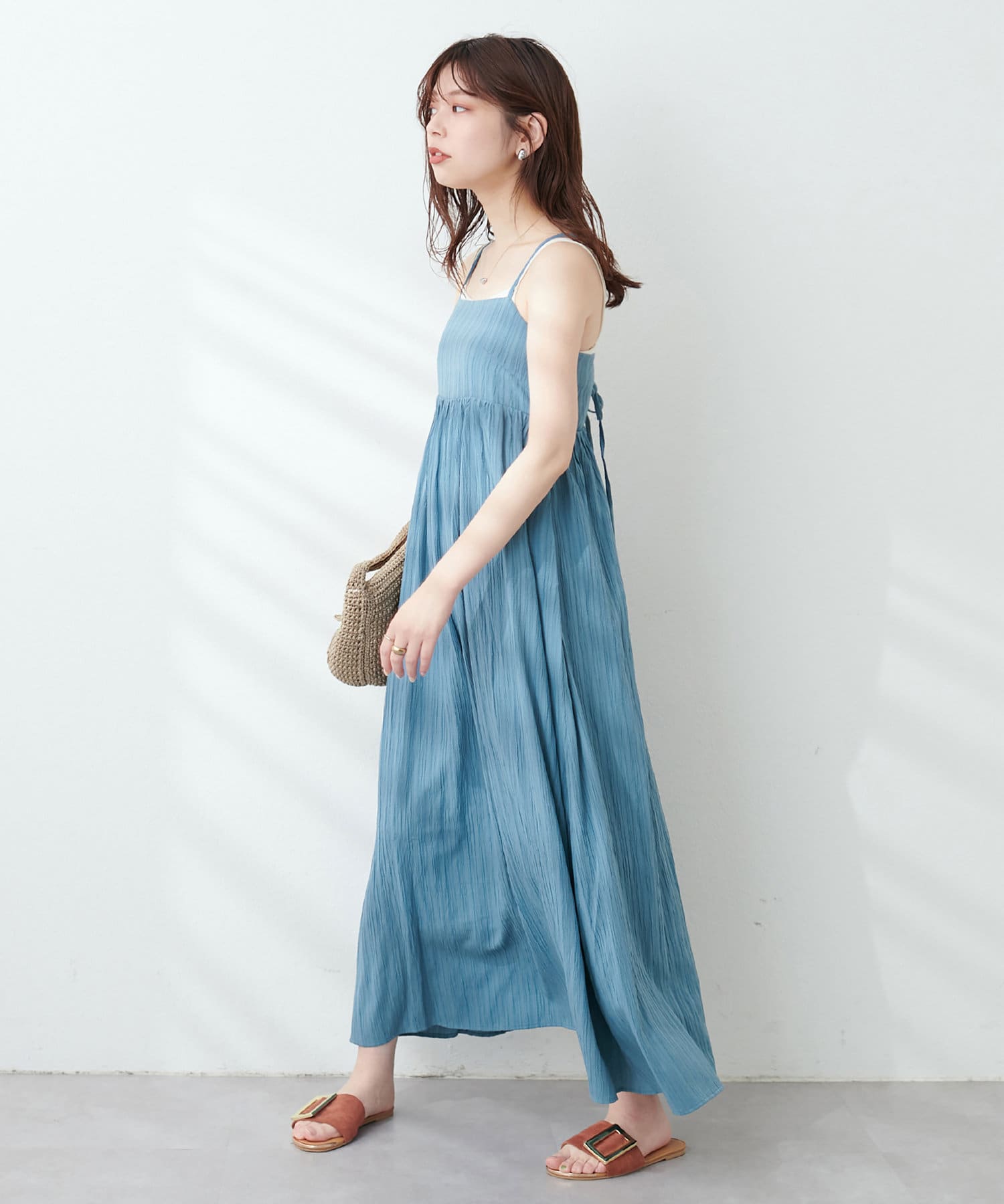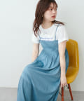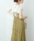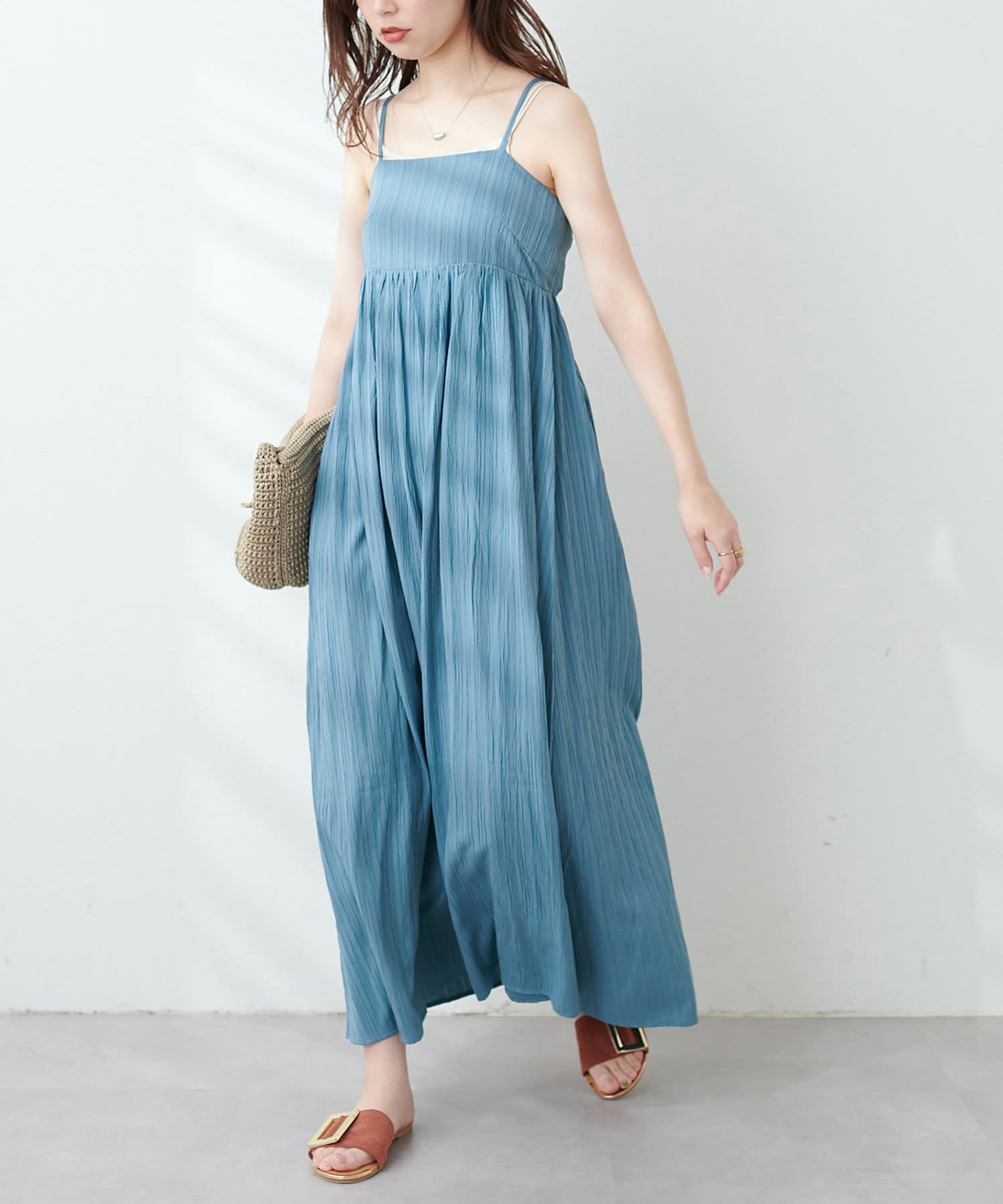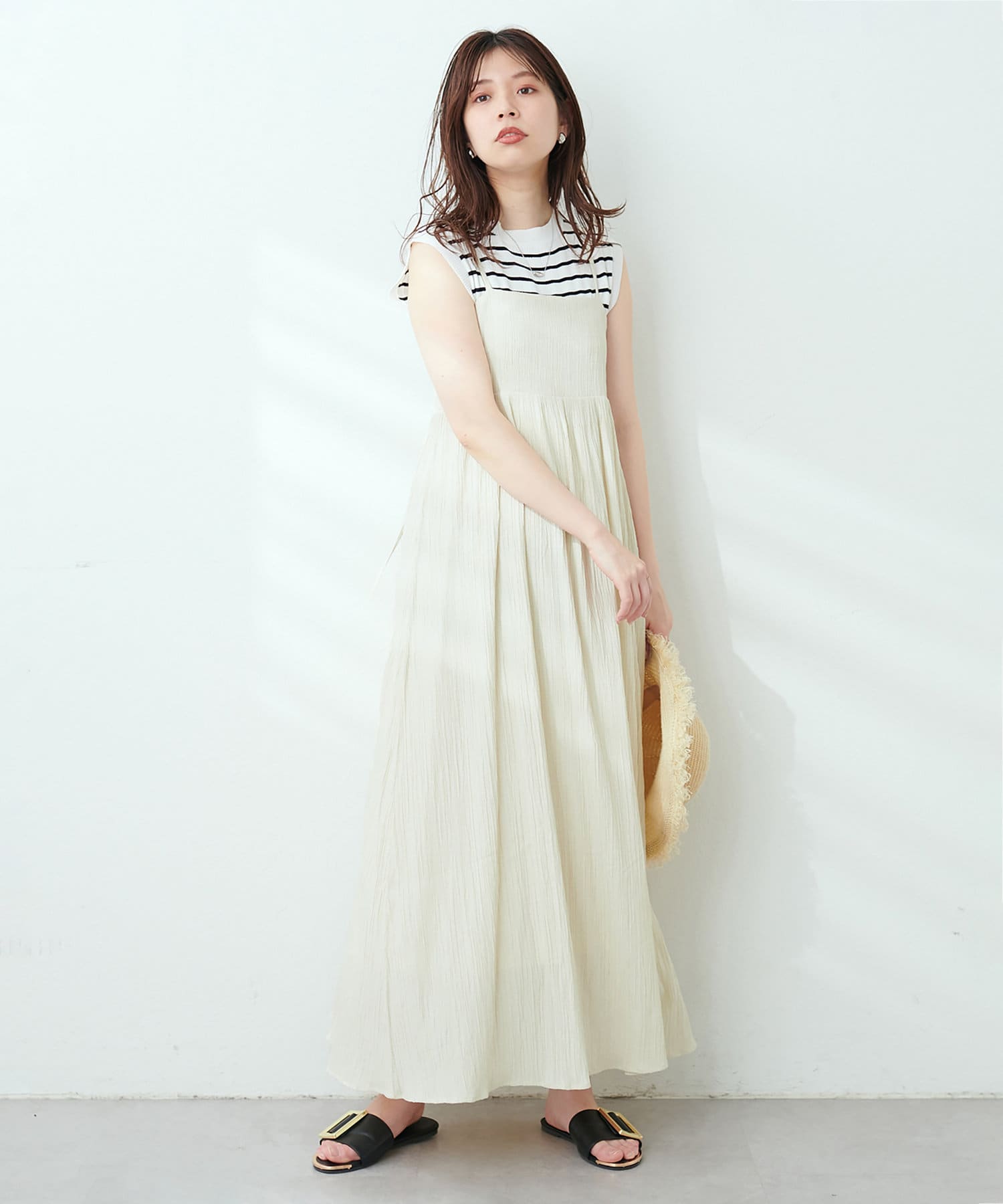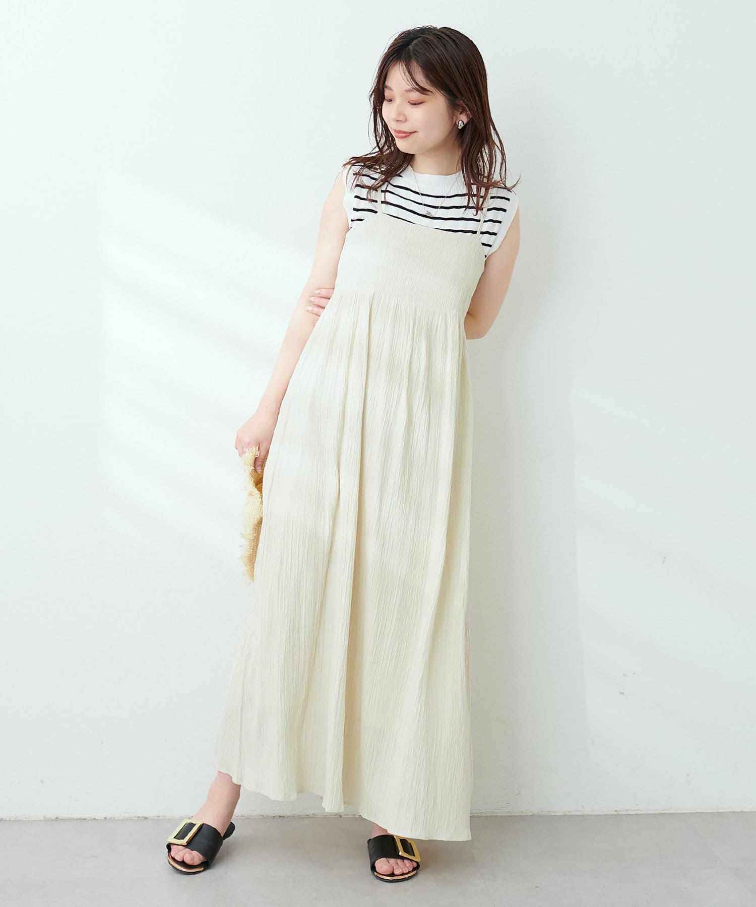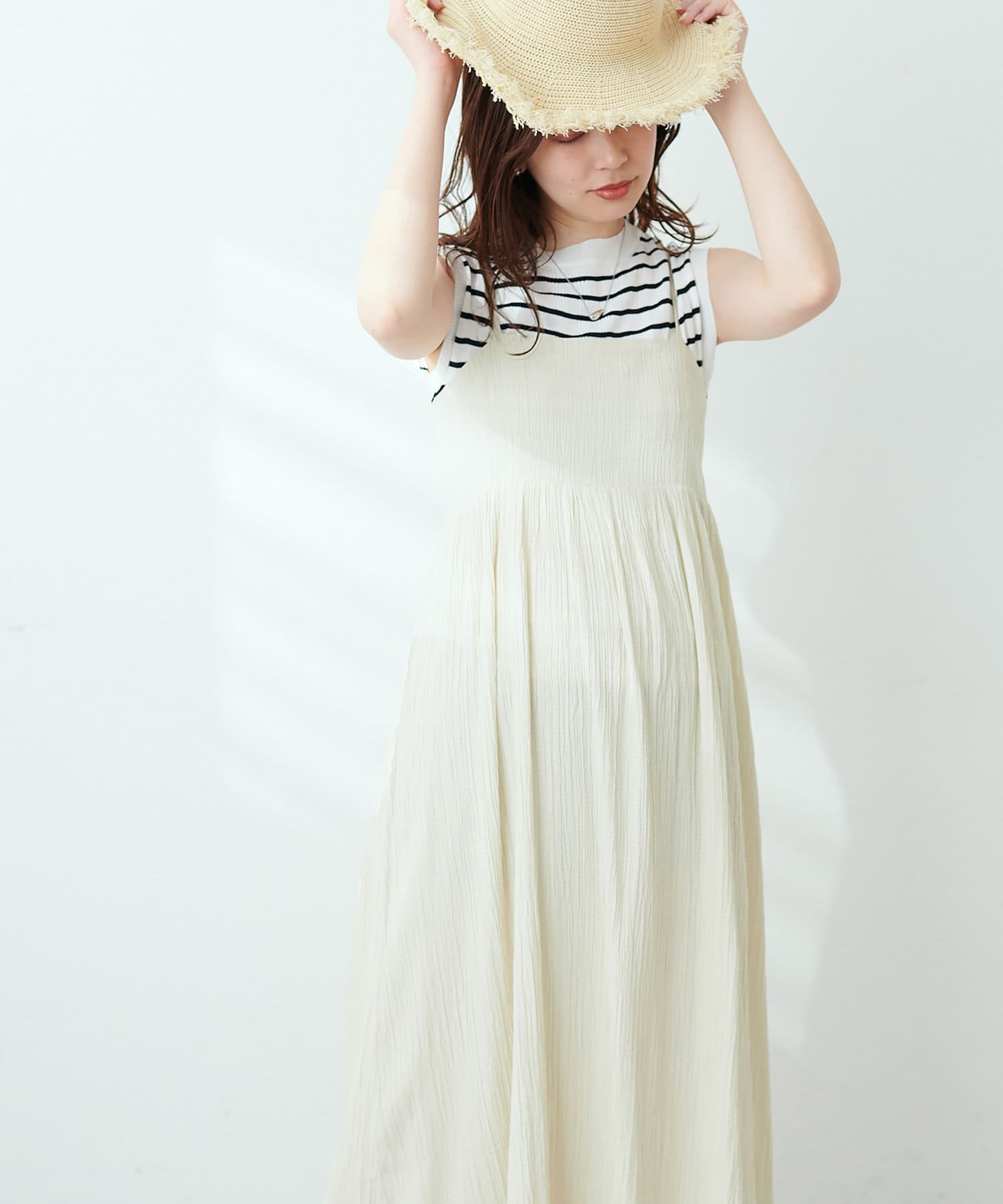ウエスト位置をやや高めに設定し、裾に向かって広がるフレアのシルエットと細めの肩ひもデザインで女性らしくておしゃれな一枚です。