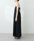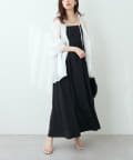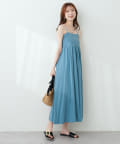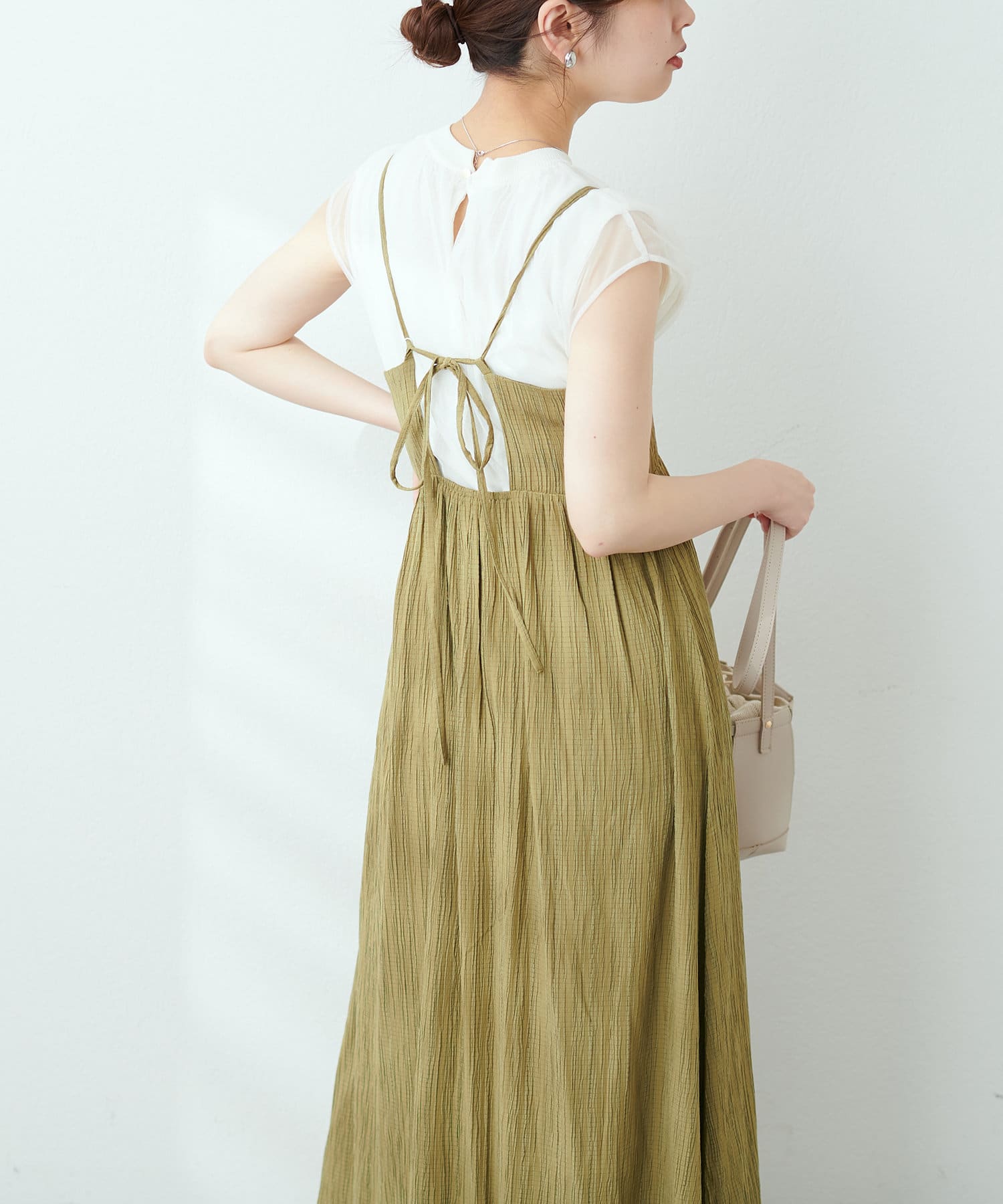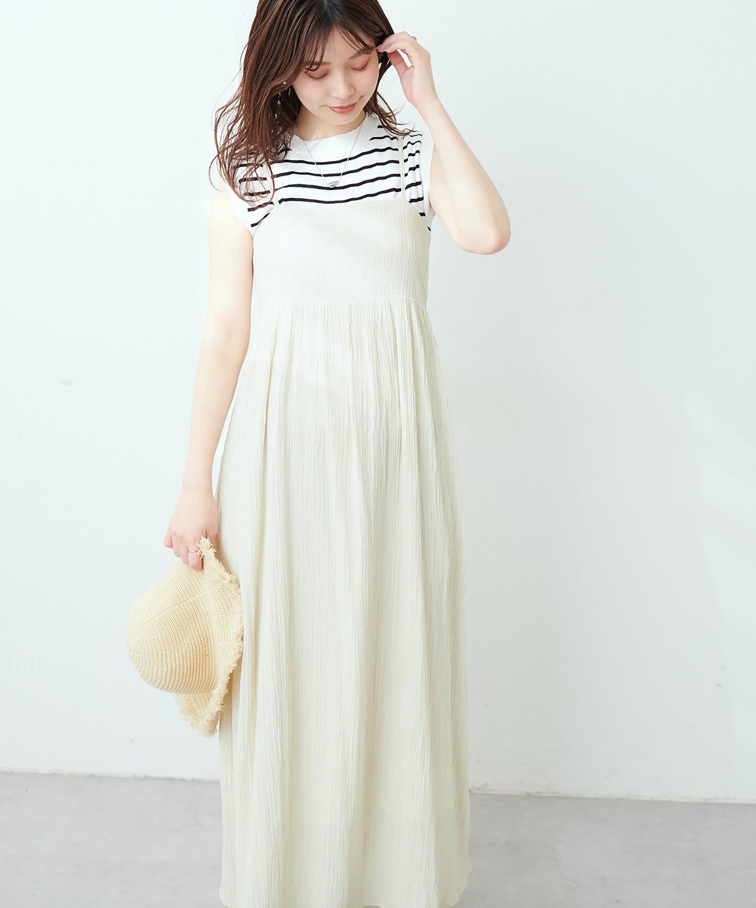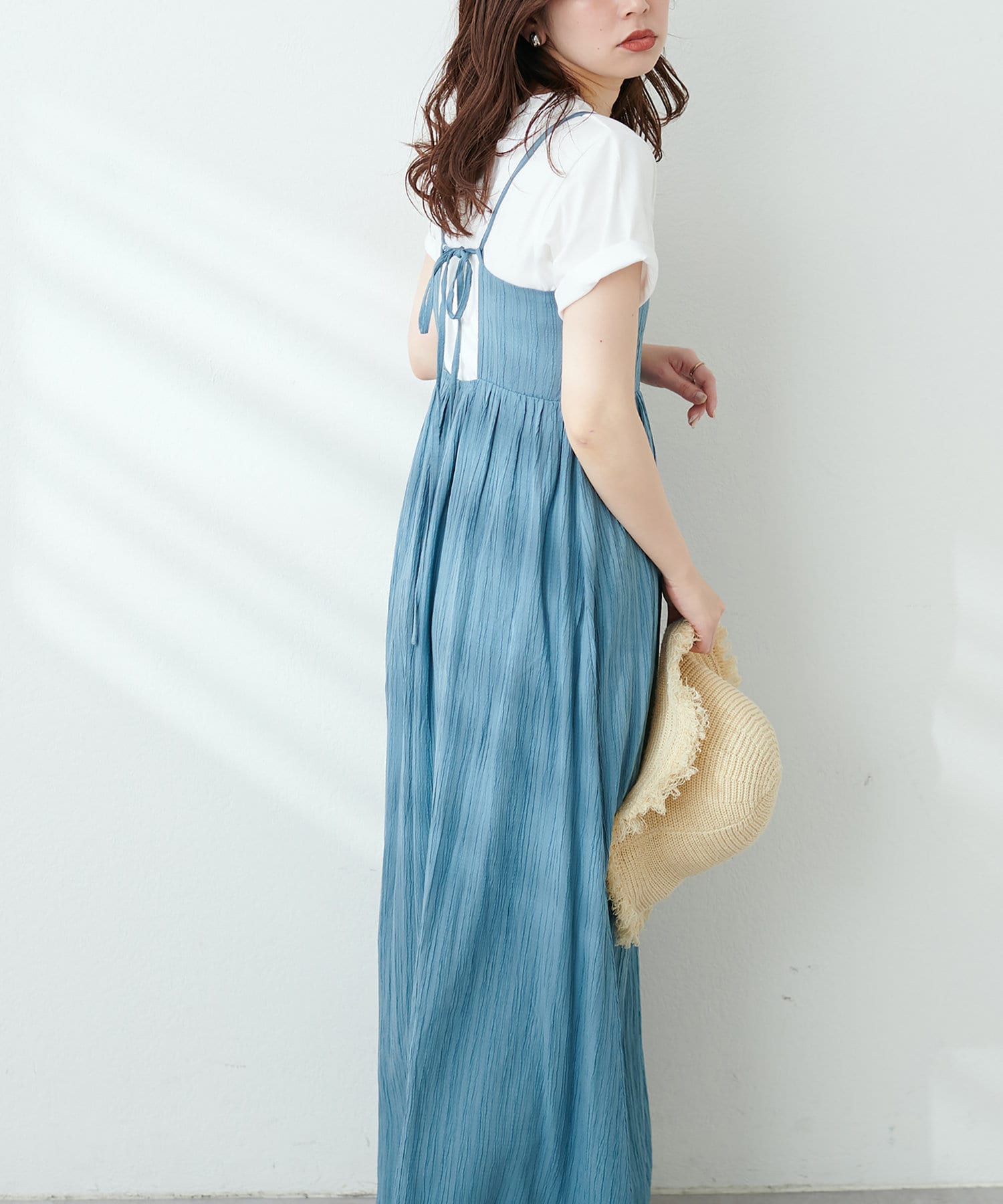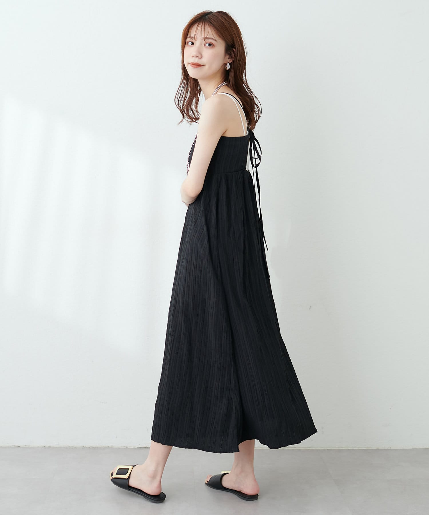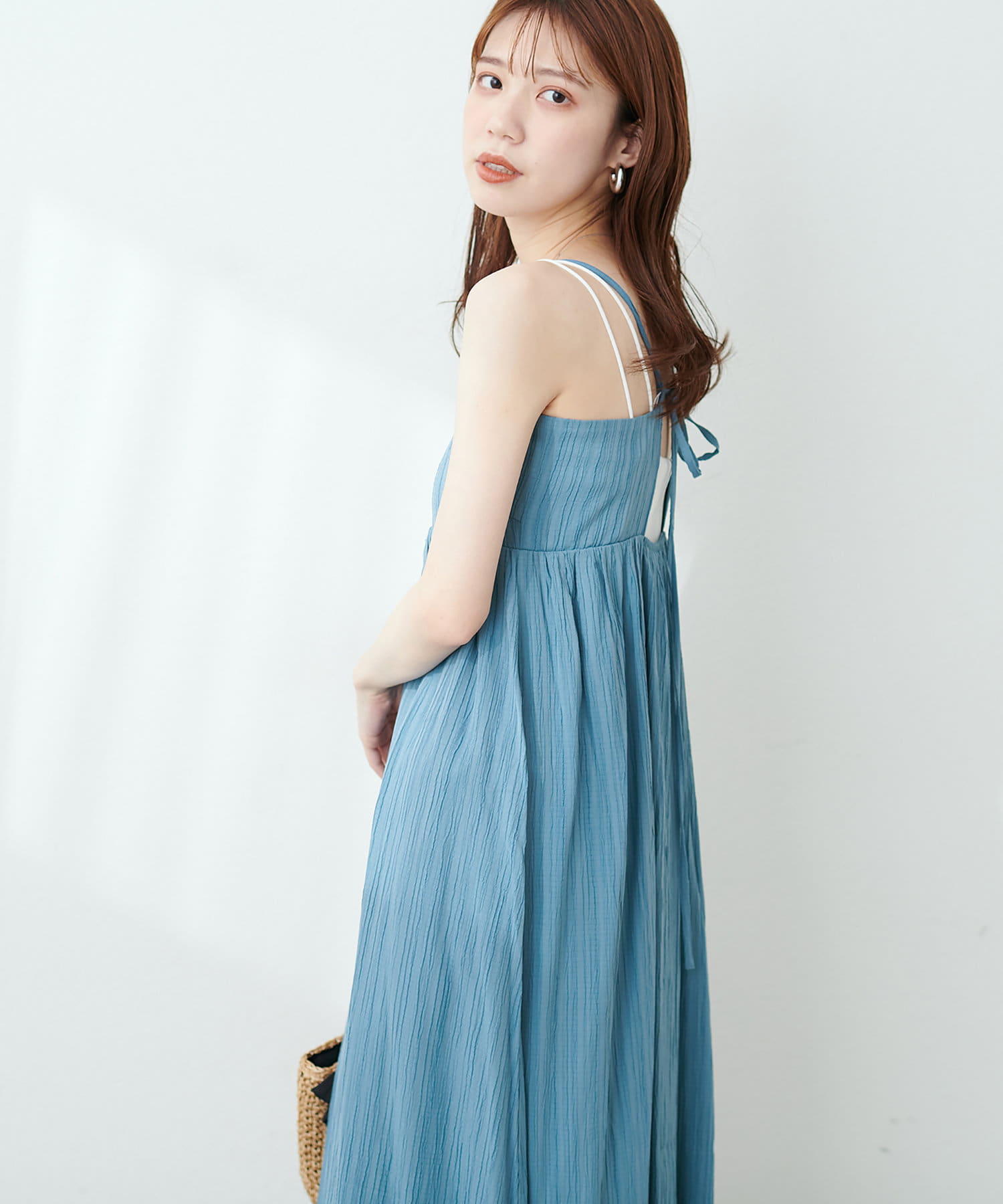 ウエスト位置をやや高めに設定し、裾に向かって広がるフレアのシルエットと細めの肩ひもデザインで女性らしくておしゃれな一枚です。