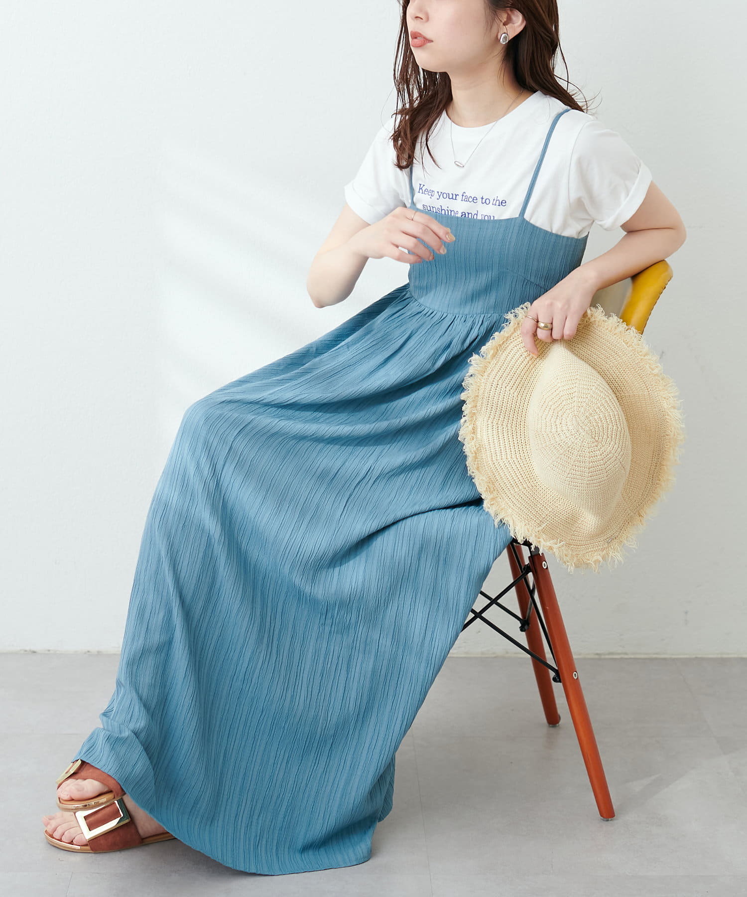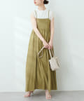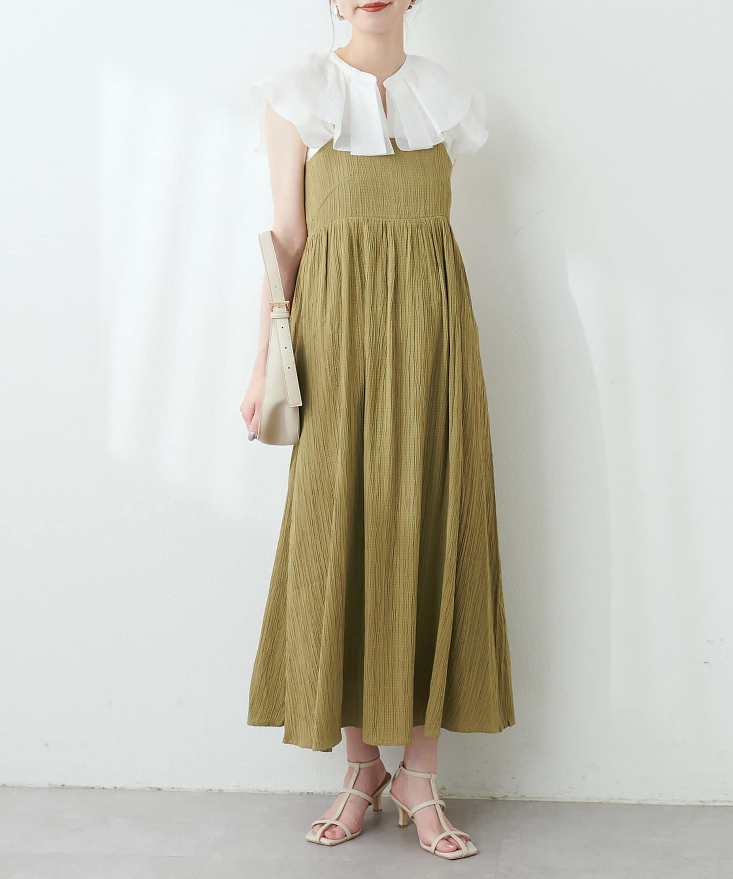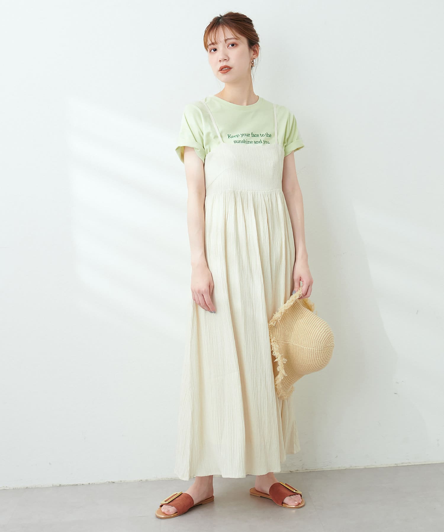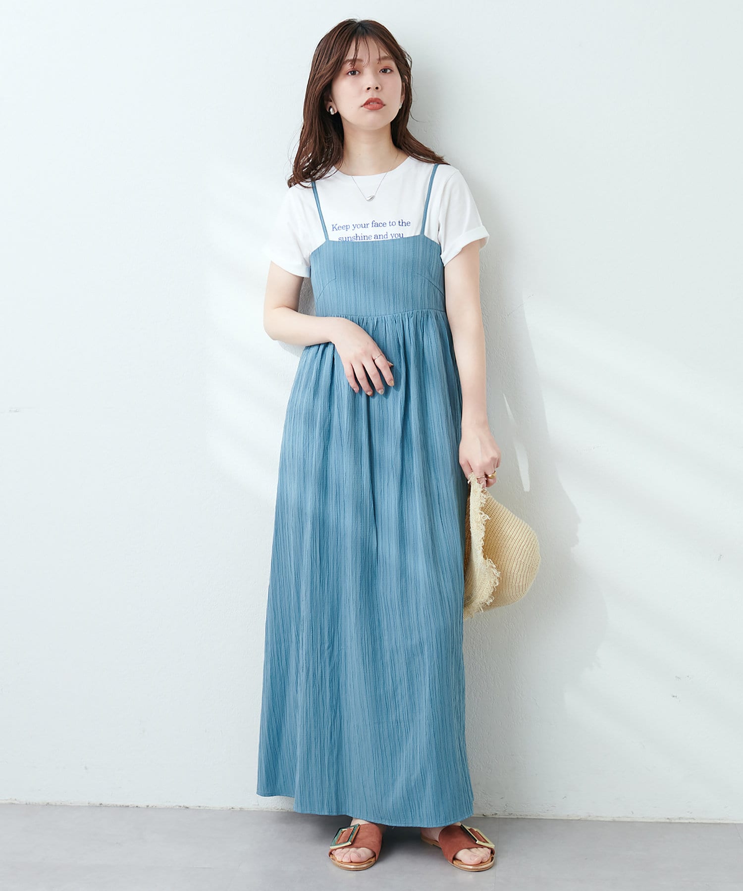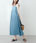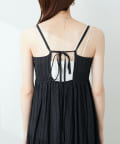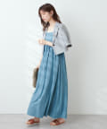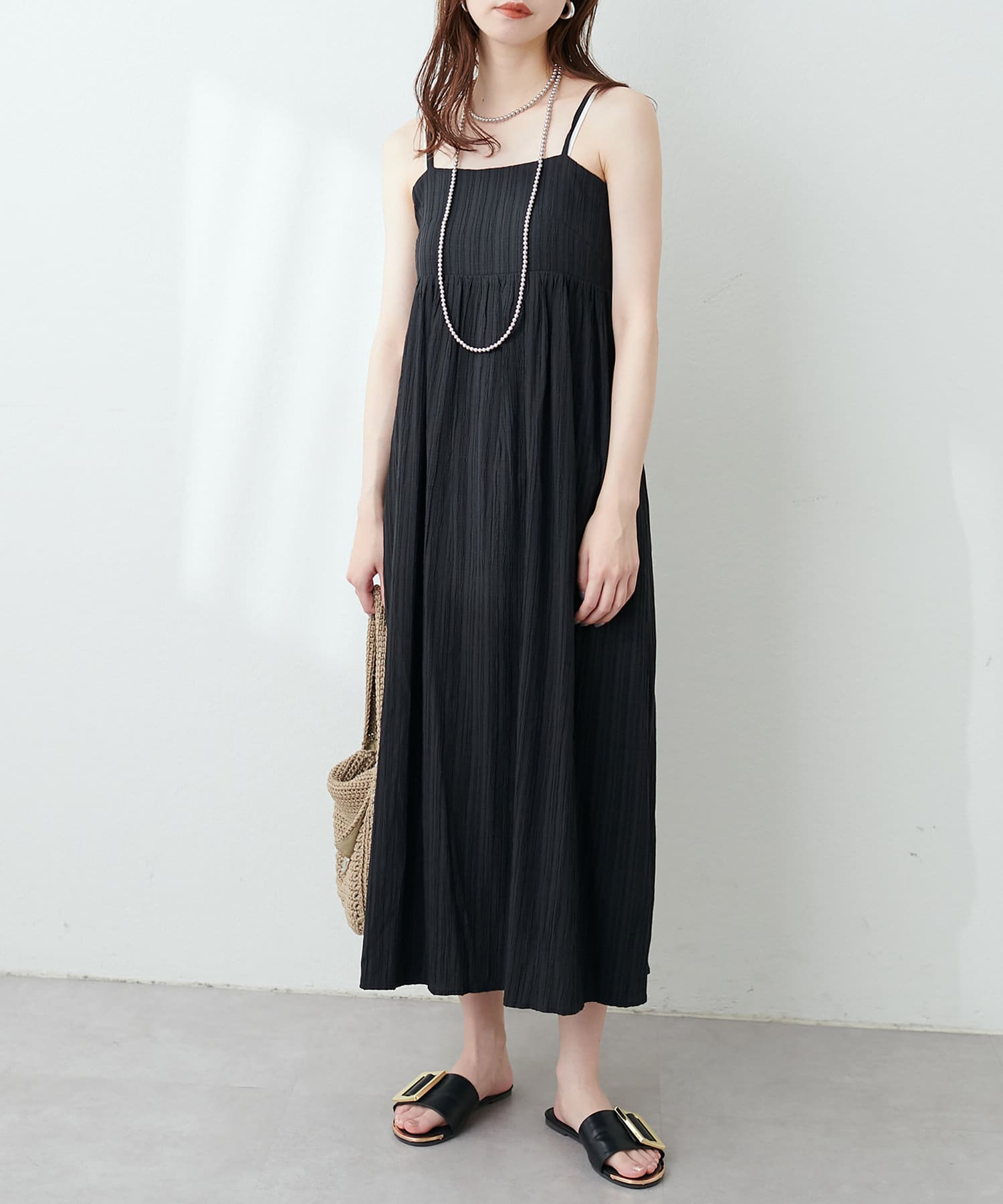 ウエスト位置をやや高めに設定し、裾に向かって広がるフレアのシルエットと細めの肩ひもデザインで女性らしくておしゃれな一枚です。