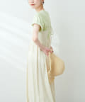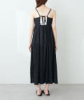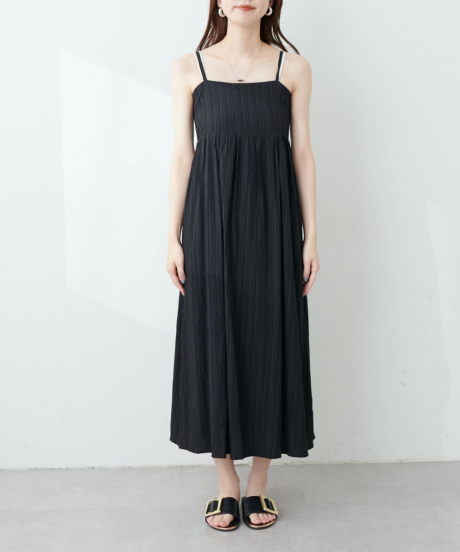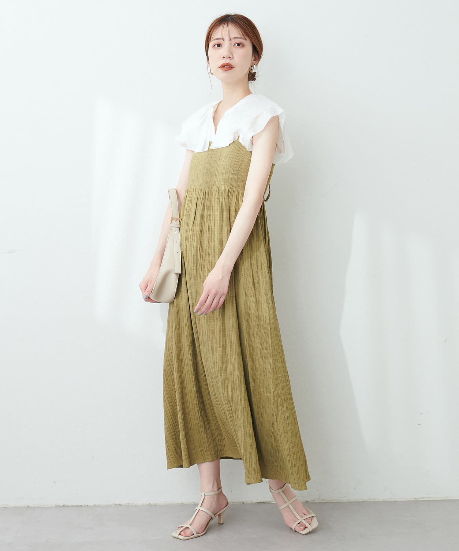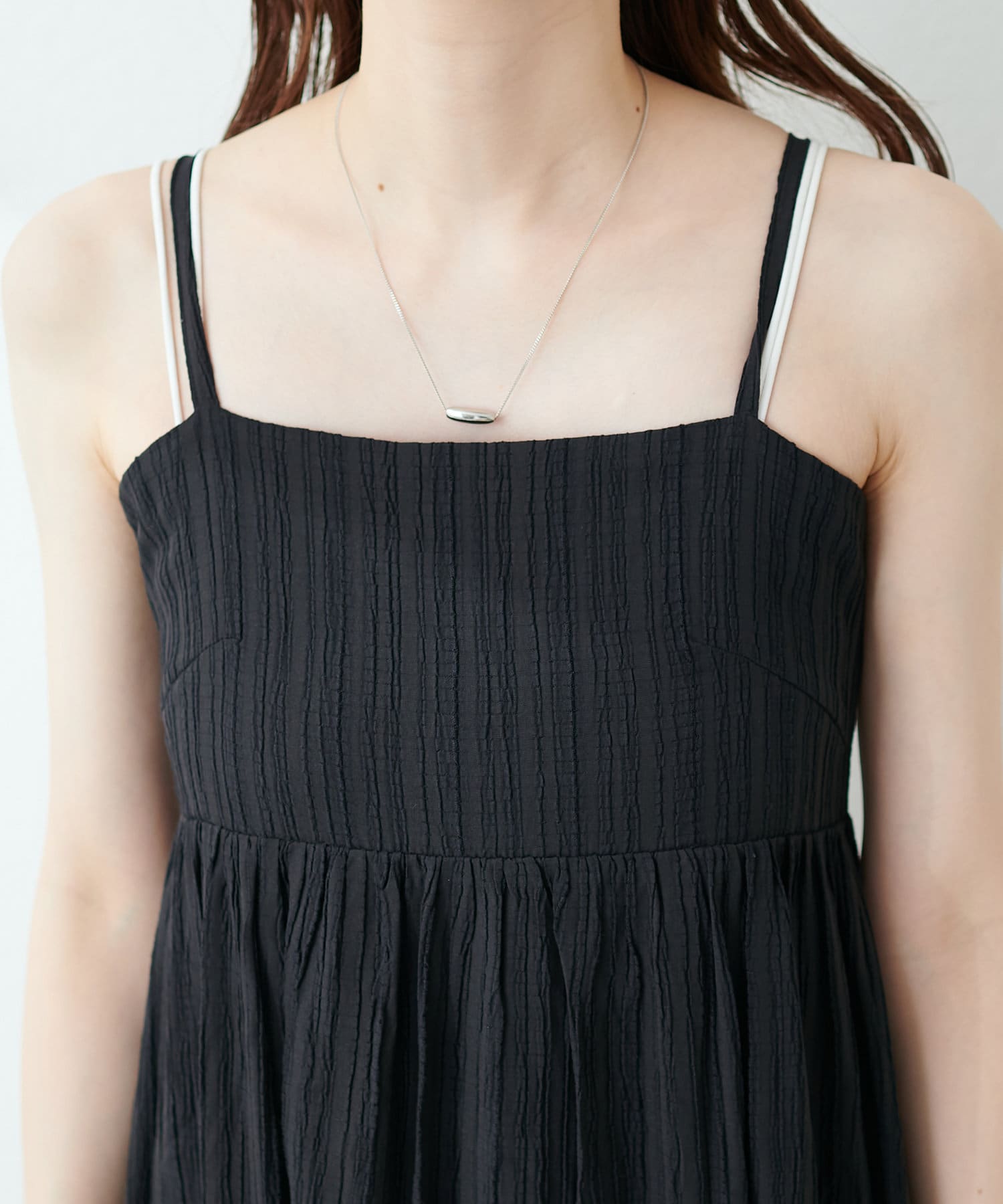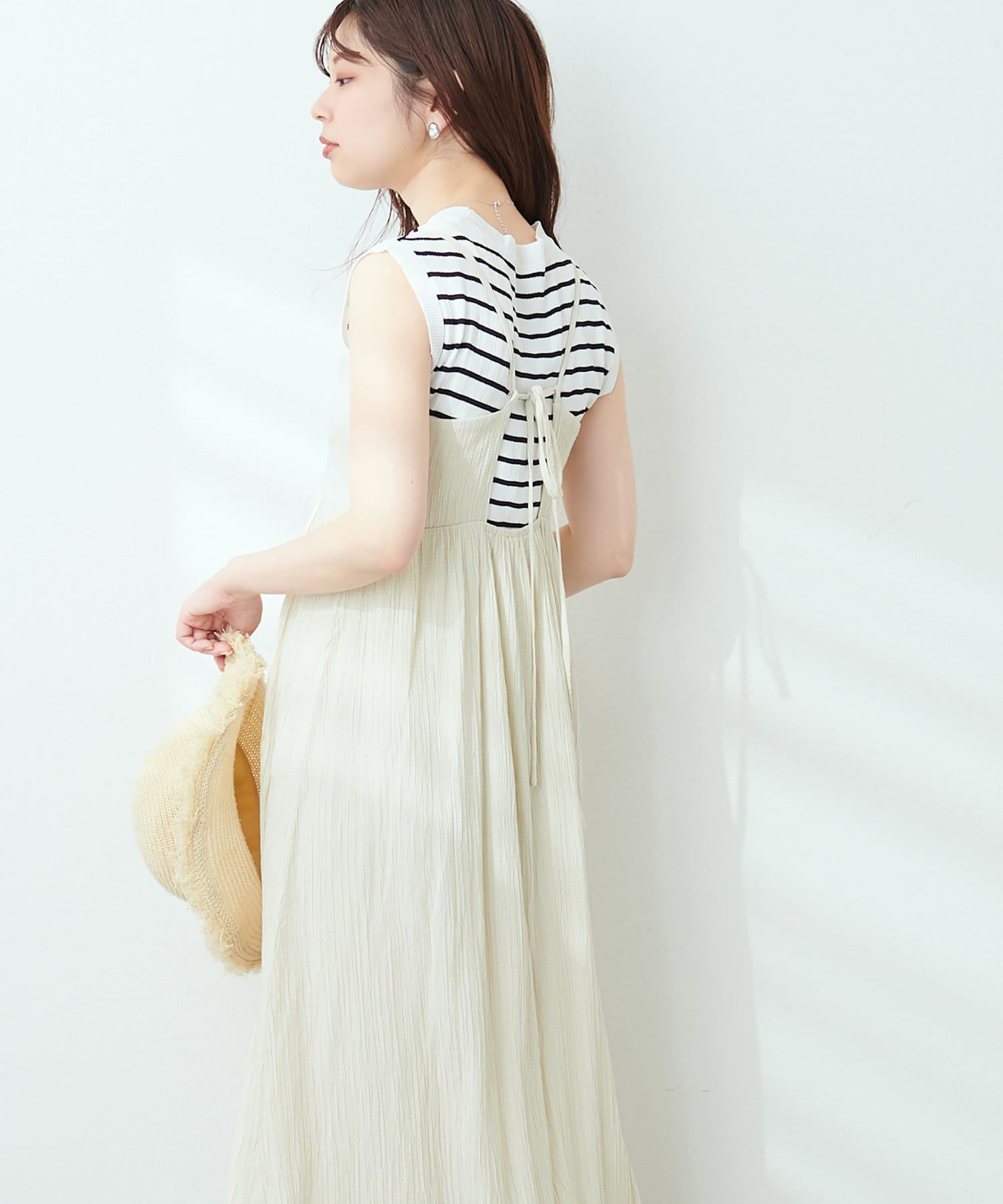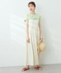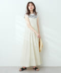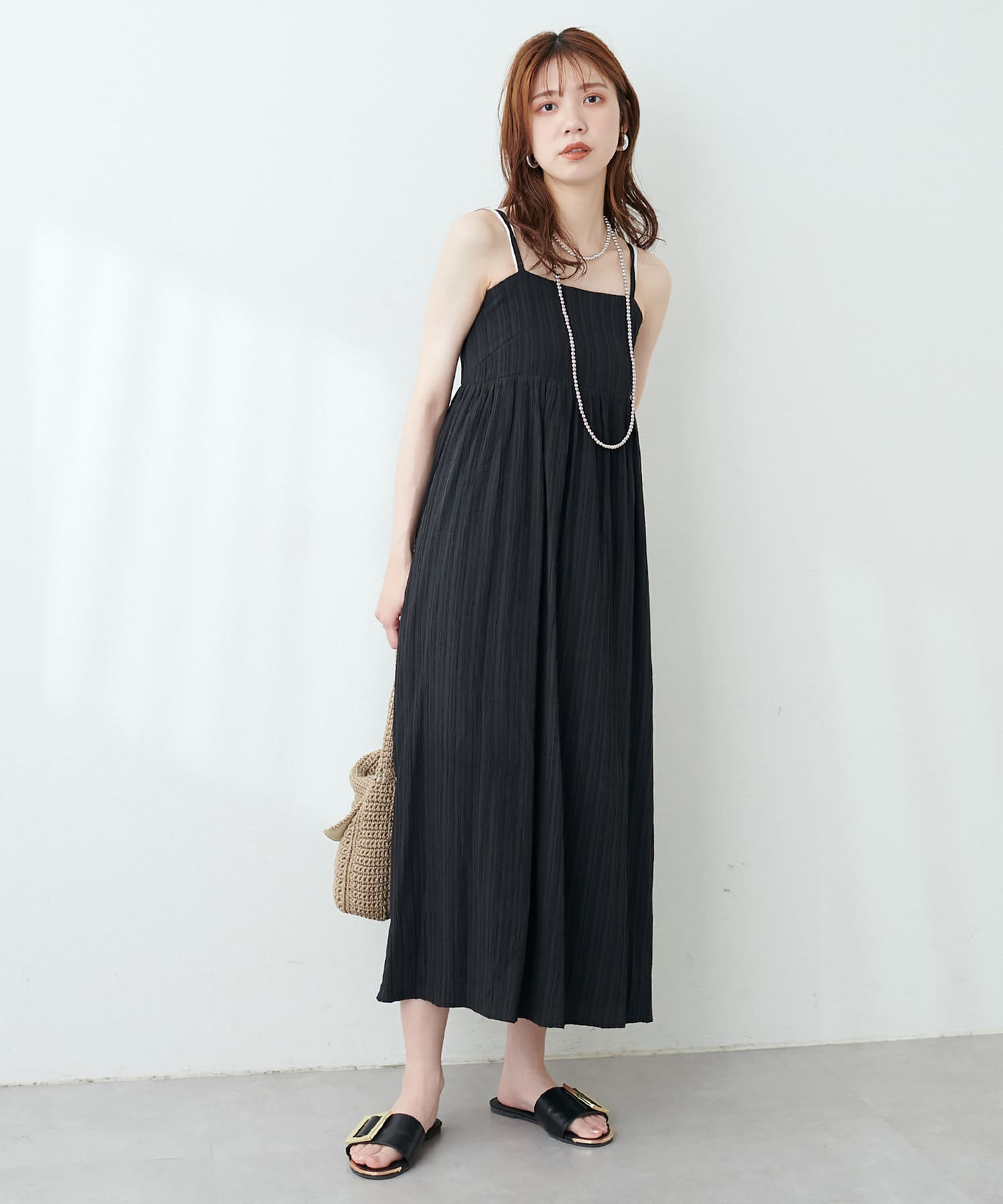 ウエスト位置をやや高めに設定し、裾に向かって広がるフレアのシルエットと細めの肩ひもデザインで女性らしくておしゃれな一枚です。