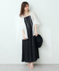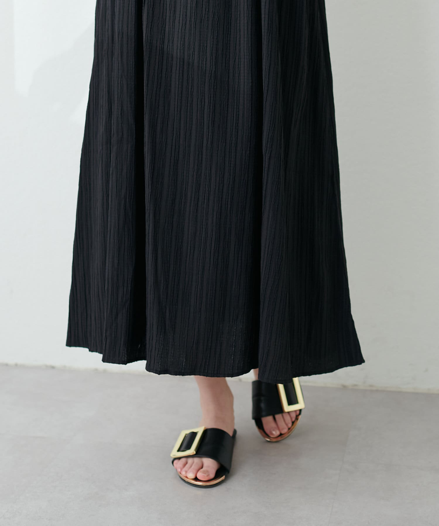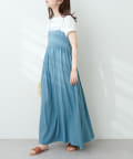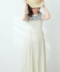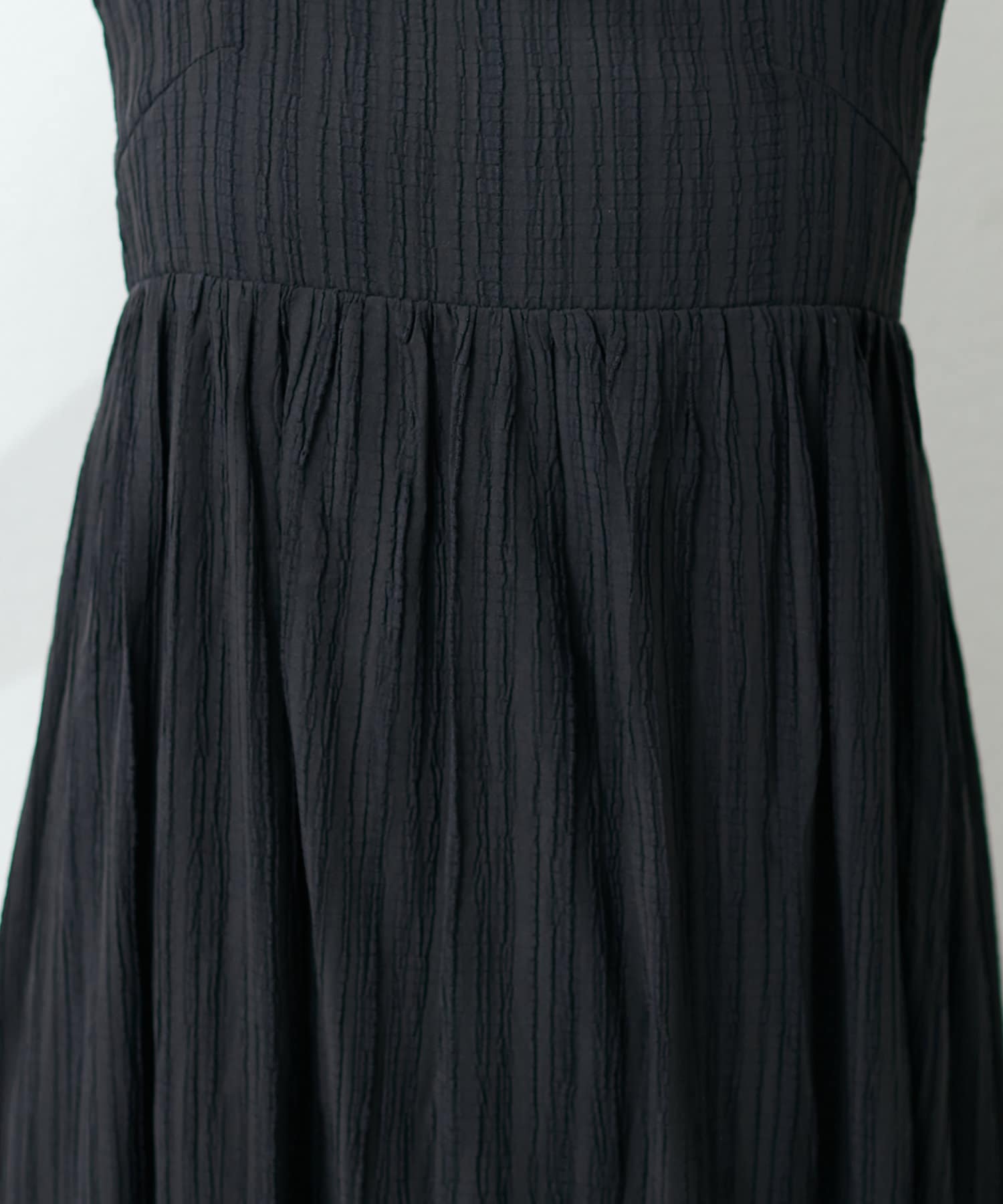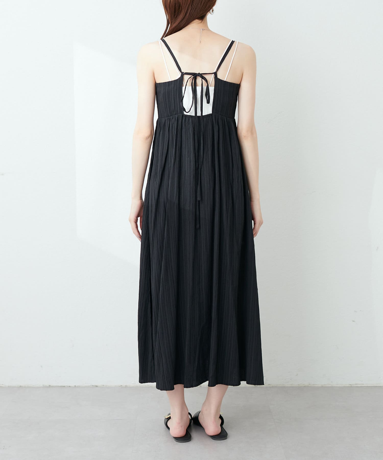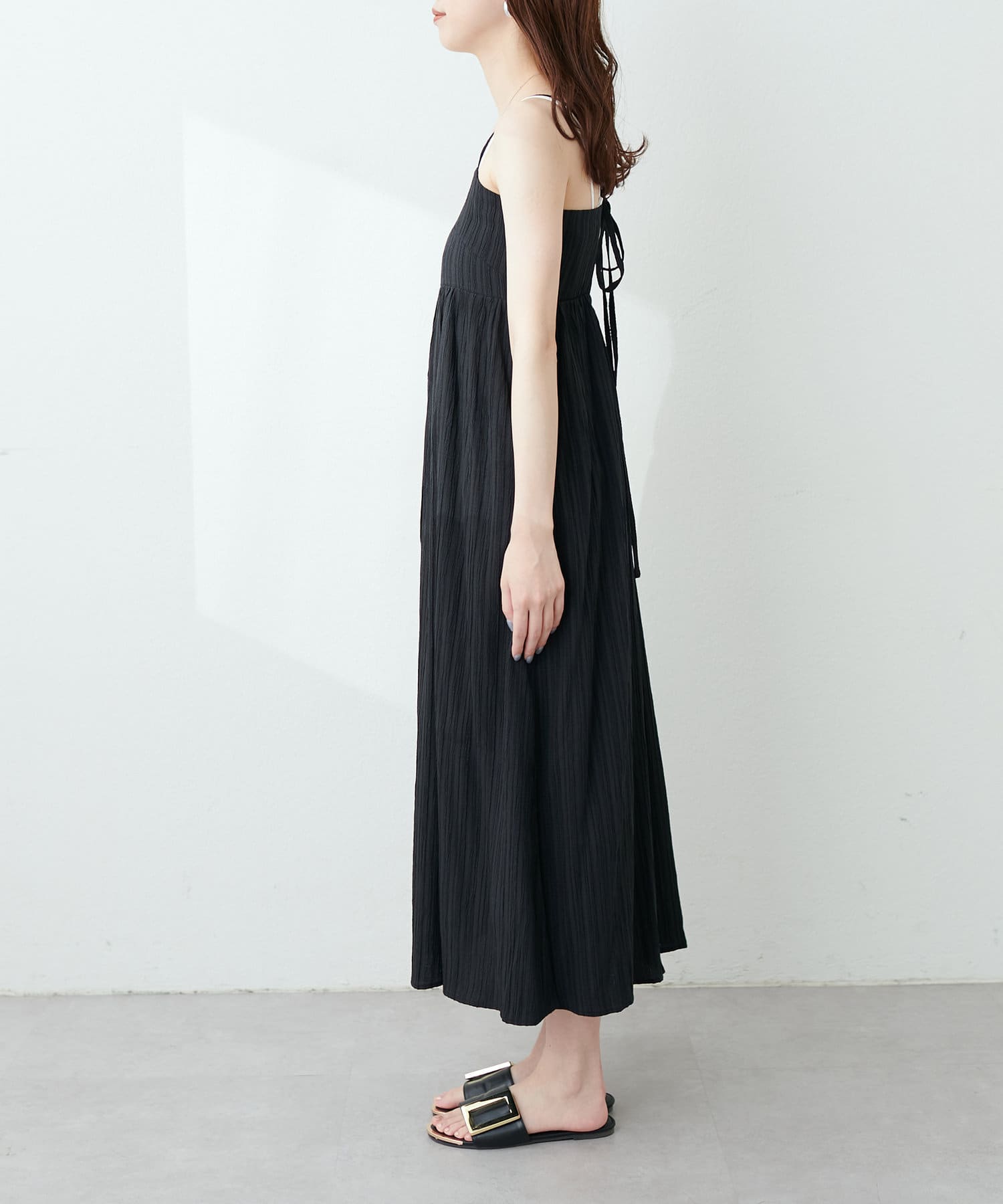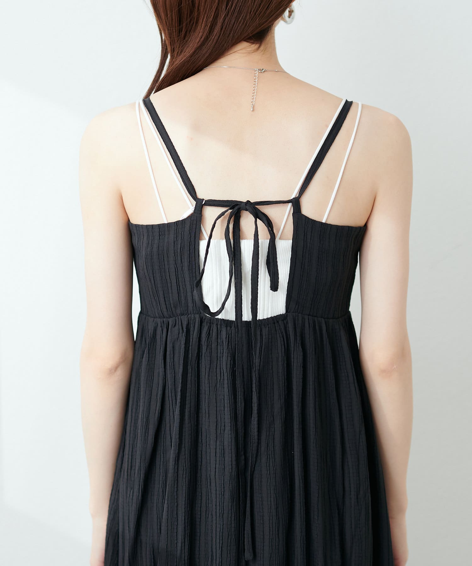 ウエスト位置をやや高めに設定し、裾に向かって広がるフレアのシルエットと細めの肩ひもデザインで女性らしくておしゃれな一枚です。