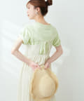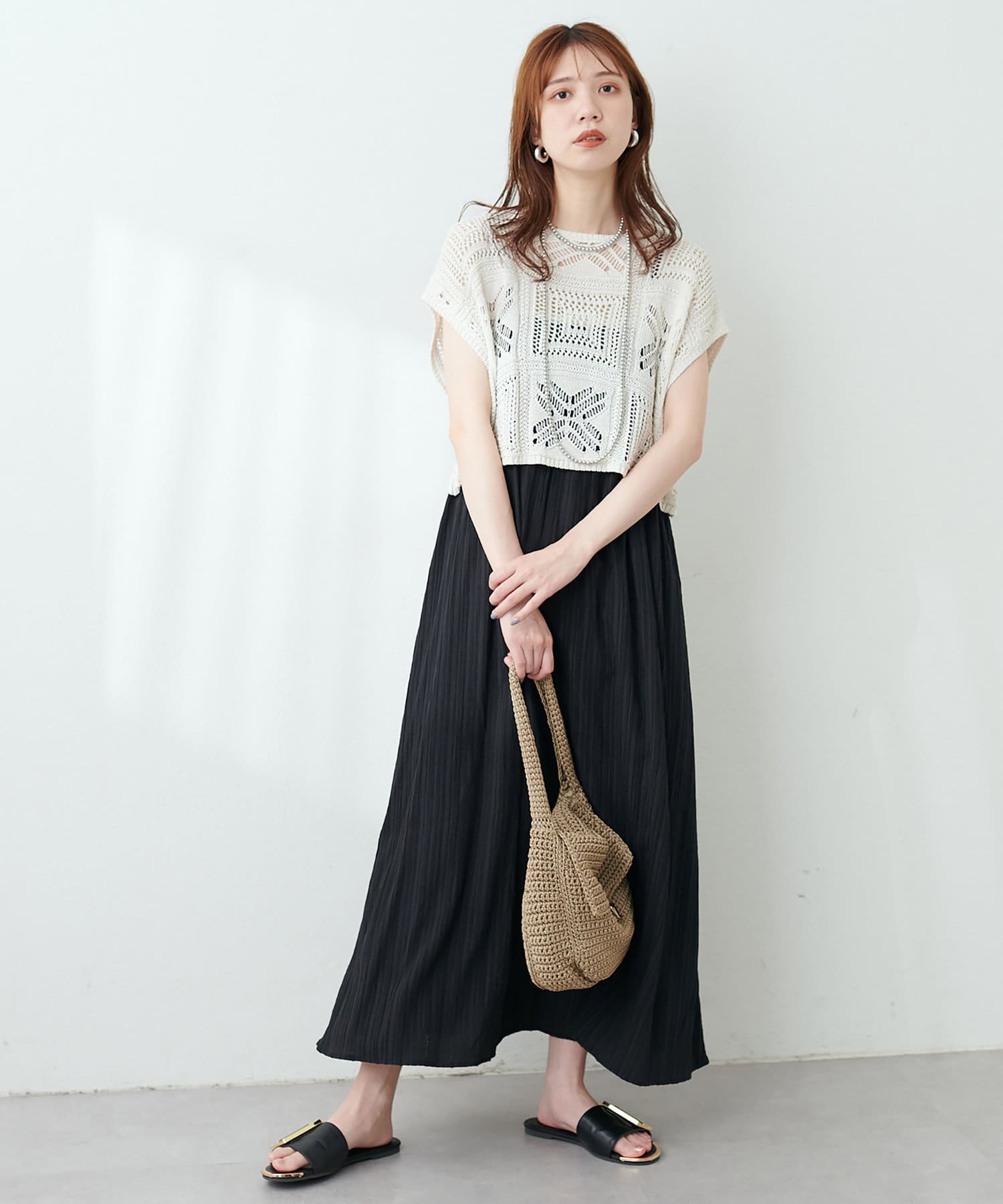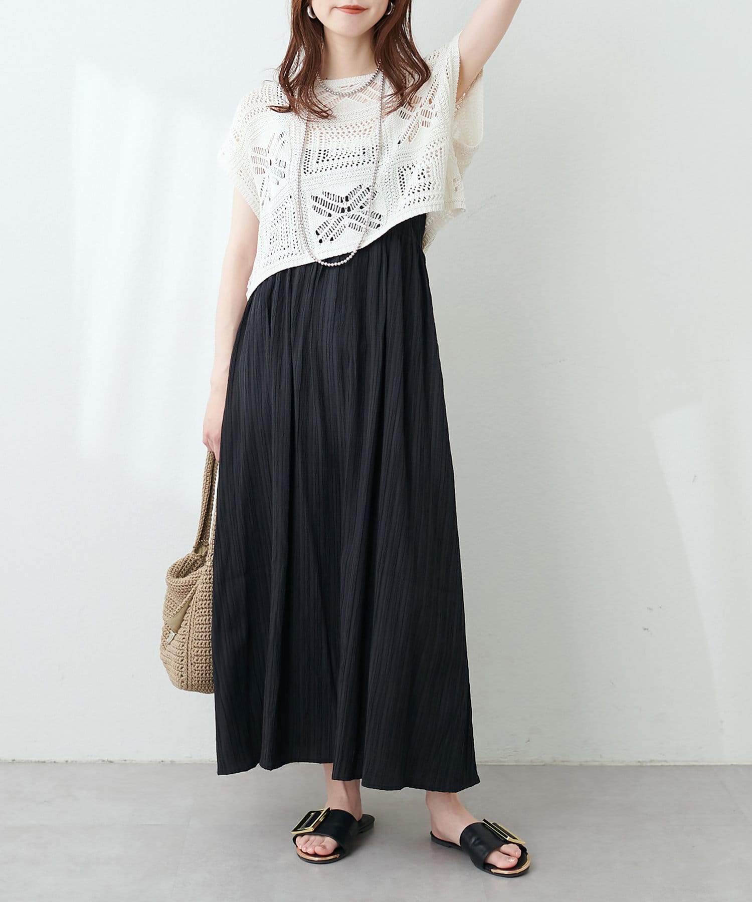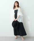 シアーインナーやフレンチスリーブのトップスを合わせたヘルシーな着こなしから