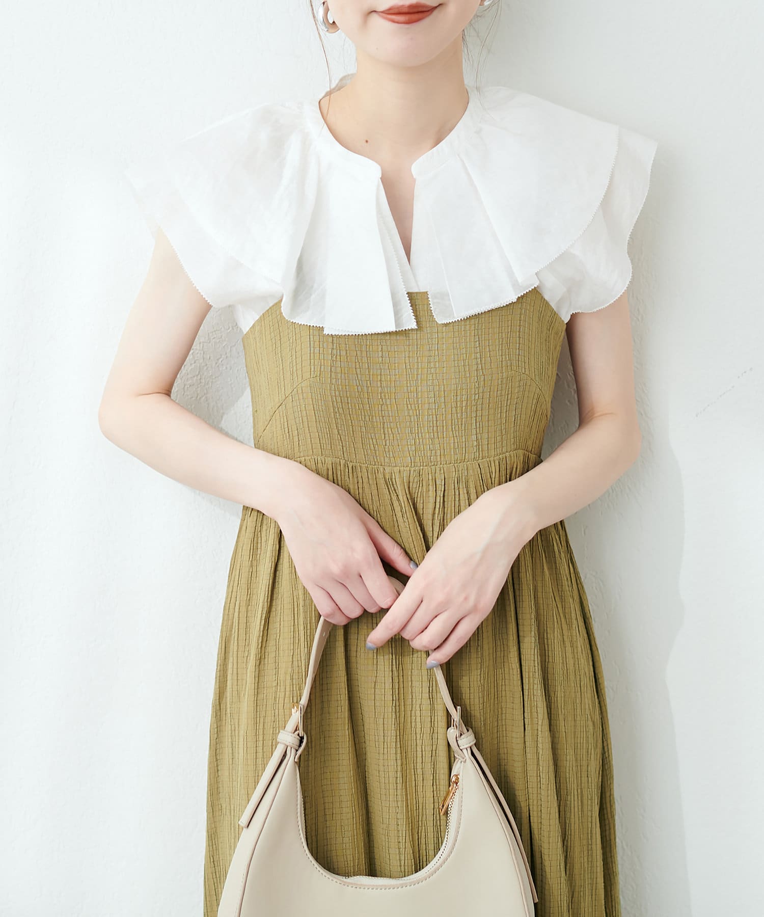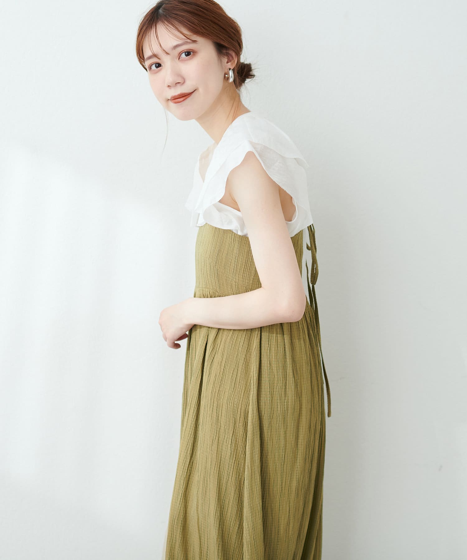 肩ひも部分はお好みでサイズ調整が可能なので、低身長の方も高身長の方も肩ひもを調整いただくとお好みの丈感で着用できます。