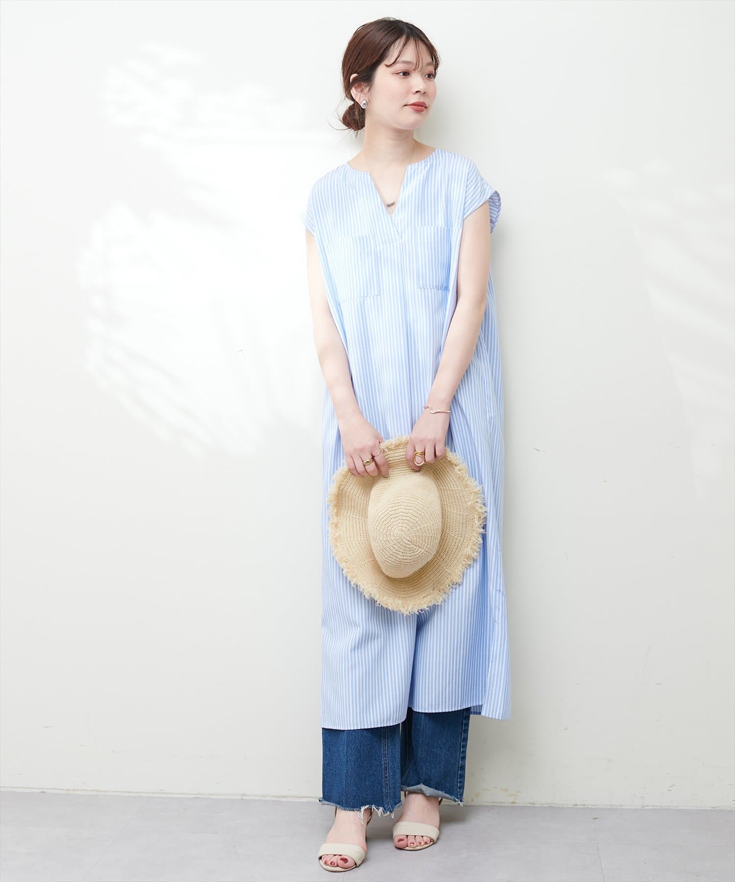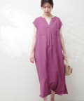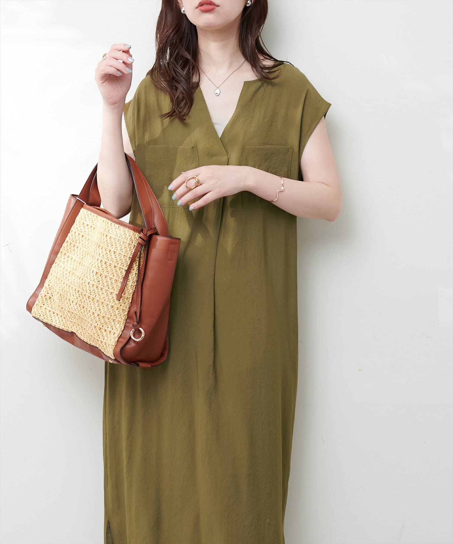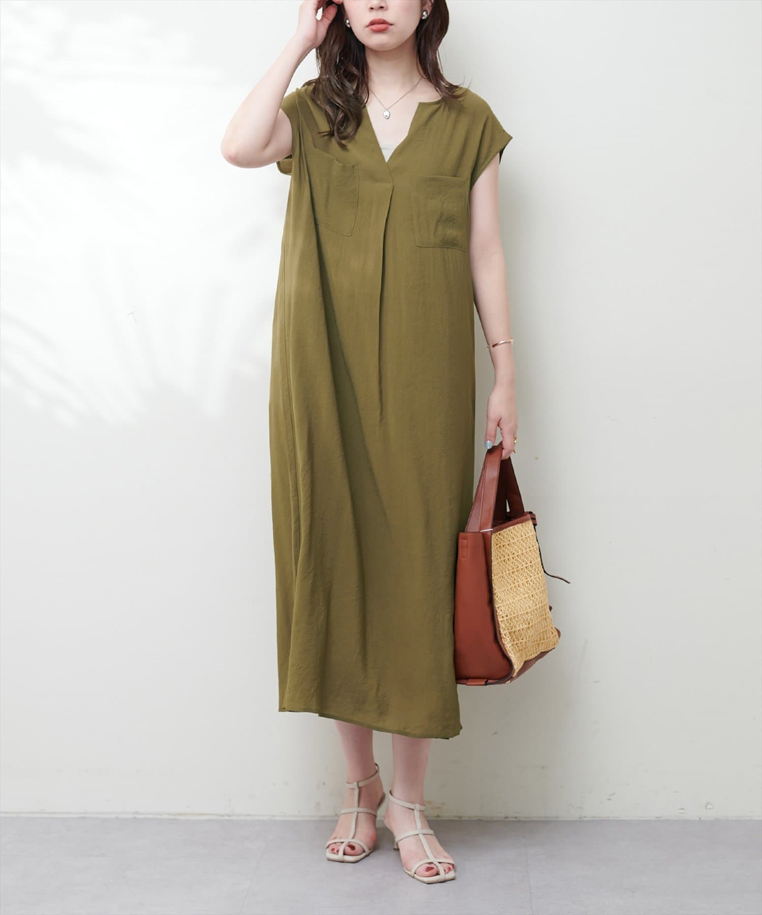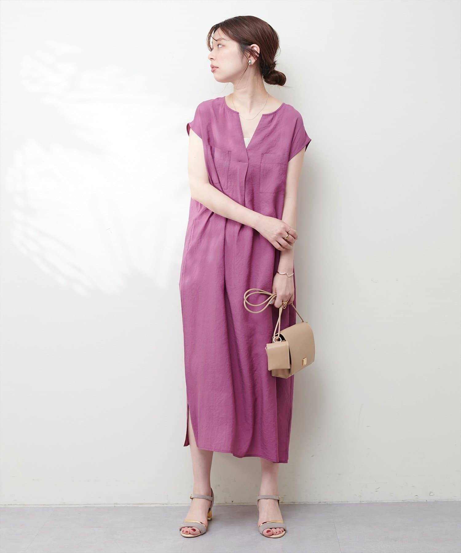 デコルテラインをすっきりと見せるキーネックが夏らしいワンピース。