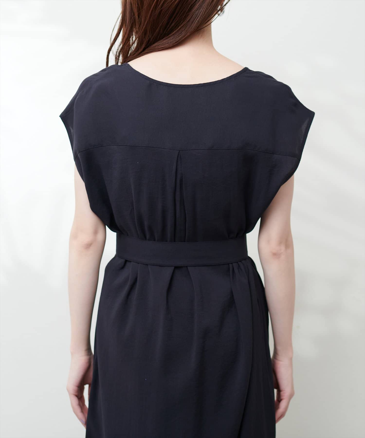 肩先をやや覆うノースリーブは露出控えめで、1枚でも着やすいデザイン。