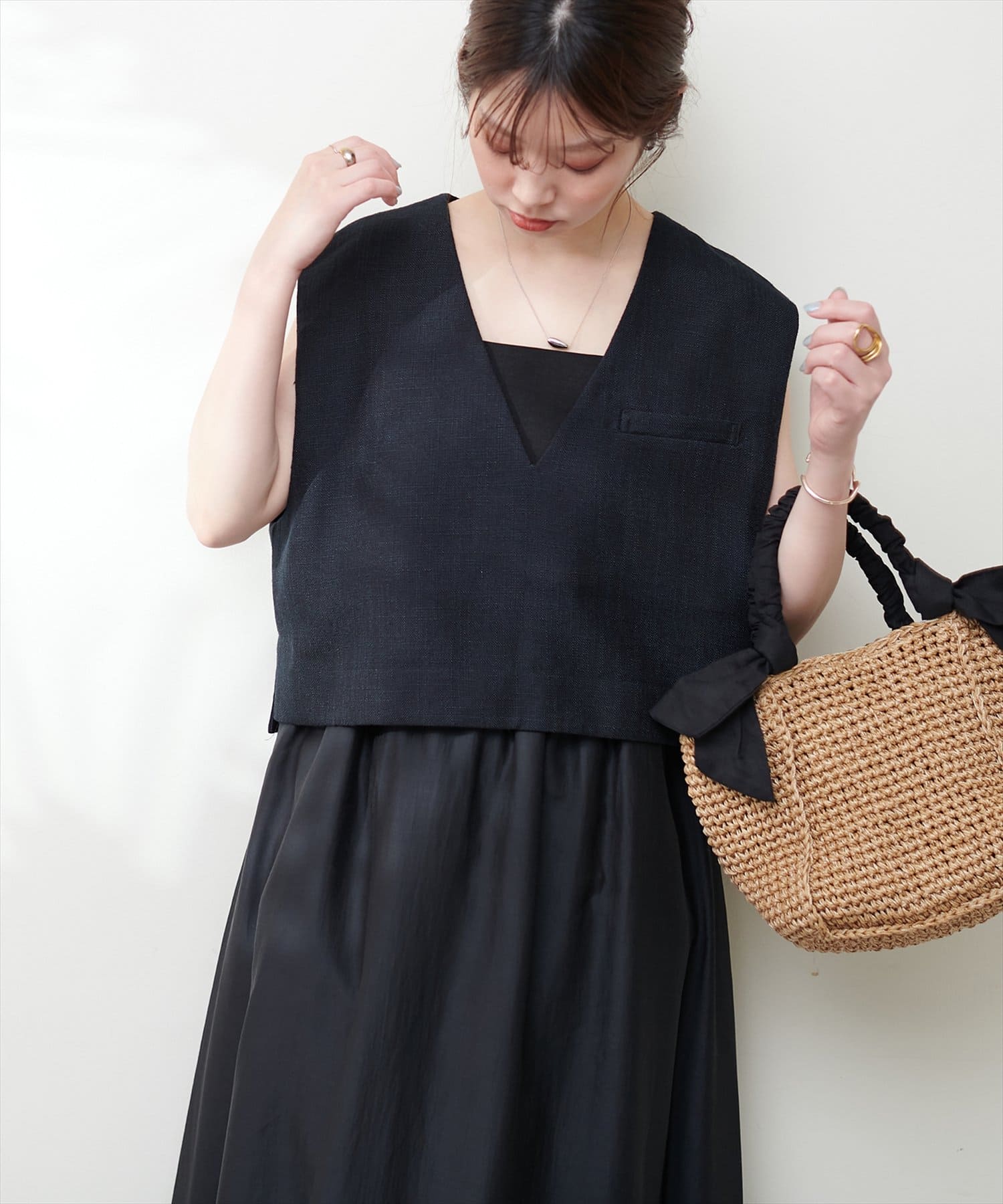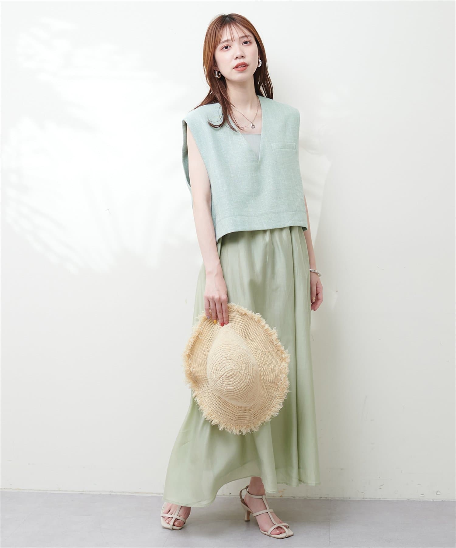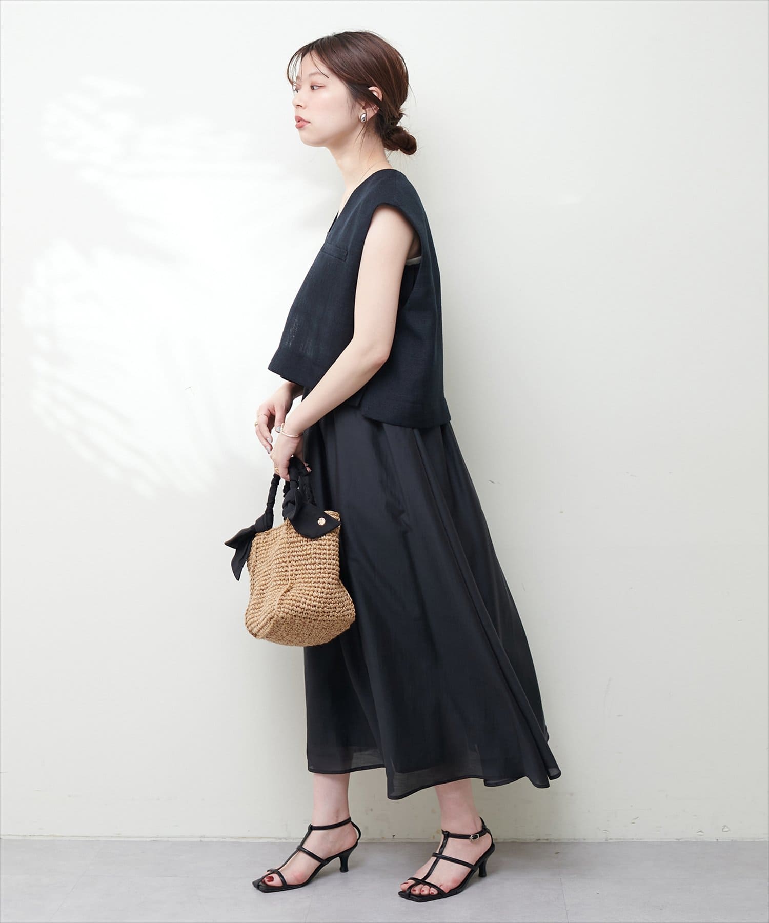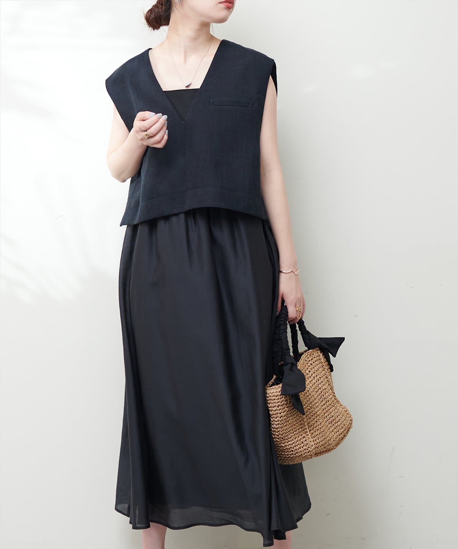 夏らしいシアー生地ワンピースに異素材のベストを合わせ立体感のある1枚。
