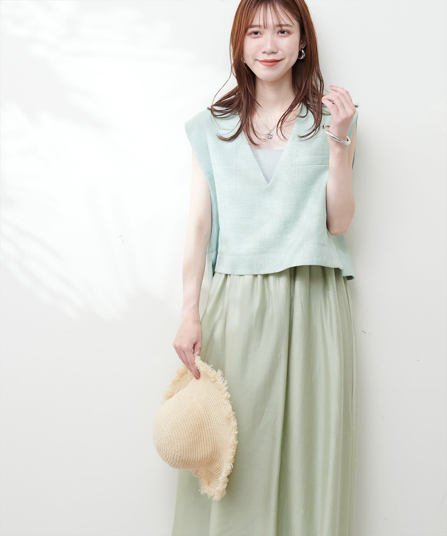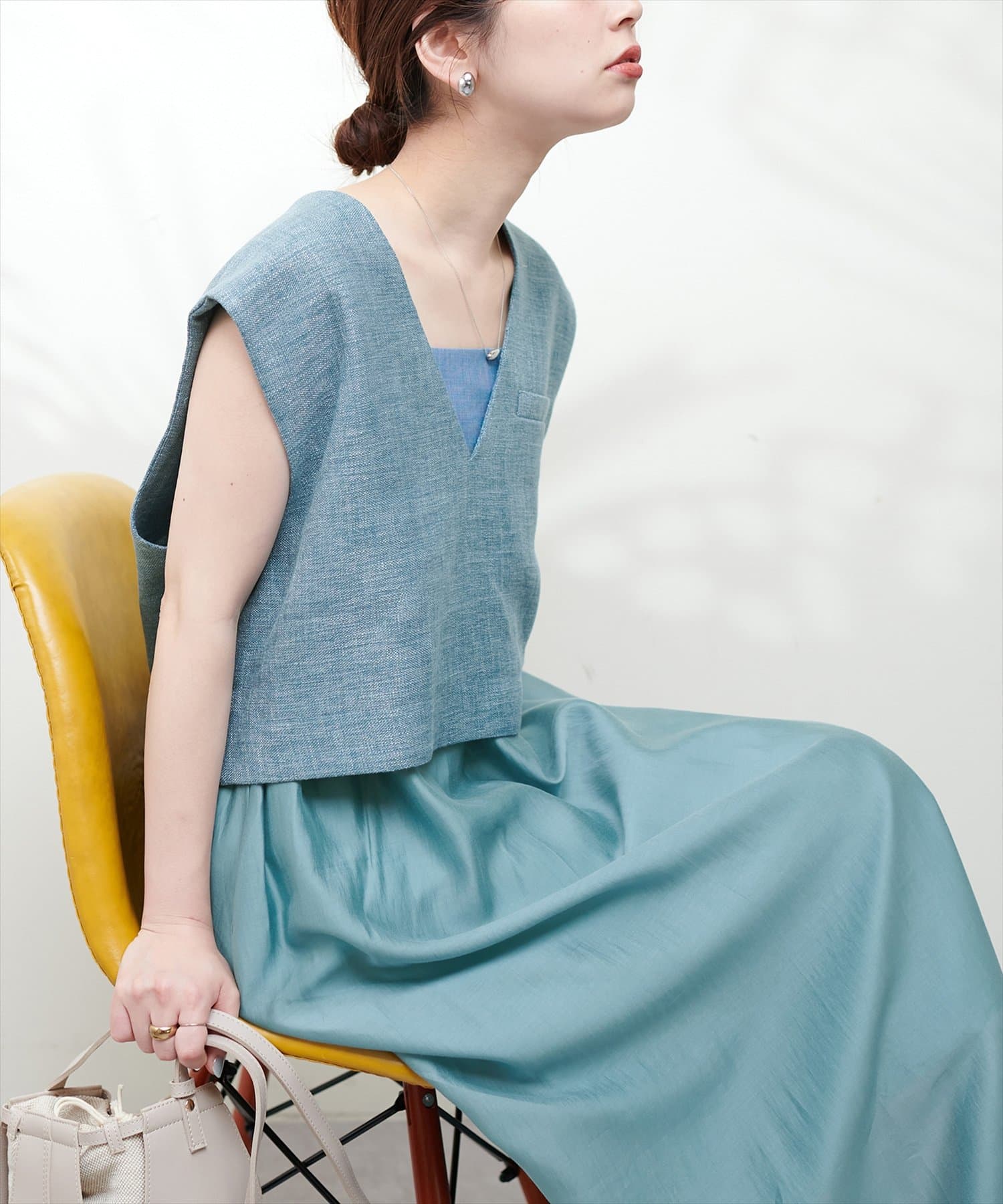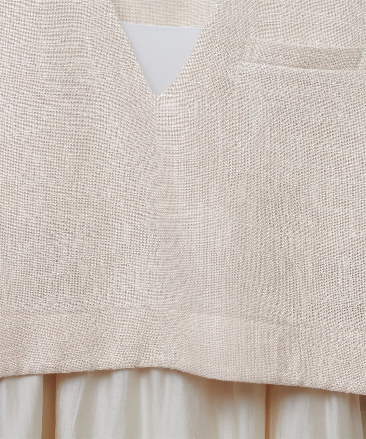 夏らしいシアー生地ワンピースに異素材のベストを合わせ立体感のある1枚。