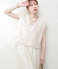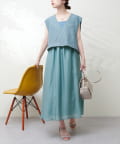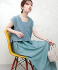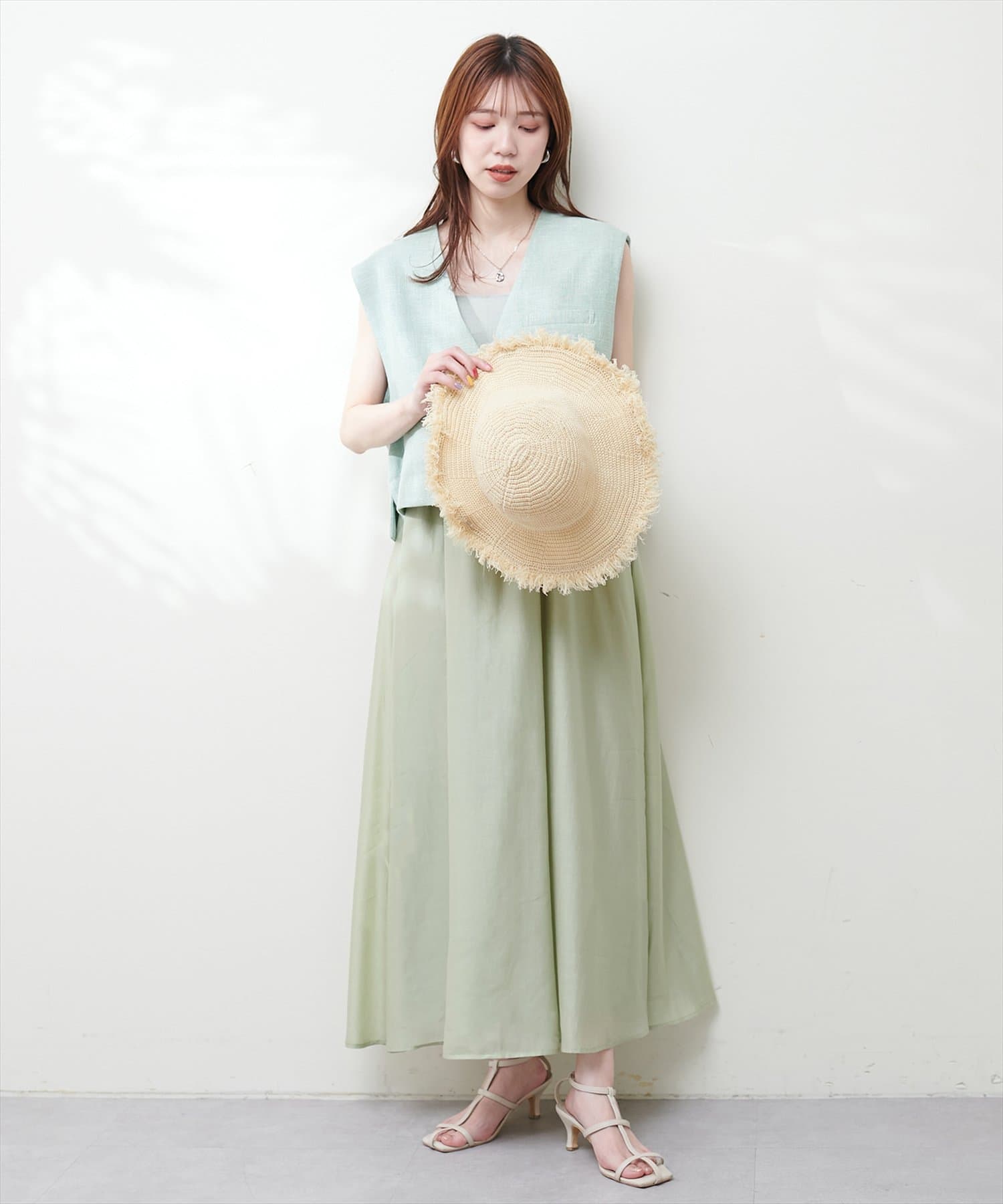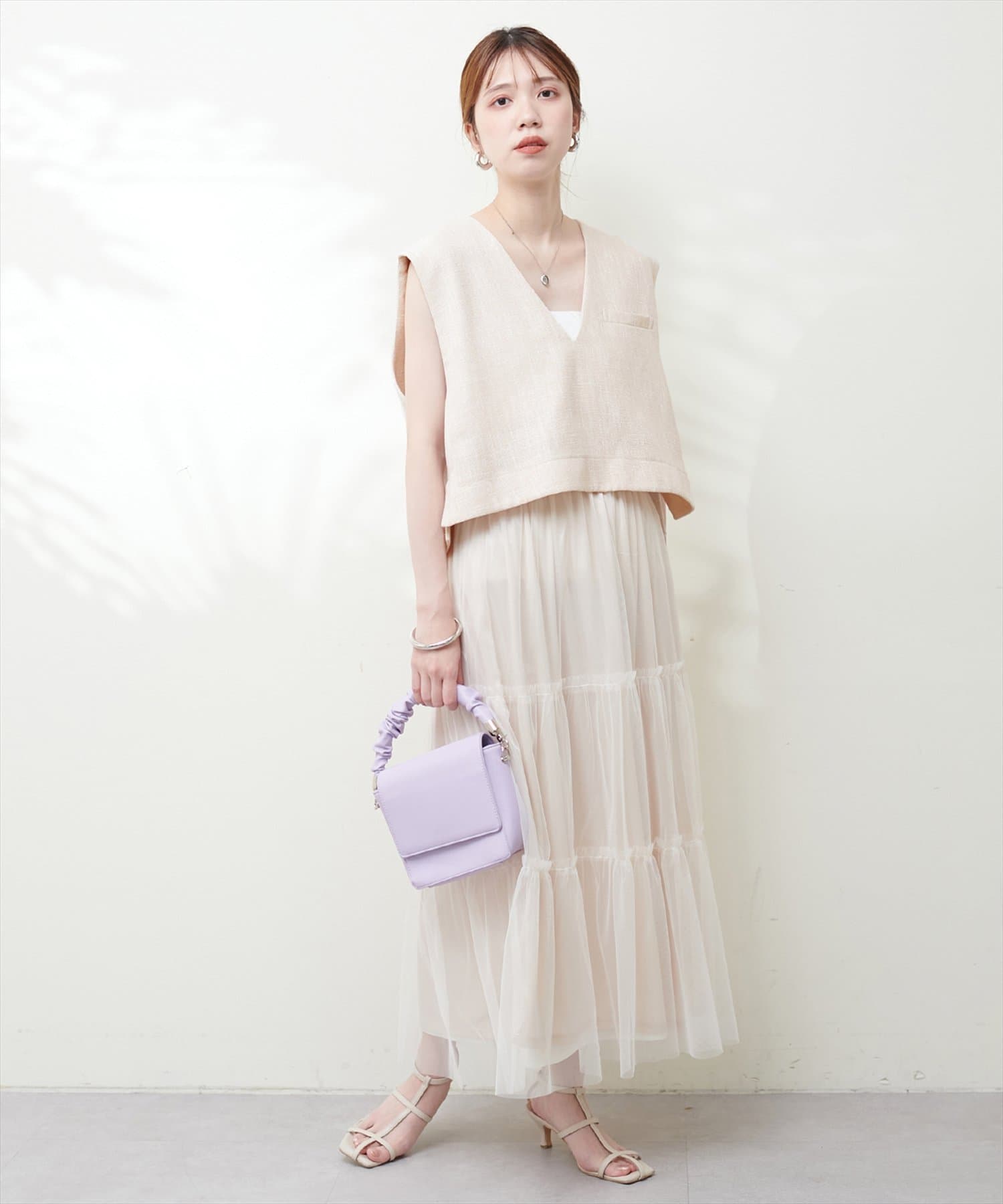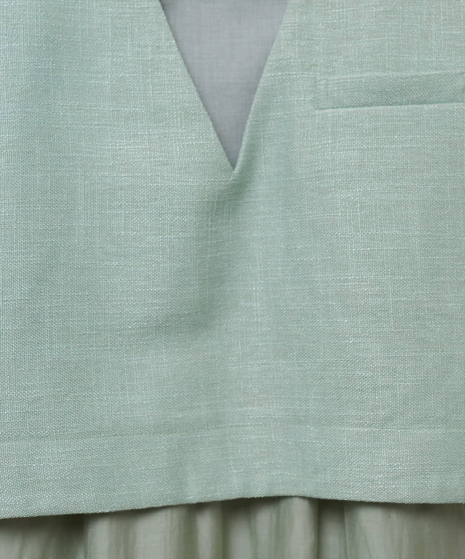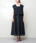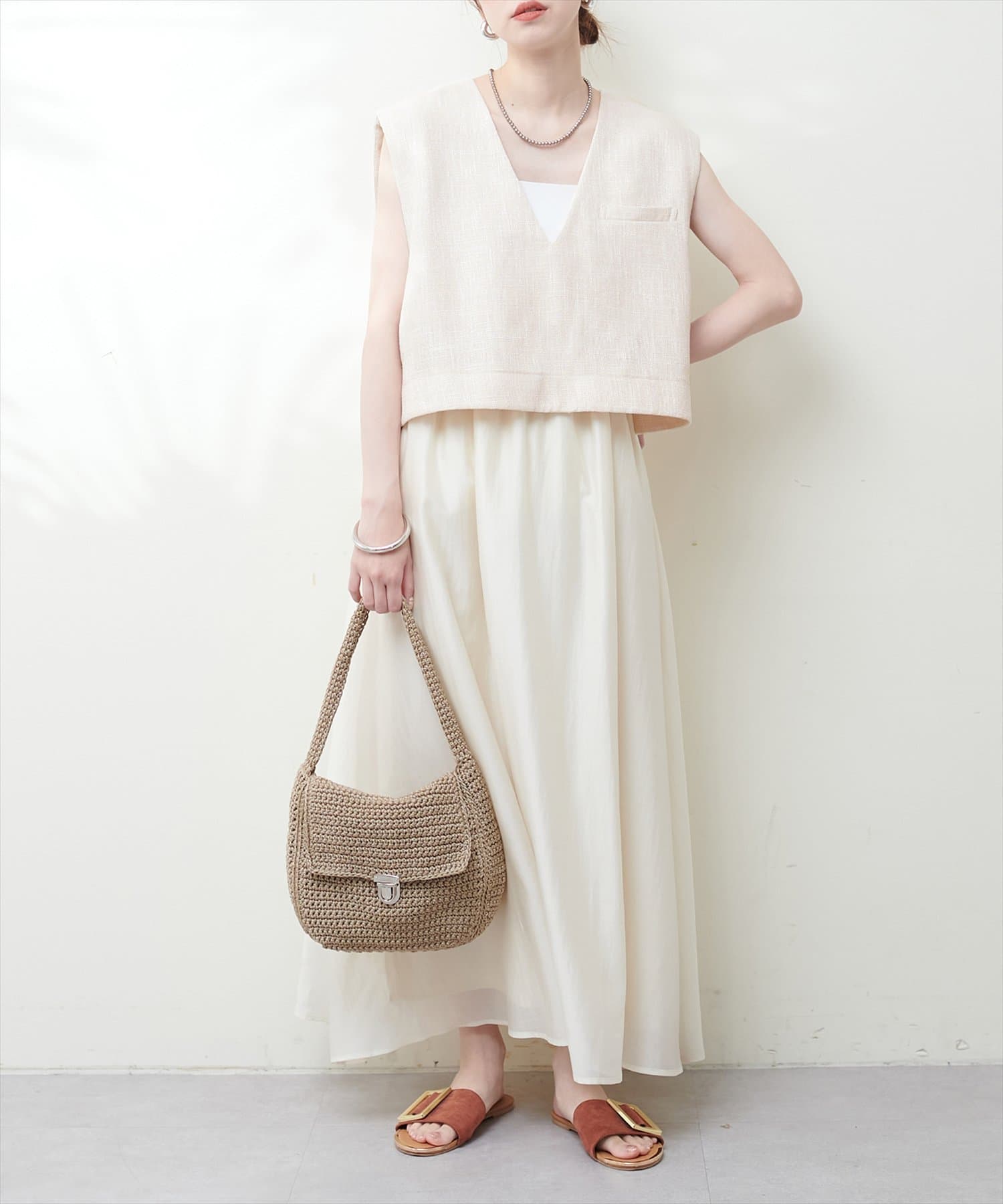 夏らしいシアー生地ワンピースに異素材のベストを合わせ立体感のある1枚。