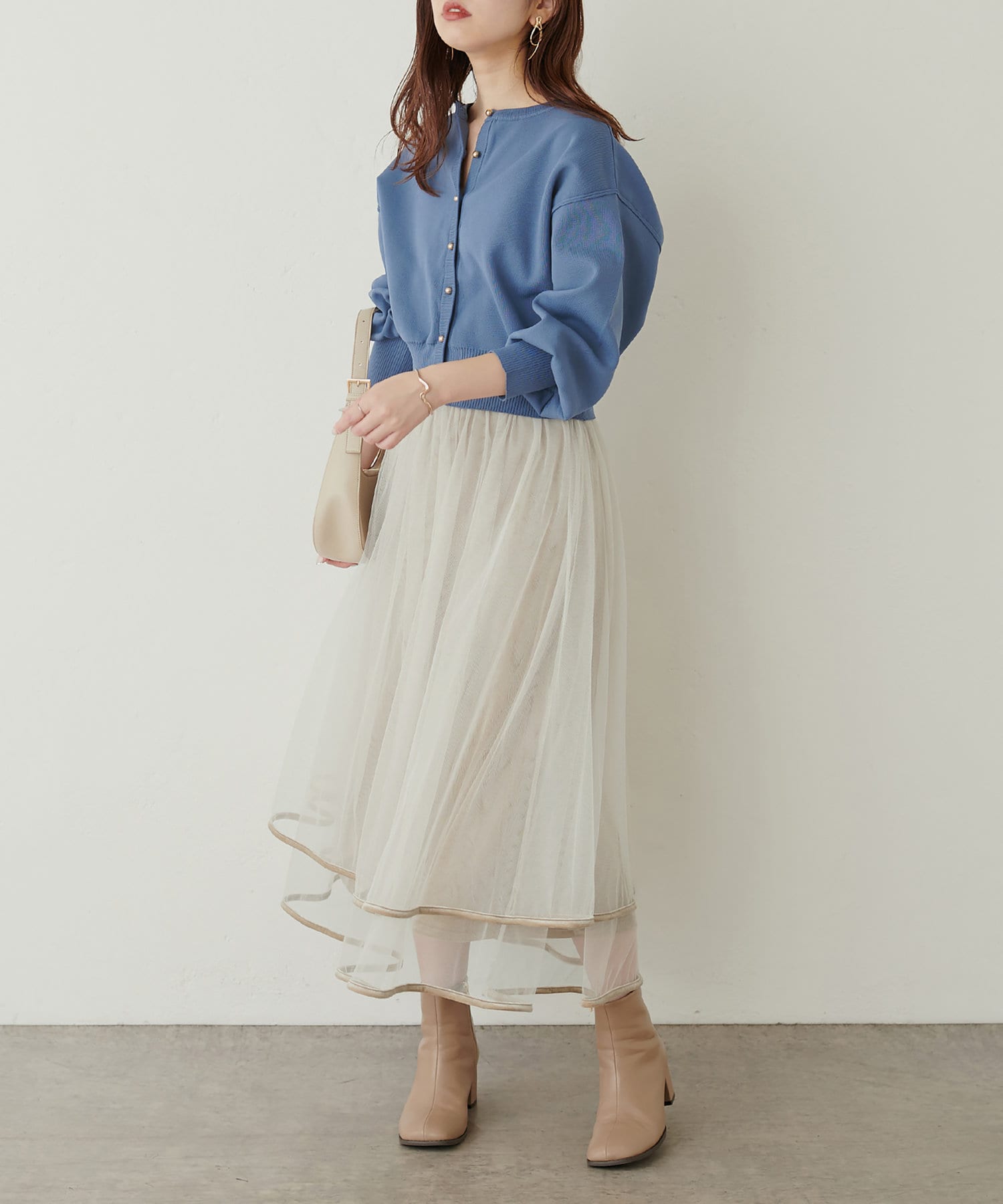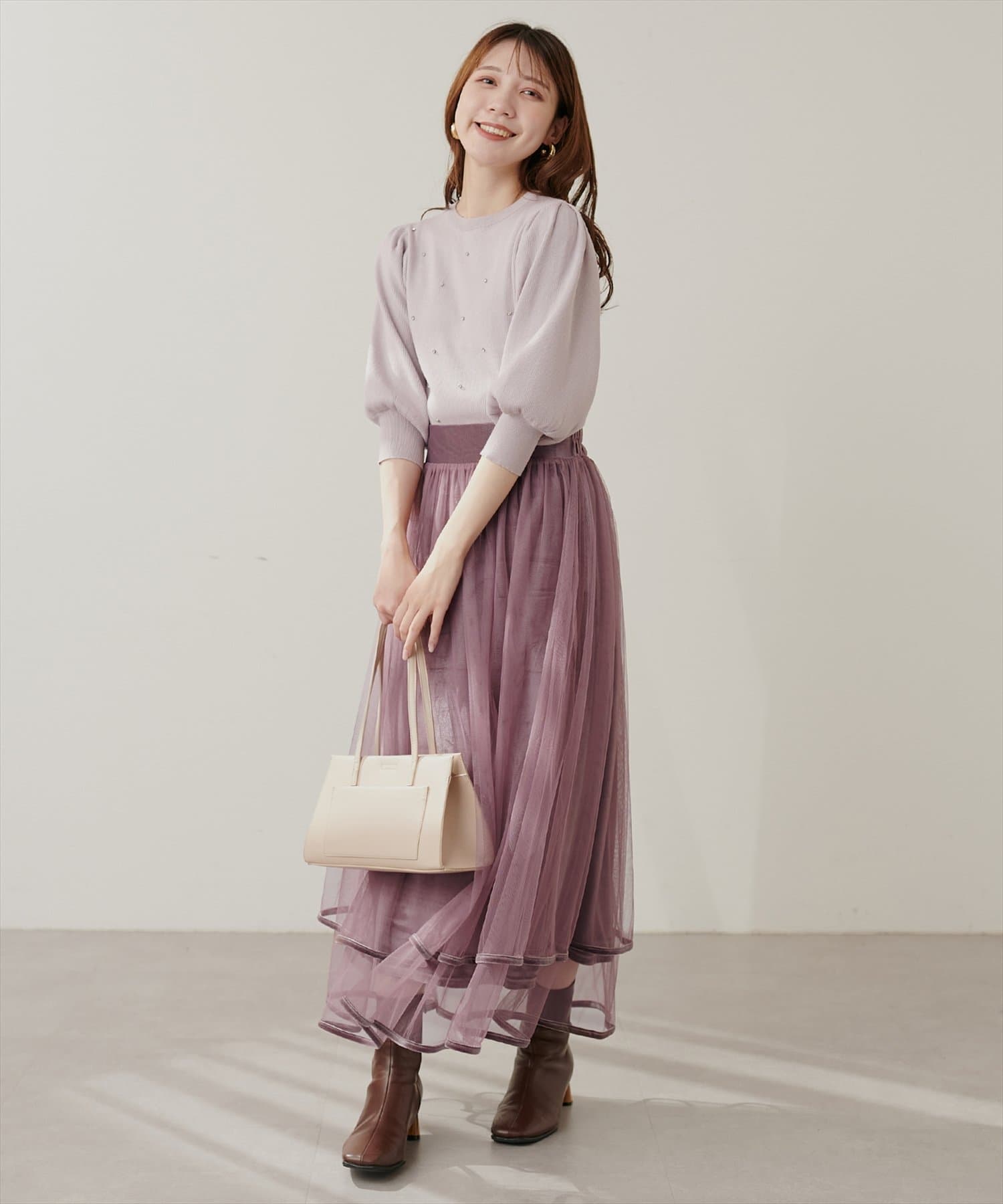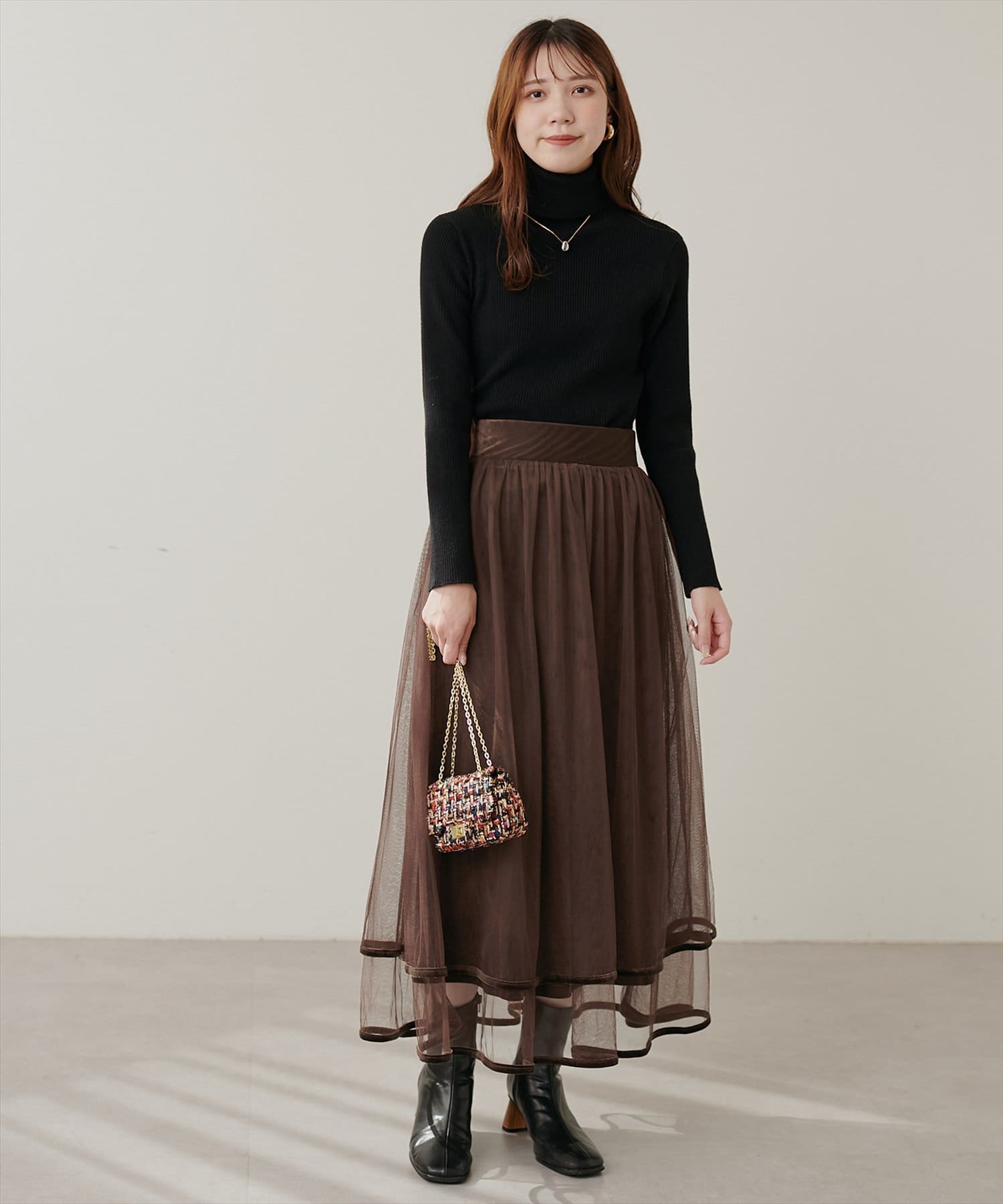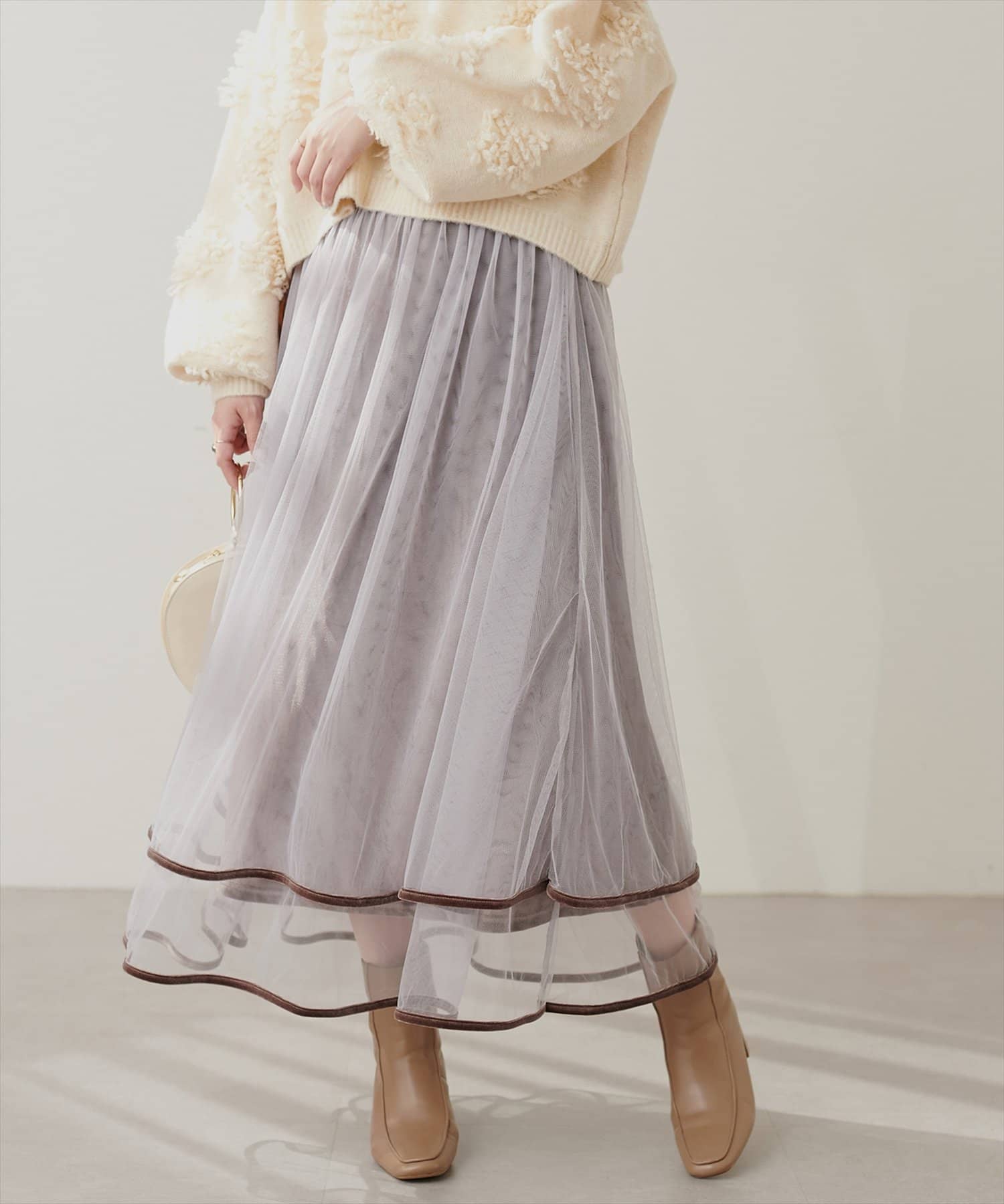シンプルなトップスも華やかに見せてくれるチュールスカートは、フェミニンコーデはもちろんトレーナーやざっくりニットを合わせたカジュアルミックスなスタイリングもおすすめ。
