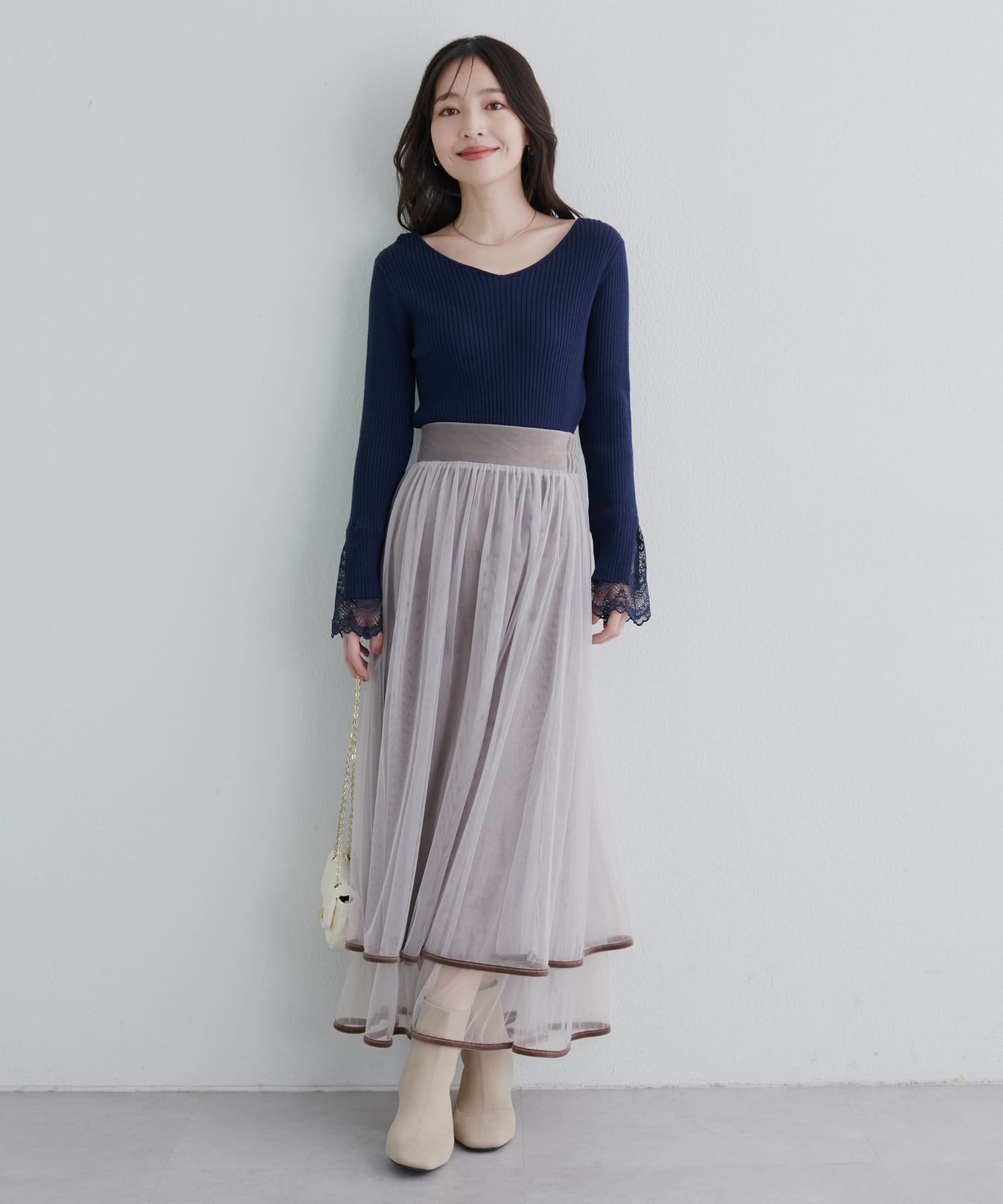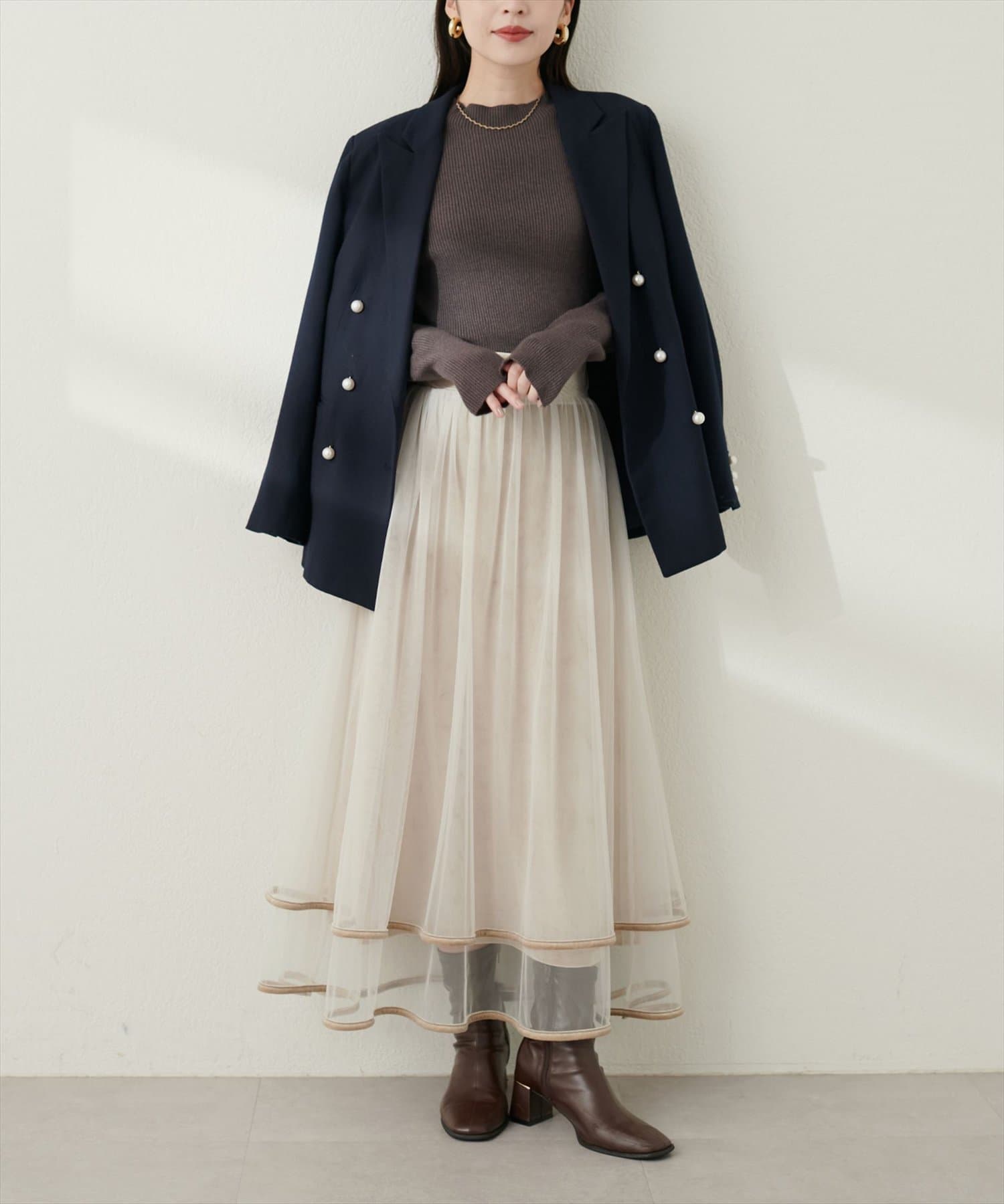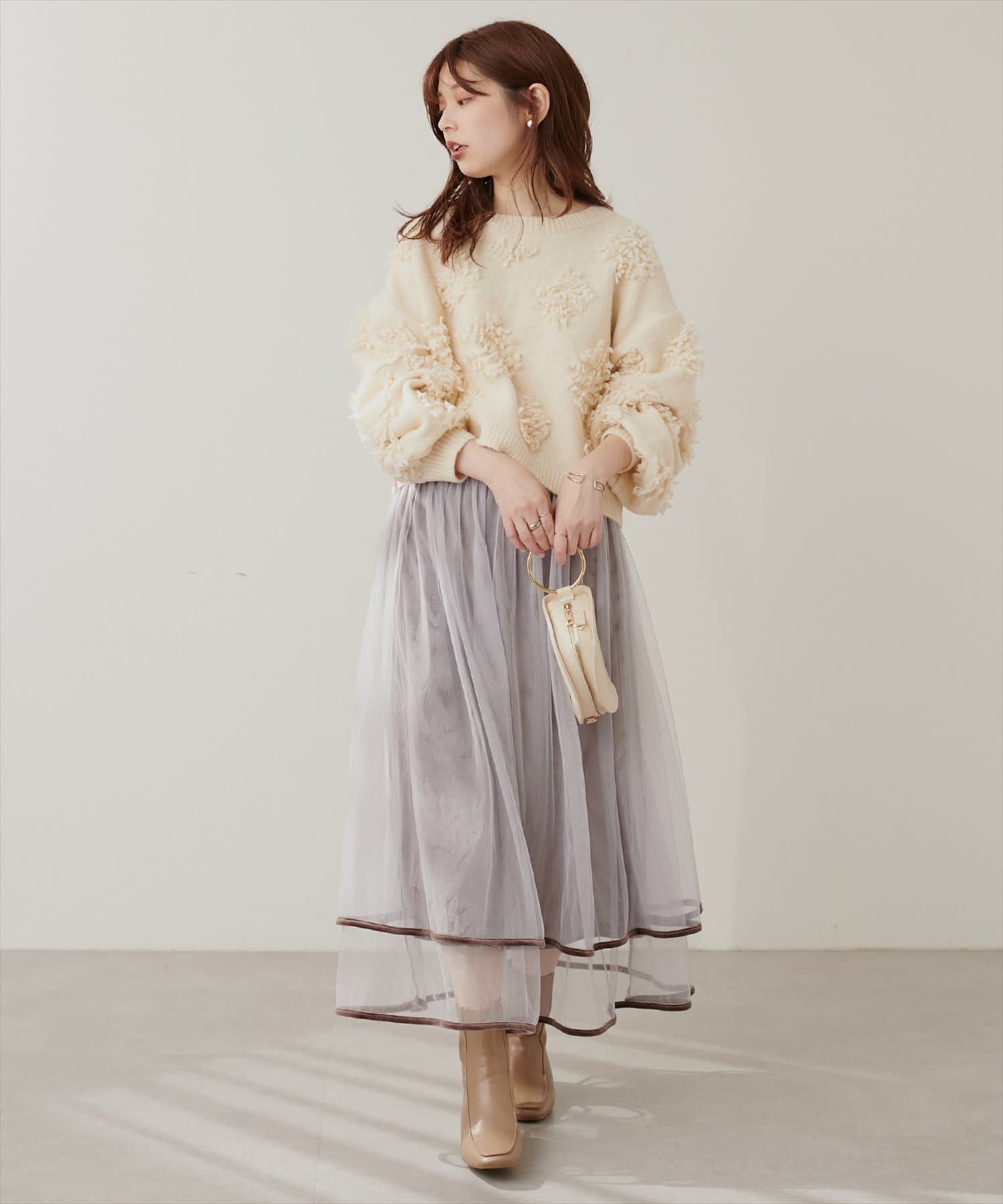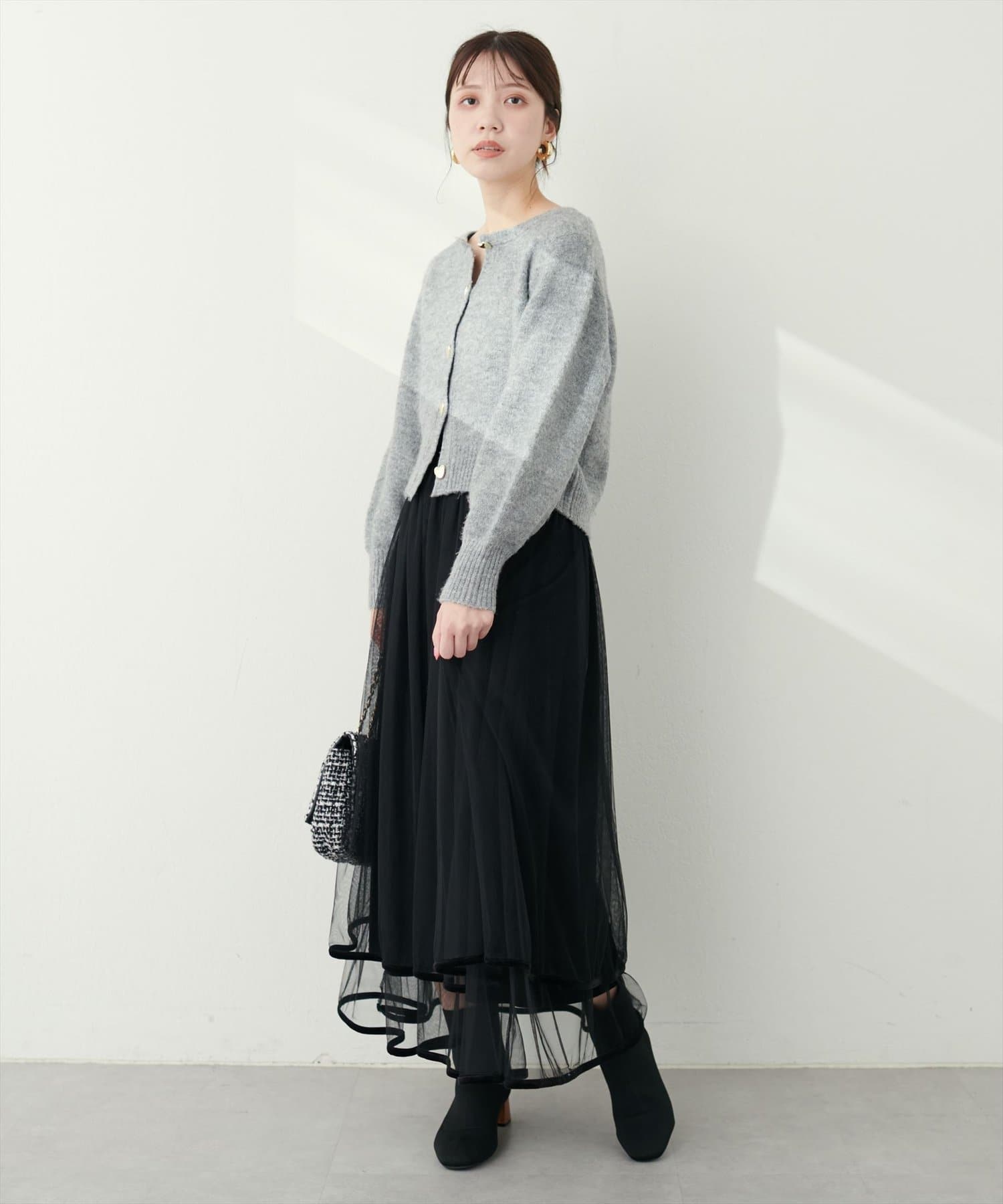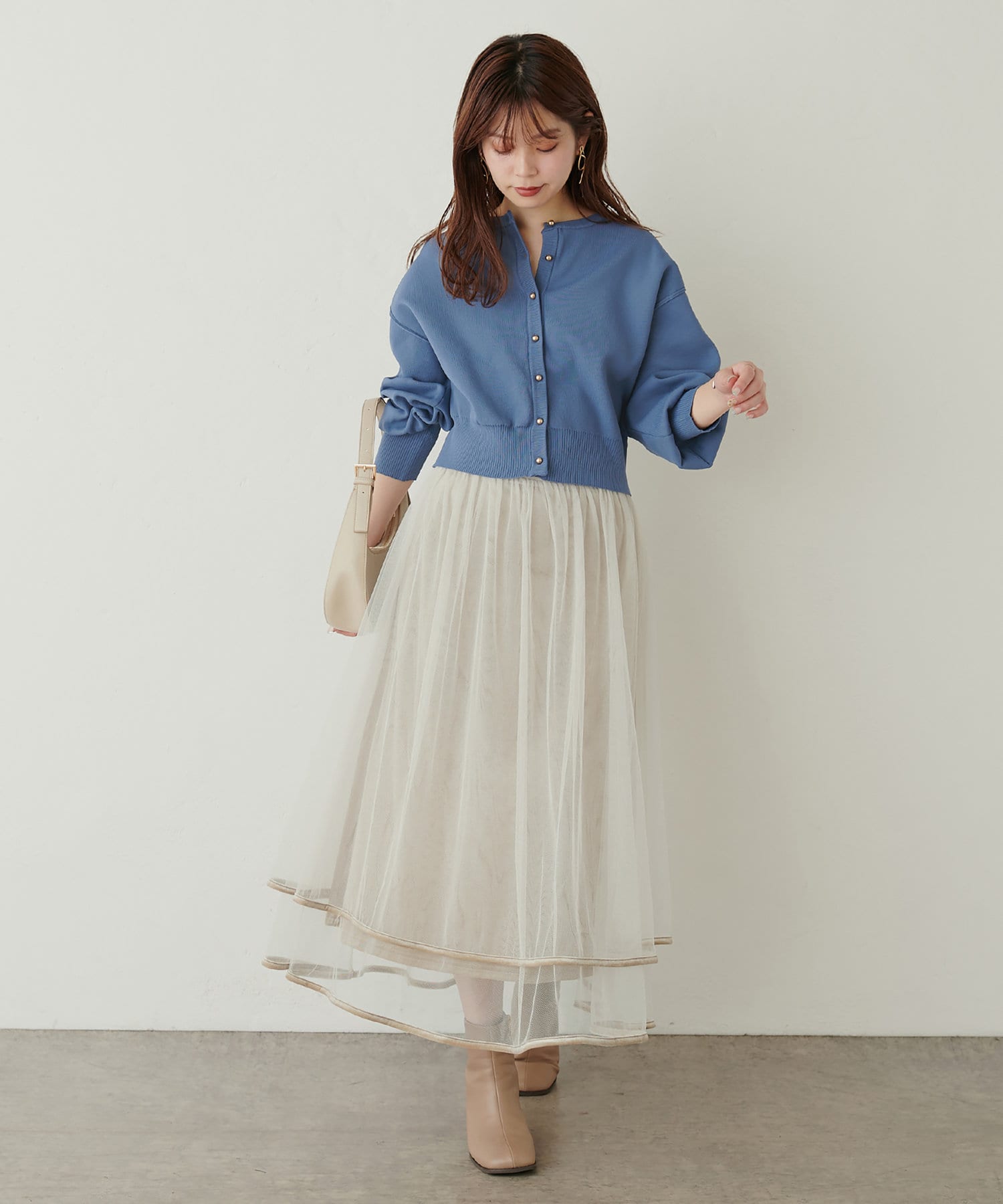 シンプルなトップスも華やかに見せてくれるチュールスカートは、フェミニンコーデはもちろんトレーナーやざっくりニットを合わせたカジュアルミックスなスタイリングもおすすめ。