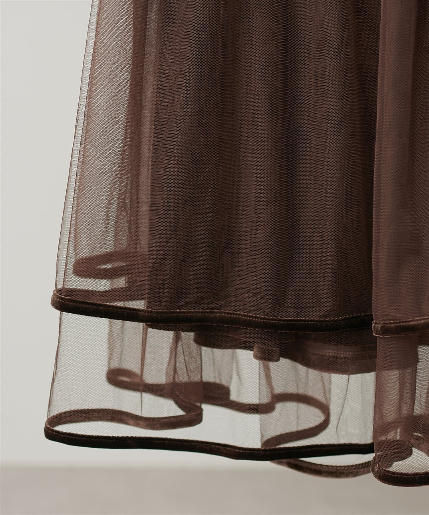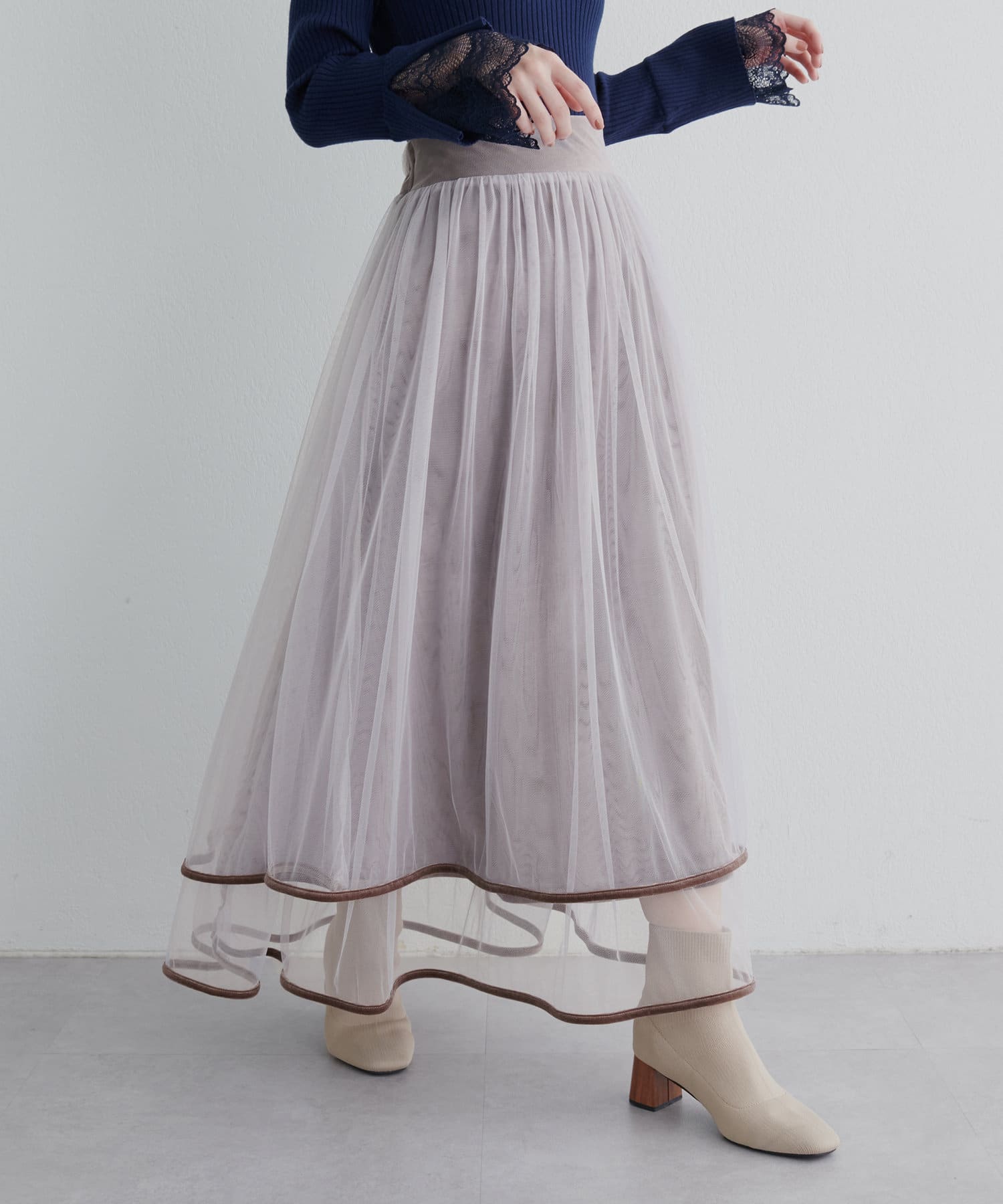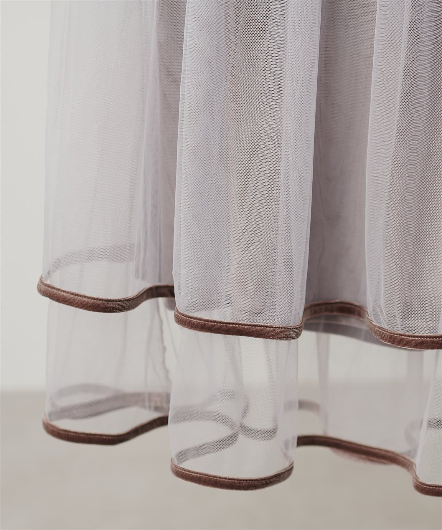甘くなりがちなチュールスカートですが、裾のパイピングと裏地にベロアを使用することで大人上品に仕上げました。
